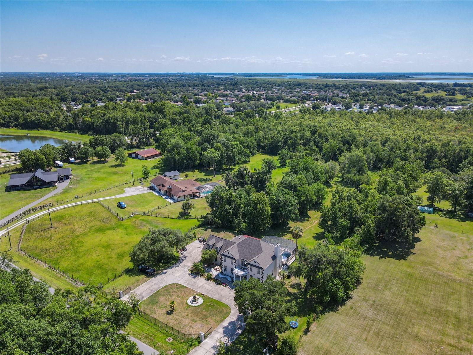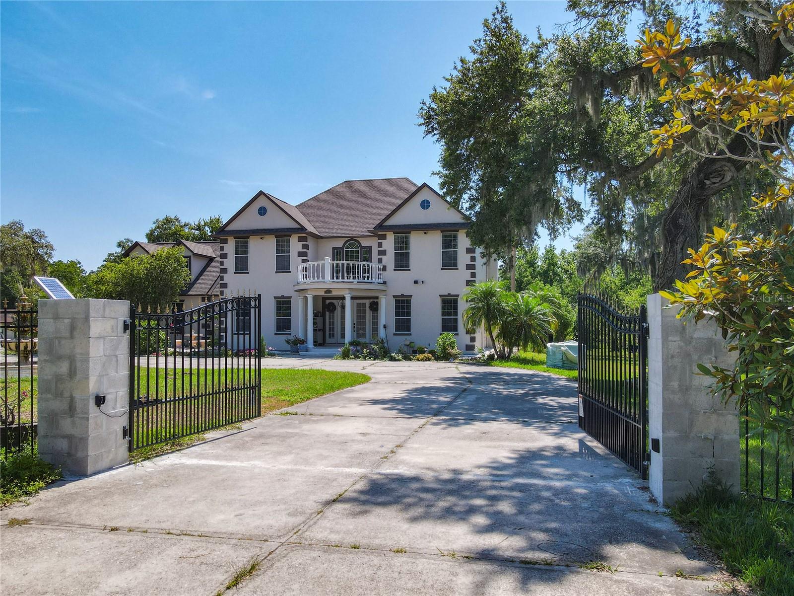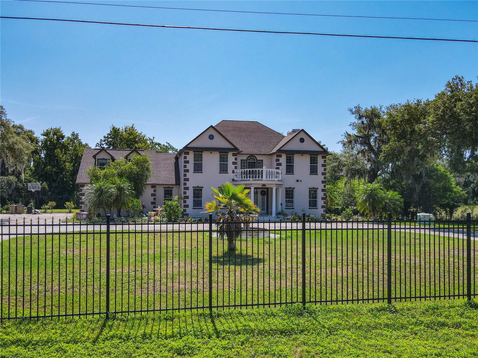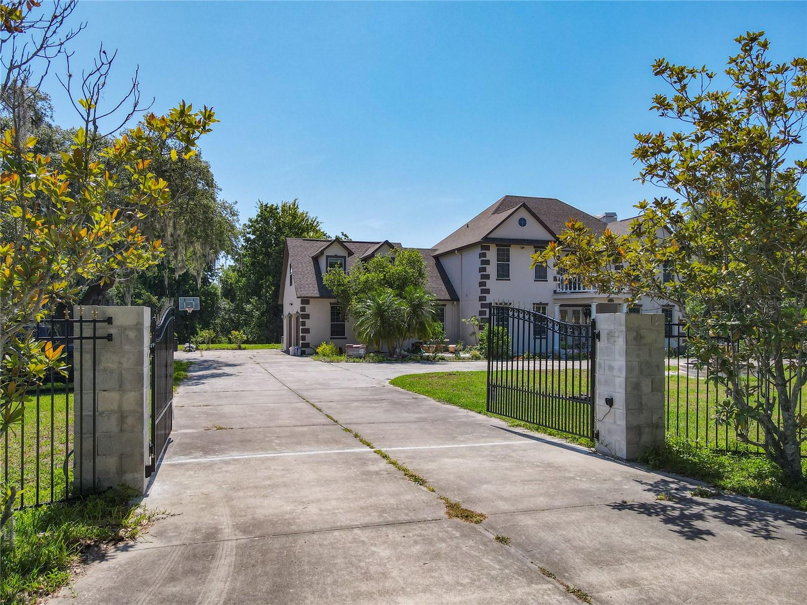 Welcome to this five bedroom, four and a half bathroom country estate situated on over 2.6 acres of exquisite land off of one of Central Florida's best kept secret streets. Past other luxury estates, and under beautiful Oak trees, this custom built home awaits with brand new double-swing estate style automatic gates. The foyer is perfect for those who love sunlight and openness. The kitchen boasts oversized 42 inch cabinets, double Maytag ovens, two separate stainless sinks, newer cook-top, large pantry and an enormous island with built in shelving. The downstair master bedroom has direct access and views of the pool. Moving upstairs, you can take one of two staircases, the main stairs (renovated 2021) that greet you from the front door, or the separate staircase found off of the kitchen which leads directly to the homes theater. The theater is a movie buffs dream with its 12 authentic seats from a Las Vegas theater. Across the upstairs hall, the homes upstairs master is found along with three more bedrooms, all situated upstairs. Outback, the home has both a covered lanai, and screened in patio. The large pool has been completely resurfaced in 2021, with a new saltwater pump. To the left of the pool, there is an additional screened patio, perfect to transform into an outdoor kitchen. The rest of the acreage is behind the pool, it is cleared land with more beautiful trees. Recent home updates include: brand new roof (2022), newer water heater, newer water filtration and softener system, brand new AC unit (2023). Come make this property yours and enjoy everything it has to offer today.
