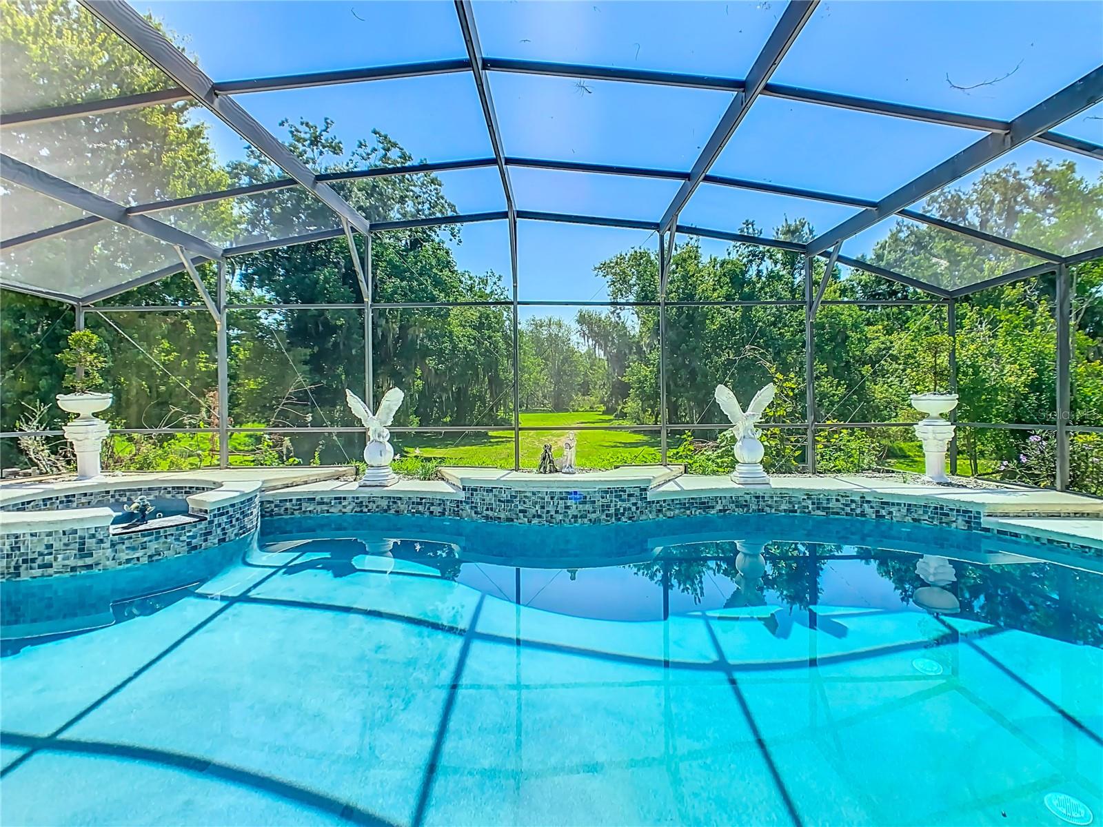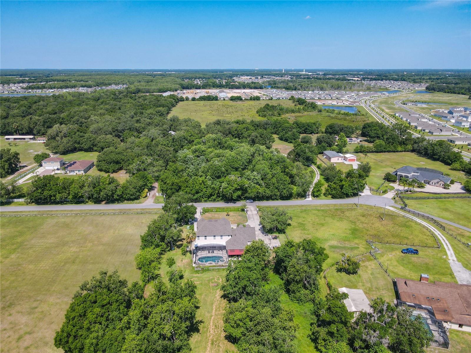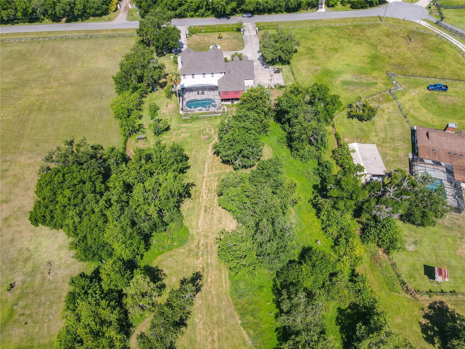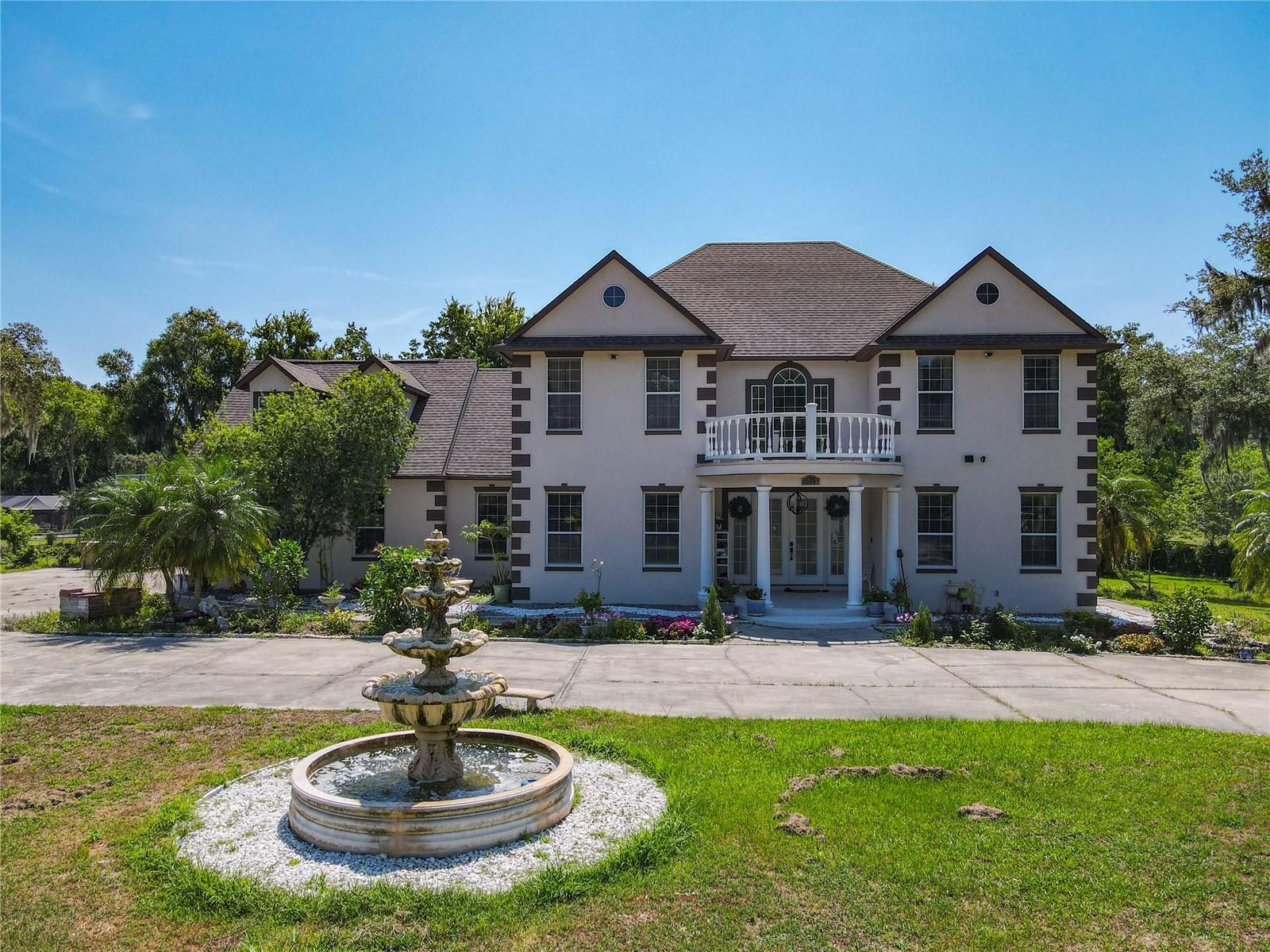 Welcome to this five bedroom, four and a half bathroom country estate situated on over 2.6 acres of exquisite land off of one of Central Florida's best kept secret streets. Past other luxury estates, and under beautiful Oak trees, this custom built home awaits with brand new double-swing estate style automatic gates. The foyer is perfect for those who love sunlight and openness. The kitchen boasts oversized 42 inch cabinets, double Maytag ovens, two separate stainless sinks, newer cook-top, large pantry and an enormous island with built in shelving. The downstair master bedroom has direct access and views of the pool. Moving upstairs, you can take one of two staircases, the main stairs (renovated 2021) that greet you from the front door, or the separate staircase found off of the kitchen which leads directly to the homes theater. The theater is a movie buffs dream with its 12 authentic seats from a Las Vegas theater. Across the upstairs hall, the homes upstairs master is found along with three more bedrooms, all situated upstairs. Outback, the home has both a covered lanai, and screened in patio. The large pool has been completely resurfaced in 2021, with a new saltwater pump. To the left of the pool, there is an additional screened patio, perfect to transform into an outdoor kitchen. The rest of the acreage is behind the pool, it is cleared land with more beautiful trees. Recent home updates include: brand new roof (2022), newer water heater, newer water filtration and softener system, brand new AC unit (2023). Come make this property yours and enjoy everything it has to offer today.