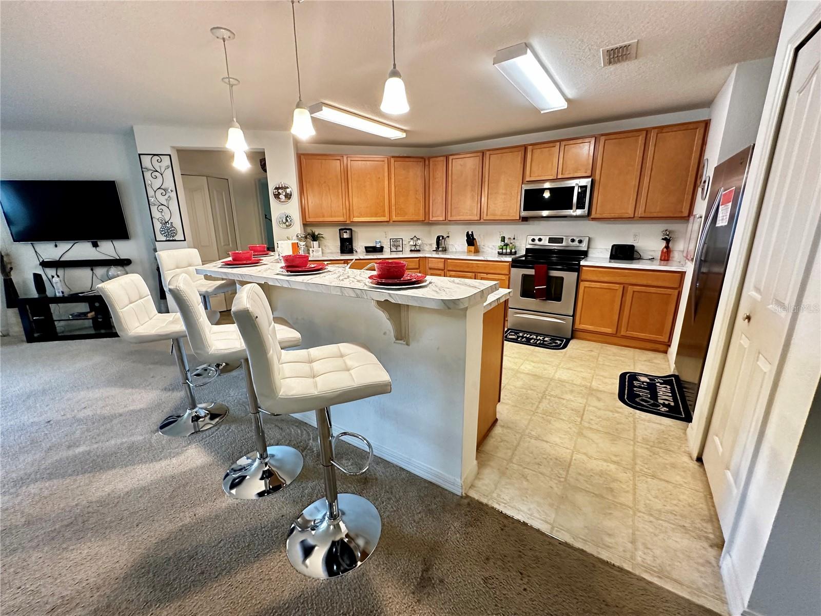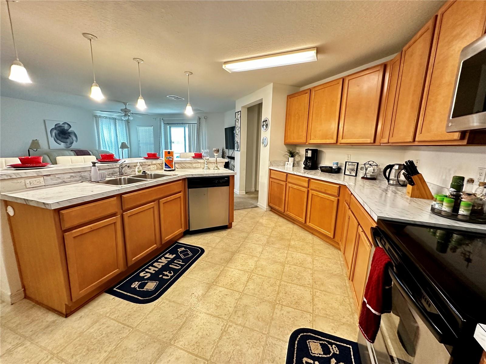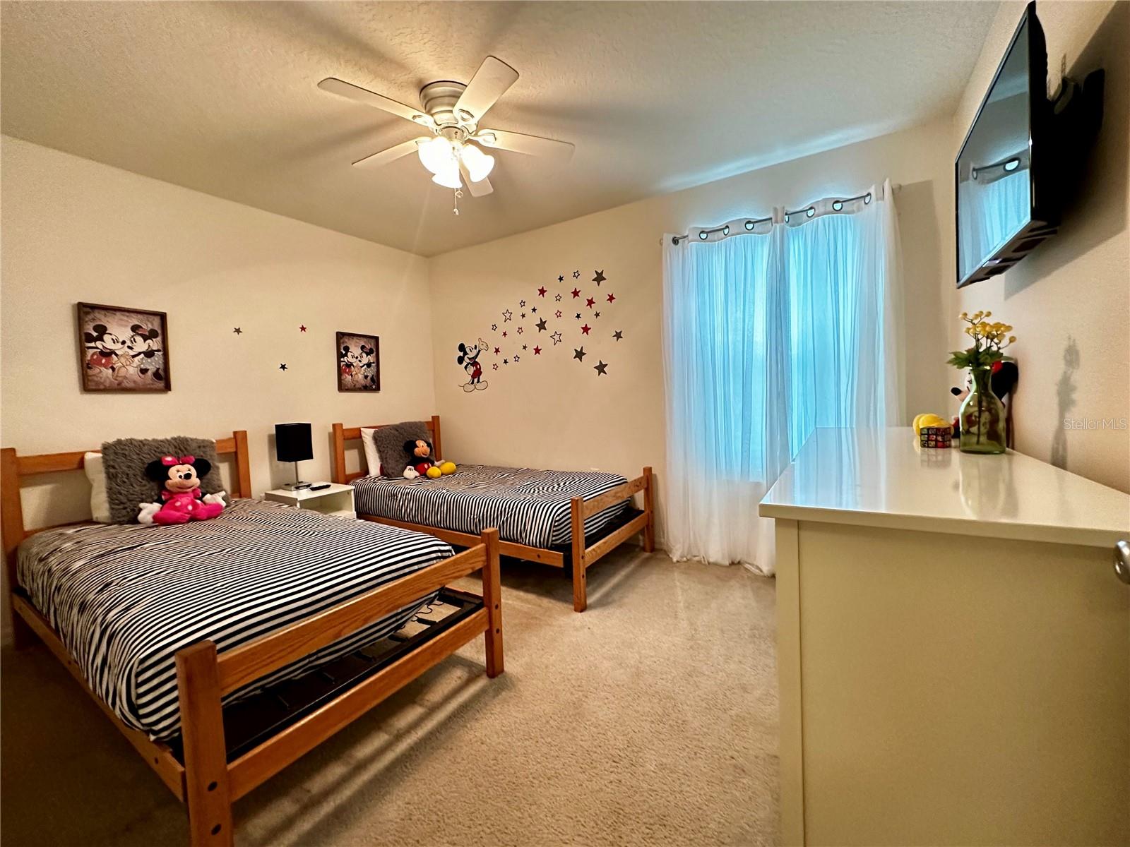 Discover your dream home in the exclusive GATED COMMUNITY of Crystal Cove Resort! This stunning 4-bedroom, 2-bathroom single-family residence, built in 2013, boasts a picturesque water view and resort-style amenities that will make every day feel like a vacation. As you step inside, you'll be greeted by an abundance of natural light flooding the spacious, beautifully decorated interiors. Fully furnished and move-in ready, this home offers both comfort and style. The inviting kitchen features sleek stainless steel appliances, including a range, dishwasher, side-by-side refrigerator, and built-in microwave. Maple wood 30" cabinets and a breakfast bar with elegant white pendant sconces create the perfect setting for family gatherings and intimate dinners. The master bedroom is a serene retreat, complete with a luxurious king-sized bed, stylish blinds, and a modern white ceiling fan. The en-suite master bathroom offers a spa-like experience with a glass-enclosed shower, separate soaking tub, double vanity, and a large mirror. Three additional bedrooms and a well-appointed second bathroom provide ample space for family and guests. Step outside to enjoy the tranquil water view from your spacious backyard, perfect for outdoor entertaining and relaxation. The resort-style amenities at the clubhouse include a pool table, a state-of-the-art fitness center, and a heated pool. Plus, lawn maintenance is included in the HOA fee, ensuring a hassle-free lifestyle. Located just 6 miles from Disney and minutes from premier shopping and outlet centers, this home offers the perfect blend of luxury, convenience, and fun. Don’t miss your chance to own this exceptional property!