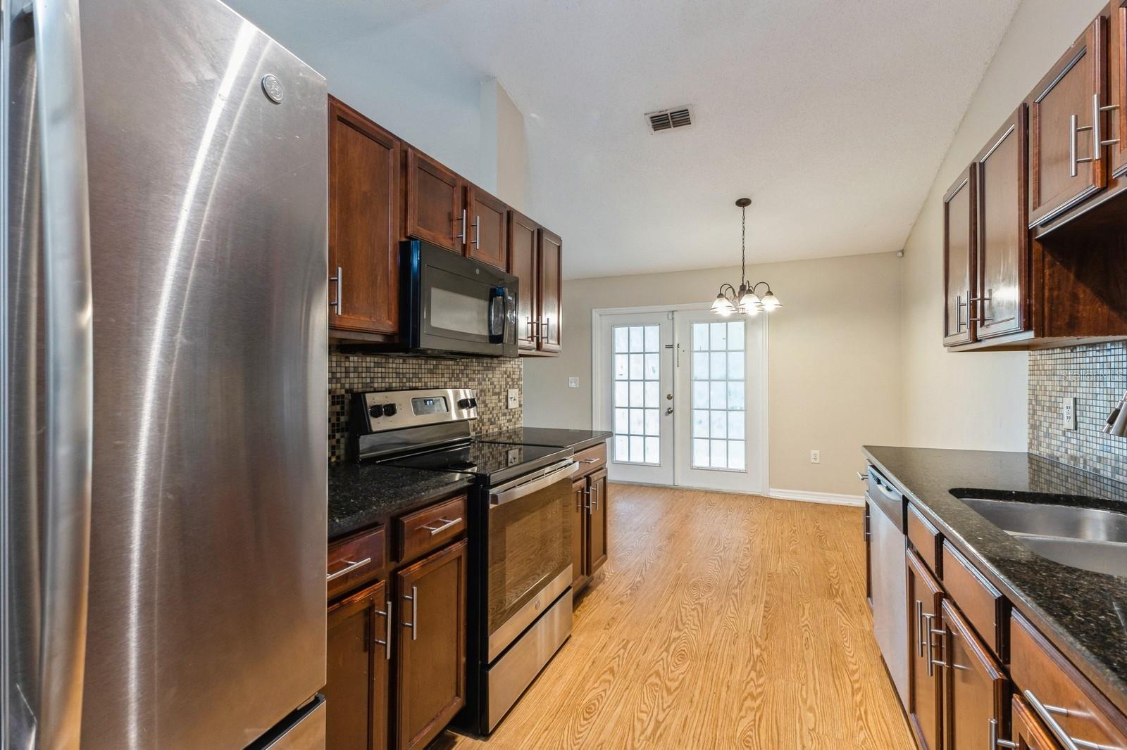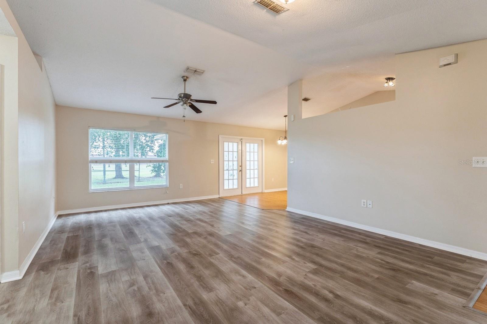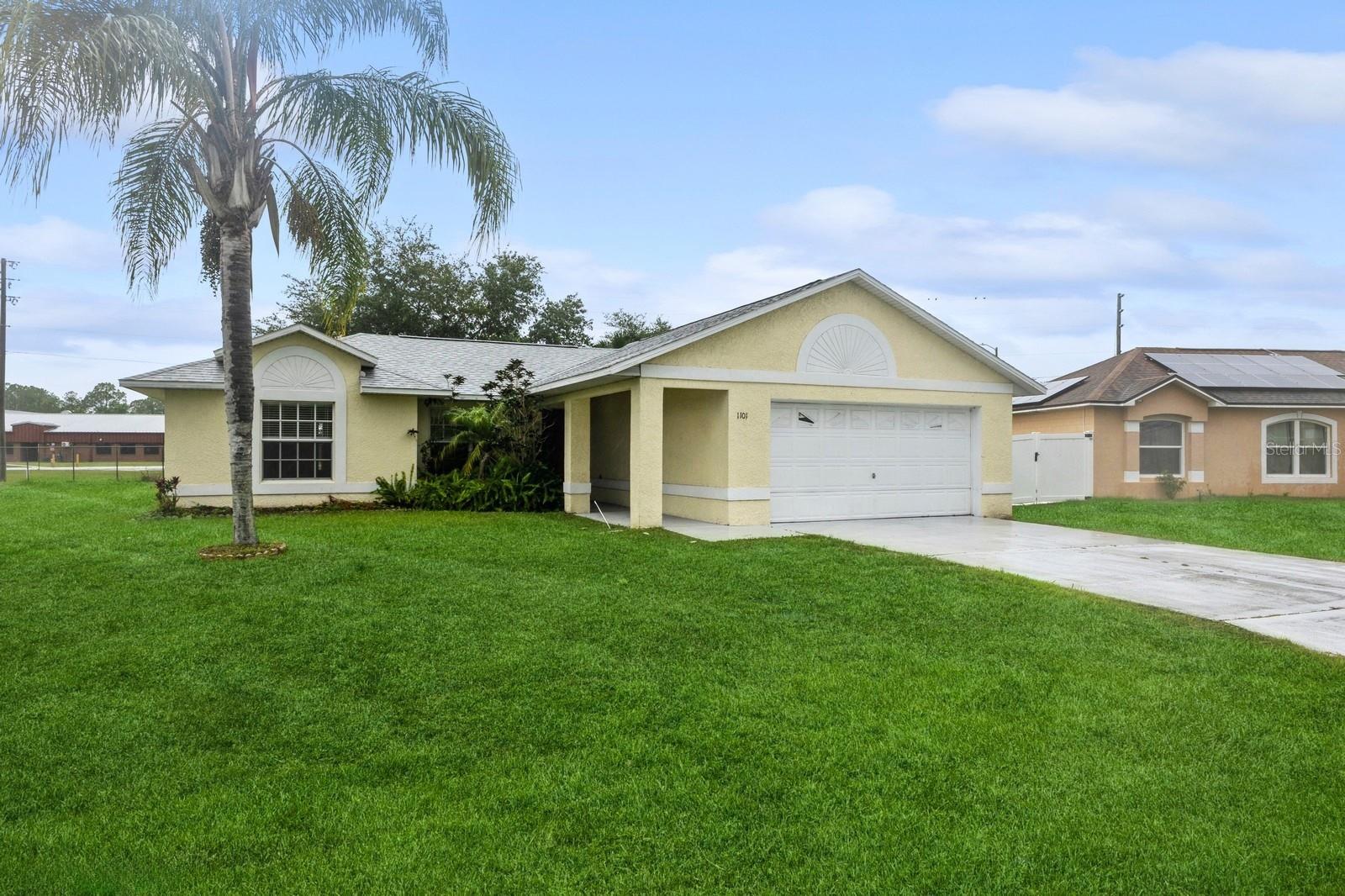 Discover the charm of Kissimmee living with this delightful single-story home. Nestled on a generous corner lot, this residence boasts a welcoming atmosphere with its beautifully open floorplan and updated kitchen. The kitchen features granite countertops and maple cabinets with a tiled backsplash as well as a pantry closet and a double bowl sink. The living spaces and bedrooms enjoy durable laminate flooring while the primary bedroom also includes a large walk-in closet and a dual granite top vanity cabinet in the bathroom. Double French Doors from the living room take you outside to the covered patio and spacious backyard, ready for your personal touches. Seconds away from the local elementary school and less than ten minutes from a number of parks and recreation fields, as well as a Publix, primary services, and everything you may need. Embrace the Florida lifestyle in this charming Kissimmee home today!