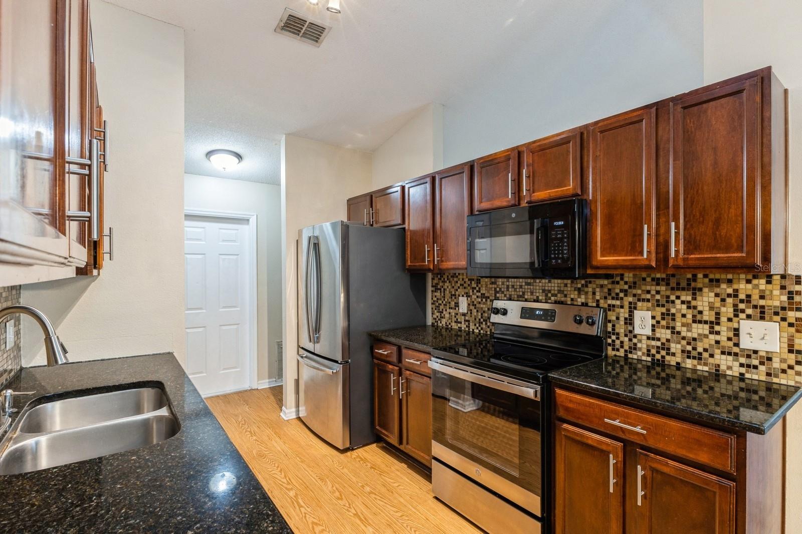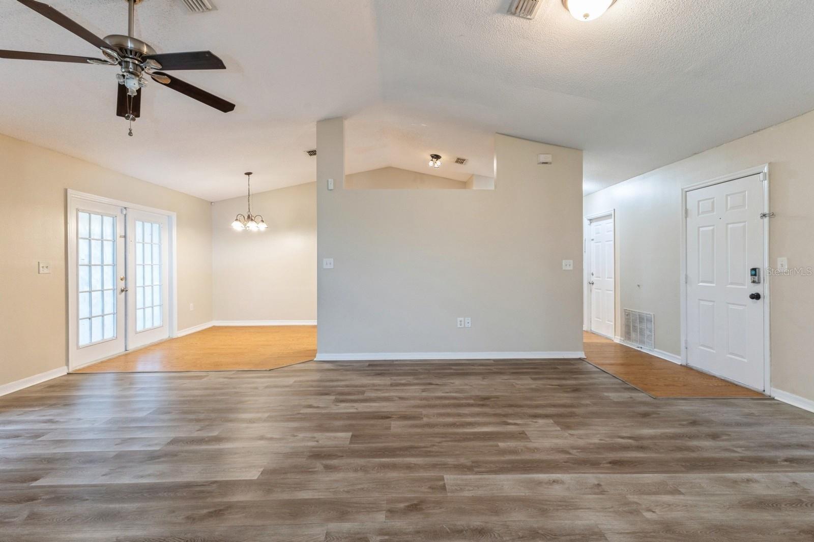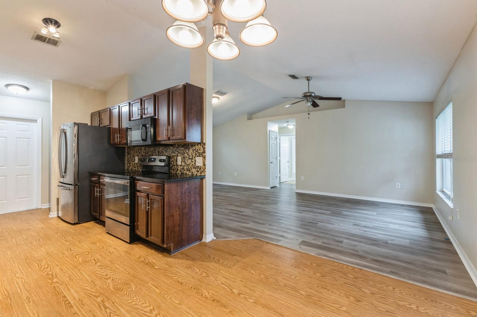 Discover the charm of Kissimmee living with this delightful single-story home. Nestled on a generous corner lot, this residence boasts a welcoming atmosphere with its beautifully open floorplan and updated kitchen. The kitchen features granite countertops and maple cabinets with a tiled backsplash as well as a pantry closet and a double bowl sink. The living spaces and bedrooms enjoy durable laminate flooring while the primary bedroom also includes a large walk-in closet and a dual granite top vanity cabinet in the bathroom. Double French Doors from the living room take you outside to the covered patio and spacious backyard, ready for your personal touches. Seconds away from the local elementary school and less than ten minutes from a number of parks and recreation fields, as well as a Publix, primary services, and everything you may need. Embrace the Florida lifestyle in this charming Kissimmee home today!