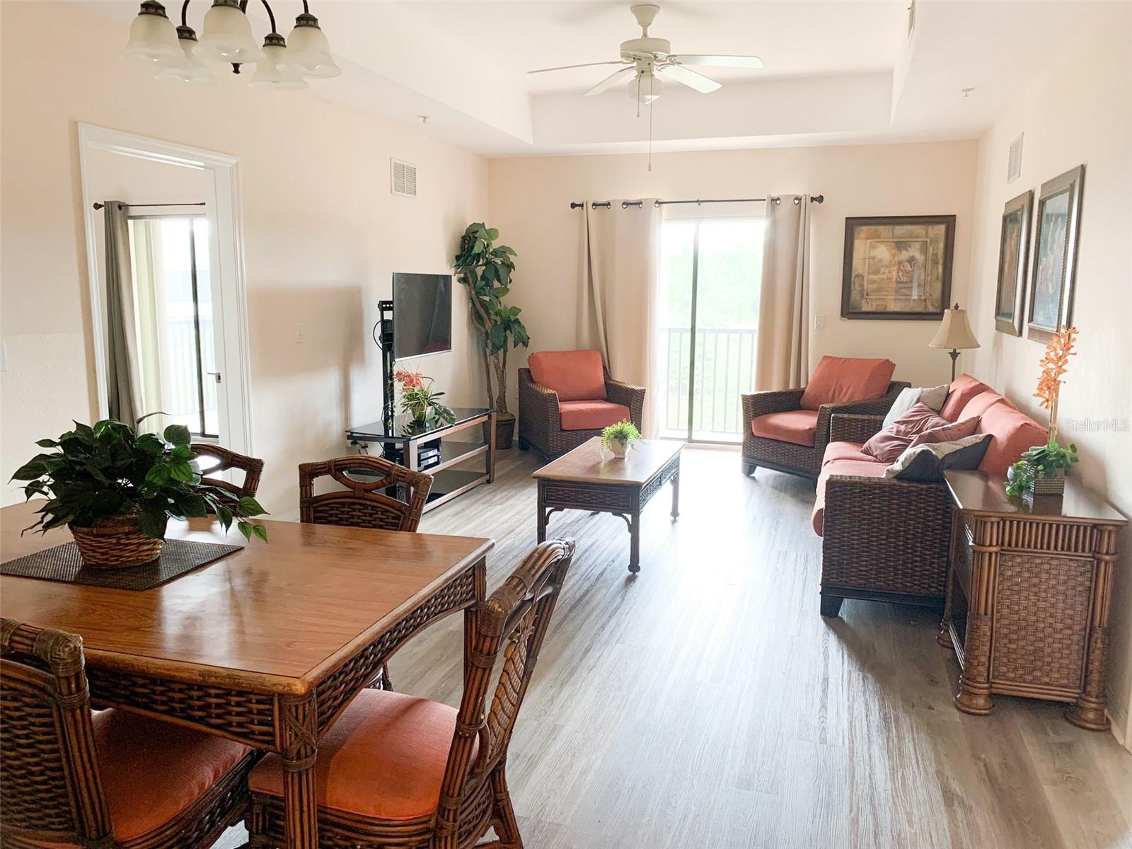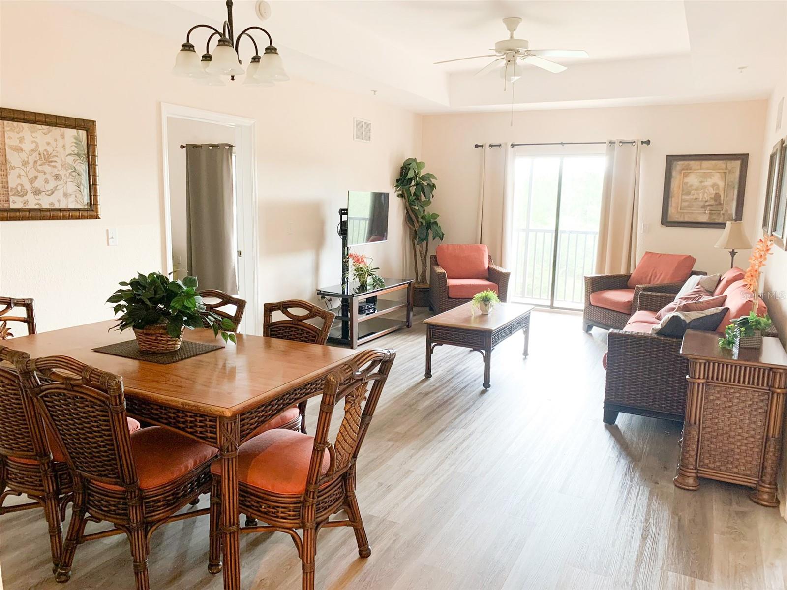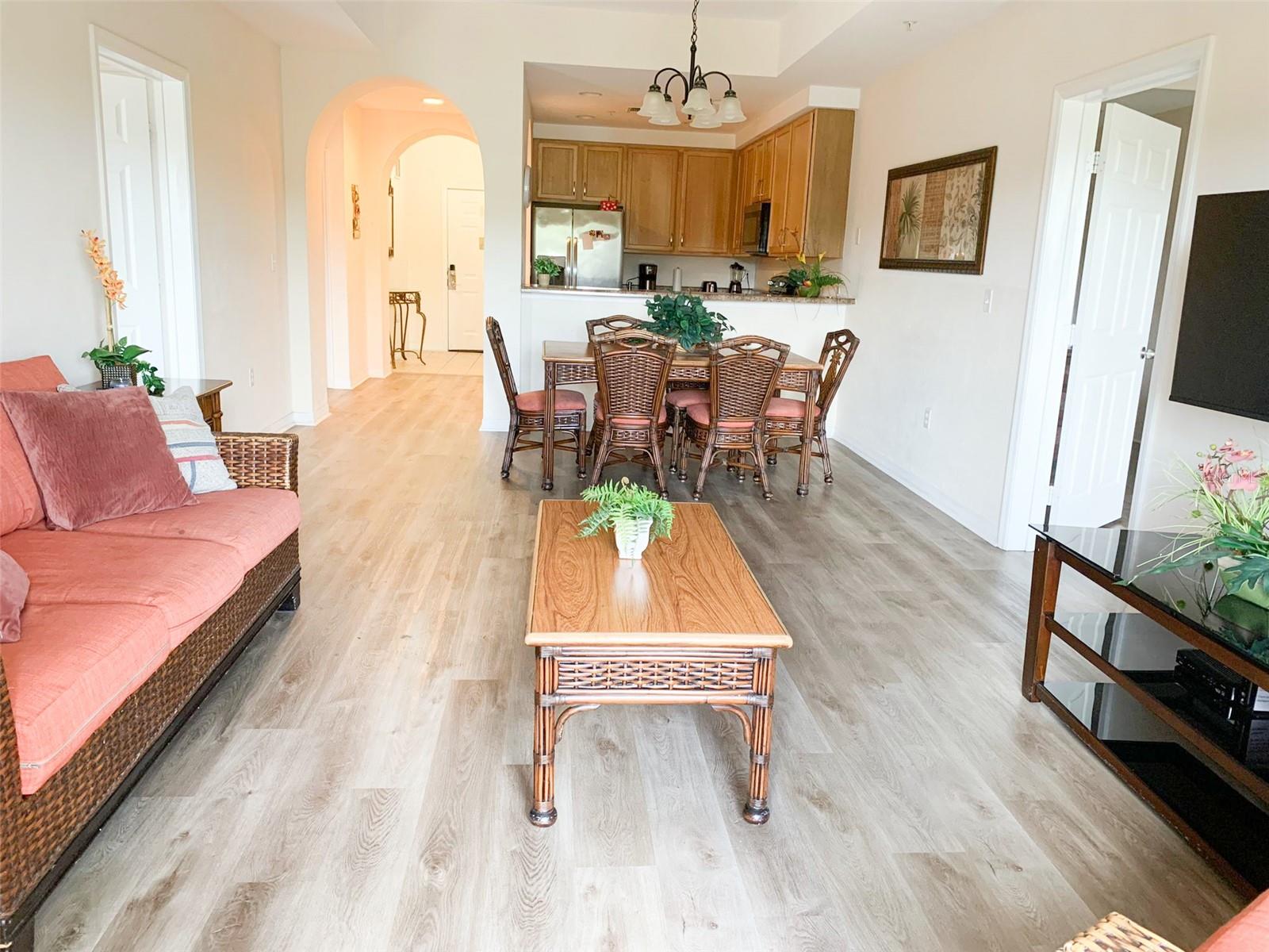 Private and peaceful view from the screened patio on this beautiful condo. The floor plan boasts a larger than expected living and dining room combo with vinyl floors throughout the whole condo. The kitchen is well laid out and has stainless steel appliances with the range, DW and microwave. Primary bedroom has an ensuite bath and a shower that have been completely remodeled. Bedrooms 2 and 3 are spacious and share a second bathroom which is also accessible from the hallway. This condo is sold furnished with appealing Caribbean design. The Caribe Cove resort offers many amenities including a community pool, hot tub, fitness center, arcade room, clubhouse and more. Area attractions, shopping, dining, golf and supermarkets are nearby. Great opportunity for an investor. **Information is deemed correct. It is the buyers responsibility to confirm information including room measurements, pet restrictions and lease restrictions