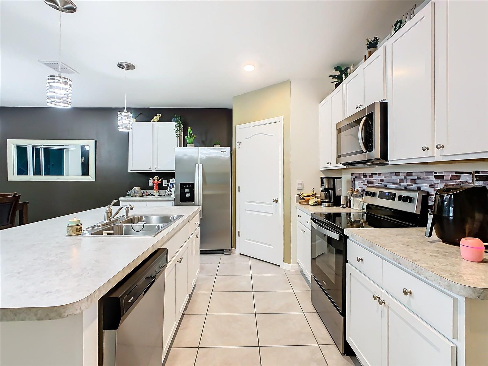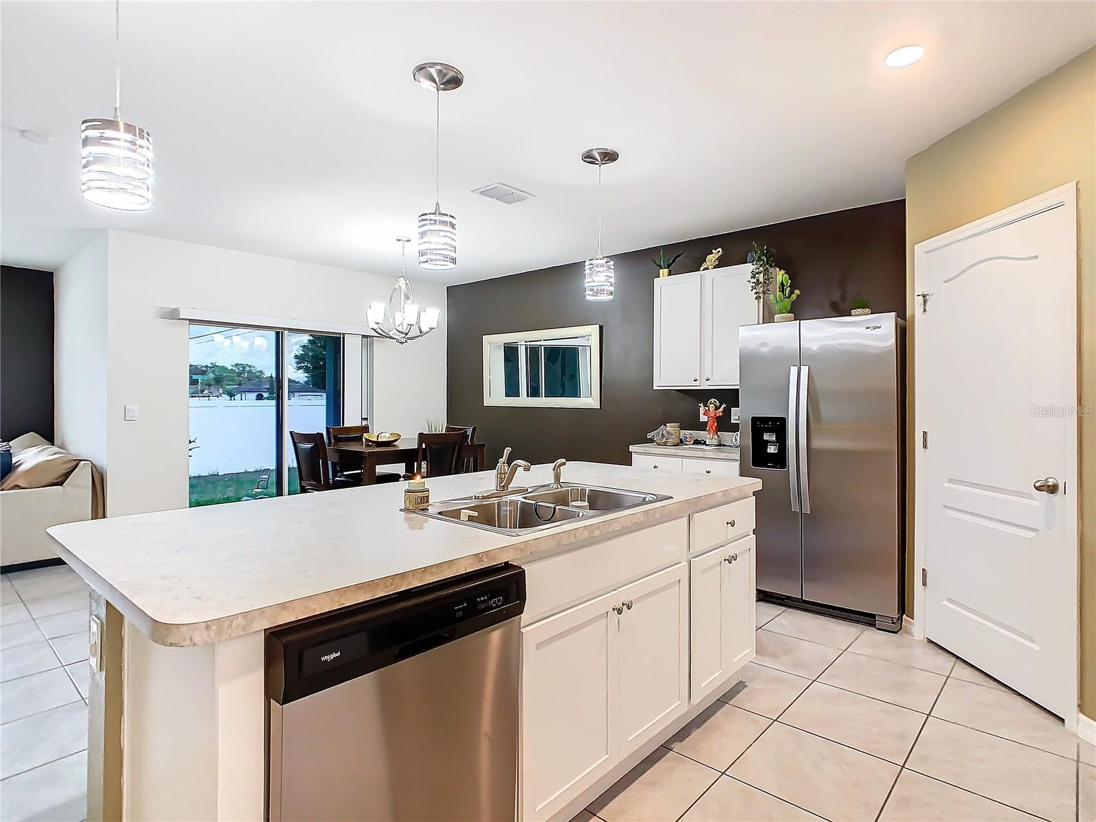 Welcome to your new home! The seller is motivated to sell this incredible modern-style corner lot featuring 4 bedrooms and 2 bathrooms, built in 2022, with a spacious two-car garage. This home boasts a private outdoor courtyard for grilling. As you step inside, you'll be greeted by attractive ceramic flooring and a hallway leading to an open concept floor plan, perfect for entertaining. The beautiful kitchen is equipped with GE stainless steel appliances, cabinets, and three pendant lights on the island for ideal lighting. Ample storage space can be found in the pantry. The large family room provides a comfortable space for relaxation. The owner's suite includes a huge walk-in closet, a private bathroom with a dual-sink vanity, and a remodeled shower with luxurious finishes. Three additional bedrooms offer great space, along with a laundry room featuring cabinets. The house is enclosed by a new fence, providing privacy and a unique touch to the space. Situated in a perfect location, this home offers a lifestyle surrounded by a quiet neighborhood close to various amenities. Enjoy the convenience of schools, restaurants, medical offices, hospitals, and colleges within walking distance. Additionally, the newly opened Poinciana Lakes Plaza, with over 10 recognized stores, is just a 10-minute walk away. Located near U192/John Young Parkway, you have easy access to Disney and all of Central Florida. Don't miss out on this fantastic home. Schedule your appointment today!