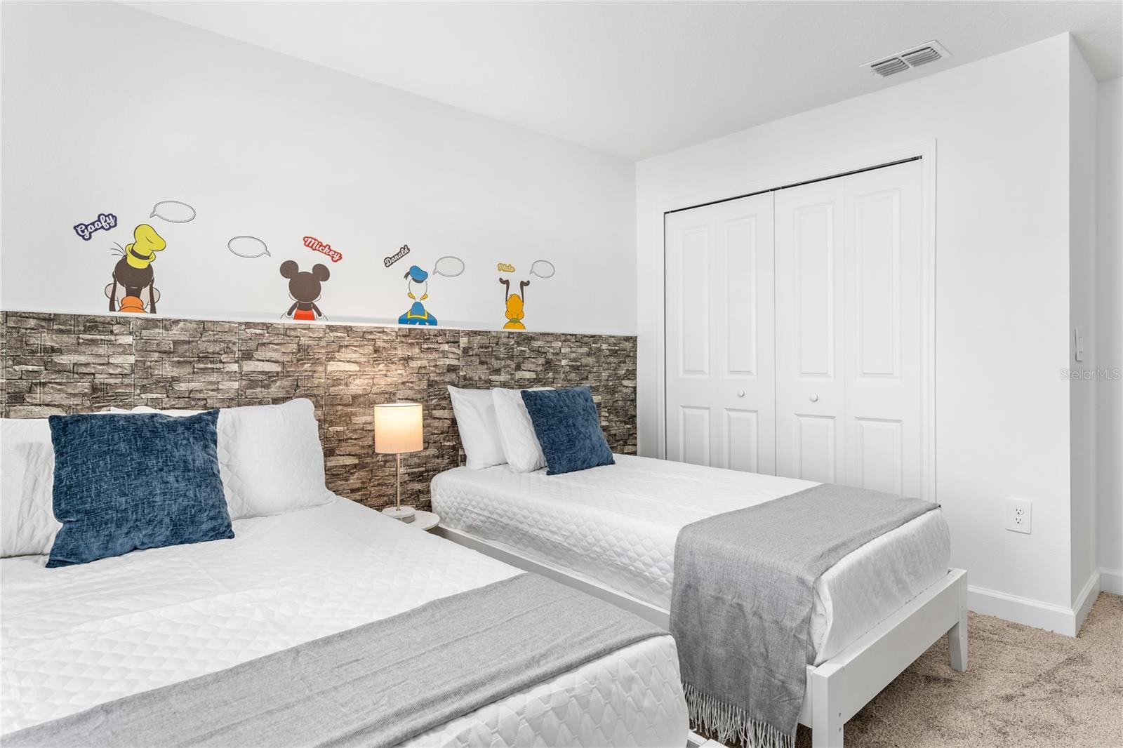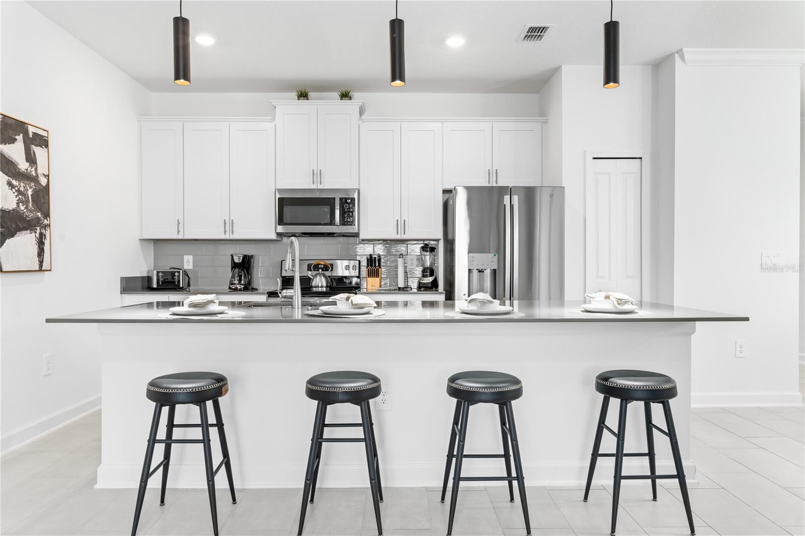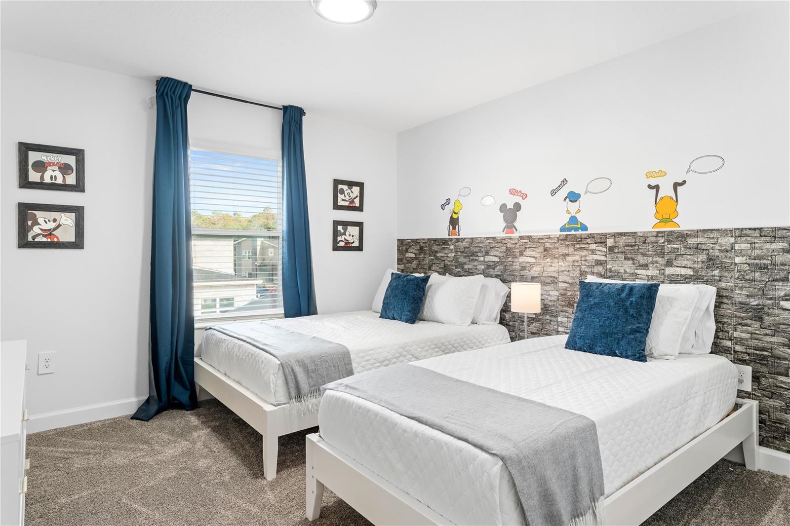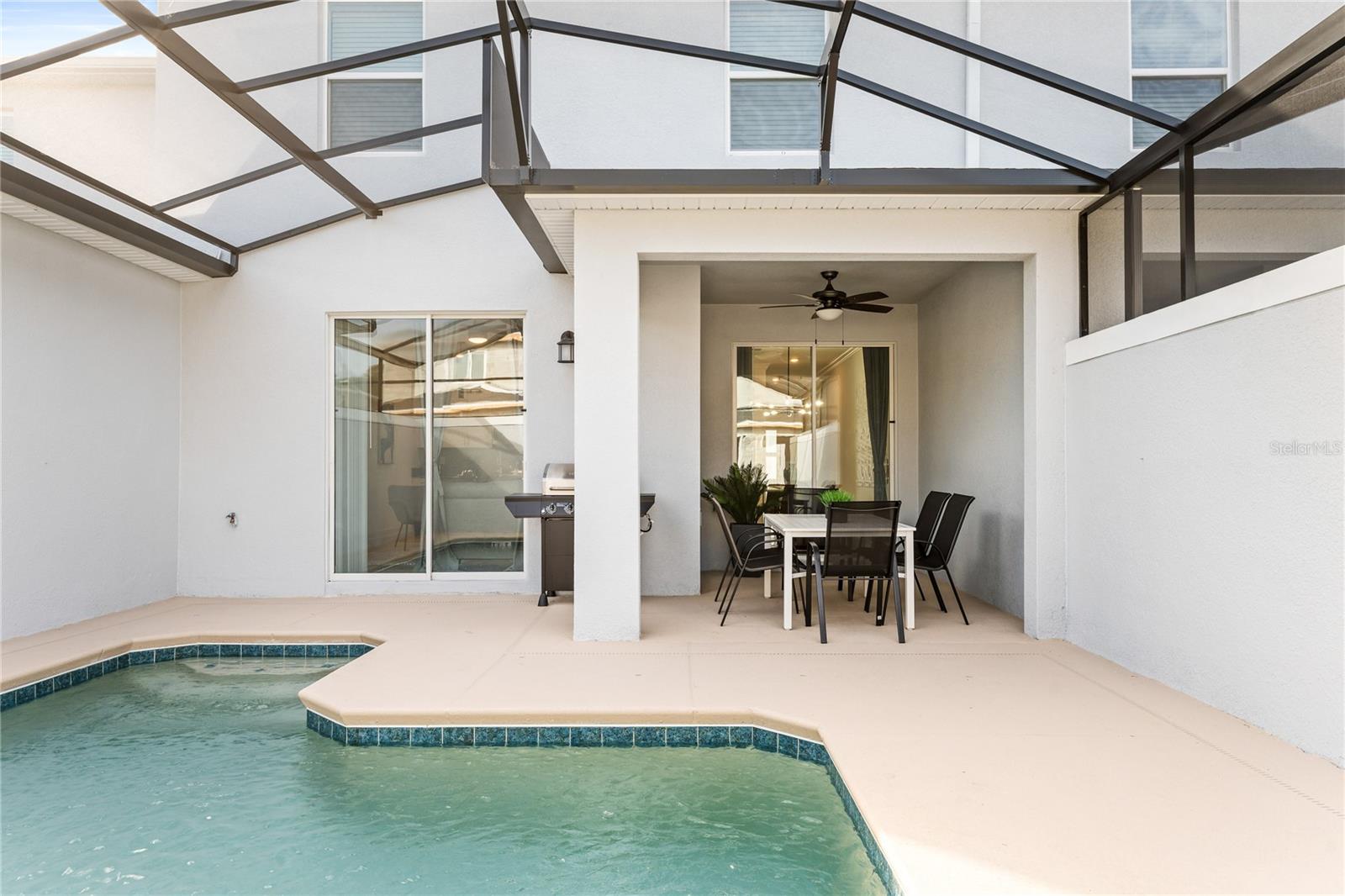 This charming, professionally decorated 4-bedroom, 3-bathroom townhome is located in the desirable Storey Lake community. Featuring a bedroom downstairs and an open floor concept with living, dining, and kitchen areas, this home is perfect for short-term rentals or as a vacation retreat. The kitchen boasts modern finishes, tall wall cabinets, quartz countertops, a central island, and top-tier appliances. Upstairs, you'll find a master bedroom with an en-suite bathroom and three Disney themed bedrooms. The screen enclosed back porch is nicely furnished and includes a private pool, new appliances, carpets, and an upgraded kitchen with a beautiful backsplash. Storey Lake Resort offers an array of amenities, such as a state-of-the-art clubhouse with a billiards room, media zone, swimming pool, lazy river, splash park, fitness center, playground, sports courts, lake/pond, restaurant and bar, nature trails, and kayaking options. Conveniently located just 8 minutes from Disney and close to SeaWorld, Universal Studios, Volcano Bay, shops, supermarkets, and Orlando International Airport (MCO), with easy access to major highways. This property is a fantastic investment opportunity with excellent rental potential or the perfect vacation home in Kissimmee, FL.