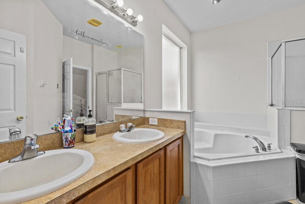 One or more photo(s) has been virtually staged. This is Well-maintained and immaculate property with 6 bedrooms, 4 1/2 bath and 2 car garage home in a renowned golf community. As you enter the home, you instantly find an inviting and spacious living/dining room; home is painted with light neutral color; 2 MASTER BEDROOMS - the largest is on the 1st floor & the other upstairs - perfect for extended or multi-generational family; the Chef’s delight kitchen is equipped w/stainless appliances & granite; the enclosed patio runs the length of the home; the yard is fenced w/a variety of fruit and floral plants (Avocado, Sorrel, Mango, Sugar Cane, Peas, Banana, etc.); the upstairs has the remaining 5 bedrooms plus a loft; hurricane shutters ($9,000 value), NEW ROOF only (2.5 YEARS OLD), SOLAR ($36,000 value) are included plus so much more. The Reserves at Shingle Creek represent Florida living at its best. Community amenities include basketball & tennis courts, nature trails, a playground, golf course & access to Lake Toho for boating, kayaking and fishing, conveniently located to schools, medical facilities, downtown Kissimmee, theme parks, airport, shopping and restaurants! This home offers the “good” life! Come discover YOUR new home!!