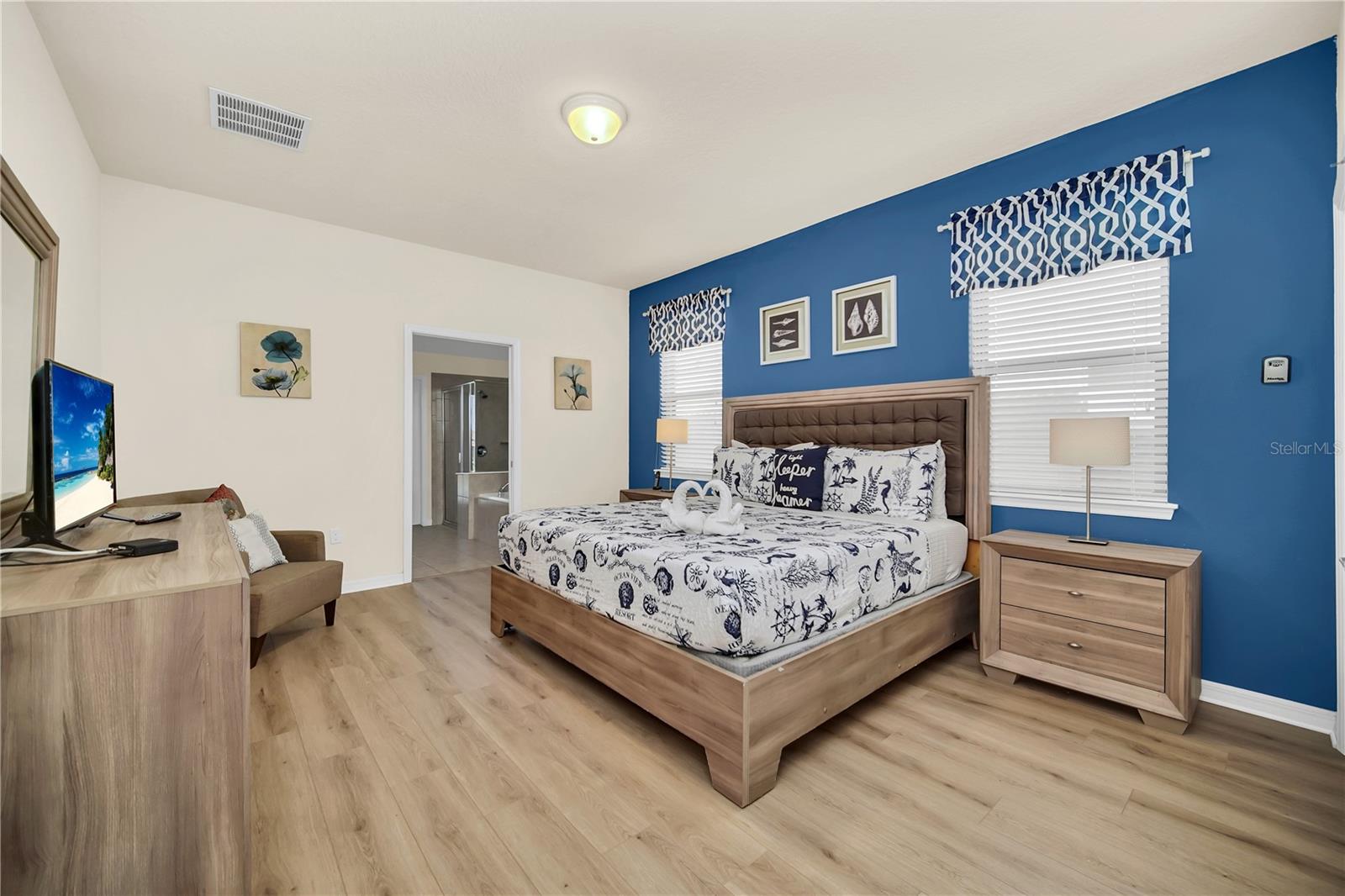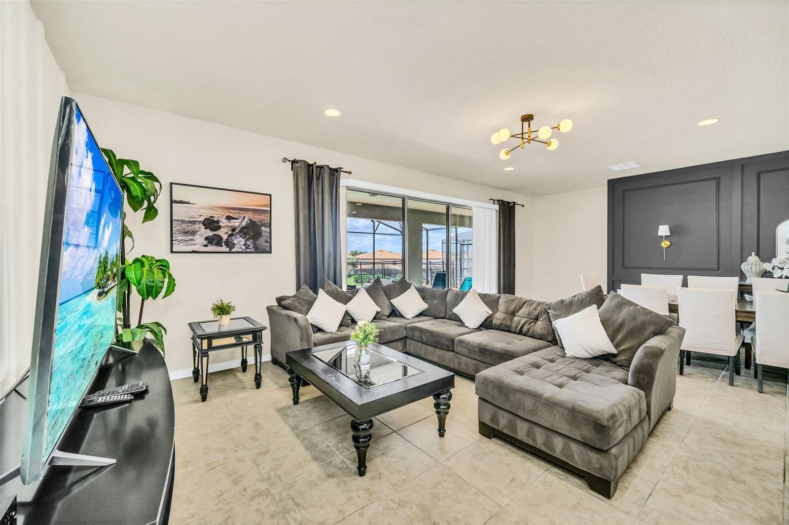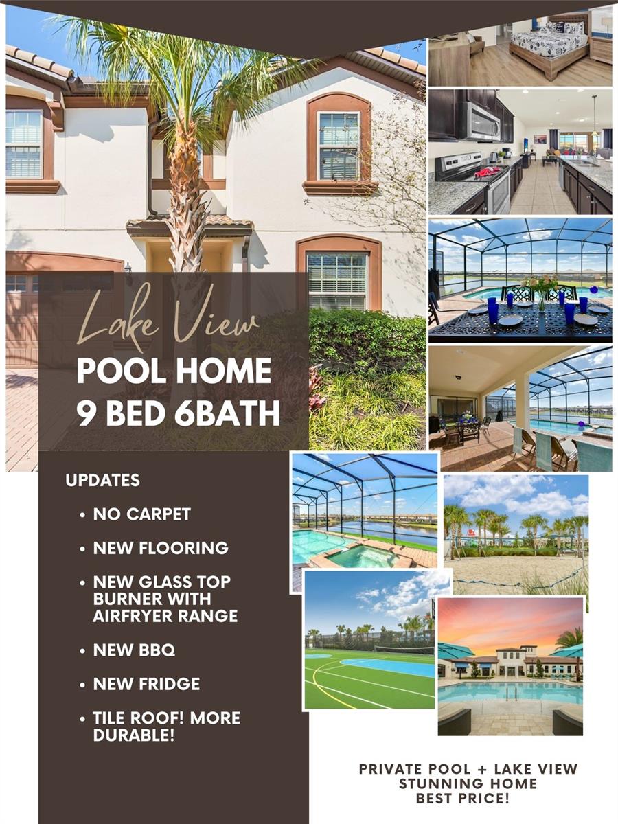 Home updated with No Carpet, New Flooring! Private Pool with Lake view! New Glass top Burner with Airfryer Range. New Fridge New BBQ. Tile Roof! no Shingles, More Durable! A stunning and expansive 9-bedroom, 6-bathroom home nestled in the desirable Windsor at Westside Resort. This luxurious property, built in 2016, offers a generous 4,391 square feet of living space spread across two stories, providing ample room for relaxation and entertainment. The home boasts a private pool, perfect for enjoying the sunny Florida weather. Inside, the split system cooling ensures comfort throughout, while the package heating system keeps the home cozy during cooler months. The kitchen is equipped with high-end stainless steel appliances, granite countertops, and elegant espresso cabinetry. The hardwood floors were replaced in 2023, and there is a brand new set of washing machines. Additionally, the refrigerator is less than five years old. The exterior features a durable frame wood/stucco construction and a cement tile roof, ensuring longevity and minimal maintenance. The beautifully designed home is situated on a sizable lot, offering plenty of outdoor space for activities and gatherings. Located close to major attractions, shopping, and dining, this home provides both luxury and convenience. Don’t miss this exceptional opportunity to own a piece of paradise in one of Kissimmee’s most sought-after communities.