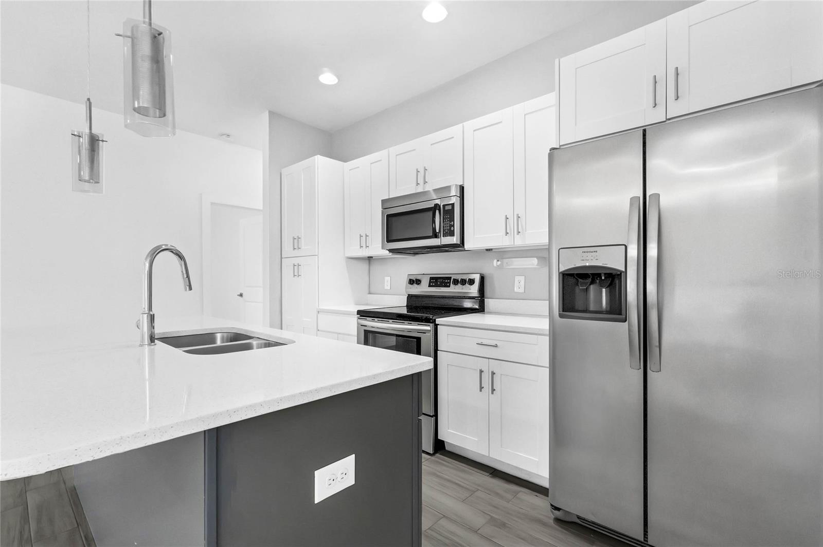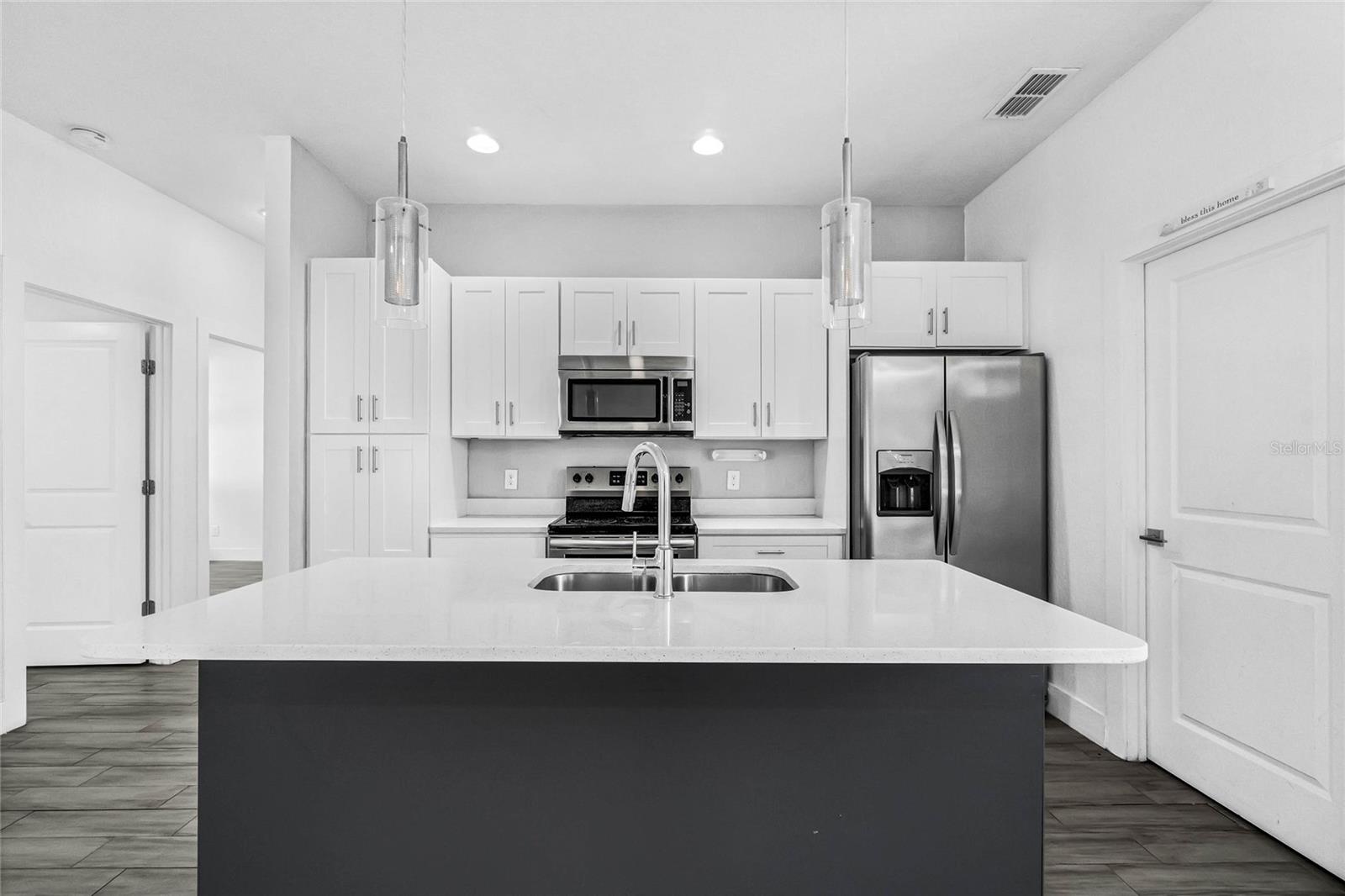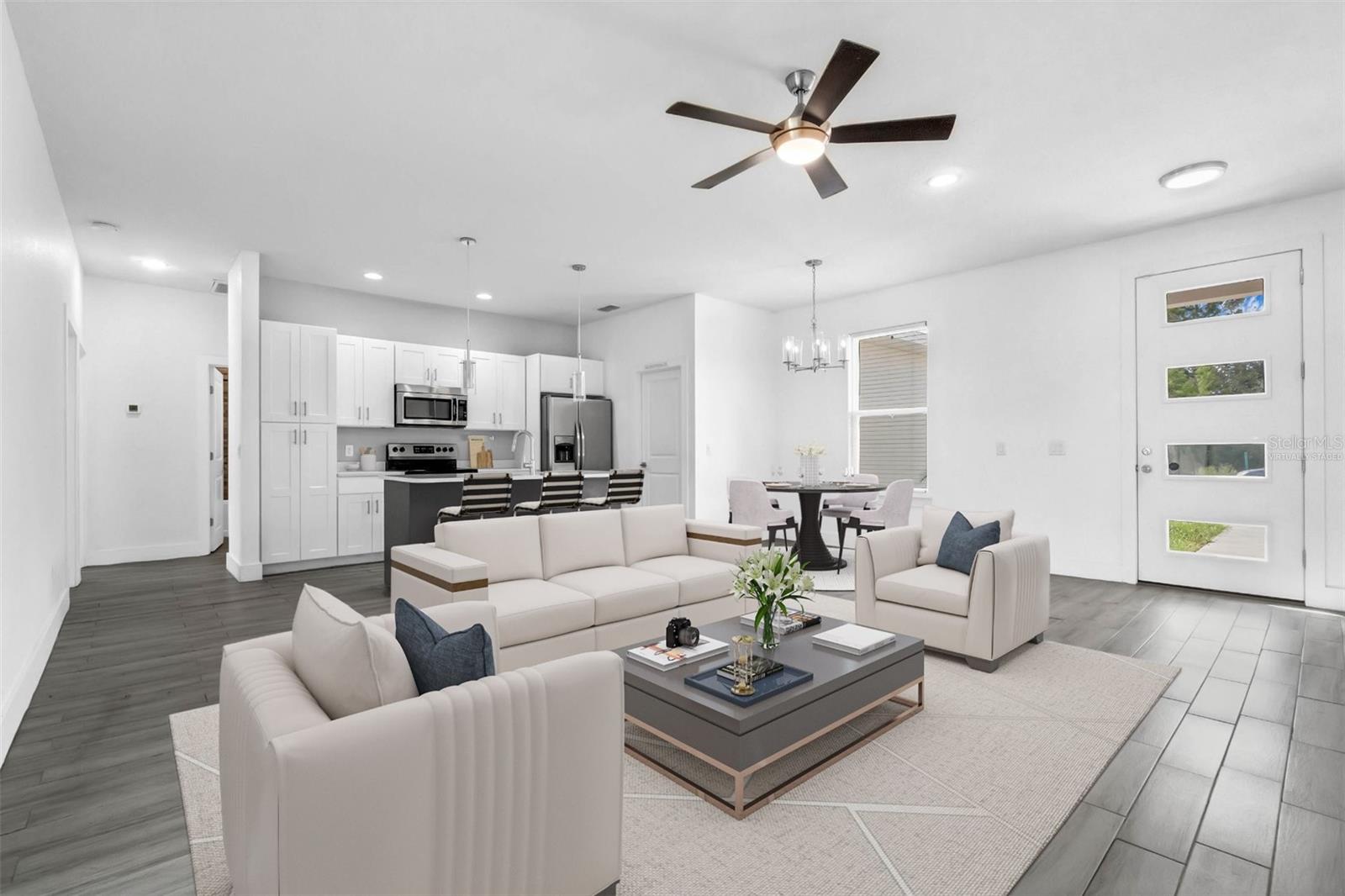 One or more photo(s) has been virtually staged. Here's your chance to BUY before this great deal gets rented! Welcome to this fantastic modern home in Poinciana Villages! This residence features a great open concept floor plan with high ceilings and stylish wood-look tile floors throughout, making cleaning a breeze. Relax and entertain in the spacious living/dining room combo where sliding glass doors to a covered lanai, overlooking your private backyard The chic kitchen showcases shaker-style cabinets, striking solid surface counters, and an oversized island with breakfast bar seating illuminated by pendant lighting and complemented by stainless steel appliances. The thoughtfully designed split bedroom layout ensures privacy for all. Your primary bedroom is a retreat with a tray ceiling, and the en suite bath offers a walk-in closet, dual vanity, and a luxurious shower. Conveniently located off the kitchen, the laundry room provides easy access to the garage. The secondary bath has a gorgeous tile in the tub/shower combo and a modern vanity.. Poinciana Villages boasts an impressive array of amenities including a community pool, fitness center, recreation center, and year-round events. Enjoy the proximity to Charlie Wheeler Community Park, Poinciana Youth Soccer, Deerwood Park Soccer Fields, Poinciana Medical Center, and quick access to US 17, the Turnpike, and I-4. Plus, you're just a short drive from Orlando’s world-famous theme parks and an abundance of shopping and dining options. Don’t miss this opportunity to make this your new home!
