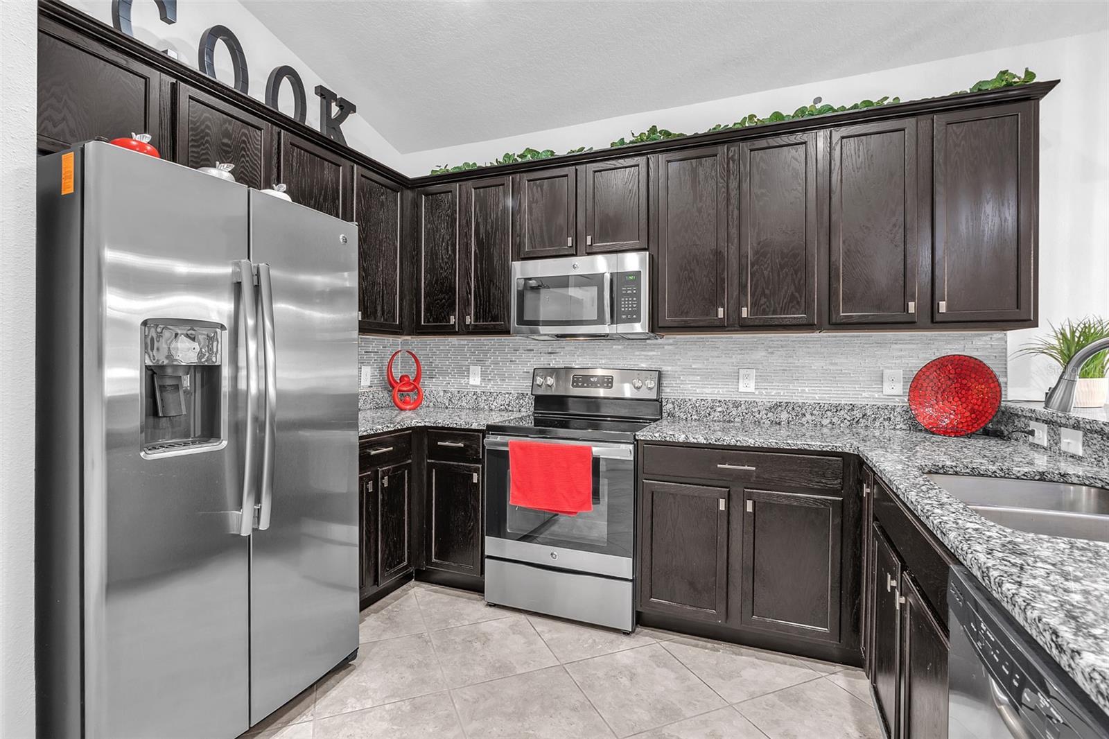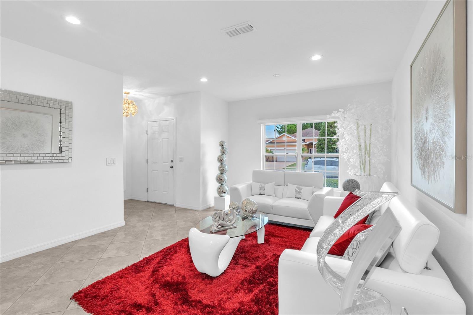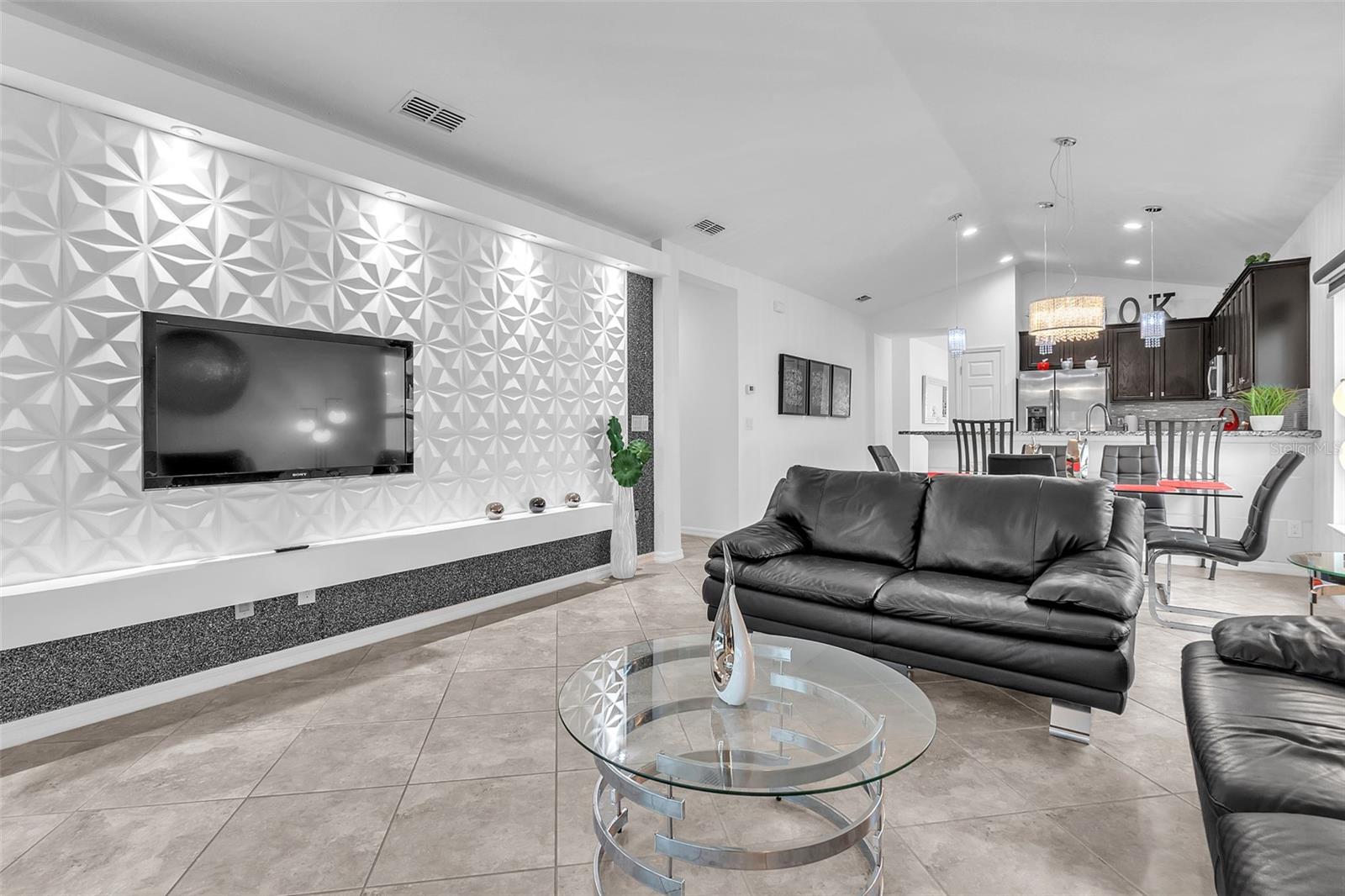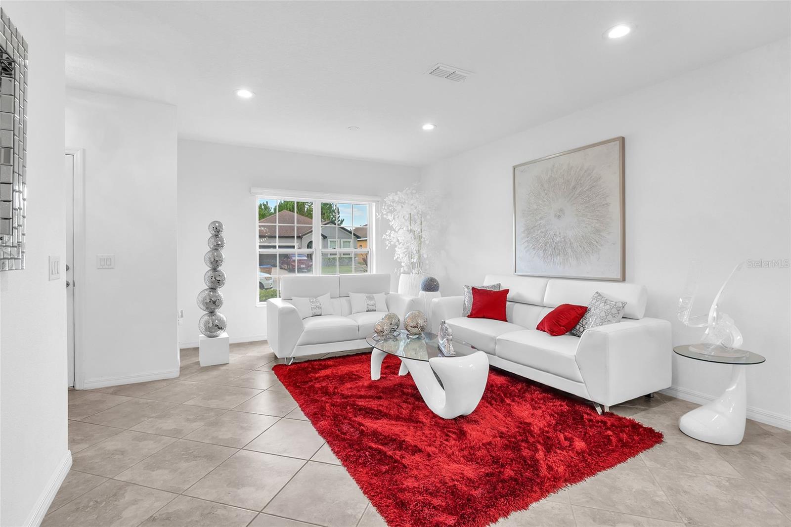 Discover luxury and comfort in this beautifully designed 4-bedroom, 2-bathroom home nestled in the sought-after gated community of Magic Landings. With 1,987 square feet of living space, this home boasts an array of exquisite features and thoughtful upgrades, making it a true gem. As you enter, you'll be greeted by a formal living room and dining room adorned with elegant illusion lamps and stylish curtains, creating a warm and inviting ambiance. The entire home is floored with modern gray 19 x 19 tiles, adding a sleek and contemporary touch throughout. The spacious kitchen is a chef’s dream, featuring granite countertops, large cabinets with crown moldings, a glass slab backsplash, and a beautifully designed tile accent behind the sink to keep the lower cabinets pristine. The sink is equipped with a large Delta faucet, perfect for all your kitchen needs. The informal dining area opens up to a family room, where you'll find a TV wall enhanced with decorative fascia, tiles, and color-changing LED lights—ideal for cozy movie nights. The master bedroom is a serene retreat, complete with a lamp fascia and illusion curtains that add a touch of luxury. The master bathroom offers a spa-like experience with a tiled tub and shower featuring a decorative strip, double quartz sinks, and a private toilet area. The walk-in closet provides ample storage for all your wardrobe essentials. The guest bathroom also features a quartz countertop, maintaining the home's consistent elegance. The laundry room is both functional and stylish, decorated and equipped with cabinets for extra storage. The electric sliding door leads to a fully enclosed porch, perfect for enjoying the outdoors in comfort and privacy. The home is completely fenced, offering added security and peace of mind. The two-car garage is not only spacious but also features custom closets and a cement floor, providing both utility and style. Built in 2017, this immaculate home is move-in ready and the furniture is negotiable. Located close to shopping, dining, and entertainment, and with easy access to major highways connecting you to Orlando and Central Florida, this home is perfectly positioned for convenience. Don’t miss your chance to own this exceptional property—schedule a showing today!