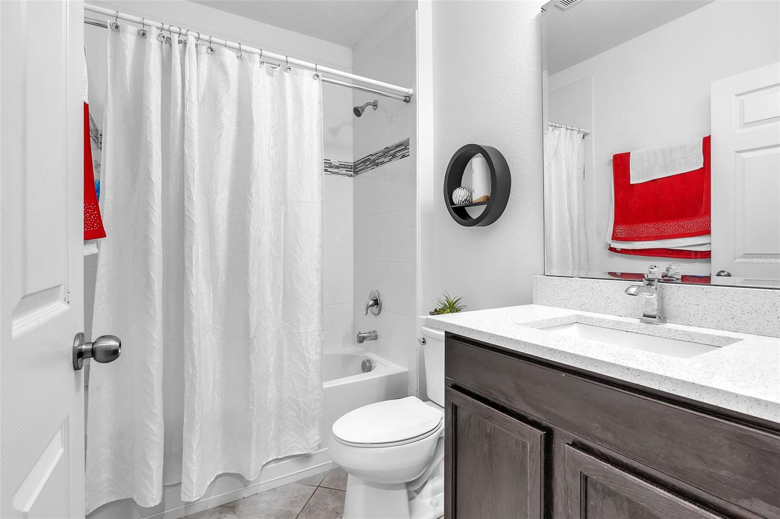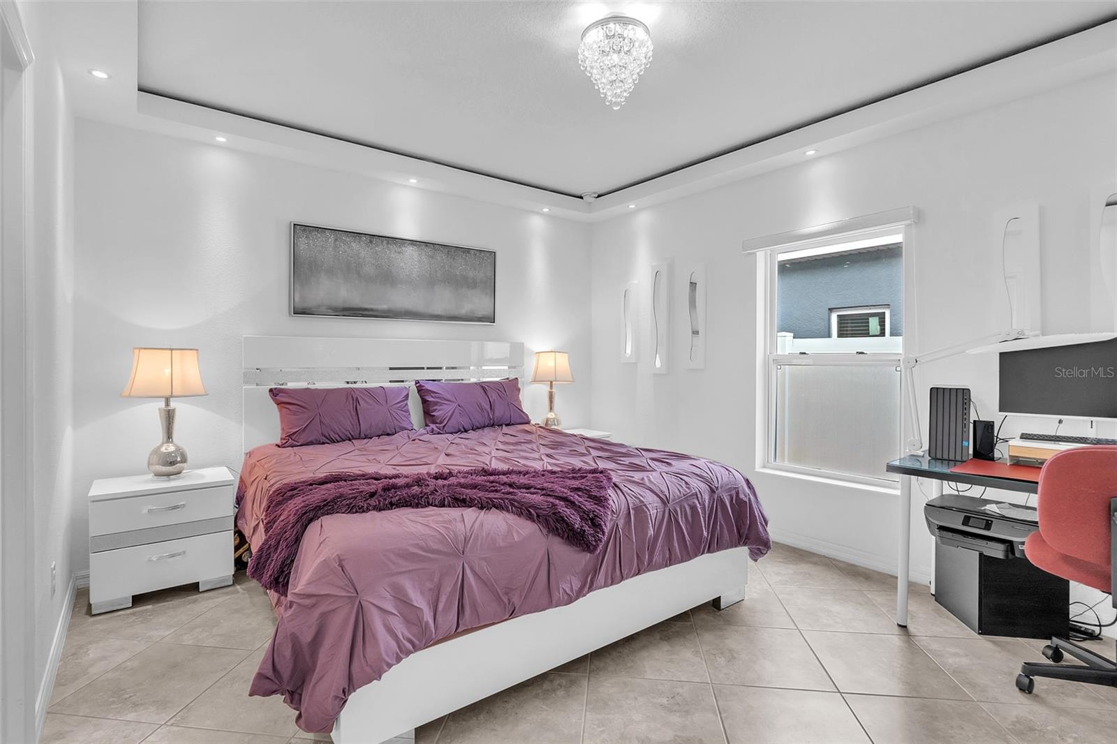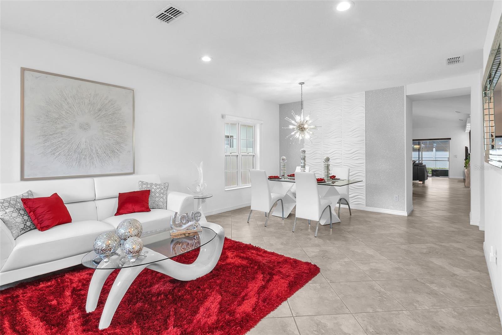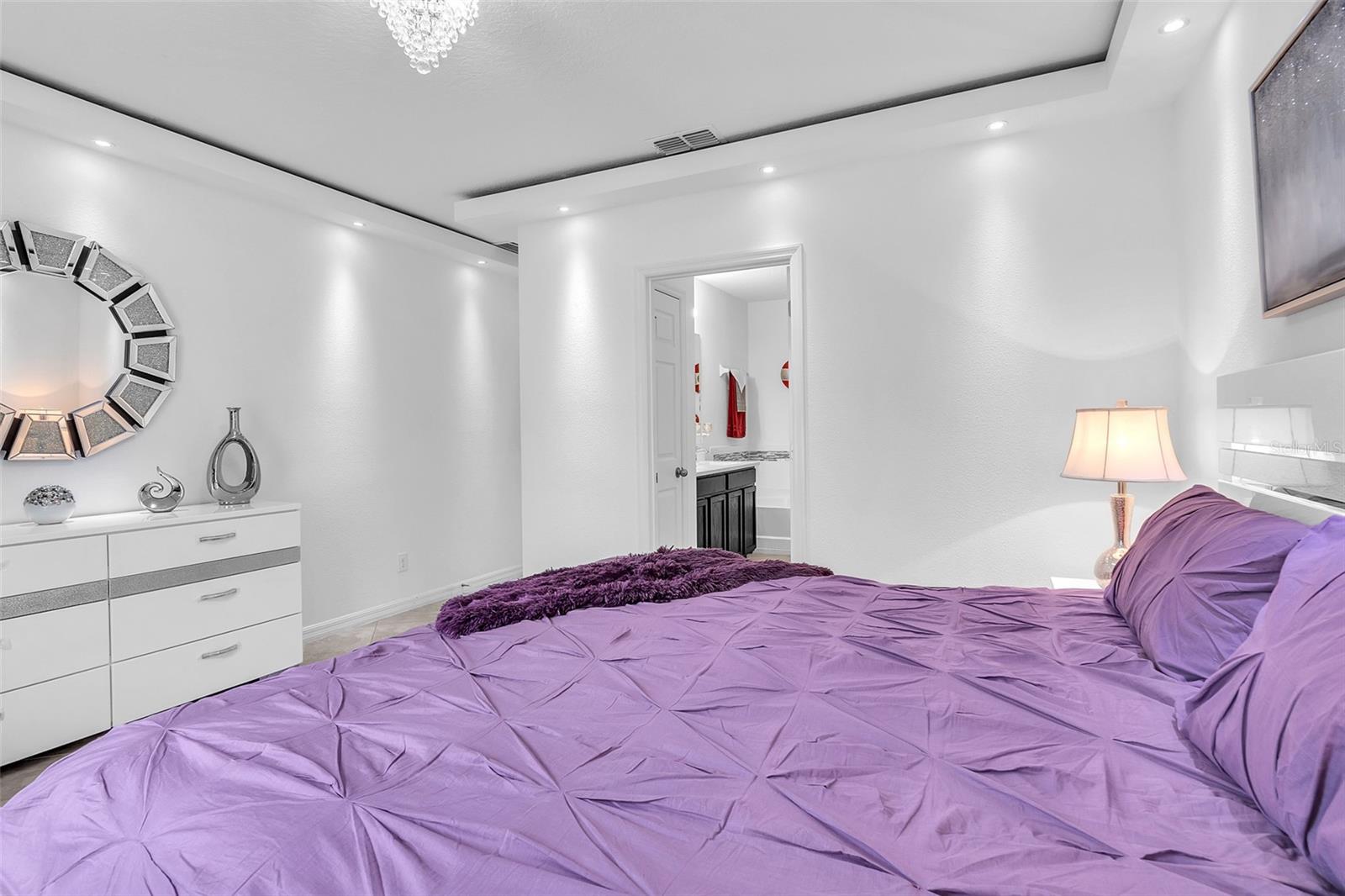 Discover luxury and comfort in this beautifully designed 4-bedroom, 2-bathroom home nestled in the sought-after gated community of Magic Landings. With 1,987 square feet of living space, this home boasts an array of exquisite features and thoughtful upgrades, making it a true gem. As you enter, you'll be greeted by a formal living room and dining room adorned with elegant illusion lamps and stylish curtains, creating a warm and inviting ambiance. The entire home is floored with modern gray 19 x 19 tiles, adding a sleek and contemporary touch throughout. The spacious kitchen is a chef’s dream, featuring granite countertops, large cabinets with crown moldings, a glass slab backsplash, and a beautifully designed tile accent behind the sink to keep the lower cabinets pristine. The sink is equipped with a large Delta faucet, perfect for all your kitchen needs. The informal dining area opens up to a family room, where you'll find a TV wall enhanced with decorative fascia, tiles, and color-changing LED lights—ideal for cozy movie nights. The master bedroom is a serene retreat, complete with a lamp fascia and illusion curtains that add a touch of luxury. The master bathroom offers a spa-like experience with a tiled tub and shower featuring a decorative strip, double quartz sinks, and a private toilet area. The walk-in closet provides ample storage for all your wardrobe essentials. The guest bathroom also features a quartz countertop, maintaining the home's consistent elegance. The laundry room is both functional and stylish, decorated and equipped with cabinets for extra storage. The electric sliding door leads to a fully enclosed porch, perfect for enjoying the outdoors in comfort and privacy. The home is completely fenced, offering added security and peace of mind. The two-car garage is not only spacious but also features custom closets and a cement floor, providing both utility and style. Built in 2017, this immaculate home is move-in ready and the furniture is negotiable. Located close to shopping, dining, and entertainment, and with easy access to major highways connecting you to Orlando and Central Florida, this home is perfectly positioned for convenience. Don’t miss your chance to own this exceptional property—schedule a showing today!