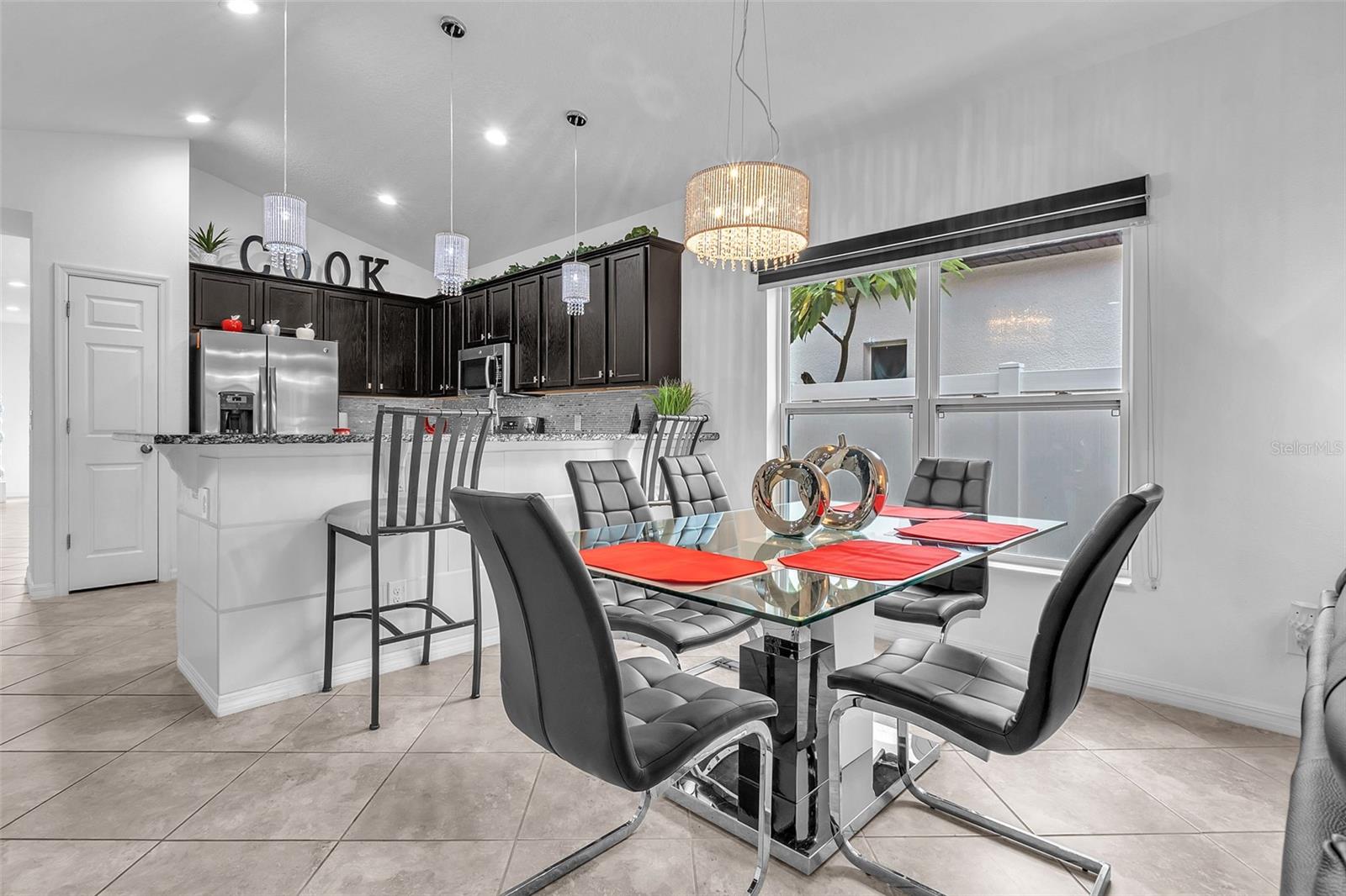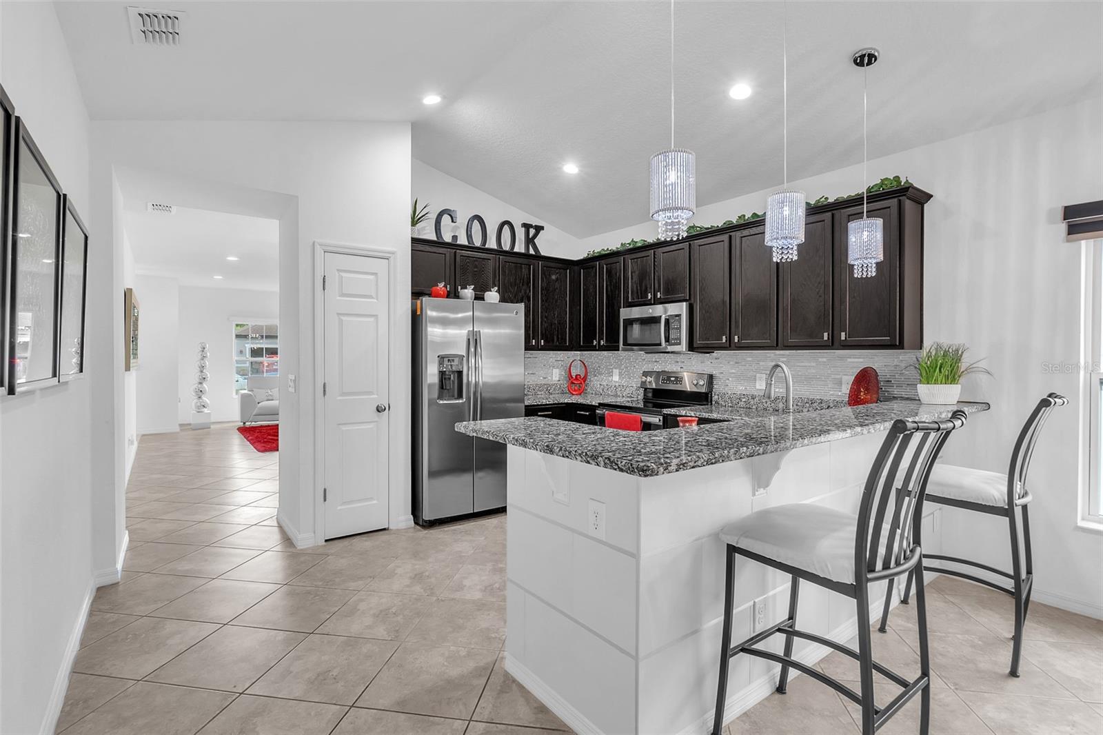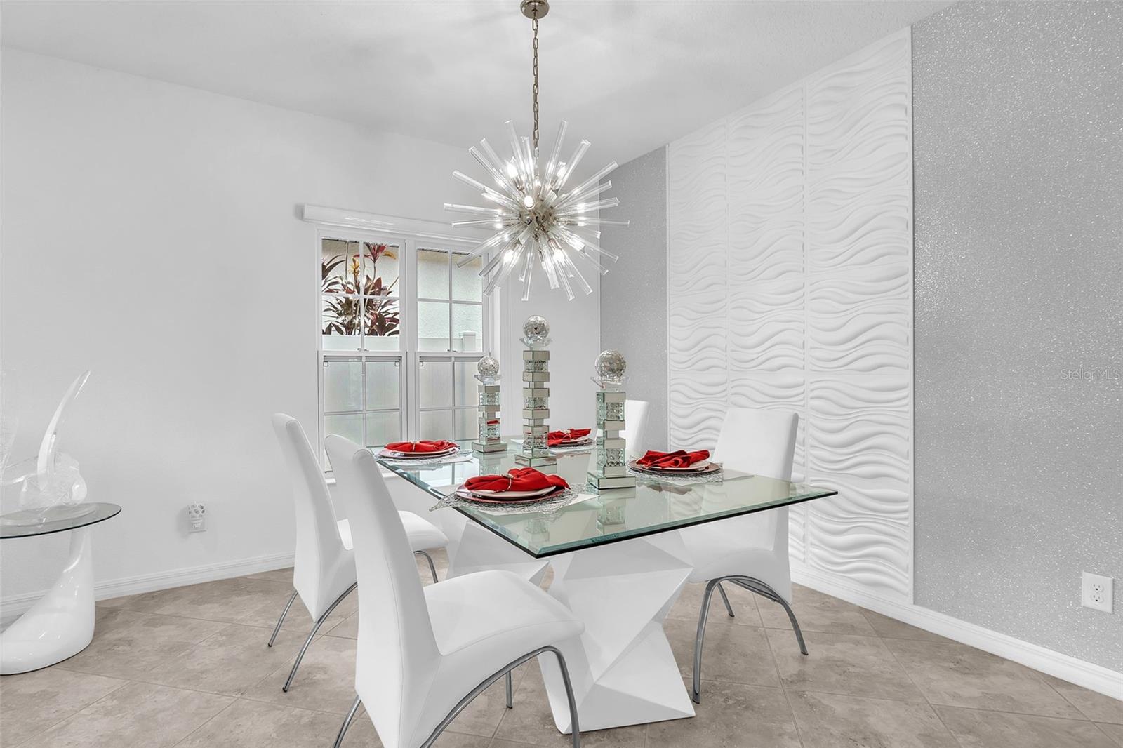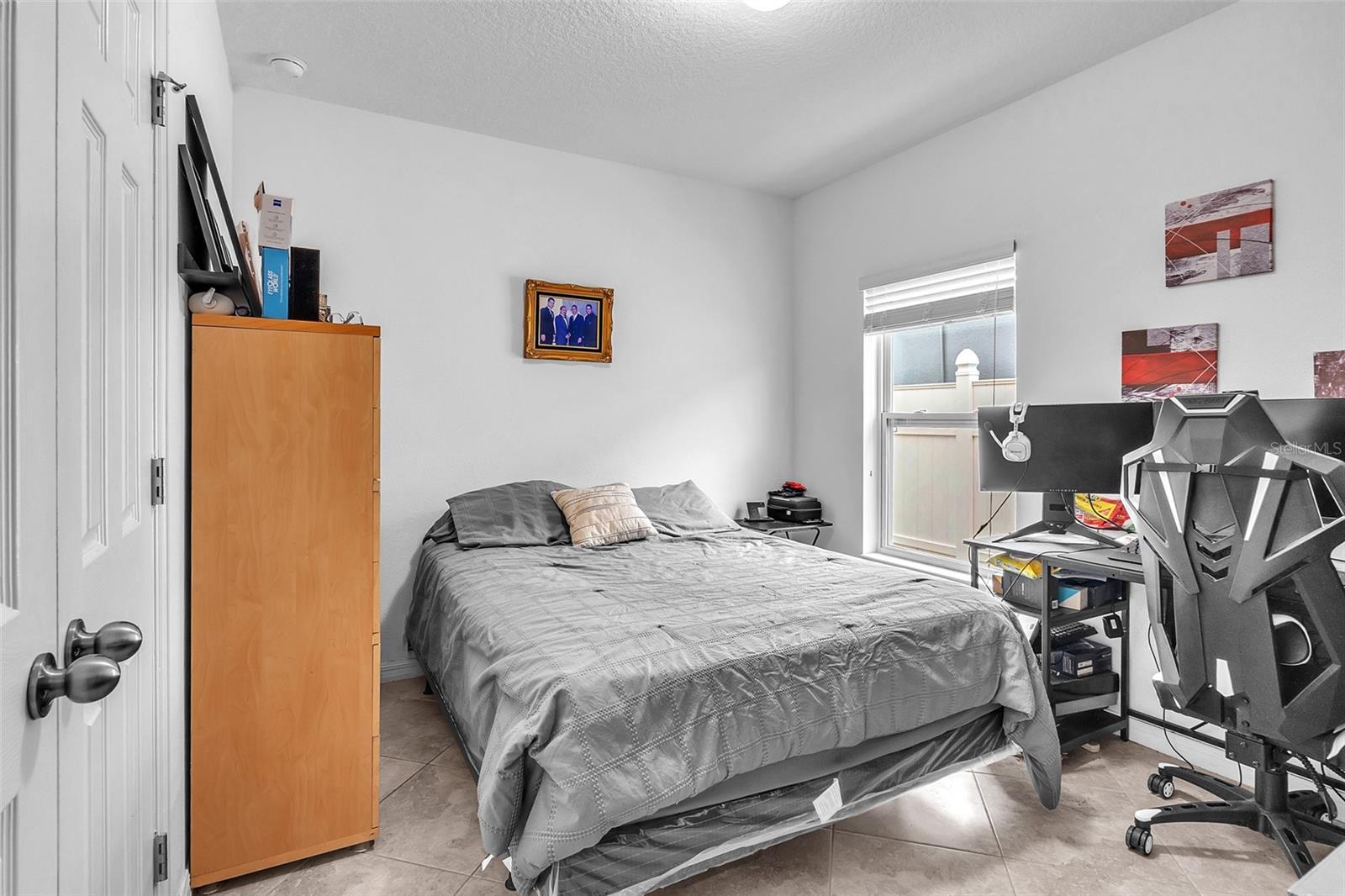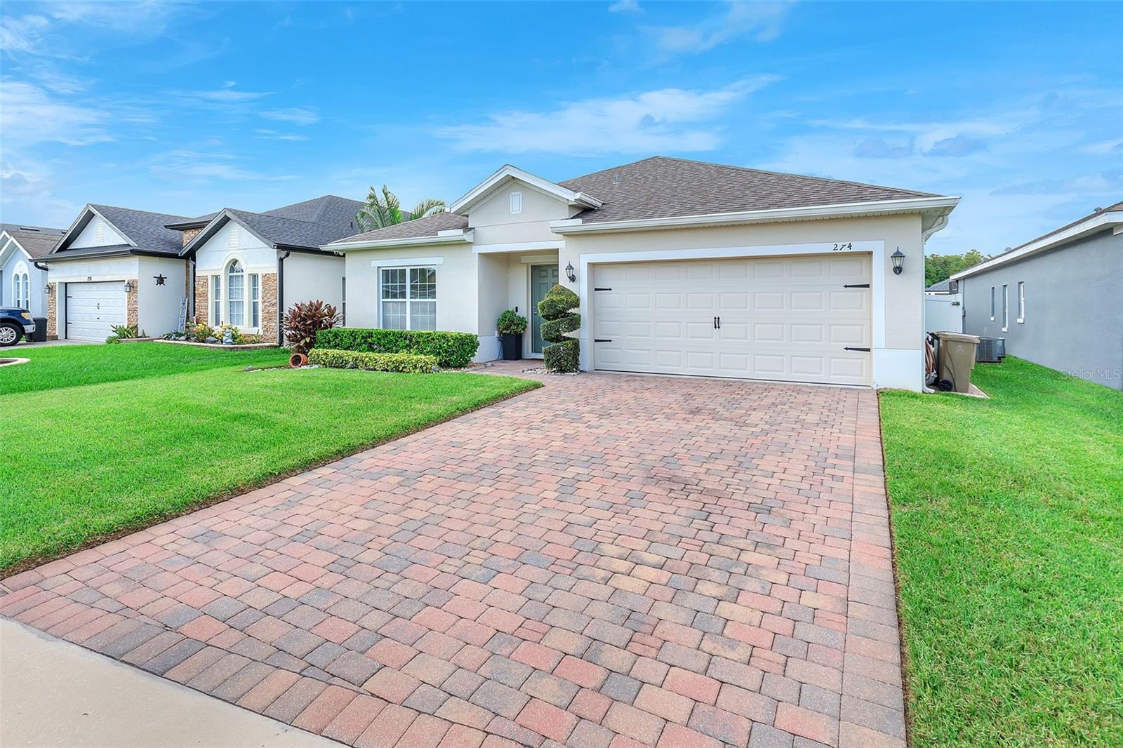 Discover luxury and comfort in this beautifully designed 4-bedroom, 2-bathroom home nestled in the sought-after gated community of Magic Landings. With 1,987 square feet of living space, this home boasts an array of exquisite features and thoughtful upgrades, making it a true gem. As you enter, you'll be greeted by a formal living room and dining room adorned with elegant illusion lamps and stylish curtains, creating a warm and inviting ambiance. The entire home is floored with modern gray 19 x 19 tiles, adding a sleek and contemporary touch throughout. The spacious kitchen is a chef’s dream, featuring granite countertops, large cabinets with crown moldings, a glass slab backsplash, and a beautifully designed tile accent behind the sink to keep the lower cabinets pristine. The sink is equipped with a large Delta faucet, perfect for all your kitchen needs. The informal dining area opens up to a family room, where you'll find a TV wall enhanced with decorative fascia, tiles, and color-changing LED lights—ideal for cozy movie nights. The master bedroom is a serene retreat, complete with a lamp fascia and illusion curtains that add a touch of luxury. The master bathroom offers a spa-like experience with a tiled tub and shower featuring a decorative strip, double quartz sinks, and a private toilet area. The walk-in closet provides ample storage for all your wardrobe essentials. The guest bathroom also features a quartz countertop, maintaining the home's consistent elegance. The laundry room is both functional and stylish, decorated and equipped with cabinets for extra storage. The electric sliding door leads to a fully enclosed porch, perfect for enjoying the outdoors in comfort and privacy. The home is completely fenced, offering added security and peace of mind. The two-car garage is not only spacious but also features custom closets and a cement floor, providing both utility and style. Built in 2017, this immaculate home is move-in ready and the furniture is negotiable. Located close to shopping, dining, and entertainment, and with easy access to major highways connecting you to Orlando and Central Florida, this home is perfectly positioned for convenience. Don’t miss your chance to own this exceptional property—schedule a showing today!