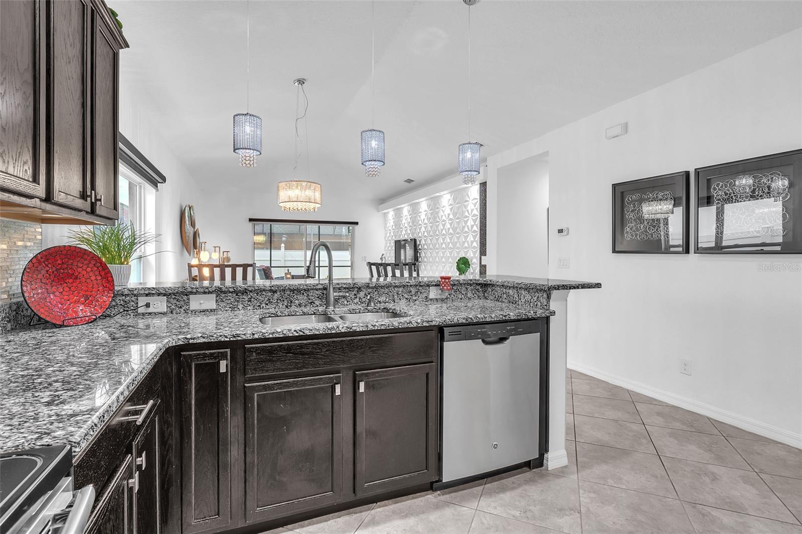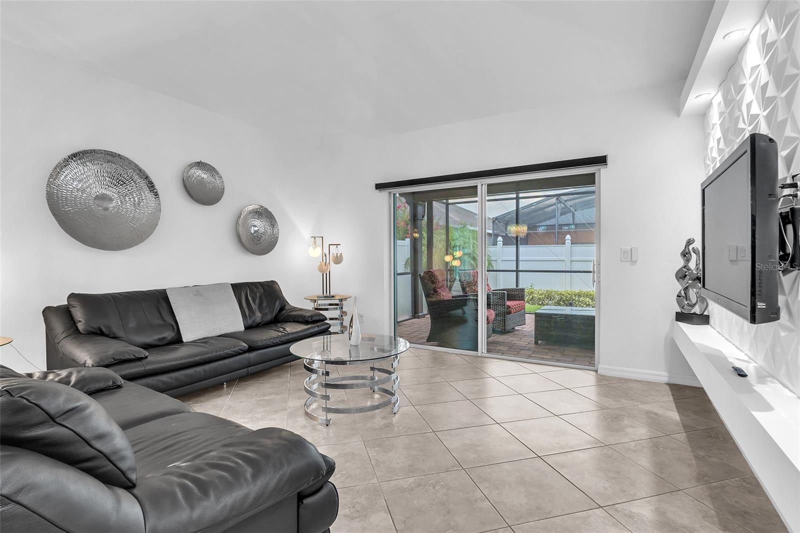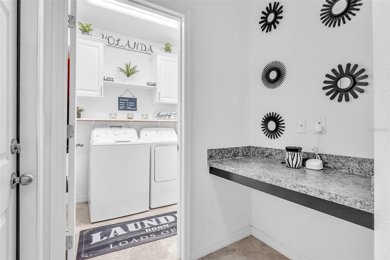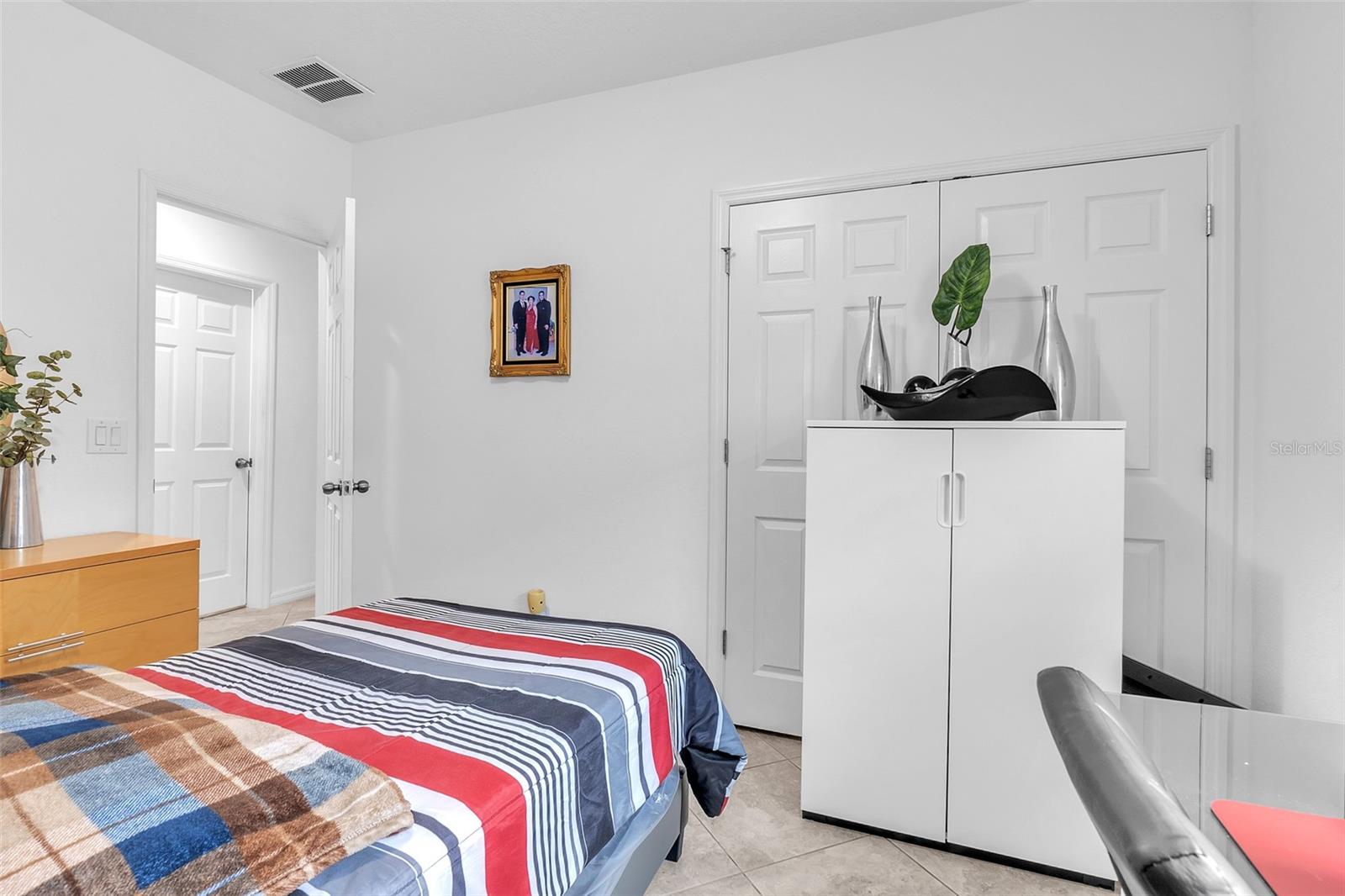 Discover luxury and comfort in this beautifully designed 4-bedroom, 2-bathroom home nestled in the sought-after gated community of Magic Landings. With 1,987 square feet of living space, this home boasts an array of exquisite features and thoughtful upgrades, making it a true gem. As you enter, you'll be greeted by a formal living room and dining room adorned with elegant illusion lamps and stylish curtains, creating a warm and inviting ambiance. The entire home is floored with modern gray 19 x 19 tiles, adding a sleek and contemporary touch throughout. The spacious kitchen is a chef’s dream, featuring granite countertops, large cabinets with crown moldings, a glass slab backsplash, and a beautifully designed tile accent behind the sink to keep the lower cabinets pristine. The sink is equipped with a large Delta faucet, perfect for all your kitchen needs. The informal dining area opens up to a family room, where you'll find a TV wall enhanced with decorative fascia, tiles, and color-changing LED lights—ideal for cozy movie nights. The master bedroom is a serene retreat, complete with a lamp fascia and illusion curtains that add a touch of luxury. The master bathroom offers a spa-like experience with a tiled tub and shower featuring a decorative strip, double quartz sinks, and a private toilet area. The walk-in closet provides ample storage for all your wardrobe essentials. The guest bathroom also features a quartz countertop, maintaining the home's consistent elegance. The laundry room is both functional and stylish, decorated and equipped with cabinets for extra storage. The electric sliding door leads to a fully enclosed porch, perfect for enjoying the outdoors in comfort and privacy. The home is completely fenced, offering added security and peace of mind. The two-car garage is not only spacious but also features custom closets and a cement floor, providing both utility and style. Built in 2017, this immaculate home is move-in ready and the furniture is negotiable. Located close to shopping, dining, and entertainment, and with easy access to major highways connecting you to Orlando and Central Florida, this home is perfectly positioned for convenience. Don’t miss your chance to own this exceptional property—schedule a showing today!
