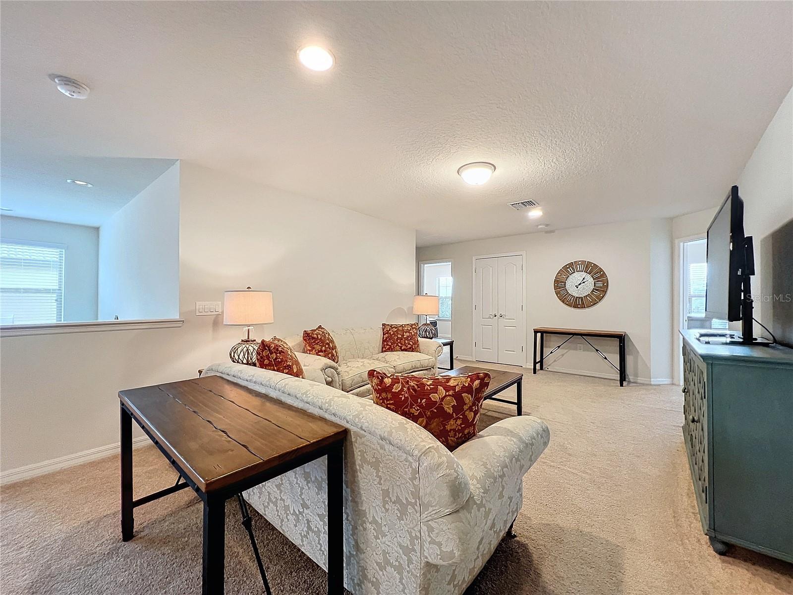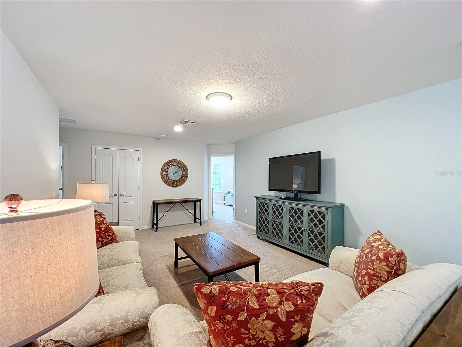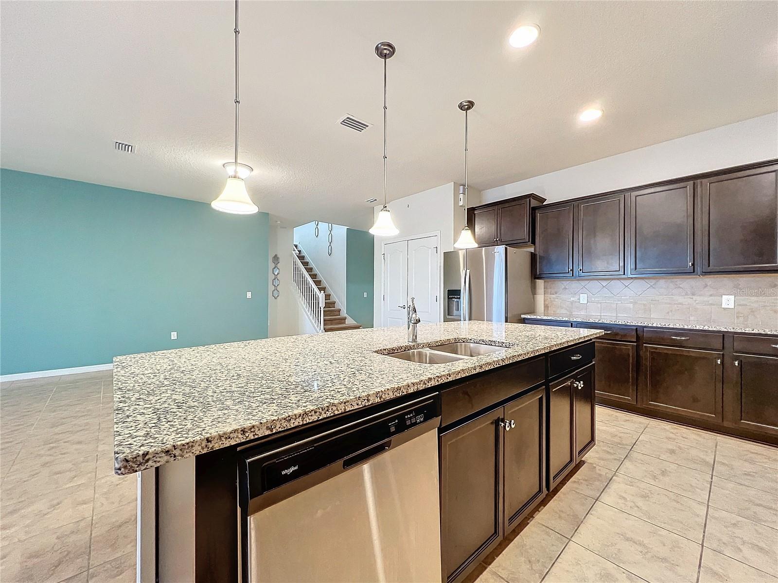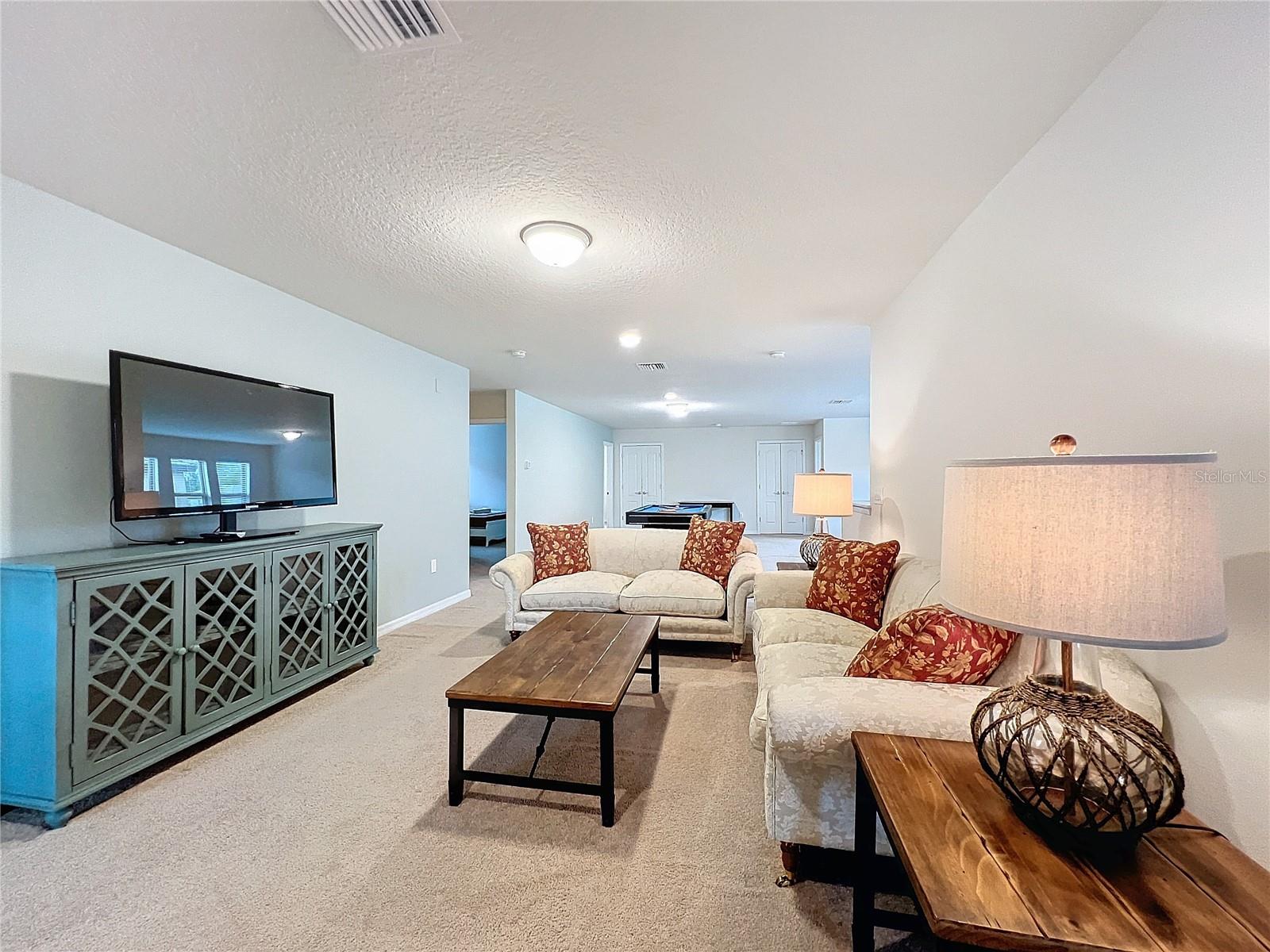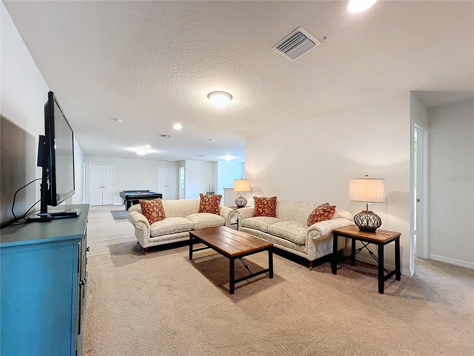 Experience the ultimate vacation retreat at Windsor at Westside Resort with this exquisite water view 9-bedroom, 6-bathroom pool home, perfectly situated on one of the community's prime lots. Enjoy captivating views of the pond from this fabulous home that features a spacious open floor plan designed for both relaxation and entertainment. The gourmet kitchen boasts dark wood cabinets, sleek stone countertops, stainless steel appliances, and a generous breakfast bar that seamlessly flows into the living area, making it ideal for gatherings. The adjacent dining area is perfect for shared meals. Sliding glass doors open to a huge, covered lanai with a heated pool and spa set on a brick paver deck, offering a serene space to unwind and enjoy the Florida lifestyle. The first-floor master bedroom provides a luxurious retreat, and an additional large bedroom on the same floor is conveniently located next to a full bathroom. Upstairs, you'll find a massive loft area that has the flexibility to be used as a games room, movie theater or play area, along with 7 more bedrooms to accommodate family and friends. Windsor at Westside is a premier gated community located just minutes from Disney World, featuring top-tier amenities including a resort-style clubhouse, heated pool and spa, lazy river, water playground, fitness center, on-site store, sand volleyball court, tennis and basketball courts, a games room, and a restaurant and bar. This home is the perfect gateway to endless fun and relaxation in Central Florida!