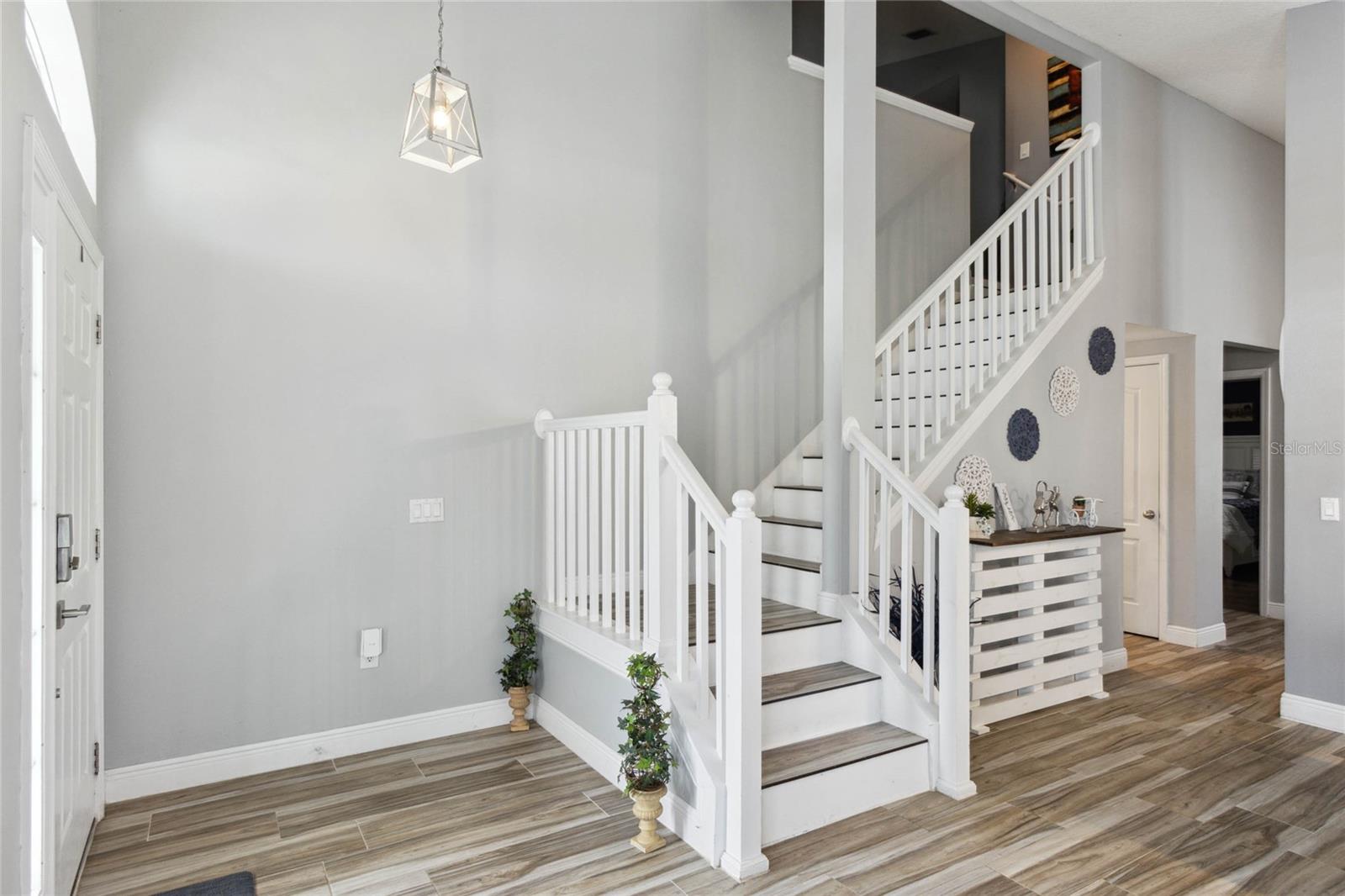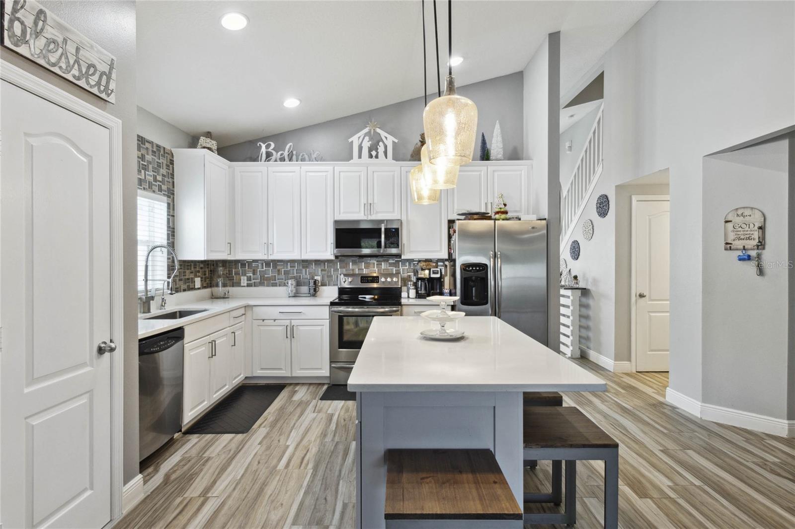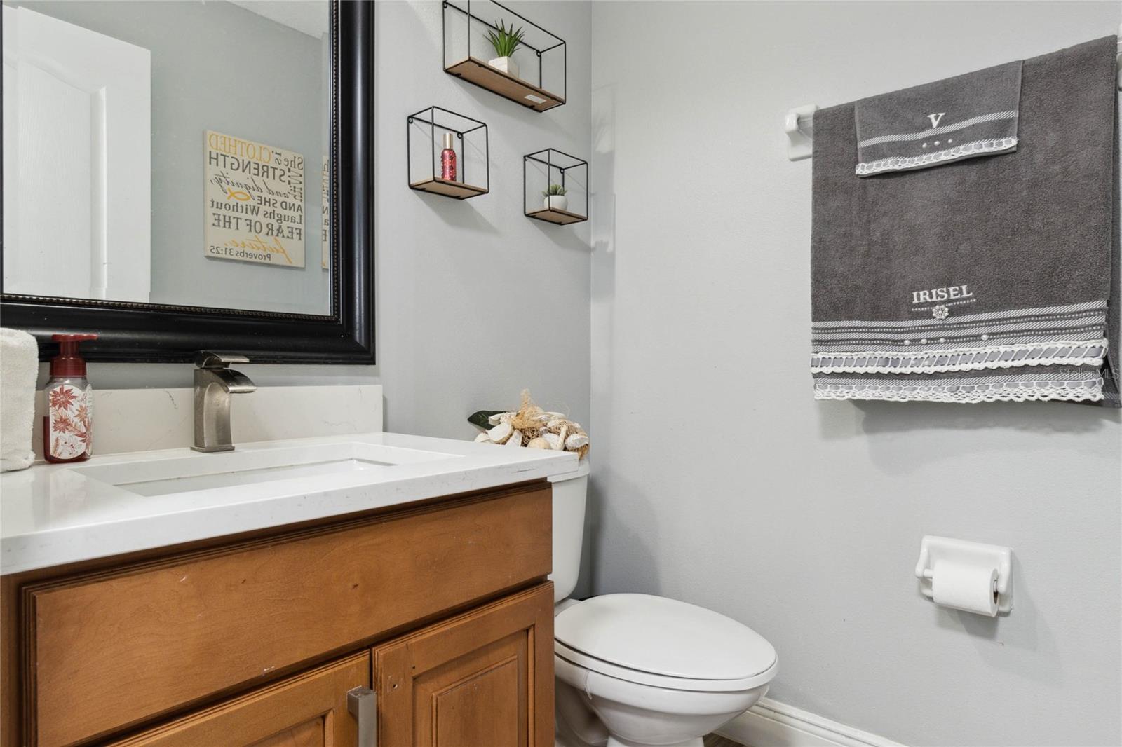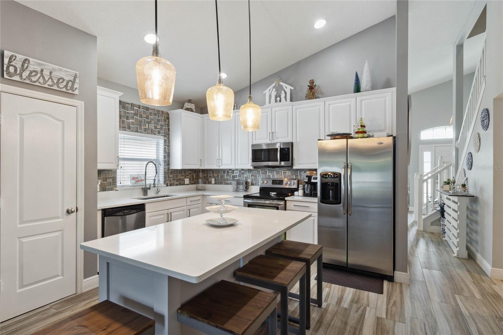 Welcome to this stunning two-story home nestled within a very pleasant guard-gated community, offering both privacy and security. Located on a tranquil cul-de-sac street, this residence features a spacious and meticulously extended landscaped backyard, enclosed by a beautiful fence—perfect for outdoor gatherings and relaxation with a backdoor to the pond. The Primary bedroom, located at the first floor has a stunning view to the backyard. Inside, you'll be captivated by the exquisitely decorated, upgraded kitchen, complete with top-of-the-line appliances, elegant countertops, and stylish cabinetry. Additional highlights include a fully paid-for solar panel system, providing energy efficiency and cost savings, and a water filtration system for clean and fresh water throughout the home. The a/c units is from 2022 and the roof was completely replaced in 2024. Conveniently situated just 15 minutes from the airport and 10 minutes from Lake Nona Medical facilities, this property offers luxury, affordability and accessibility, creating an ideal haven for everyday life.