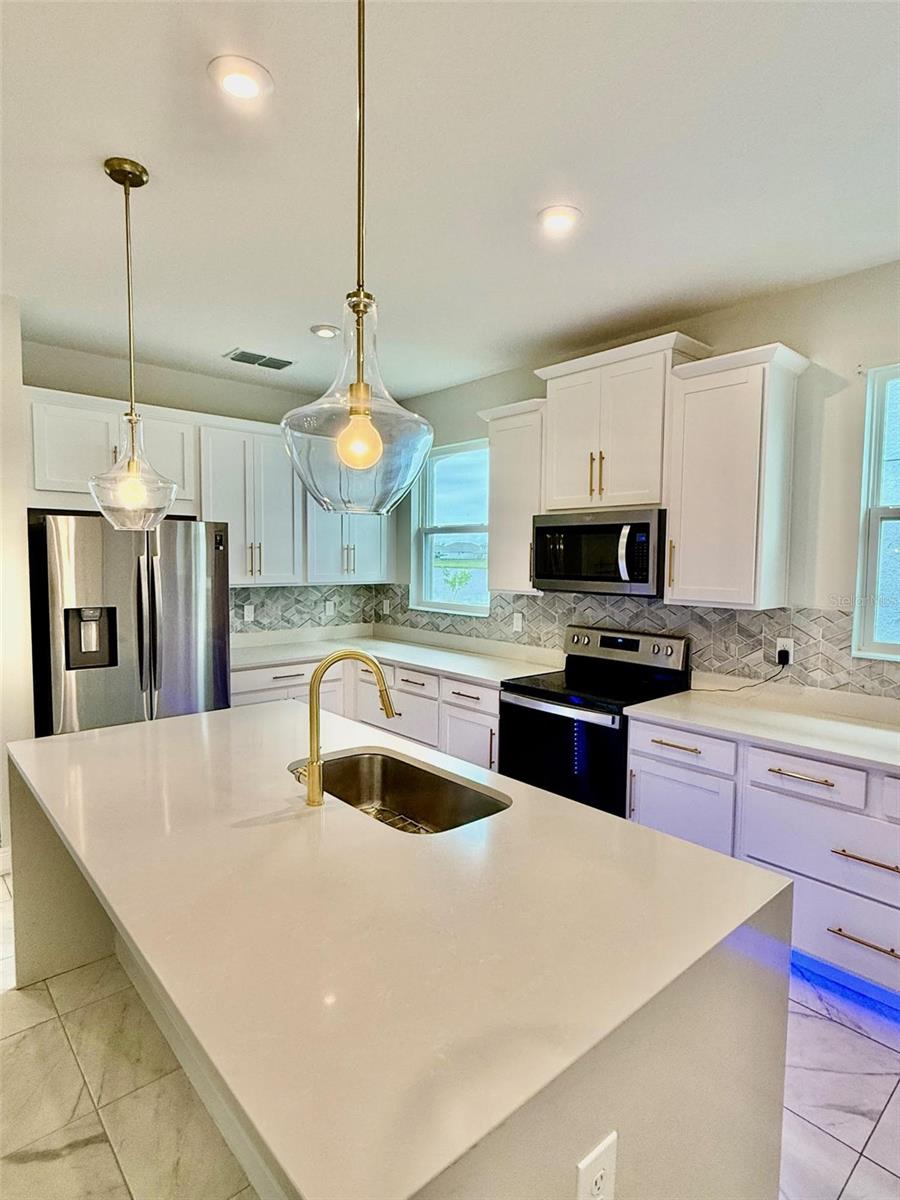 Step into a world of comfort and convenience in this stunning 3-bedroom, 2-bathroom home in TOHOQUA. The spacious gathering room, adorned with natural light from the oversized covered and enclosed patio, sets the perfect ambiance for relaxation and entertainment. As you enter, you'll be greeted by a welcoming foyer that leads to a gourmet kitchen designed for culinary enthusiasts. The upgraded kitchen features a large island with quartz countertops, a breakfast bar, a pantry, marble-like tile, and stainless steel appliances. The owner's suite, located just off the gathering room, offers a private retreat with a huge walk-in closet, tray ceilings, and a luxurious owner's bathroom featuring a double sink cultured marble vanity. This home offers a perfect blend of comfort and functionality. It's ideal for relaxation and everyday living with high ceilings, gutters for added protection, a flexible office space, and a spacious lanai overlooking the lake.