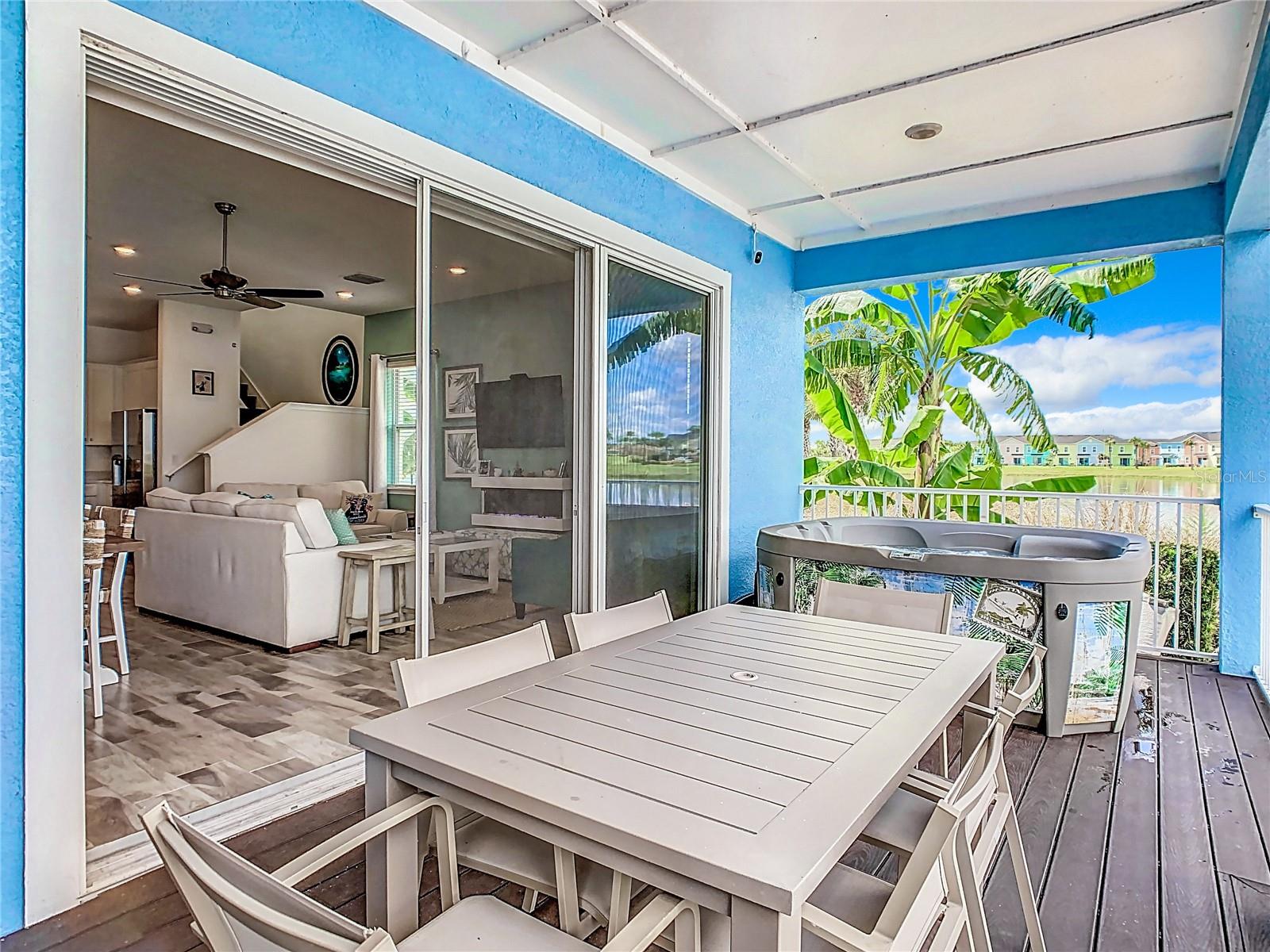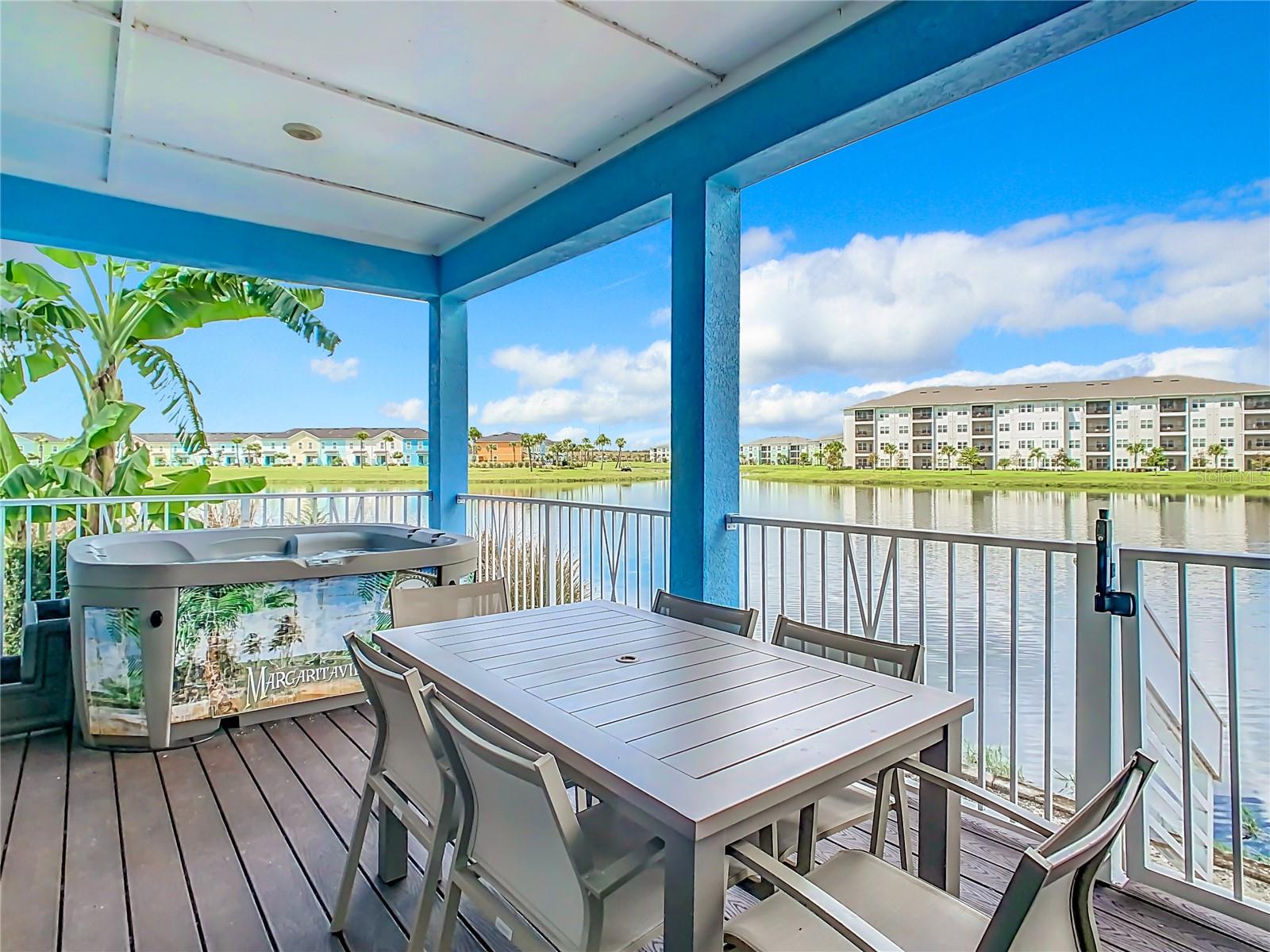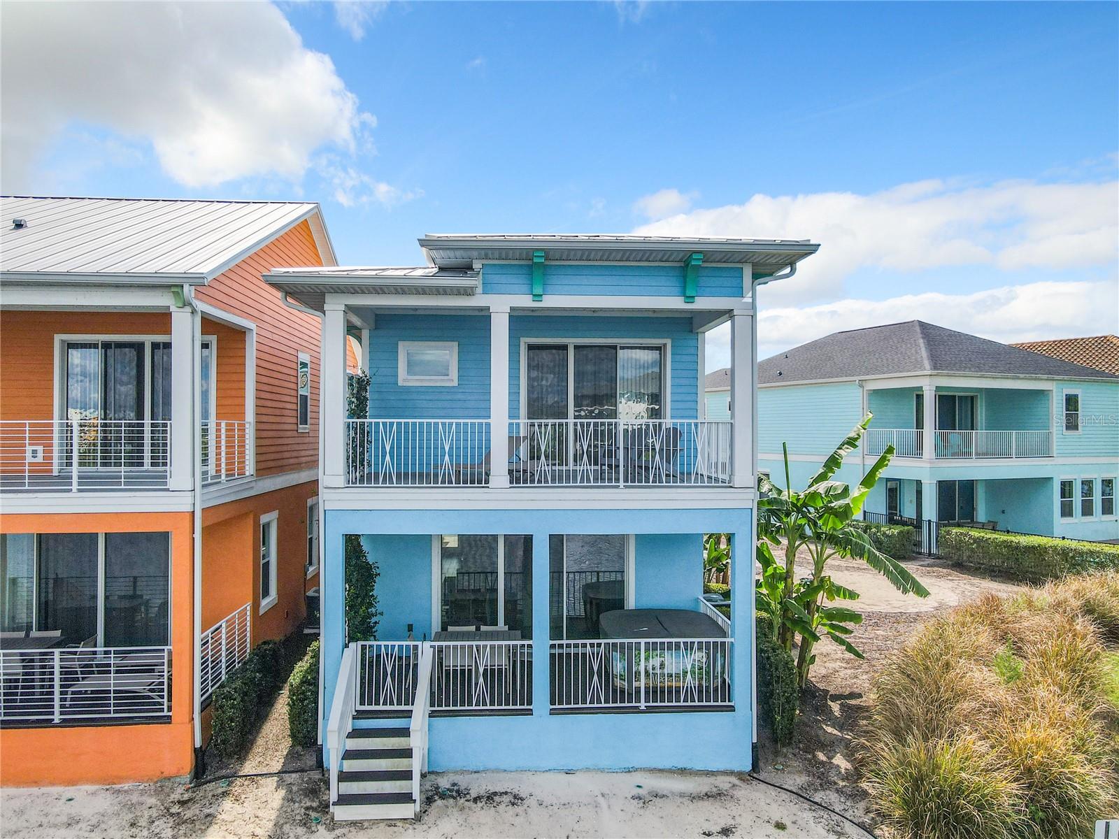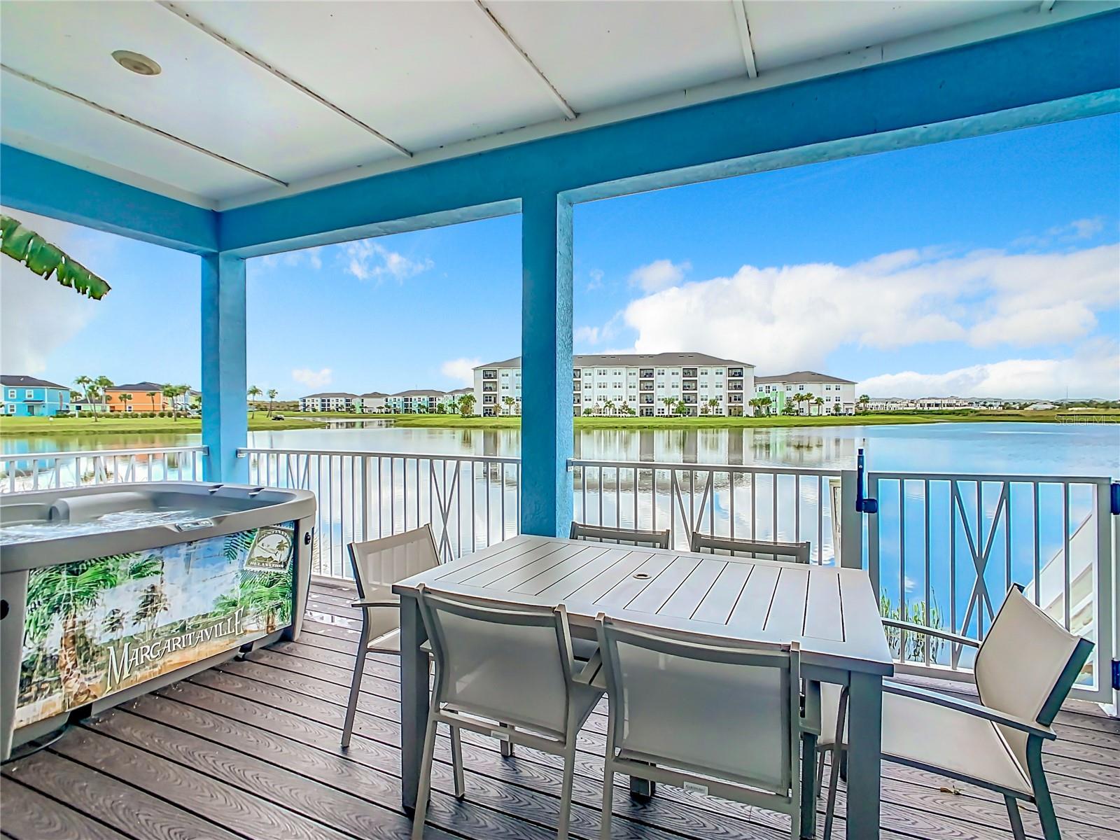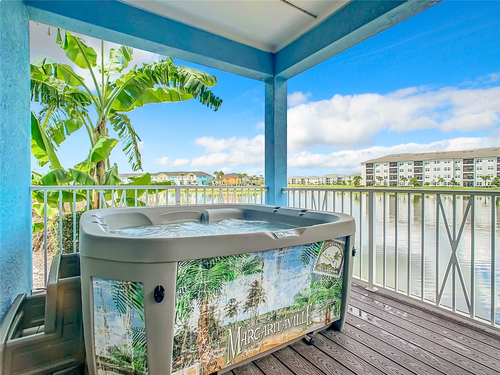 Executive series Margaritaville, vacation home or full time residence ONE OF A KIND END UNIT WITH SPA ON WATER! With 3 bedrooms and 3 bathrooms, a full primary bedroom downstairs. There's plenty of space for everyone. LAKEFRONT! $40,000 furniture package INCLUDED at no additional cost. Step inside and you'll love the open floor plan. It's perfect for gatherings or entertaining. The kitchen is a real showstopper with its quartz countertops, wood cabinets, and an island that opens up to the living room. Cooking and chatting with guests has never been easier! Speaking of the living room, it's got a cozy fireplace for those chilly Florida nights. But wait, there's more! Slide open those doors and step out onto a covered balcony. The view? A stunning lake right in your backyard. Oh, and did we mention there's a hot tub on the balcony too? Talk about relaxation! The bedrooms are something special. Each one has its own private bath – no more fighting over sink space! The primary bedroom is conveniently located downstairs, while a second primary suite awaits upstairs. This upstairs retreat even has its own private balcony overlooking the lake. Located in the community, you're close to all the action. The resort pools, hotel, and other amenities are just a stone's throw away. Enjoy shuffleboard, grab a drink at the bar, dine at various restaurants, or work up a sweat at the fitness center. There's even a playground and dog park for the little ones (furry or not). And if that's not enough, Sunset Walk is nearby with even more restaurants, a movie theater, and Island H2O. This house isn't just a home – it's a lifestyle!