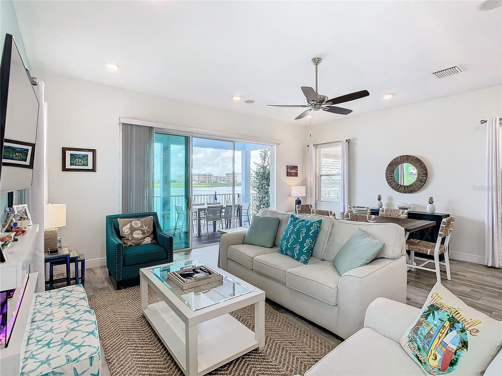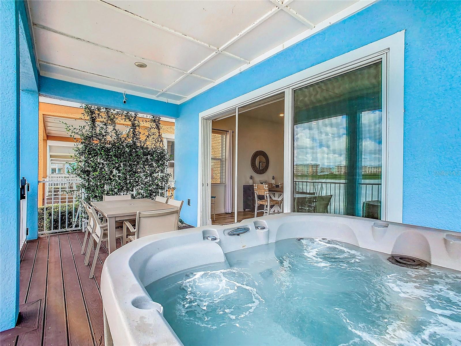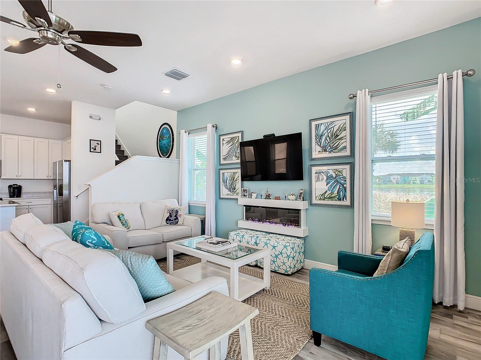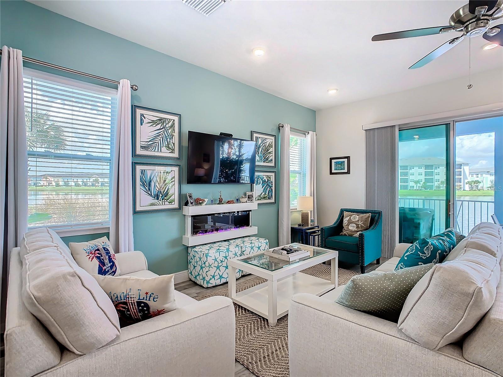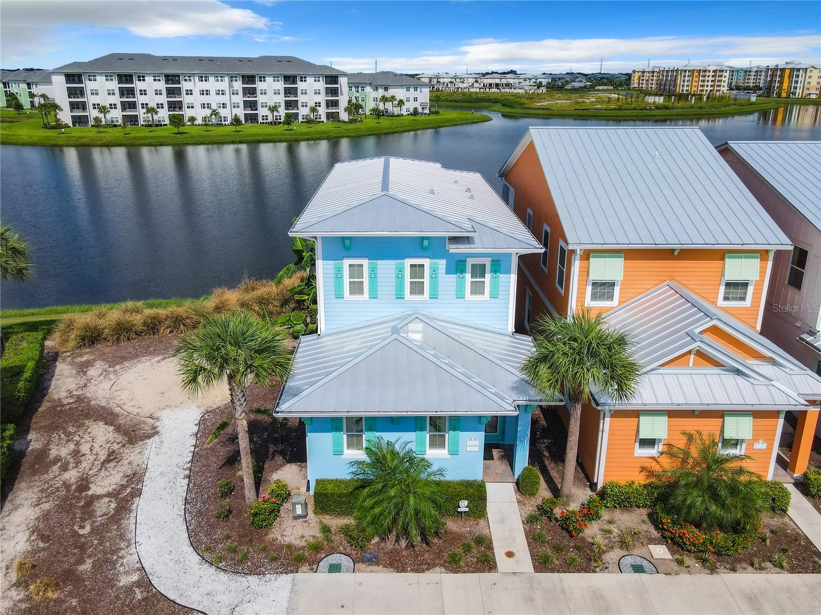 Executive series Margaritaville, vacation home or full time residence ONE OF A KIND END UNIT WITH SPA ON WATER! With 3 bedrooms and 3 bathrooms, a full primary bedroom downstairs. There's plenty of space for everyone. LAKEFRONT! $40,000 furniture package INCLUDED at no additional cost. Step inside and you'll love the open floor plan. It's perfect for gatherings or entertaining. The kitchen is a real showstopper with its quartz countertops, wood cabinets, and an island that opens up to the living room. Cooking and chatting with guests has never been easier! Speaking of the living room, it's got a cozy fireplace for those chilly Florida nights. But wait, there's more! Slide open those doors and step out onto a covered balcony. The view? A stunning lake right in your backyard. Oh, and did we mention there's a hot tub on the balcony too? Talk about relaxation! The bedrooms are something special. Each one has its own private bath – no more fighting over sink space! The primary bedroom is conveniently located downstairs, while a second primary suite awaits upstairs. This upstairs retreat even has its own private balcony overlooking the lake. Located in the community, you're close to all the action. The resort pools, hotel, and other amenities are just a stone's throw away. Enjoy shuffleboard, grab a drink at the bar, dine at various restaurants, or work up a sweat at the fitness center. There's even a playground and dog park for the little ones (furry or not). And if that's not enough, Sunset Walk is nearby with even more restaurants, a movie theater, and Island H2O. This house isn't just a home – it's a lifestyle!