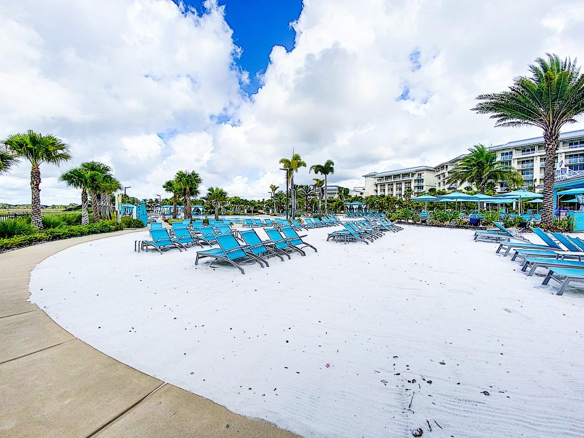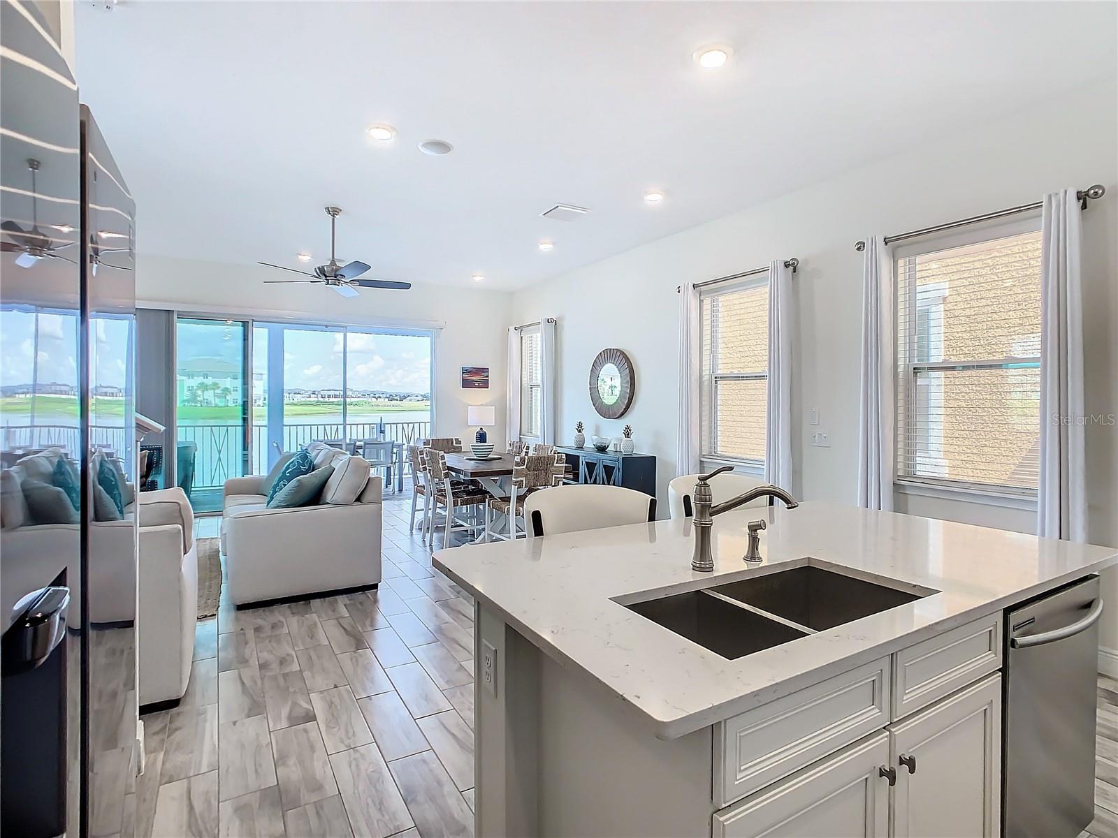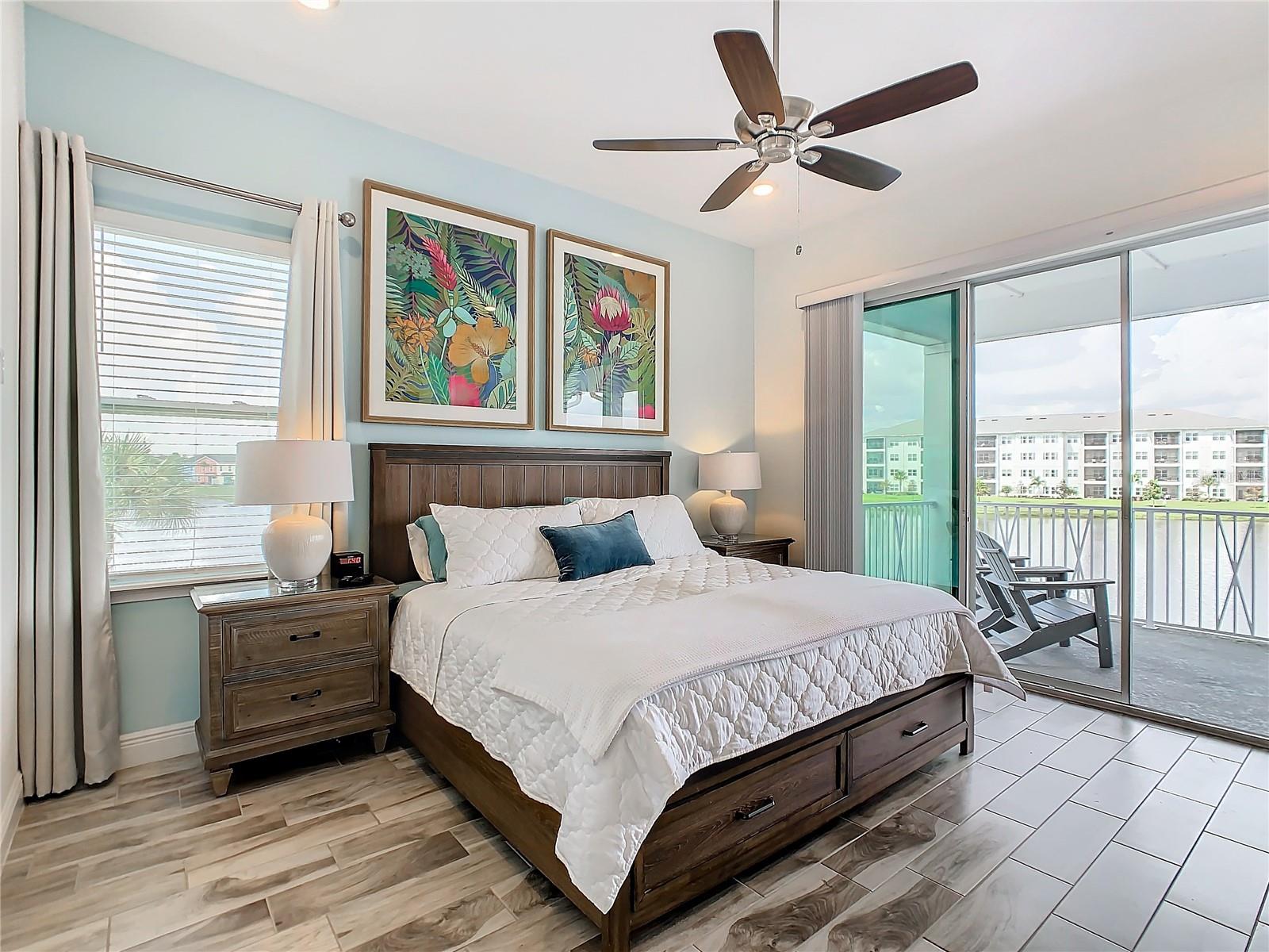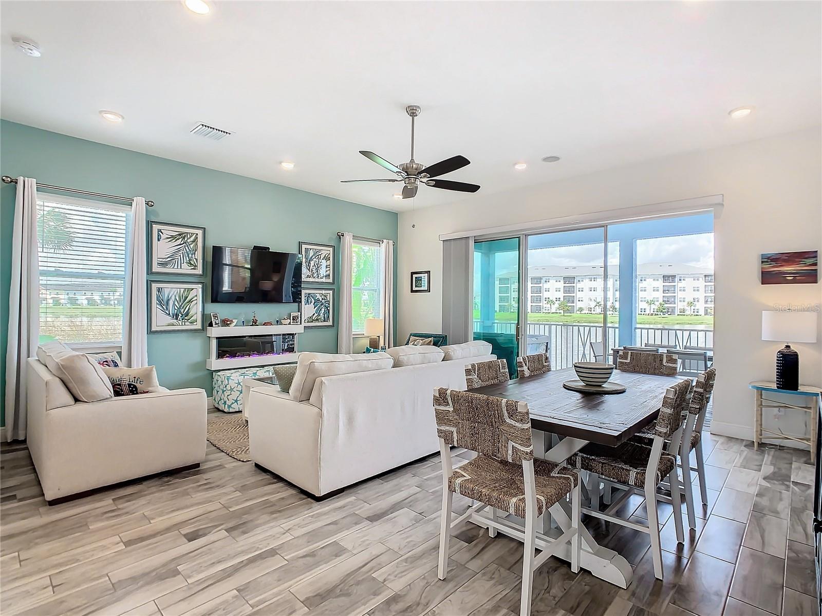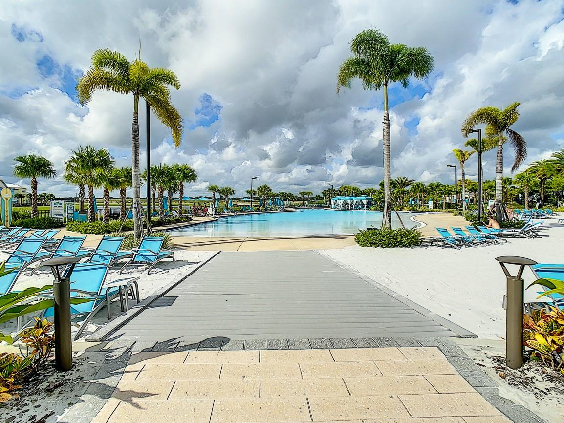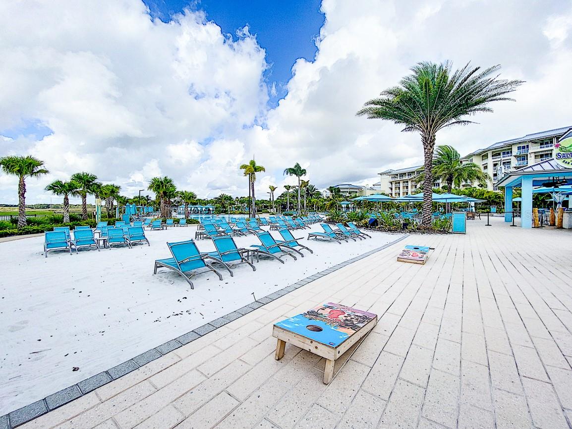 Executive series Margaritaville, vacation home or full time residence ONE OF A KIND END UNIT WITH SPA ON WATER! With 3 bedrooms and 3 bathrooms, a full primary bedroom downstairs. There's plenty of space for everyone. LAKEFRONT! $40,000 furniture package INCLUDED at no additional cost. Step inside and you'll love the open floor plan. It's perfect for gatherings or entertaining. The kitchen is a real showstopper with its quartz countertops, wood cabinets, and an island that opens up to the living room. Cooking and chatting with guests has never been easier! Speaking of the living room, it's got a cozy fireplace for those chilly Florida nights. But wait, there's more! Slide open those doors and step out onto a covered balcony. The view? A stunning lake right in your backyard. Oh, and did we mention there's a hot tub on the balcony too? Talk about relaxation! The bedrooms are something special. Each one has its own private bath – no more fighting over sink space! The primary bedroom is conveniently located downstairs, while a second primary suite awaits upstairs. This upstairs retreat even has its own private balcony overlooking the lake. Located in the community, you're close to all the action. The resort pools, hotel, and other amenities are just a stone's throw away. Enjoy shuffleboard, grab a drink at the bar, dine at various restaurants, or work up a sweat at the fitness center. There's even a playground and dog park for the little ones (furry or not). And if that's not enough, Sunset Walk is nearby with even more restaurants, a movie theater, and Island H2O. This house isn't just a home – it's a lifestyle!