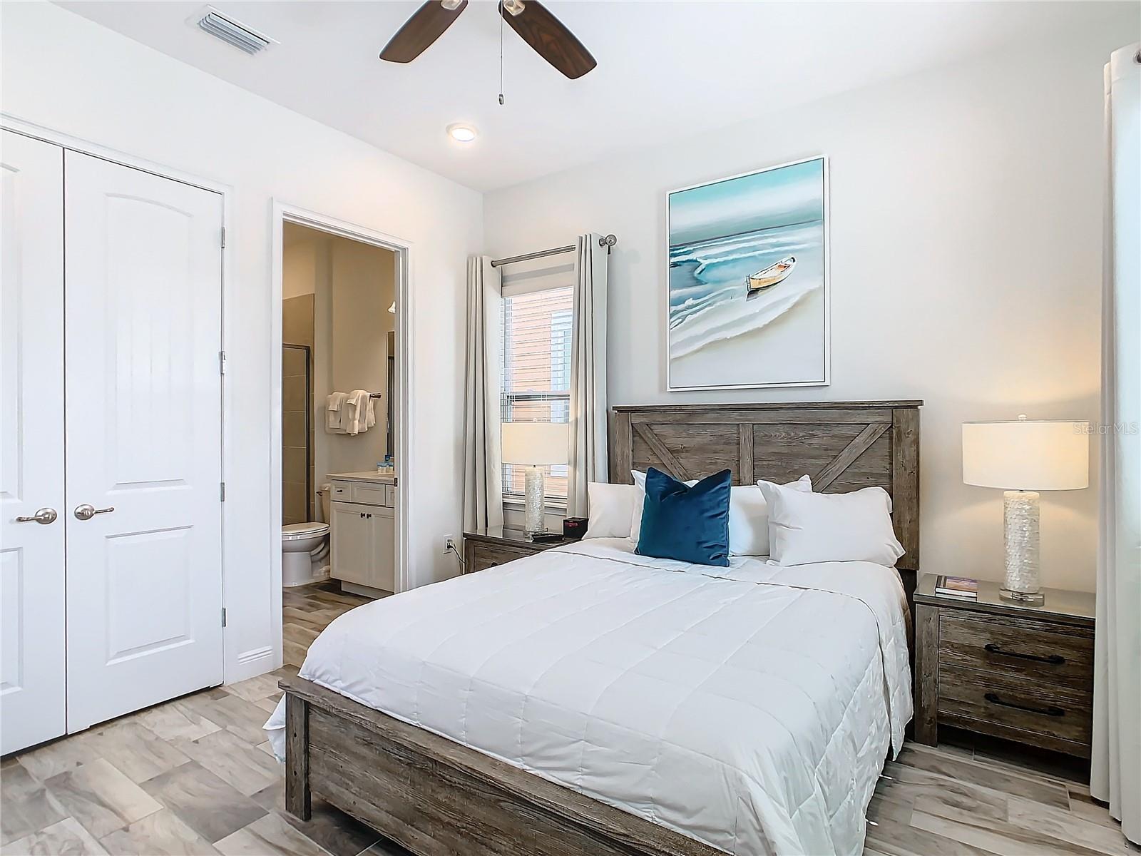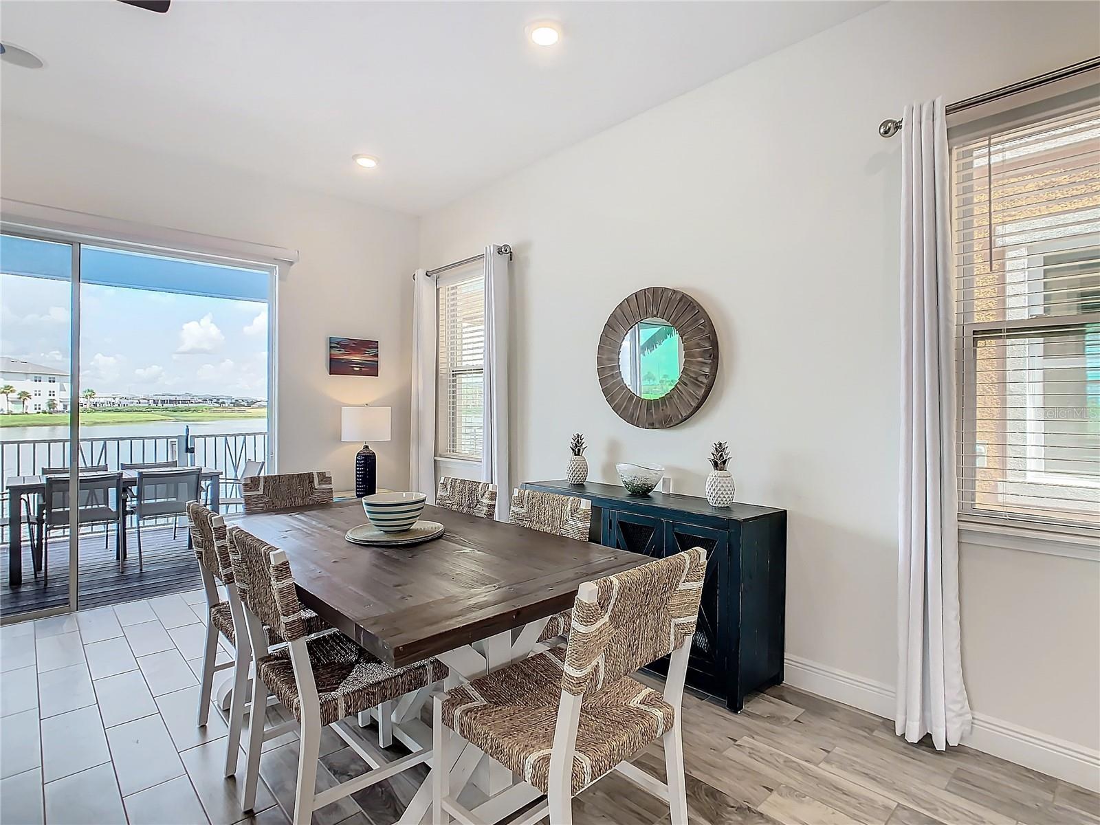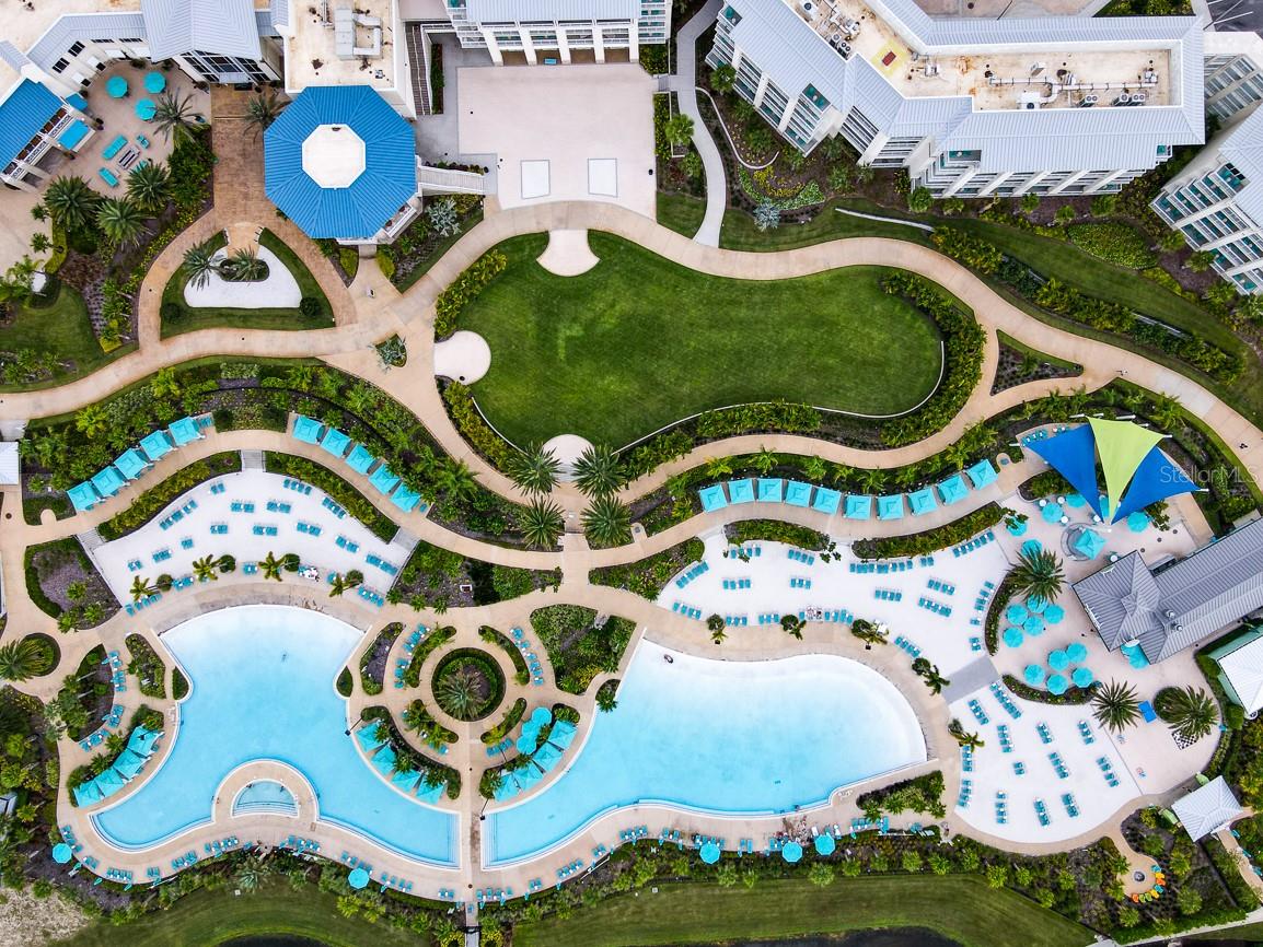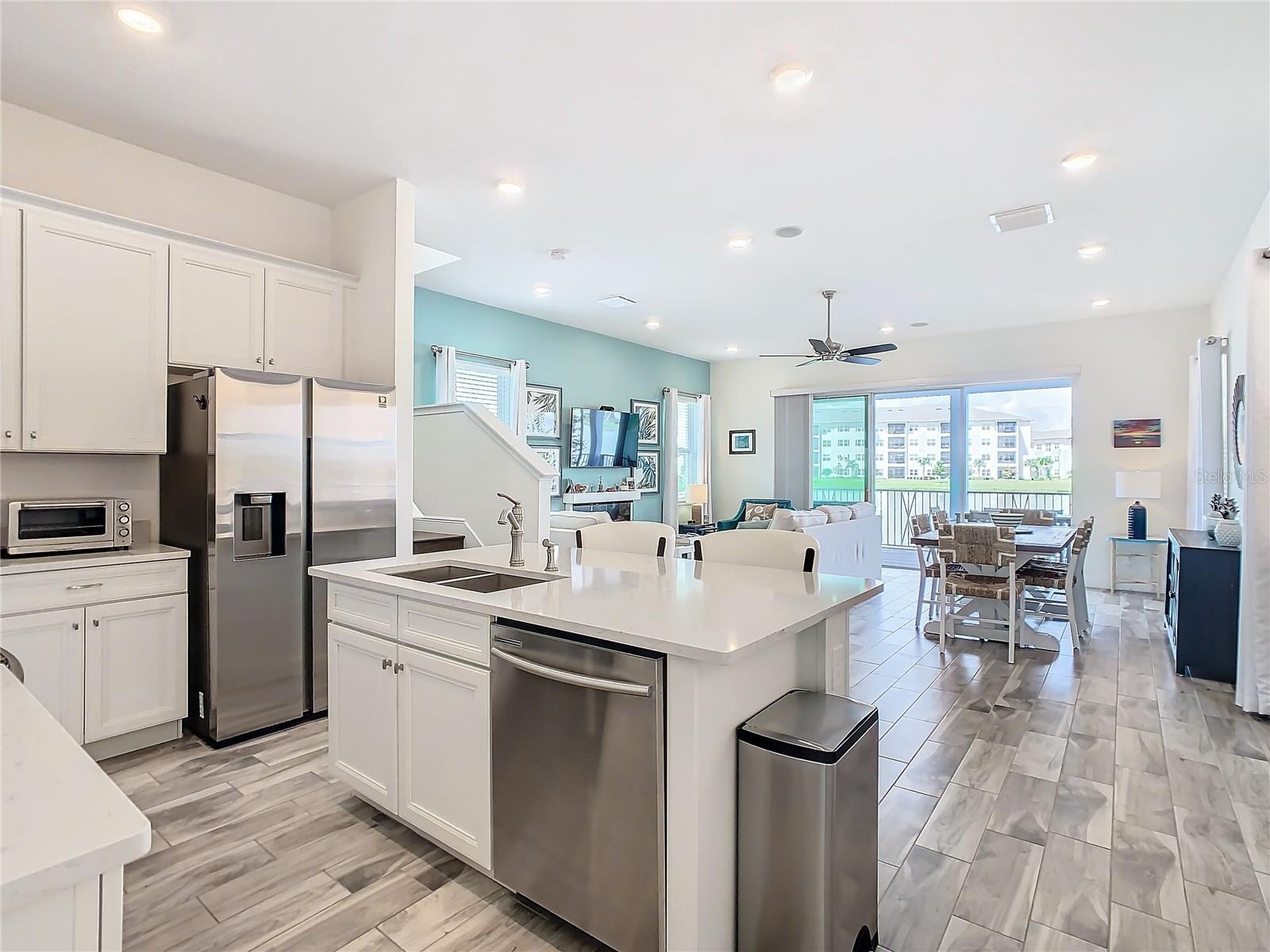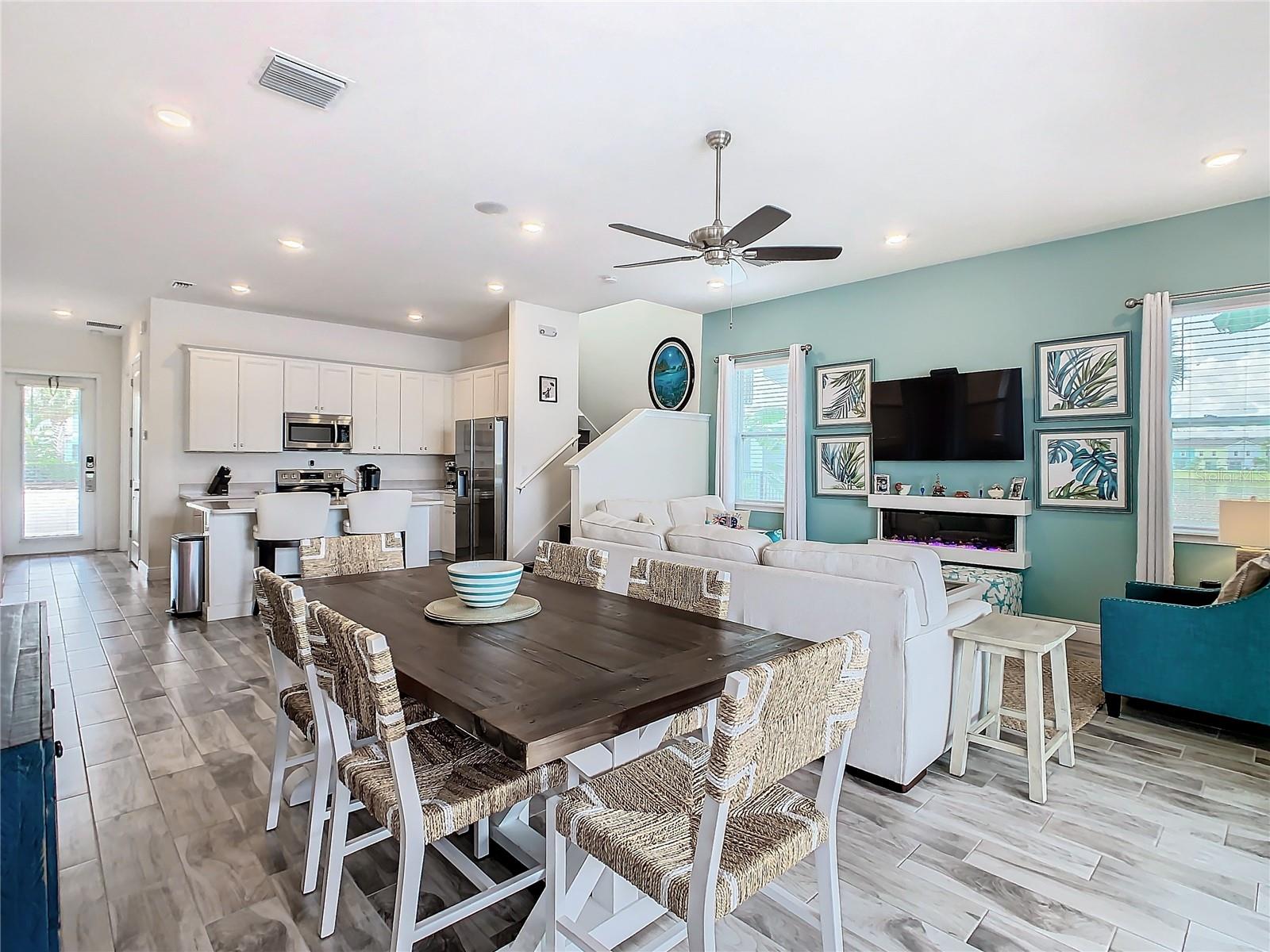 Executive series Margaritaville, vacation home or full time residence ONE OF A KIND END UNIT WITH SPA ON WATER! With 3 bedrooms and 3 bathrooms, a full primary bedroom downstairs. There's plenty of space for everyone. LAKEFRONT! $40,000 furniture package INCLUDED at no additional cost. Step inside and you'll love the open floor plan. It's perfect for gatherings or entertaining. The kitchen is a real showstopper with its quartz countertops, wood cabinets, and an island that opens up to the living room. Cooking and chatting with guests has never been easier! Speaking of the living room, it's got a cozy fireplace for those chilly Florida nights. But wait, there's more! Slide open those doors and step out onto a covered balcony. The view? A stunning lake right in your backyard. Oh, and did we mention there's a hot tub on the balcony too? Talk about relaxation! The bedrooms are something special. Each one has its own private bath – no more fighting over sink space! The primary bedroom is conveniently located downstairs, while a second primary suite awaits upstairs. This upstairs retreat even has its own private balcony overlooking the lake. Located in the community, you're close to all the action. The resort pools, hotel, and other amenities are just a stone's throw away. Enjoy shuffleboard, grab a drink at the bar, dine at various restaurants, or work up a sweat at the fitness center. There's even a playground and dog park for the little ones (furry or not). And if that's not enough, Sunset Walk is nearby with even more restaurants, a movie theater, and Island H2O. This house isn't just a home – it's a lifestyle!