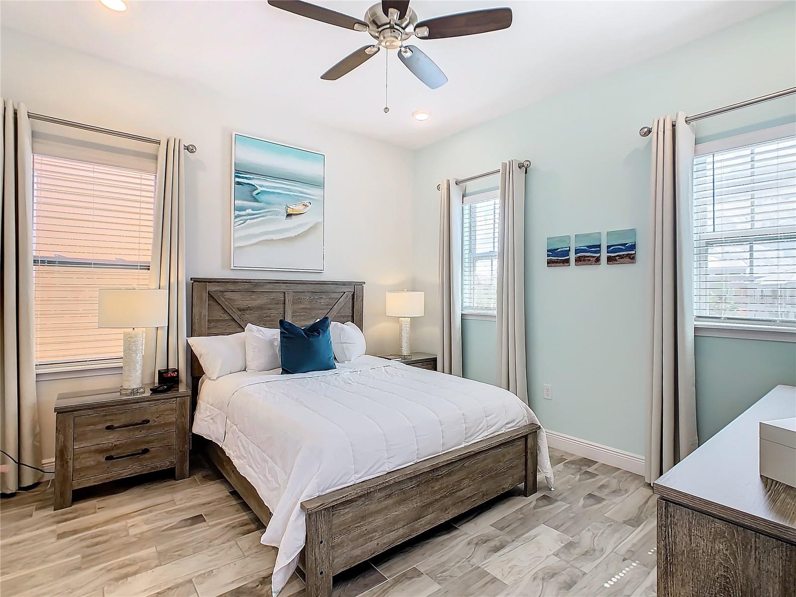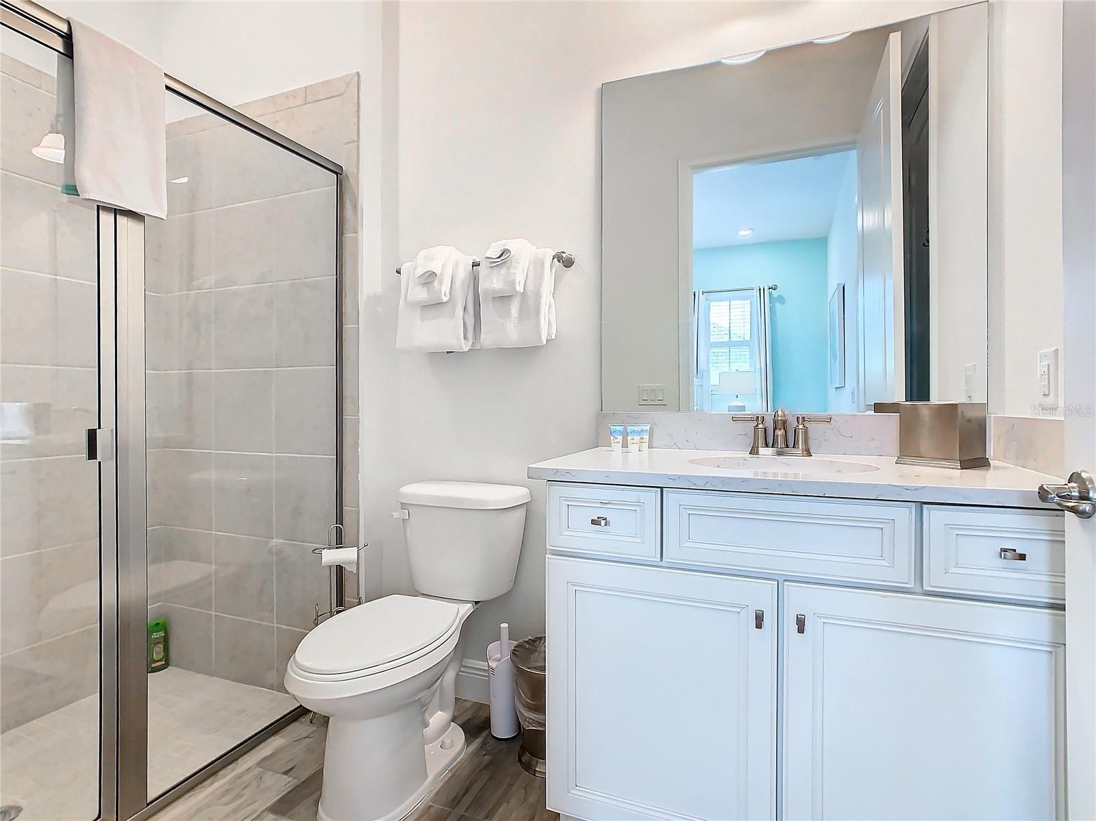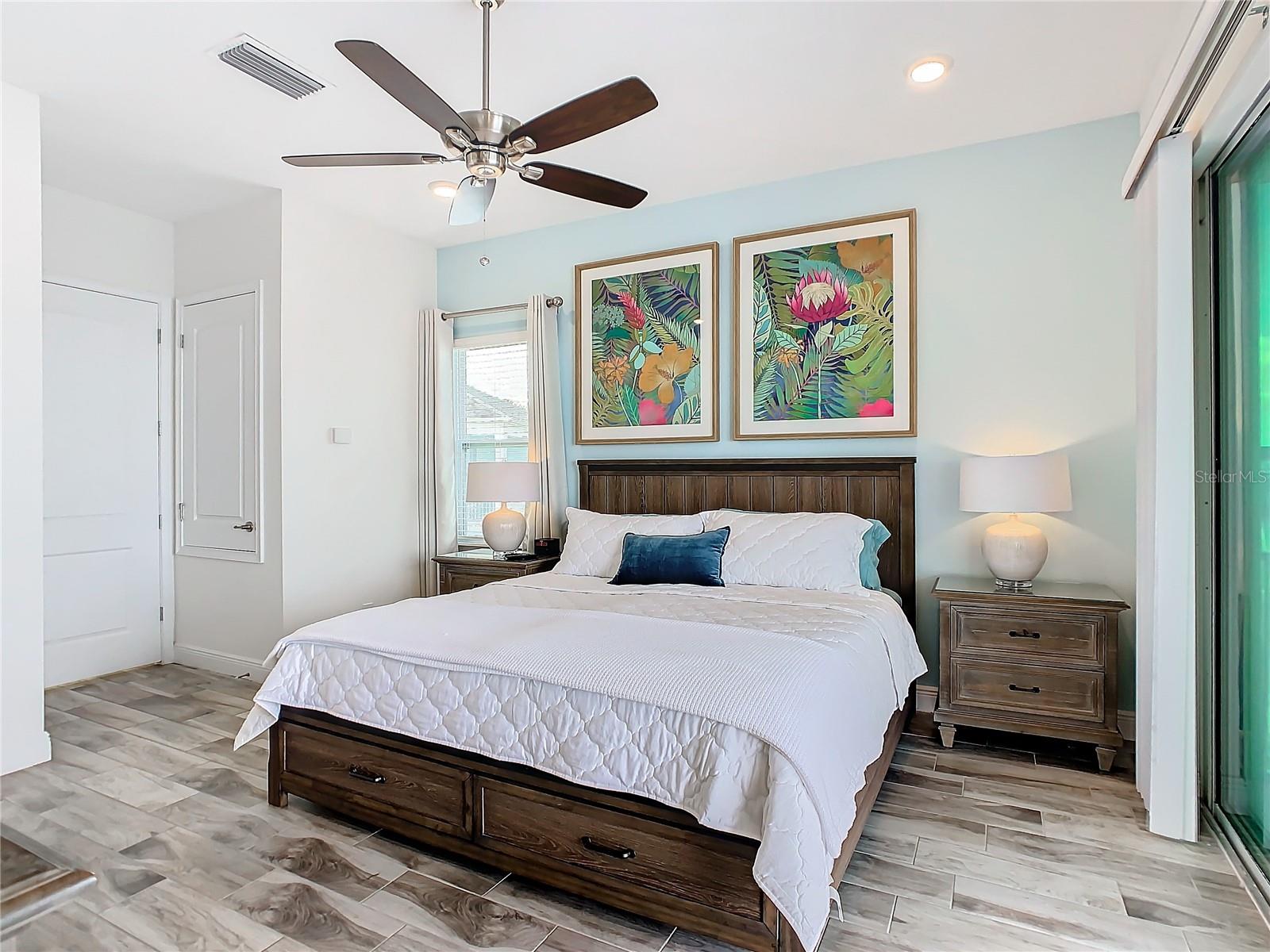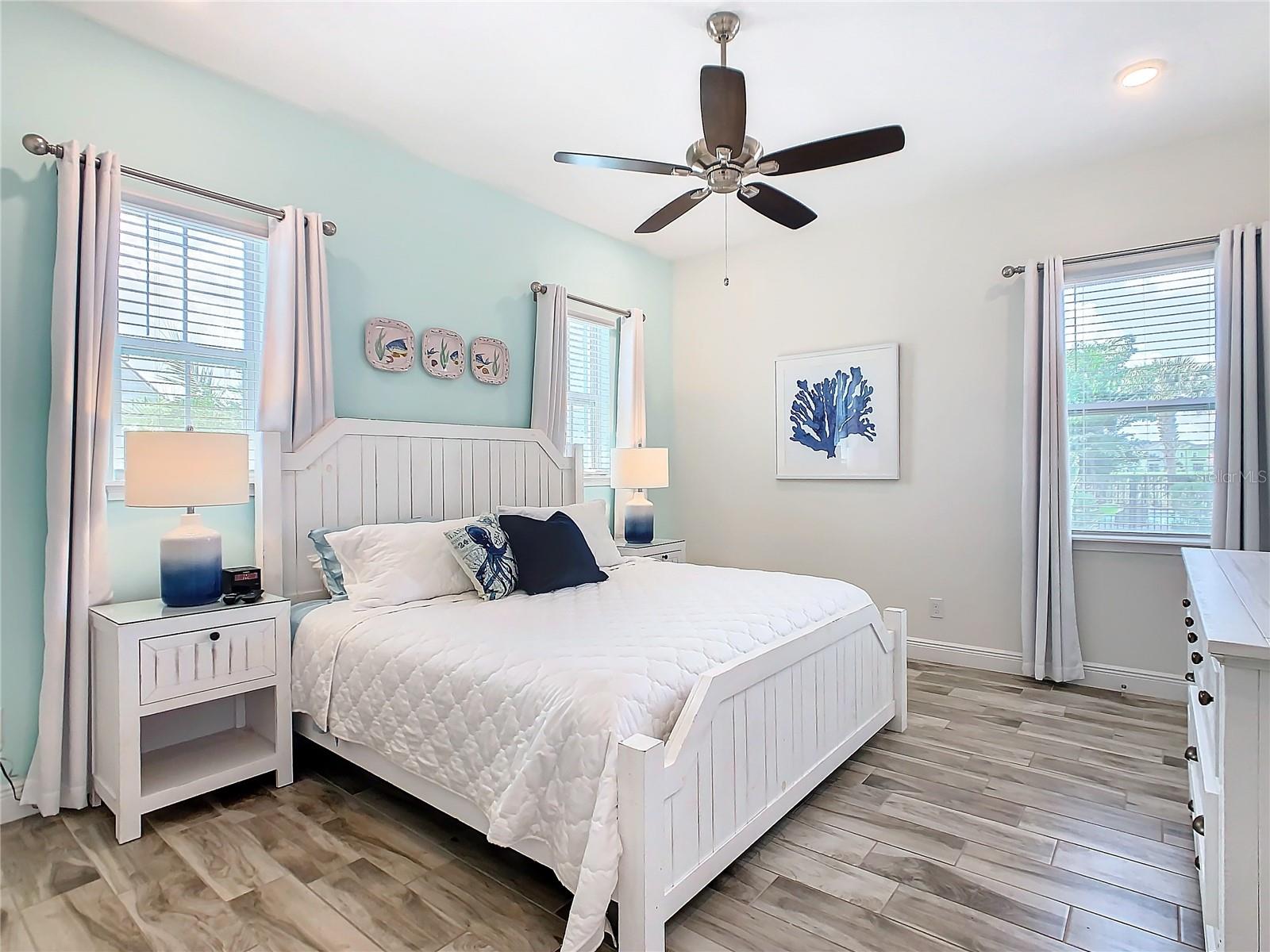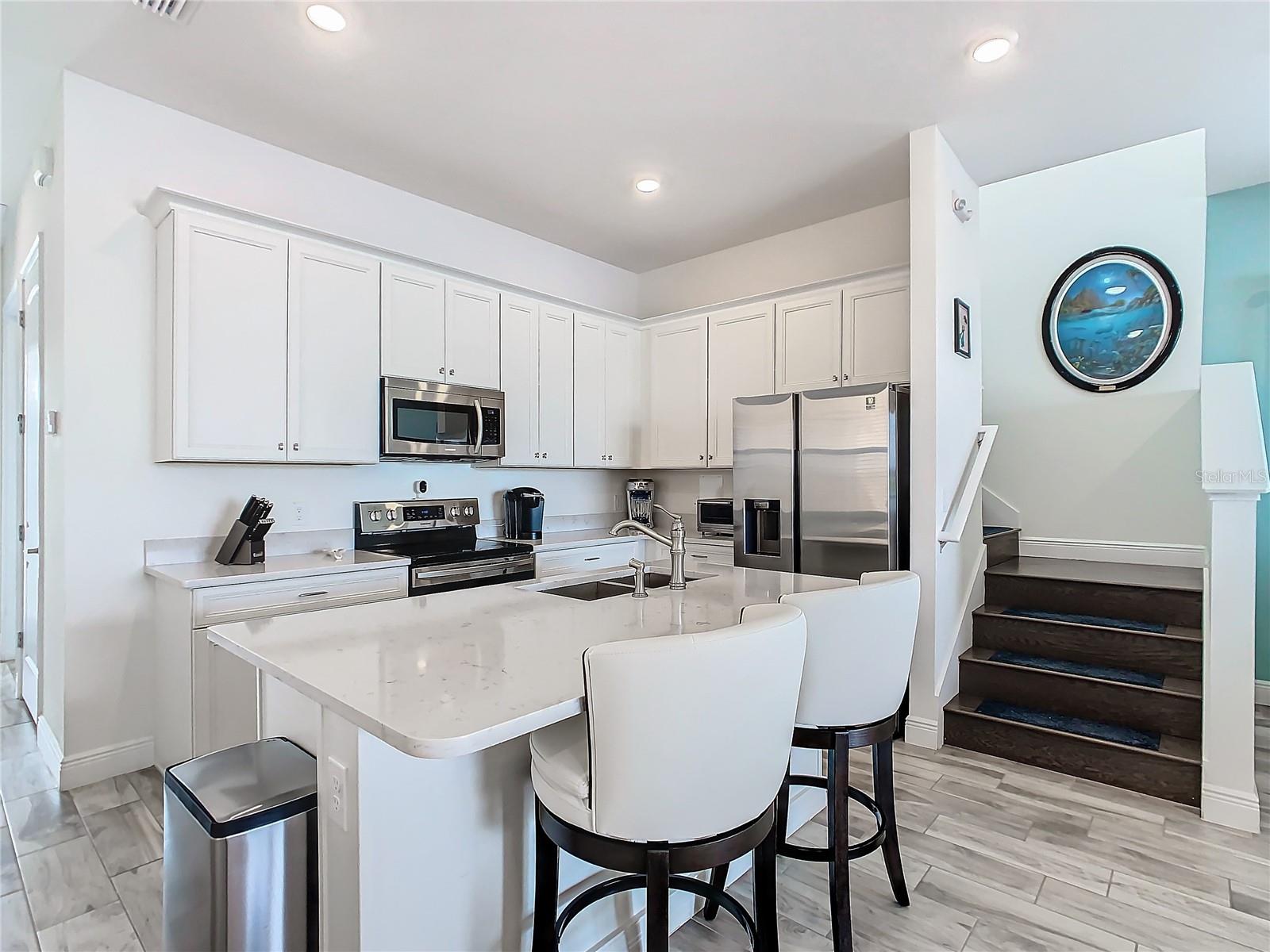 Executive series Margaritaville, vacation home or full time residence ONE OF A KIND END UNIT WITH SPA ON WATER! With 3 bedrooms and 3 bathrooms, a full primary bedroom downstairs. There's plenty of space for everyone. LAKEFRONT! $40,000 furniture package INCLUDED at no additional cost. Step inside and you'll love the open floor plan. It's perfect for gatherings or entertaining. The kitchen is a real showstopper with its quartz countertops, wood cabinets, and an island that opens up to the living room. Cooking and chatting with guests has never been easier! Speaking of the living room, it's got a cozy fireplace for those chilly Florida nights. But wait, there's more! Slide open those doors and step out onto a covered balcony. The view? A stunning lake right in your backyard. Oh, and did we mention there's a hot tub on the balcony too? Talk about relaxation! The bedrooms are something special. Each one has its own private bath – no more fighting over sink space! The primary bedroom is conveniently located downstairs, while a second primary suite awaits upstairs. This upstairs retreat even has its own private balcony overlooking the lake. Located in the community, you're close to all the action. The resort pools, hotel, and other amenities are just a stone's throw away. Enjoy shuffleboard, grab a drink at the bar, dine at various restaurants, or work up a sweat at the fitness center. There's even a playground and dog park for the little ones (furry or not). And if that's not enough, Sunset Walk is nearby with even more restaurants, a movie theater, and Island H2O. This house isn't just a home – it's a lifestyle!