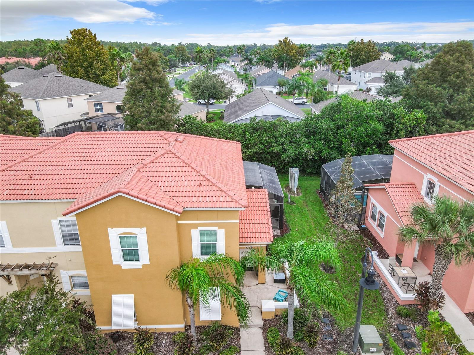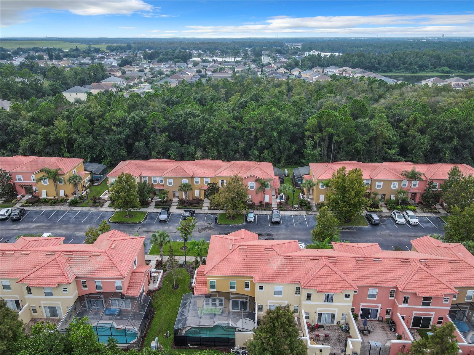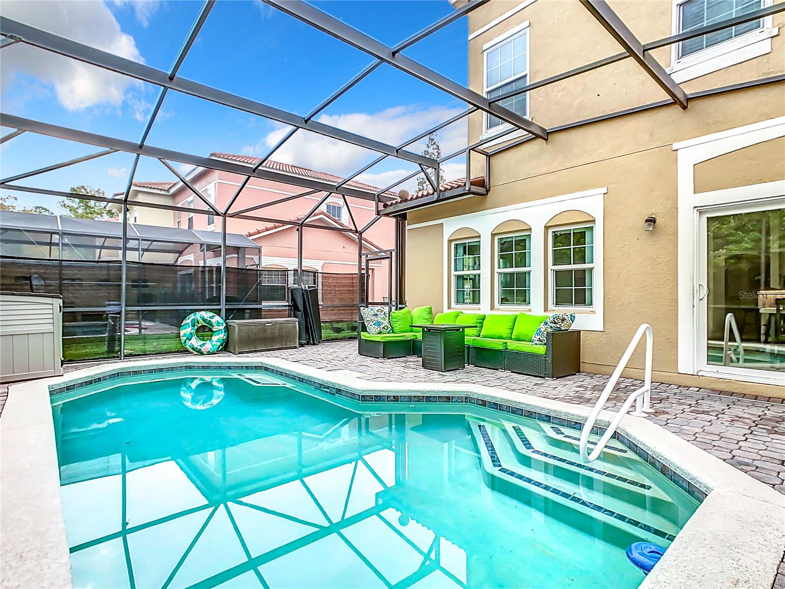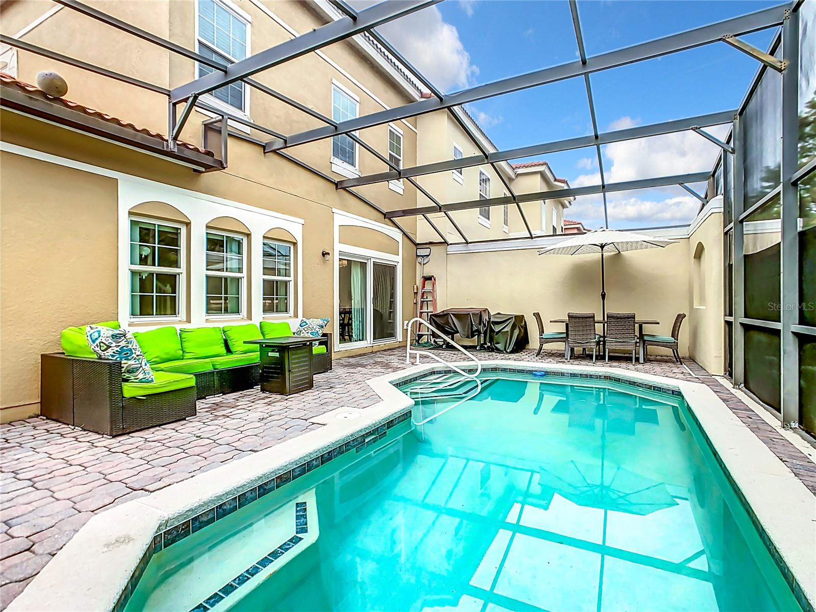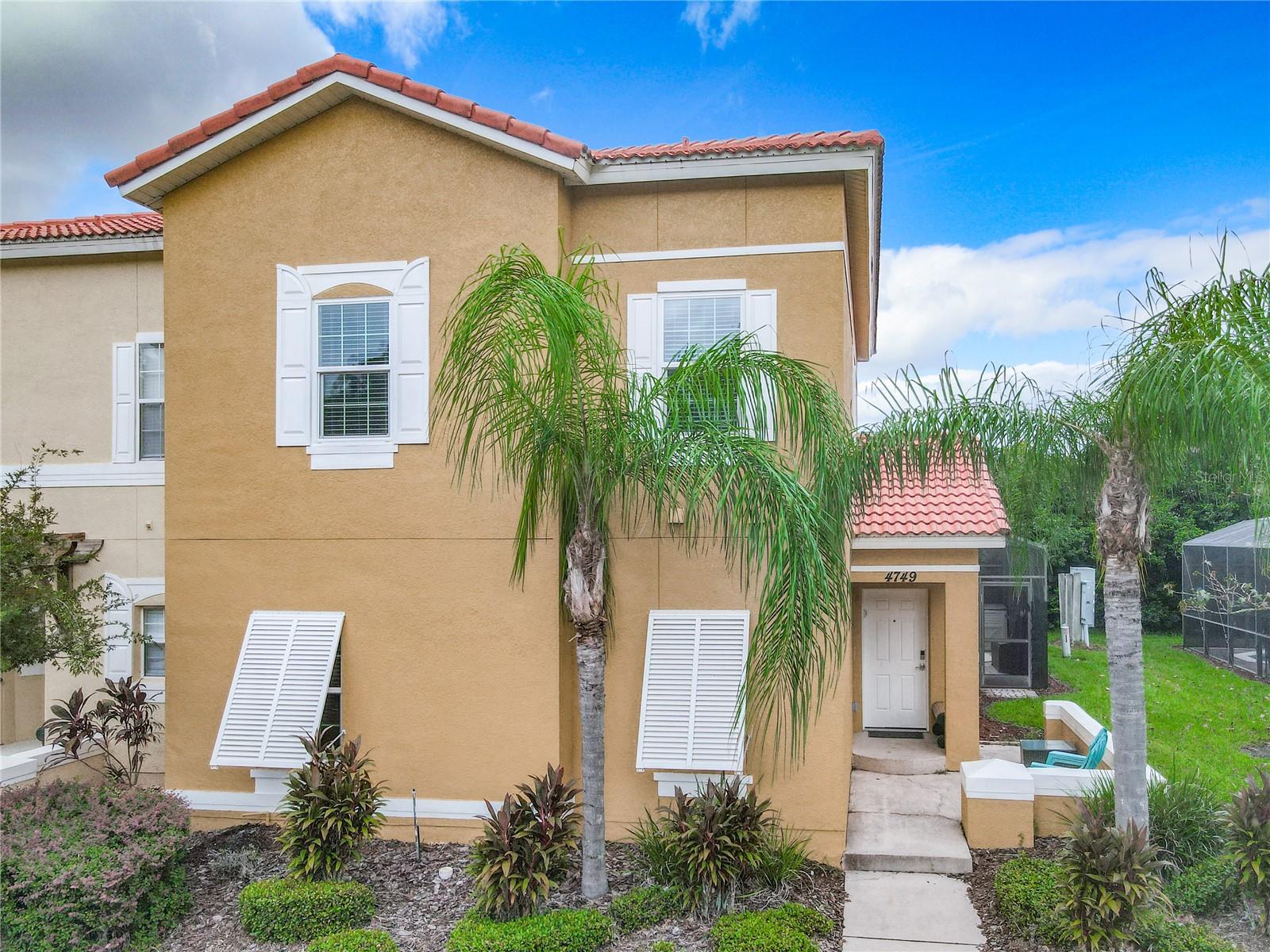 Discover this beautiful 4-bedroom, 3-bath townhome with a private pool, perfectly situated on a corner lot in the exclusive Terra Verde Villas. As you enter, you’ll be welcomed by an abundance of natural light and elegant tile flooring throughout the main level. The spacious family room creates a warm and inviting atmosphere, ideal for relaxing or entertaining. The kitchen boasts granite countertops, stainless steel appliances, and a convenient breakfast bar, providing ample cabinet and counter space. Overlooking the dining area, the kitchen flows effortlessly through sliding glass doors to the screened-in, sparkling pool—perfect for outdoor dining and lounging. On the first floor, you’ll find a versatile bedroom with a full bath, along with a convenient laundry closet. Upstairs, the expansive primary ensuite offers comfort and privacy, while the additional bedrooms share a well-appointed hall bath. The vinyl flooring seamlessly connects each room, giving the home a modern, cohesive feel. Terra Verde is designed with resort-style living in mind, offering a wide range of amenities including a clubhouse, fitness center, theater room, community pool, tennis and basketball courts, and more! As a primarily short-term rental community, this townhome is also a fantastic investment opportunity, just minutes from Disney, world-class attractions, dining, and shopping. Don’t miss the chance to own a slice of paradise in Terra Verde!
