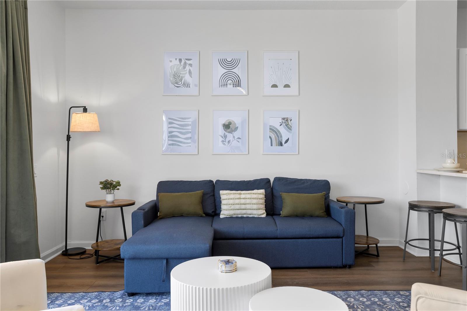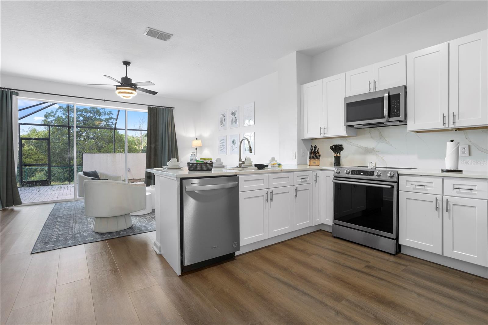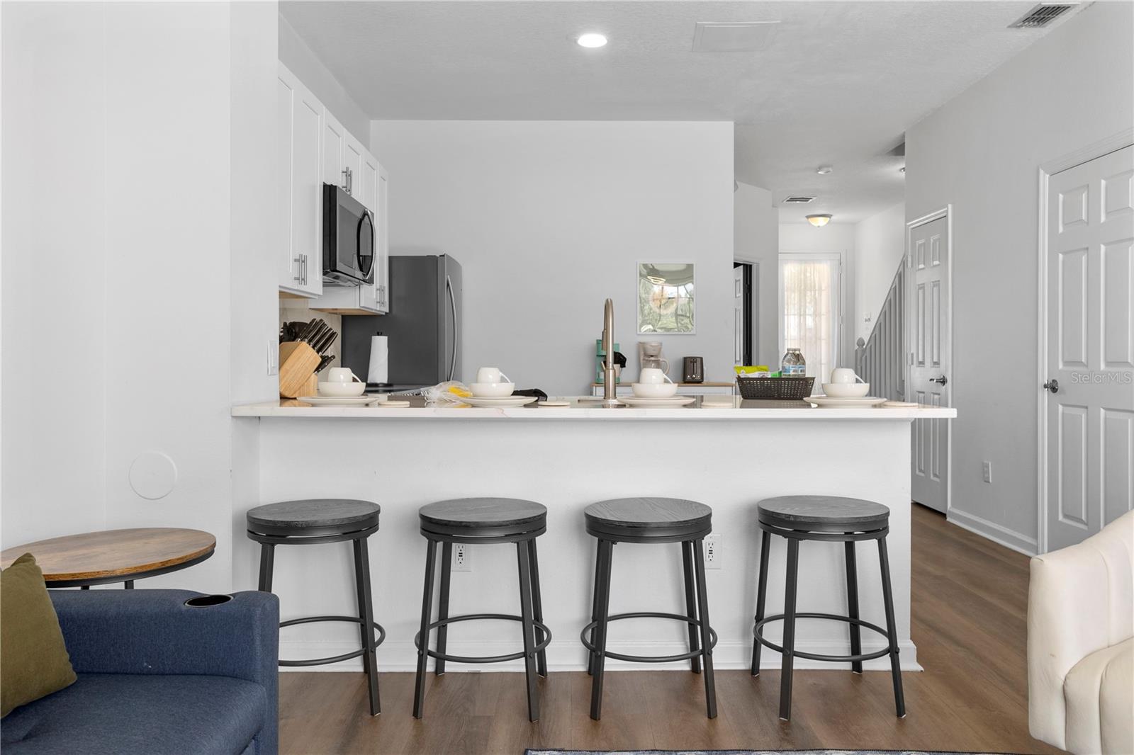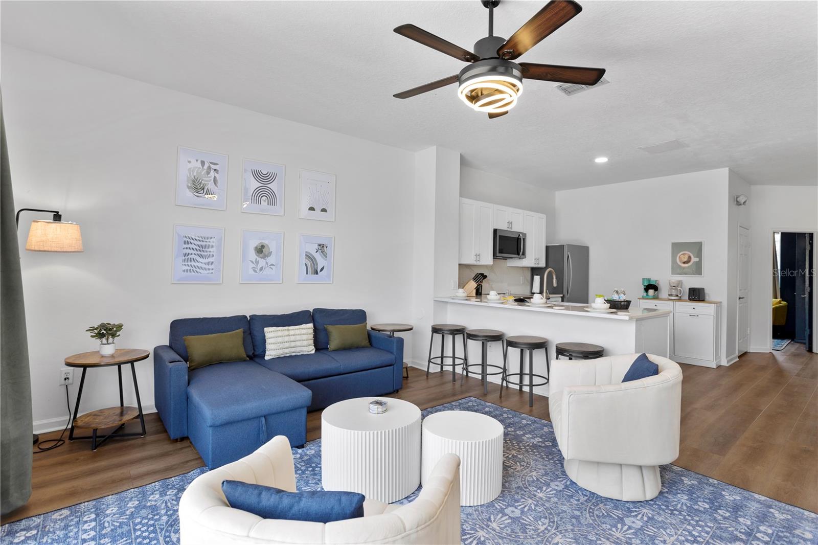 Modern luxury design meets community convenience with this one-of-a-kind FULLY FURNISHED 3-bedroom & uniquely 3 en-suite Bathroom townhome located in the Windsor Palms community in Kissimmee! Step inside to the open-concept kitchen & living room with luxury vinyl wood flooring which continues throughout the majority of the home. Fully updated in 2024, the kitchen is one to be desired with ALL NEW stainless steel appliances, NEW garbage disposal, stone countertops, stunning quartz backsplash, 32” shaker cabinets, a coffee bar & large breakfast bar overlooking the living room. Natural light floods the spacious living room via the giant sliding glass doors opening up to the screen-enclosed outdoor patio, offering the perfect place to entertain or delight in the Florida evening air. The downstairs bedroom is equipped with a built-in Murphy bed and the en-suite bathroom holds gorgeous new gold accent fixtures & an open-basin sink with a shower outlined in modern tiling & a detachable shower head. Upstairs, you will find a spacious second bedroom with large picture windows, modern light fixtures, an en-suite bathroom, and a walk-in closet space. The third bedroom holds a large built-in closet, modern light fixtures, and an en-suite bathroom. The laundry room holds BRAND NEW washer and dryer units & convenient built-in shelving. All furniture conveys! The community center is truly one-of-a-kind with a large pool and spa, tennis courts, and a community clubhouse that contains a fitness center, pool tables, table tennis, and a mini arcade & theater. Located near public schools & a short drive to major attractions. This stunning townhome is the perfect investment property, vacation home, or primary residence. Don’t miss your chance - call today for a private showing!
