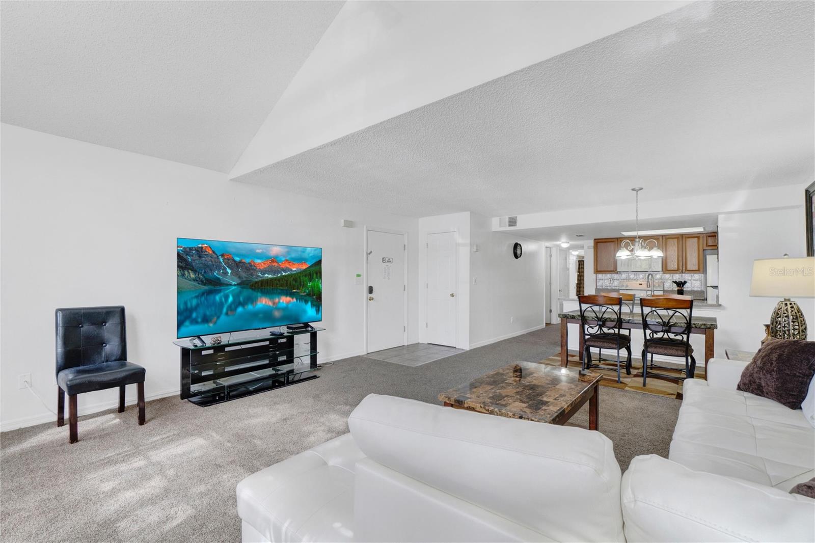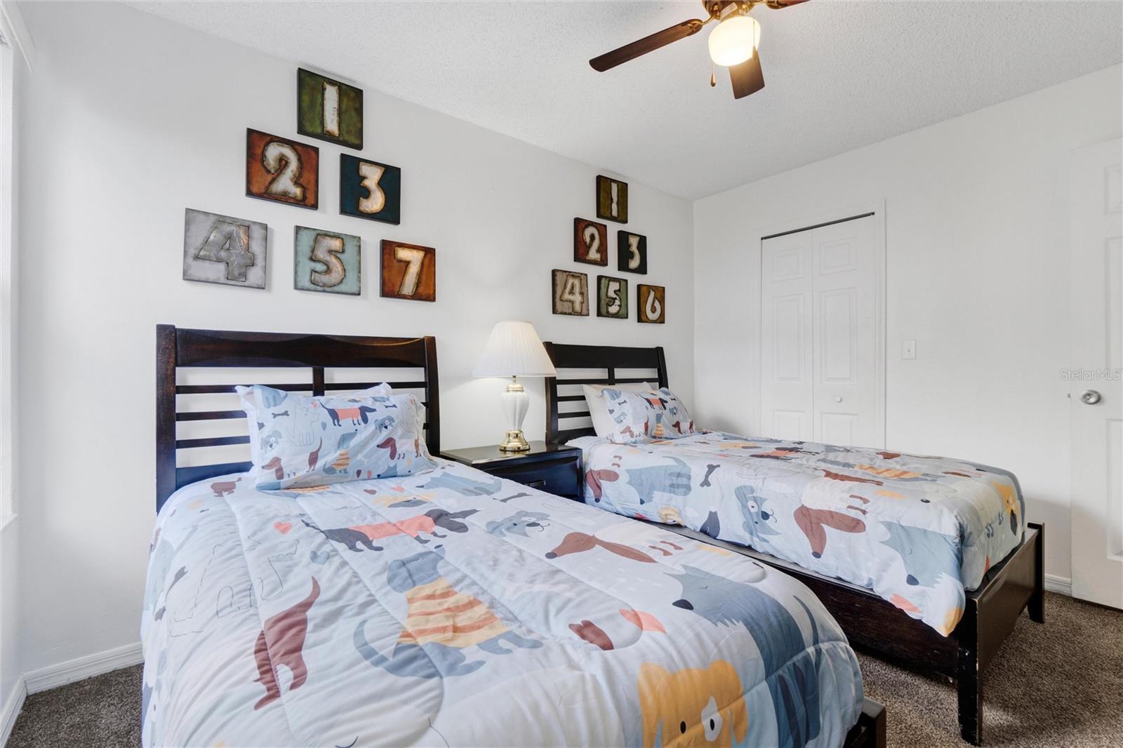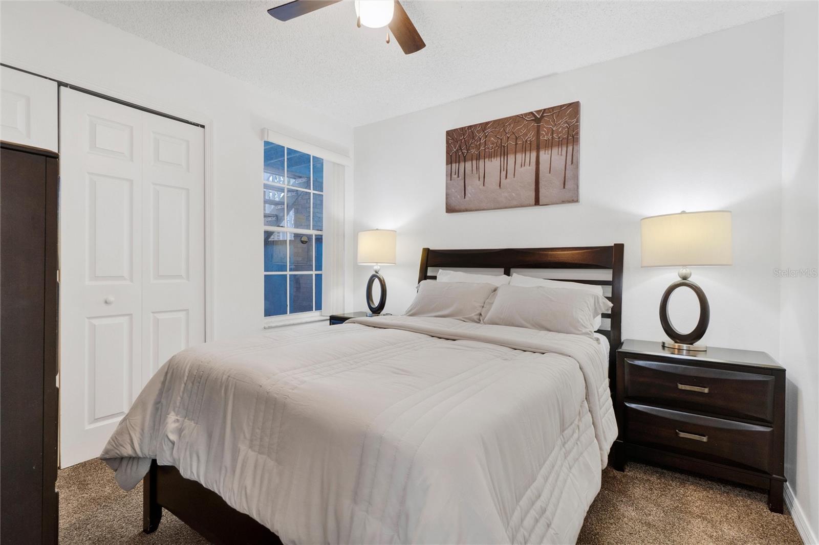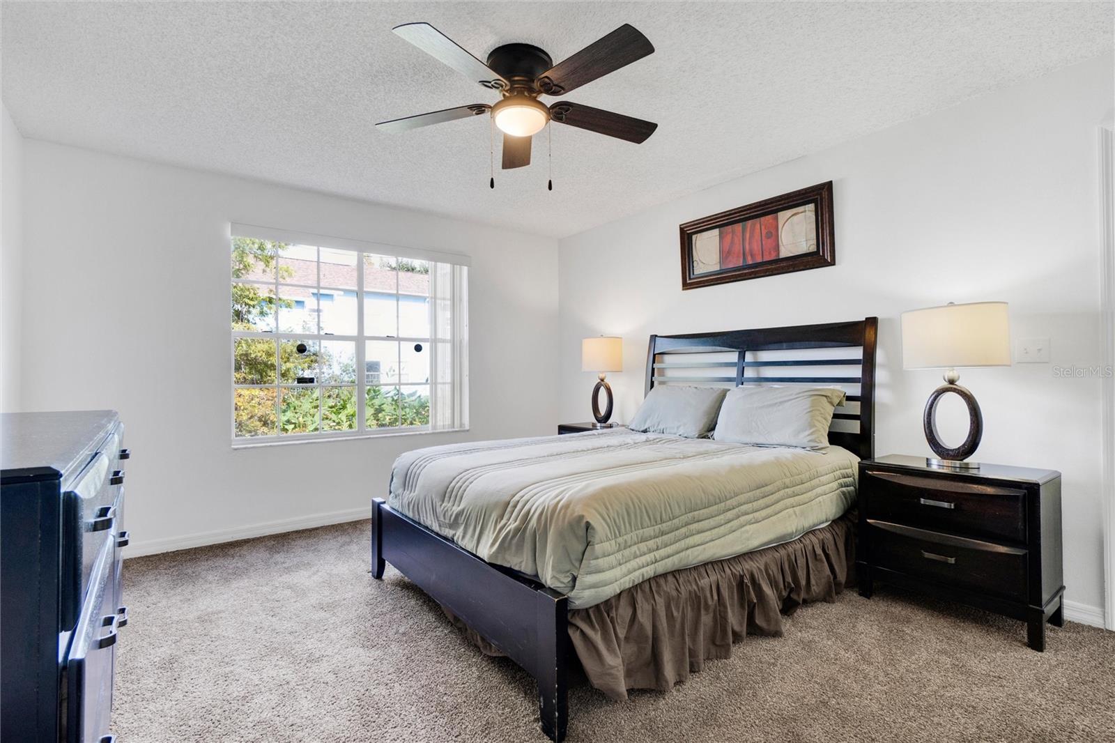 Long term Tenant in place until November 2025. Just a short drive to the enchanting Disney World and parks! This ground-floor condo is an excellent hoice for a vacation home, long-term rental, your permanent residence, or as an investment property (Airbnb, VRBO). Spacious and clean, this 3-bedroom, 2-bathroom unit features an open floor plan, newer carpet, and freshly painted interior walls, with a laundry closet equipped with a washer and dryer. The living-dining combo area is bathed in natural light thanks to large arched windows and a vaulted ceiling. The kitchen comes with sleek granite countertops, wood like laminate flooring, double kitchen sink, a pantry closet, and all the needed appliances. Each bedroom comes with brand new ceiling fan/light combos and windows that let in plenty of fresh air. Primary bedroom comes with an en-suite bathroom upgraded with granite countertop vanity, beautiful fully tiled large walk-in shower, and a walk-in closet. Plus, the guest bathroom offers the convenience of a shower/tub combo. This unit is ideally located at the back of the community, providing a calm and peaceful environment. This property is turnkey ready and fully furnished for your convenience, so you can move right in or start renting it out without any hassle! You’ll also enjoy the community amenities: a pool with a hot tub, a tennis court, a fitness center, and a covered outdoor dining area with a sun deck. HVAC (2015). Book your private tour today!