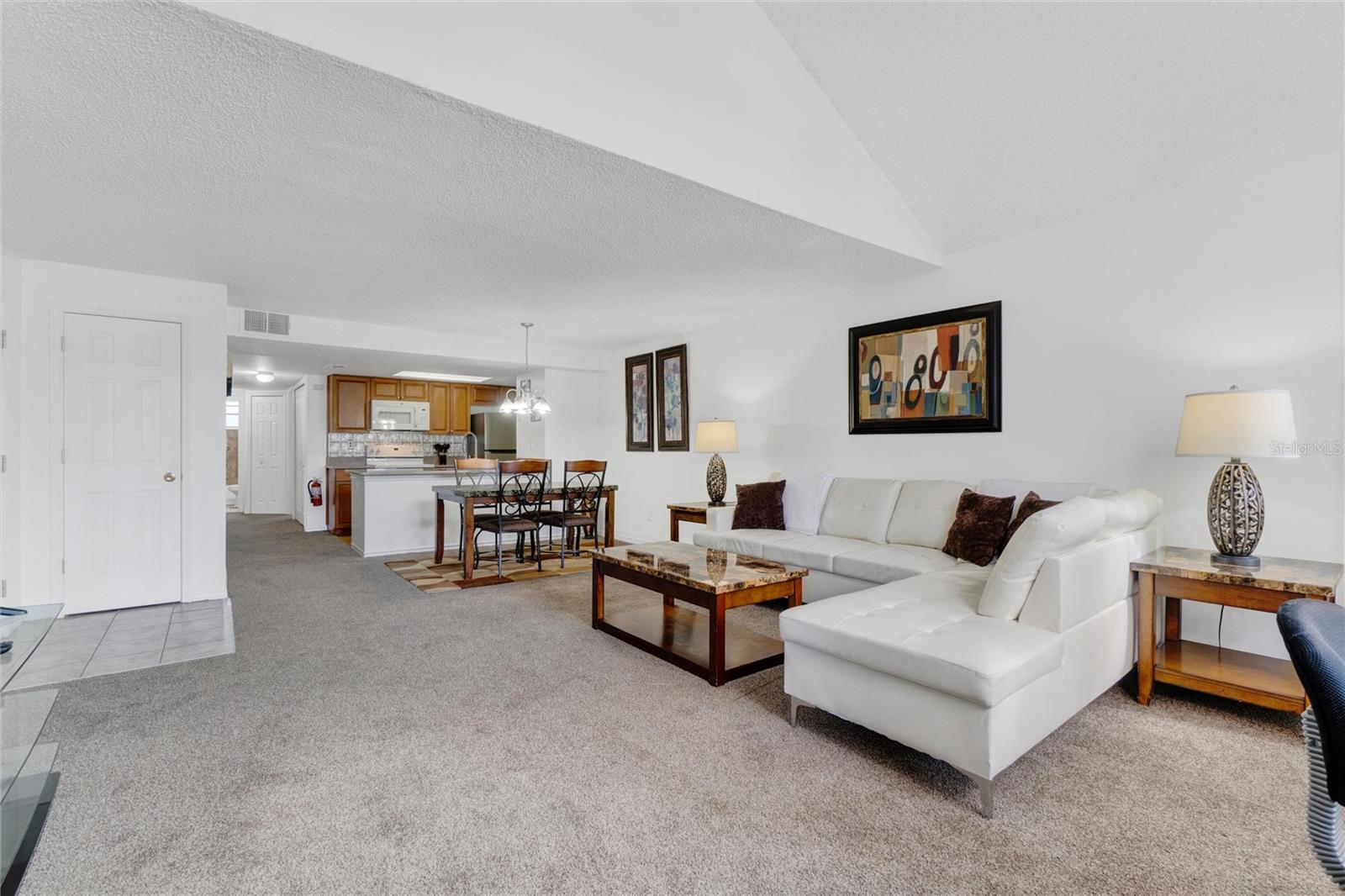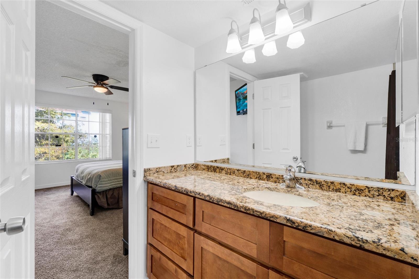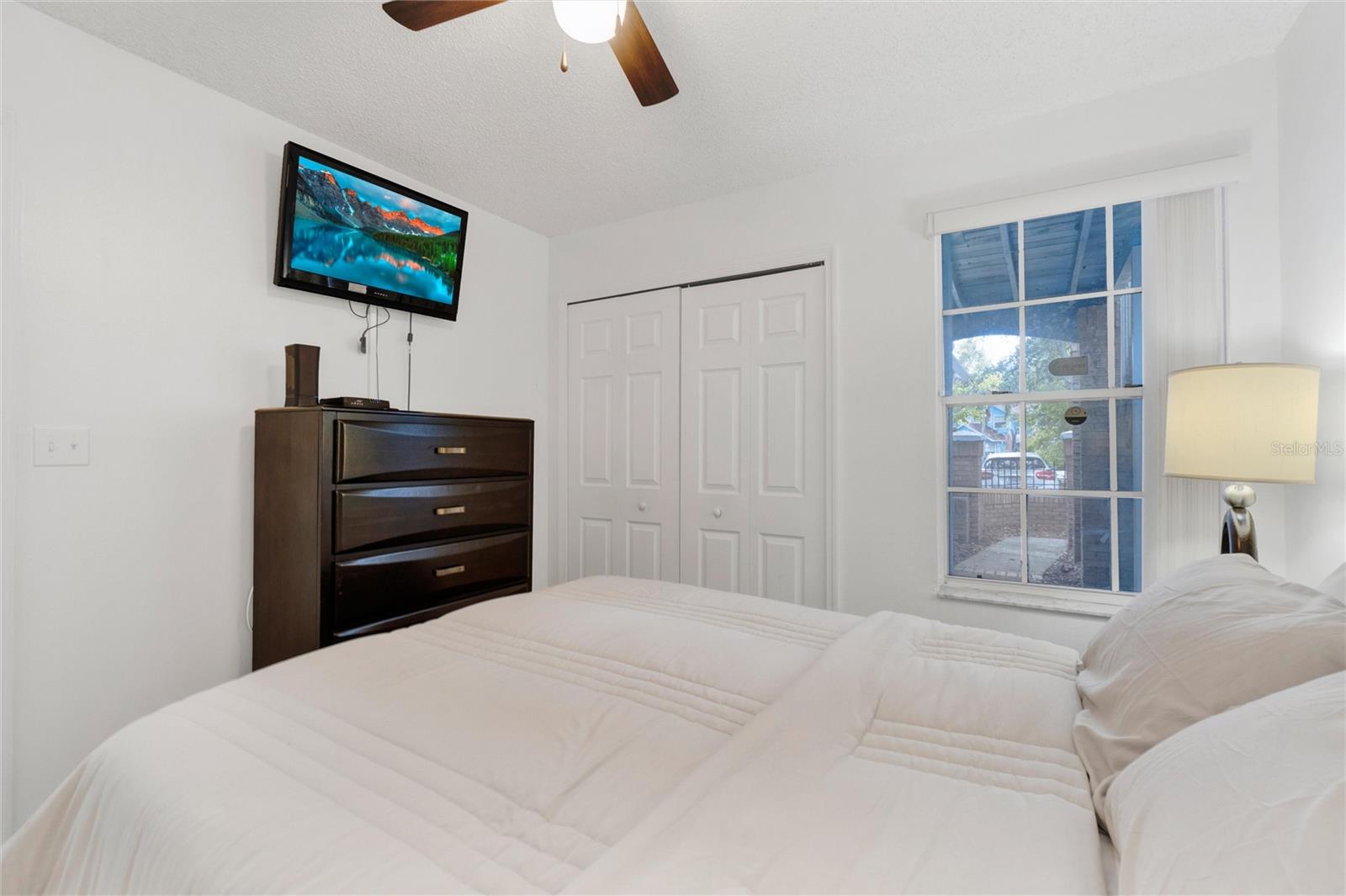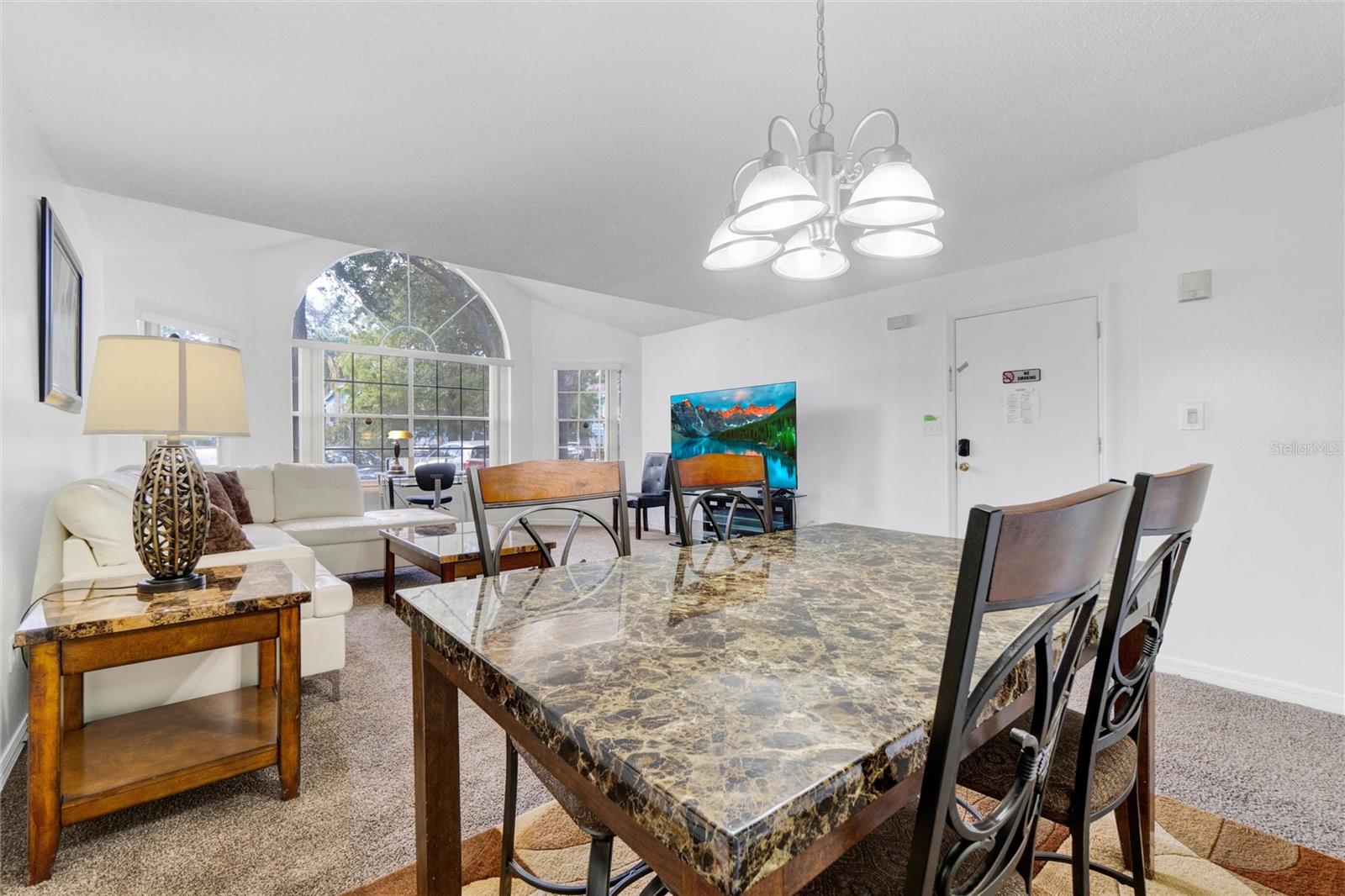 Long term Tenant in place until November 2025. Just a short drive to the enchanting Disney World and parks! This ground-floor condo is an excellent hoice for a vacation home, long-term rental, your permanent residence, or as an investment property (Airbnb, VRBO). Spacious and clean, this 3-bedroom, 2-bathroom unit features an open floor plan, newer carpet, and freshly painted interior walls, with a laundry closet equipped with a washer and dryer. The living-dining combo area is bathed in natural light thanks to large arched windows and a vaulted ceiling. The kitchen comes with sleek granite countertops, wood like laminate flooring, double kitchen sink, a pantry closet, and all the needed appliances. Each bedroom comes with brand new ceiling fan/light combos and windows that let in plenty of fresh air. Primary bedroom comes with an en-suite bathroom upgraded with granite countertop vanity, beautiful fully tiled large walk-in shower, and a walk-in closet. Plus, the guest bathroom offers the convenience of a shower/tub combo. This unit is ideally located at the back of the community, providing a calm and peaceful environment. This property is turnkey ready and fully furnished for your convenience, so you can move right in or start renting it out without any hassle! You’ll also enjoy the community amenities: a pool with a hot tub, a tennis court, a fitness center, and a covered outdoor dining area with a sun deck. HVAC (2015). Book your private tour today!