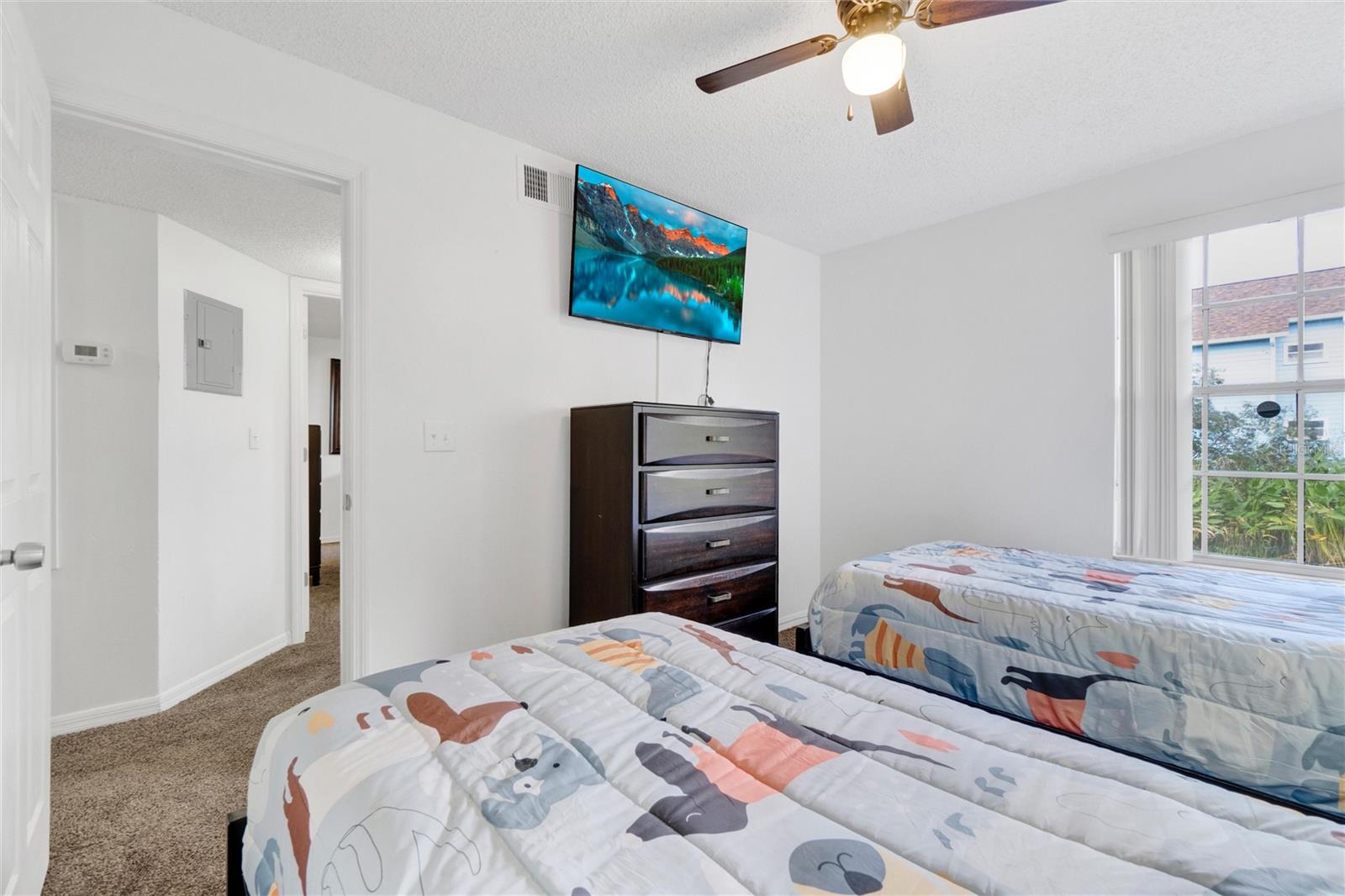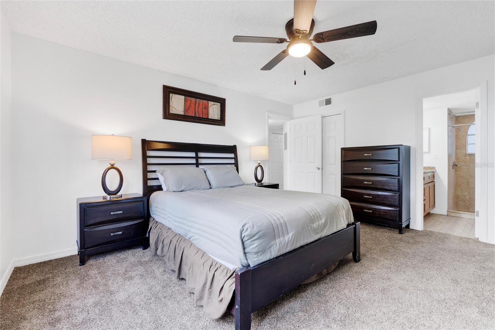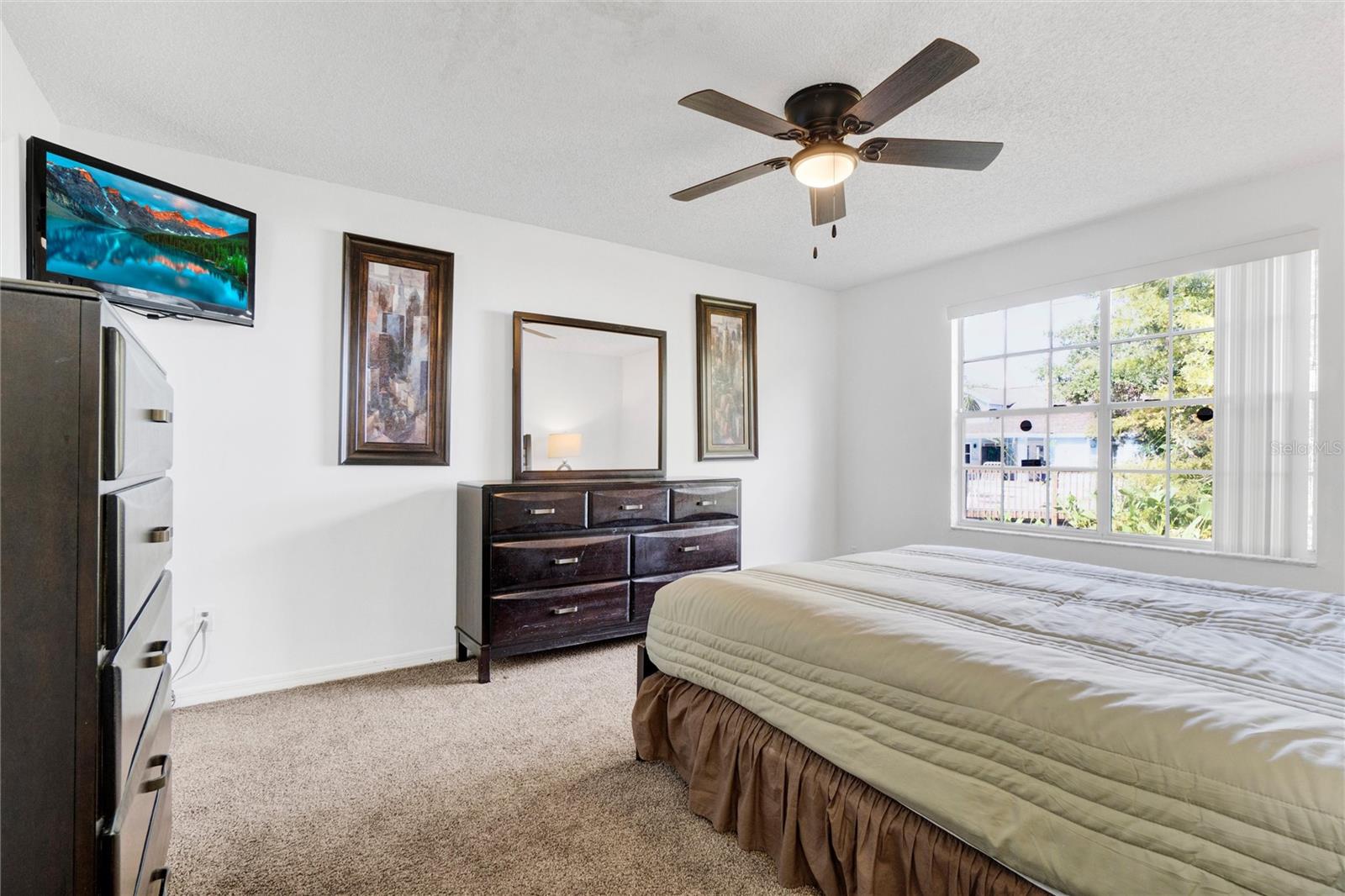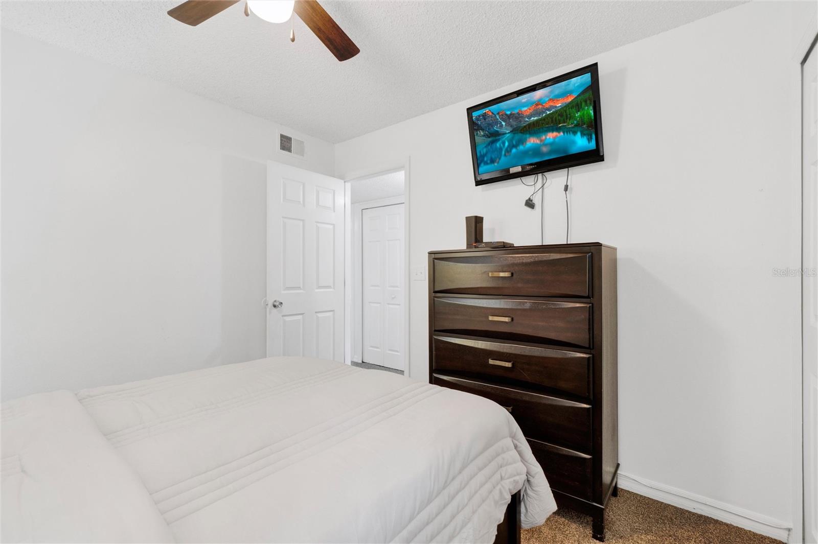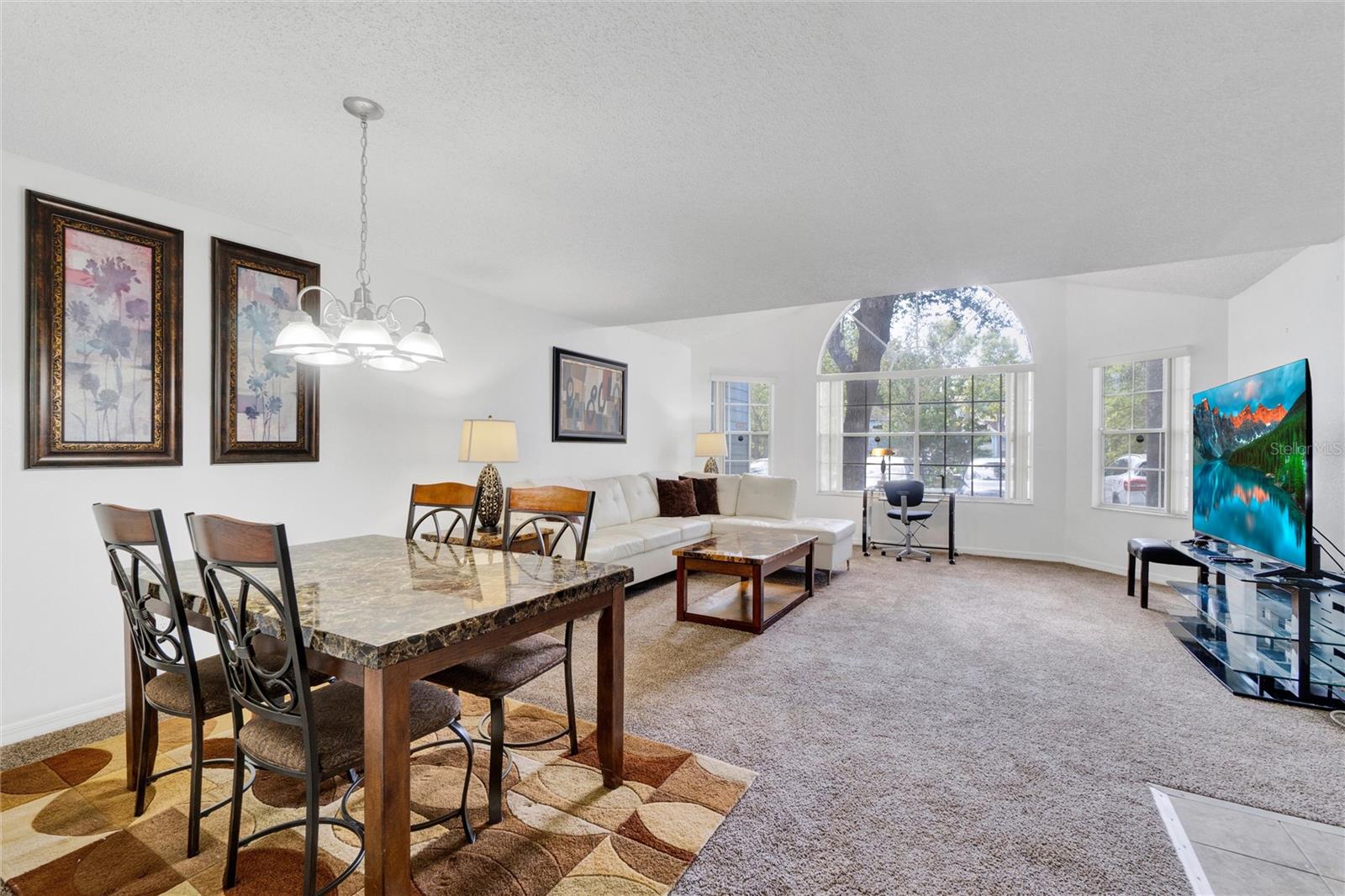 Long term Tenant in place until November 2025. Just a short drive to the enchanting Disney World and parks! This ground-floor condo is an excellent hoice for a vacation home, long-term rental, your permanent residence, or as an investment property (Airbnb, VRBO). Spacious and clean, this 3-bedroom, 2-bathroom unit features an open floor plan, newer carpet, and freshly painted interior walls, with a laundry closet equipped with a washer and dryer. The living-dining combo area is bathed in natural light thanks to large arched windows and a vaulted ceiling. The kitchen comes with sleek granite countertops, wood like laminate flooring, double kitchen sink, a pantry closet, and all the needed appliances. Each bedroom comes with brand new ceiling fan/light combos and windows that let in plenty of fresh air. Primary bedroom comes with an en-suite bathroom upgraded with granite countertop vanity, beautiful fully tiled large walk-in shower, and a walk-in closet. Plus, the guest bathroom offers the convenience of a shower/tub combo. This unit is ideally located at the back of the community, providing a calm and peaceful environment. This property is turnkey ready and fully furnished for your convenience, so you can move right in or start renting it out without any hassle! You’ll also enjoy the community amenities: a pool with a hot tub, a tennis court, a fitness center, and a covered outdoor dining area with a sun deck. HVAC (2015). Book your private tour today!