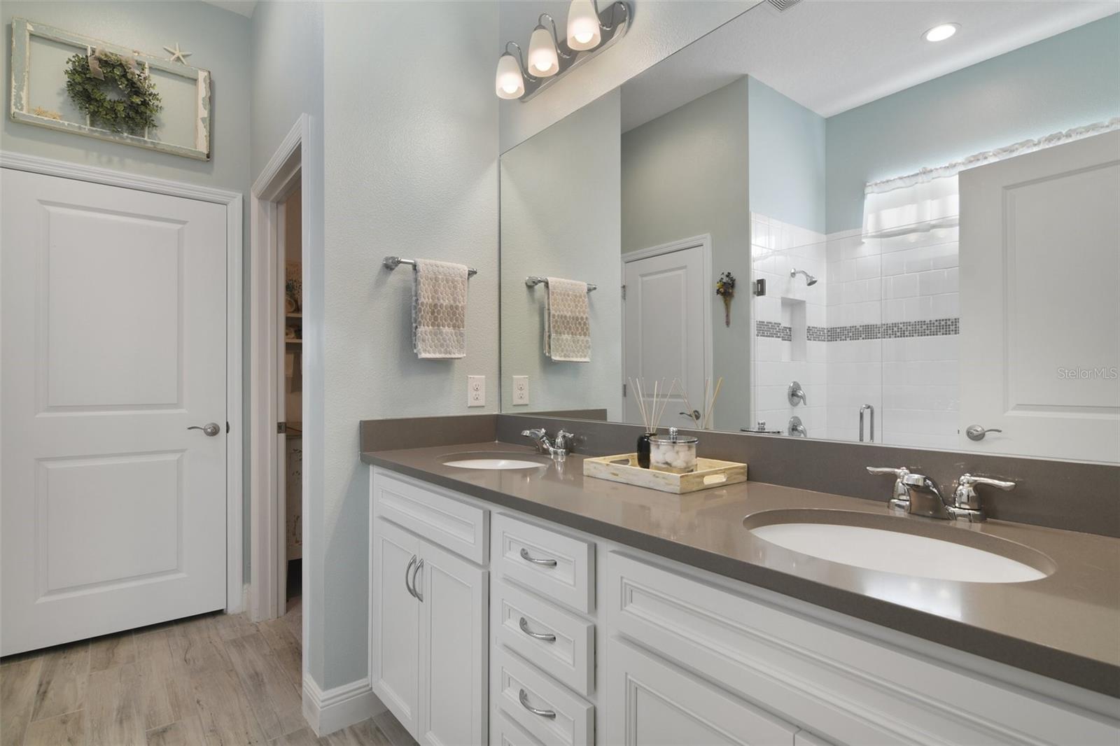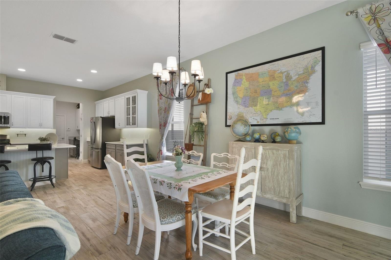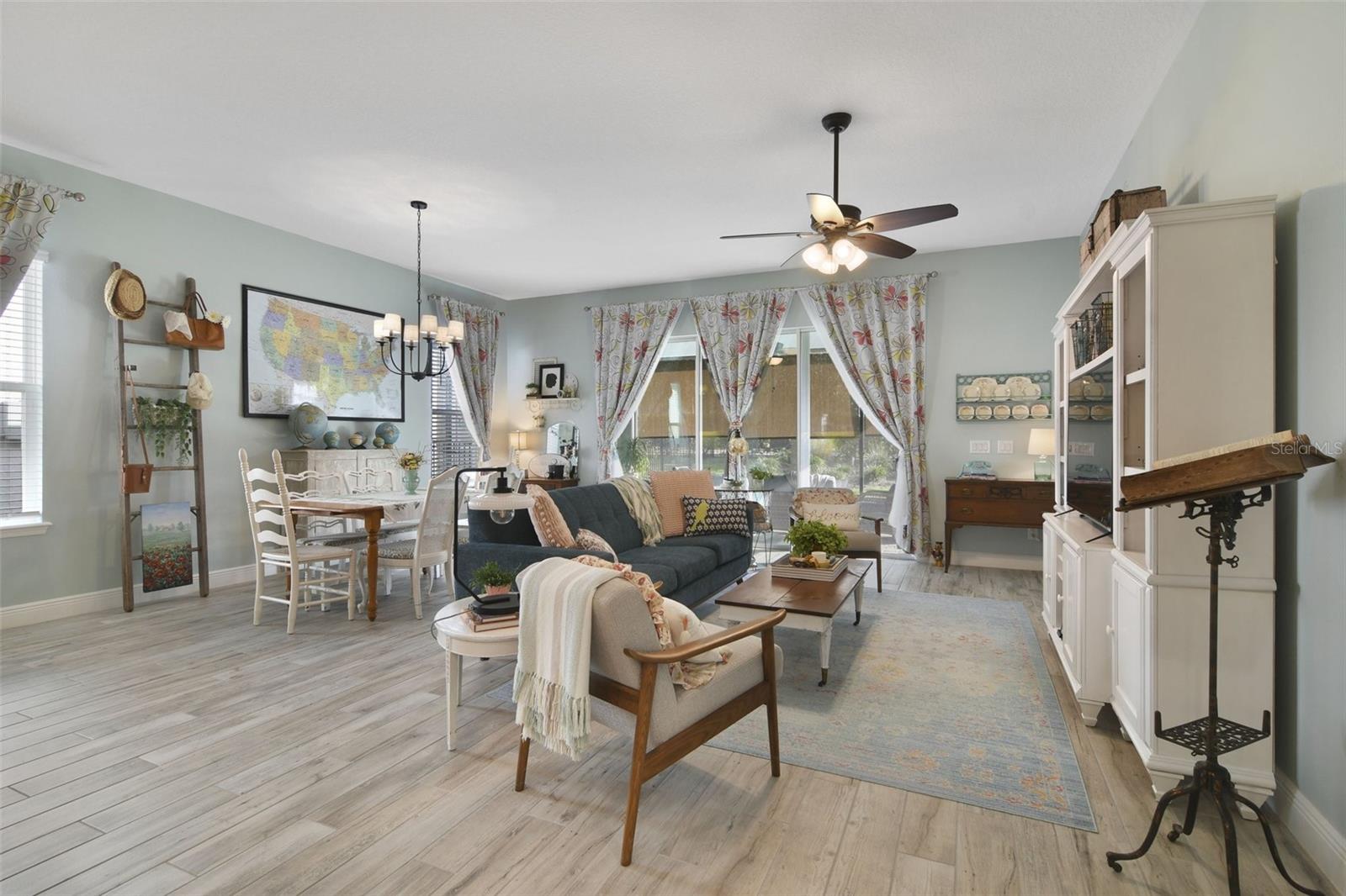 Motivated Sellers!! Move-in ready. Cozy, Cottage style 2/2 Home in Four Seasons 55+ Community. Very close to Disney. This like-new home shines with over $30K in upgrades and an expanded great room via a 12’ multi-sliding glass door, adding 179 SF of living space. Enjoy an open floor plan with split bedrooms, wood-plank tile, Berber carpet, recessed lighting, and ceiling fans throughout. Kitchen Features: Oversized island with breakfast bar Quartz countertops Soft-close cabinets with crown molding Under-cabinet lighting & stainless appliances (gas cooktop). Primary Suite: Spacious bedroom with walk-in closet Luxurious bath with double vanities, frameless shower, dual shower heads. Outdoor Living: Covered, screened in lanai with fan and privacy shades No rear neighbors. Additional Perks: Tankless gas water heater Utility sink in laundry Extended great room/dining area. Community Amenities: Gated golf community with resort-style pools, tennis, pickleball, bocce, fitness center, daily events, and clubhouse with active clubs. Prime location!