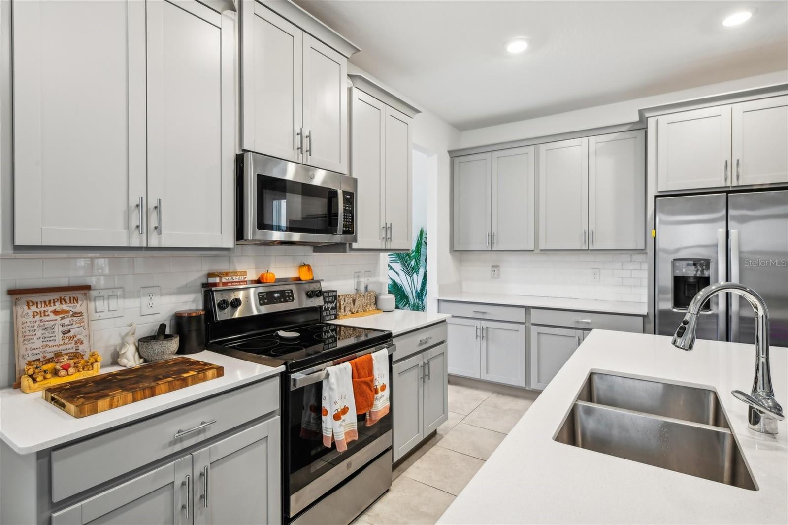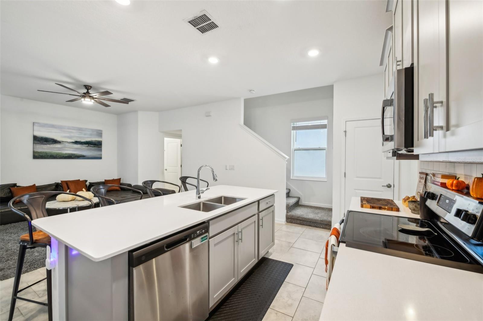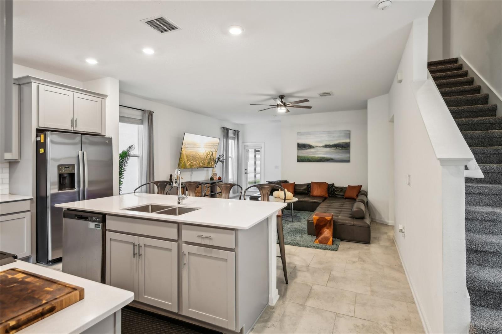 Welcome to this stunning 4-bedroom, 3.5-bathroom home in the highly sought-after Tohoqua community of Kissimmee, Florida. Built in 2022, this modern 2,537 sq ft home provides a spacious layout with plenty of room for family living and entertaining. The open-concept design is highlighted by ceramic tile throughout the main living areas, while plush carpet provides comfort in the bedrooms and loft. The heart of the home is the beautiful kitchen, featuring sleek stainless steel appliances, a large center island perfect for casual dining, and stylish modern cabinetry. The luxurious primary bedroom is conveniently located on the main floor and includes an en suite bathroom with dual sinks and a walk-in shower, providing a peaceful retreat. Upstairs, you’ll find a versatile bonus loft area that can serve as a home office, media room, or living area. Step outside to the covered and screened-in patio, ideal for relaxing while enjoying Florida’s beautiful weather. The home also includes a two-car garage for added convenience. Living in the Tohoqua community means access to a wealth of amenities, including a fitness center, park, pool, and tennis courts. This is the perfect home for those looking to enjoy modern living in a vibrant, well-appointed community.