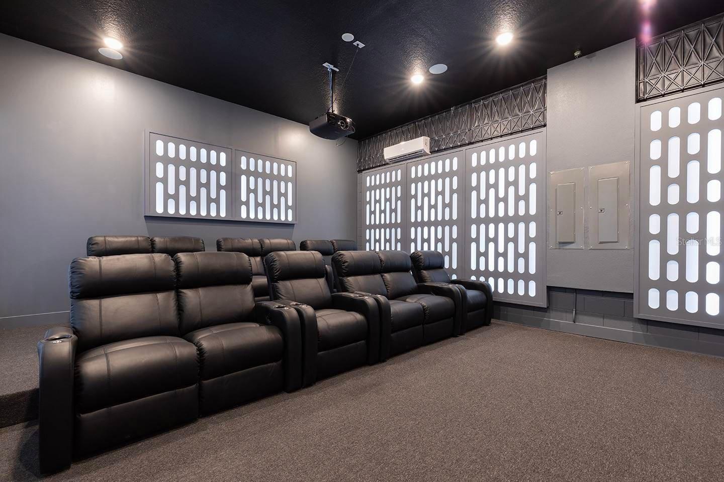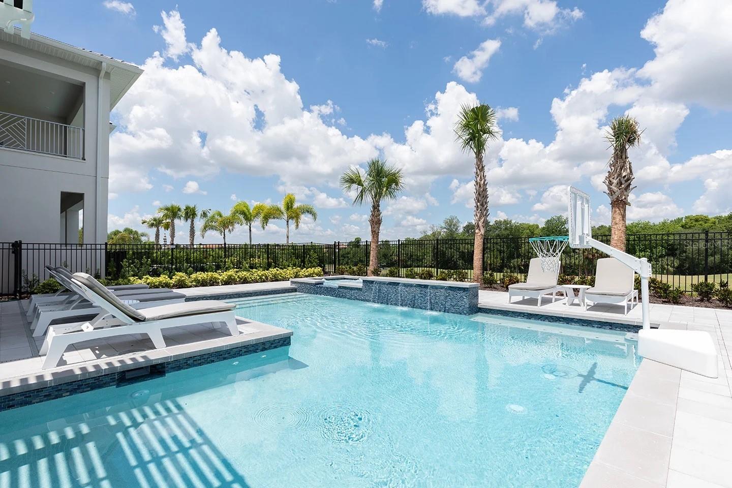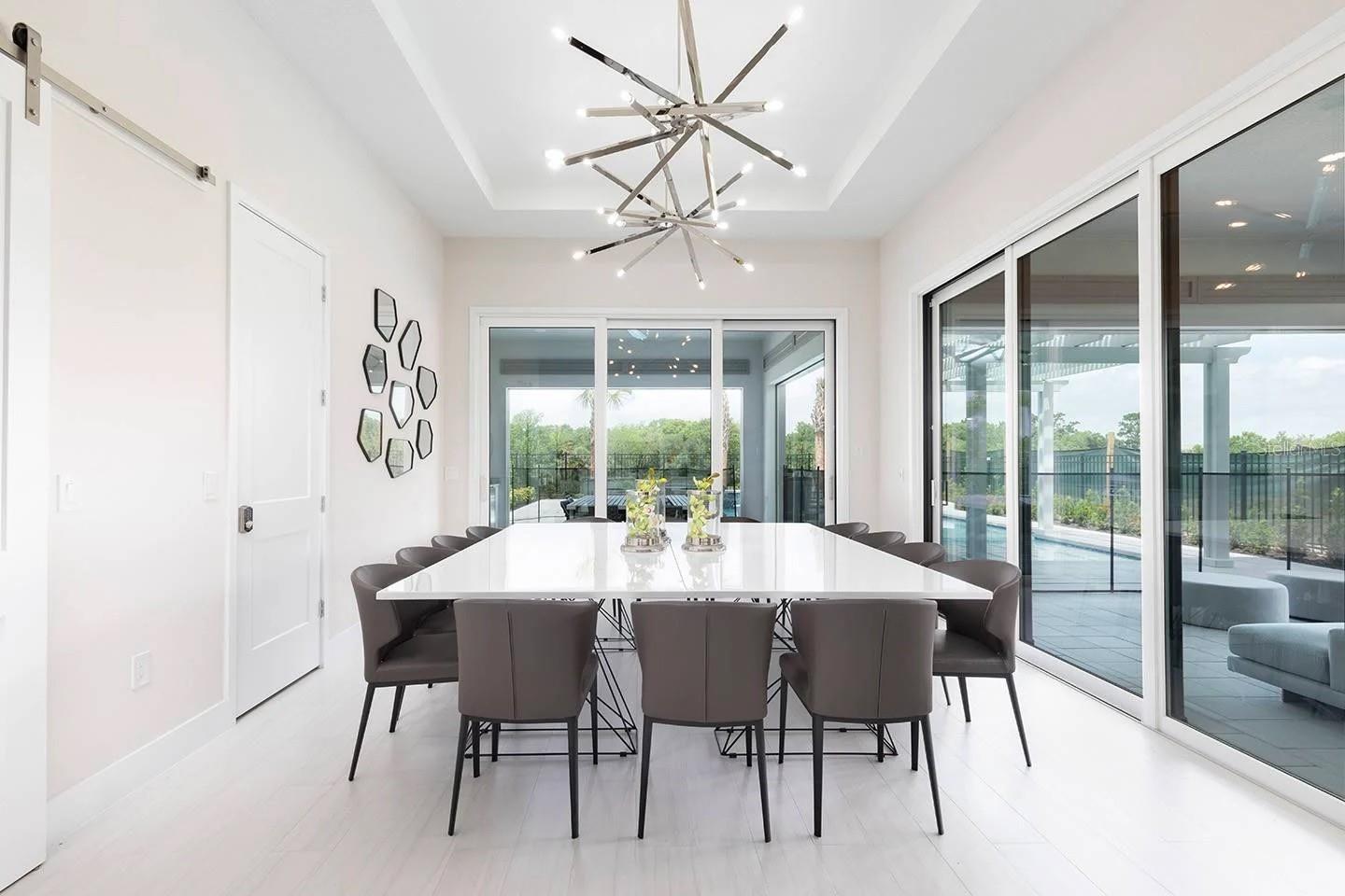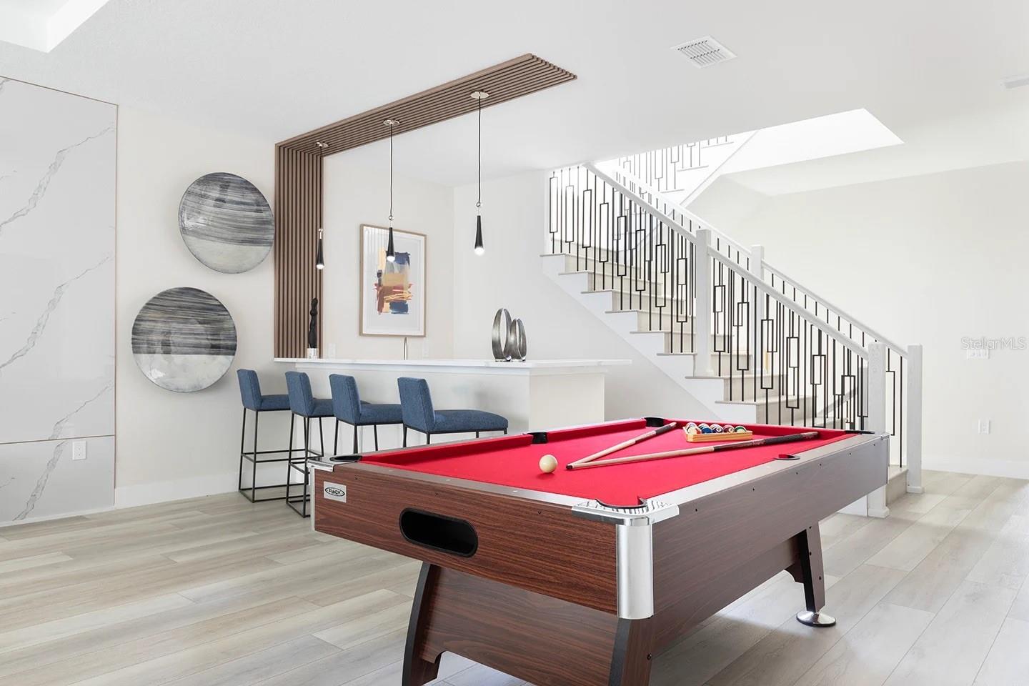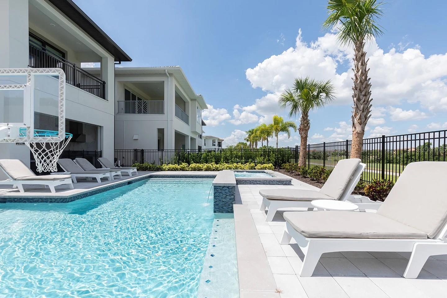 Luxurious Vacation Home in the Exclusive Bear's Den Club at Reunion Resort. Located on the signature Jack Nicklaus golf course with breathtaking views of the entire 18th hole leading up to the clubhouse, this stunning 6,500+ sq. ft. home offers a rare opportunity to own in one of Florida’s most sought after communities. Located within the private, gated Bear's Den Club area of Reunion Resort, this exquisite residence boasts 9 bedrooms and exceptional amenities, providing the perfect retreat for large families or discerning vacation rental investors. This impeccably designed home offers expansive living spaces, providing ample room for large gatherings and comfortably accommodating a significant number of guests. The open-concept living area features soaring ceilings, large windows, and luxurious finishes, creating a light-filled and inviting space for relaxation. The gourmet kitchen is a chef’s dream, fully equipped with top-of-the-line appliances, ample counter space, and a built-in eating area, perfect for casual meals or morning coffee while enjoying stunning views. The spacious dining area is ideal for hosting formal dinners and special occasions. The home offers an expansive master king suite on the ground floor, providing privacy and ease of access. Upstairs, you’ll find three additional king suites and several themed bedrooms with custom bunk beds, designed for hours of endless fun. The third floor features another king suite with panoramic views, perfect for unwinding after a day of activities. For entertainment, the private home theater is a true standout, featuring a large projection screen, state-of-the-art sound system, and 12 luxurious leather recliners for an immersive cinematic experience. Step outside and indulge in the private pool and spillover spa, surrounded by ample space for sunbathing, dining, and outdoor entertaining. The expansive patio offers a tranquil oasis with scenic views of the golf course and beyond, making it the perfect place to relax and unwind. This home also comes fully furnished with tasteful, high-end decor, making it move-in ready or immediately available for vacation rental guests. As a bonus, the active Reunion Resort membership offers access to world-class amenities including championship golf courses, multiple pools, a water park, a fitness center, spa services, and fine dining options. Just 12 minutes from Walt Disney World, this home’s prime location offers both luxurious living and incredible investment potential in one of Central Florida’s most sought-after communities.