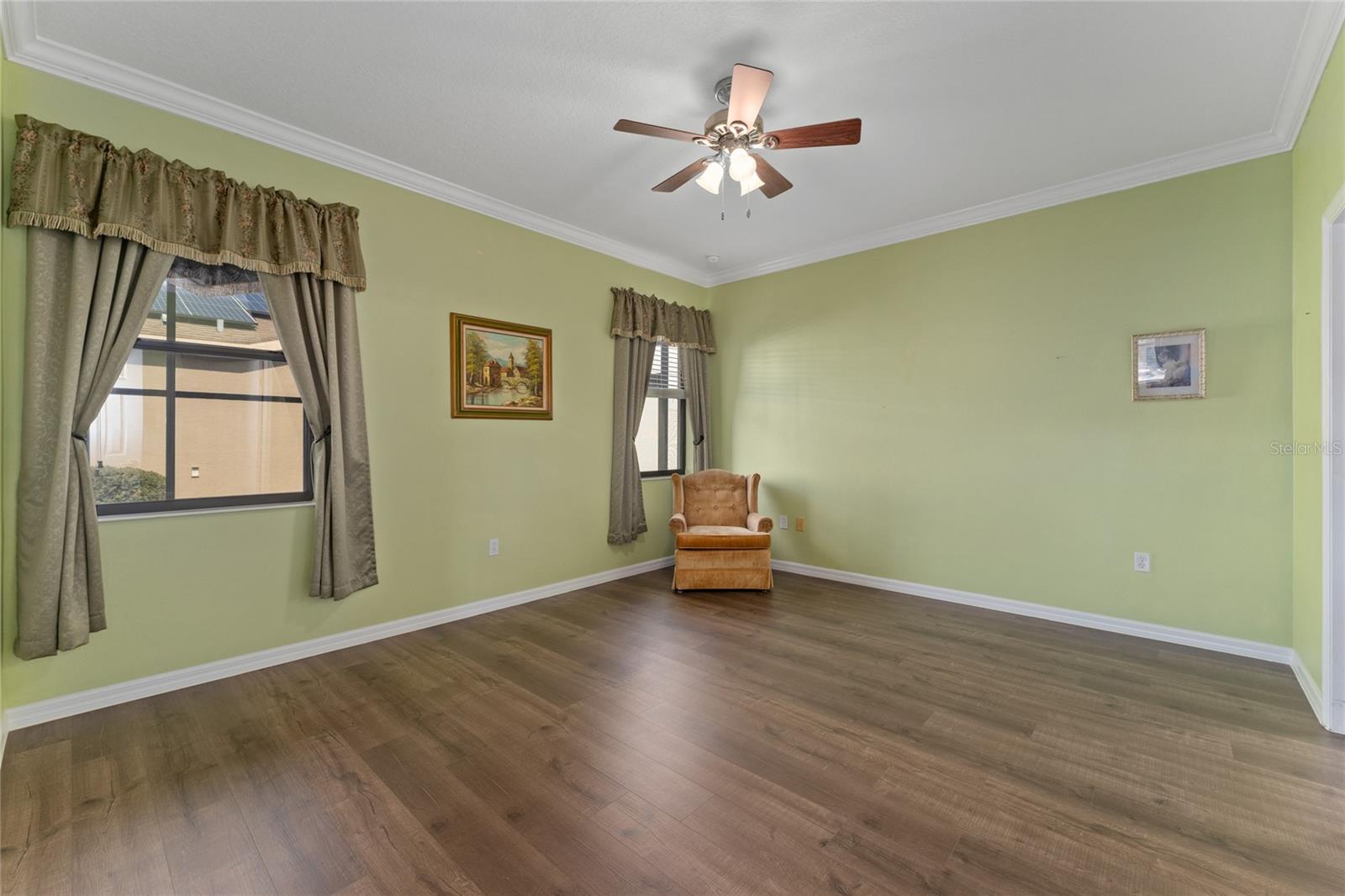 PRICE IMPROVED!!! Discover an exceptional opportunity to own the sought-after Plantation model in the desirable Mira Vista neighborhood of Solivita! This charming FURNISHED 3-bedroom, 2-bathroom home boasts an open layout with high ceilings, transom windows, and tasteful upgrades that enhance its warmth and character. Step inside to find crown molding throughout, chair rail detailing in the main living areas, and wood laminate flooring that flows seamlessly. Enjoy the added living space of a 3-season Florida room, offering over 170 square feet of relaxation or entertainment. The kitchen is both stylish and functional, featuring 42" cabinets with pull-out shelves, recessed lighting, a pantry, and a chic tile backsplash. The spacious master suite is a retreat with French doors, a large walk-in closet, and an en-suite bathroom with double sinks and ample storage. Two additional bedrooms provide versatility, with one offering a mini office set up in the walk-in closet. Recent updates ensure worry-free living. The HVAC system was replaced in November 2020, the ROOF was newly installed in October 2023, and the exterior was painted in 2021. This home is move-in ready, waiting for you to experience its charm and thoughtful details. Located in Solivita, an award-winning 55+ active lifestyle community, this home gives you access to incredible amenities, including 14 pools, two 18-hole championship golf courses (one recognized by Golf Digest as one of the "Best Places to Play"), tennis, pickleball, basketball, softball, walking trails, spa services, and two state-of-the-art fitness centers. The vibrant downtown village is a hub of activity, with restaurants, social events, and over 240 clubs to join. Embrace the resort-style living Solivita offers. Schedule your tour today and make this your dream home!