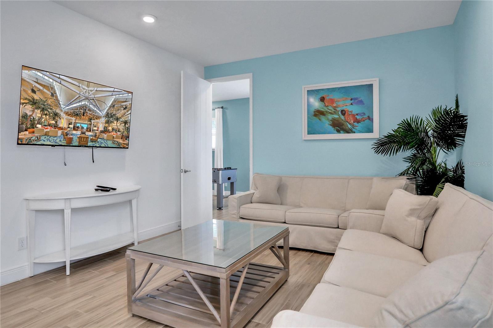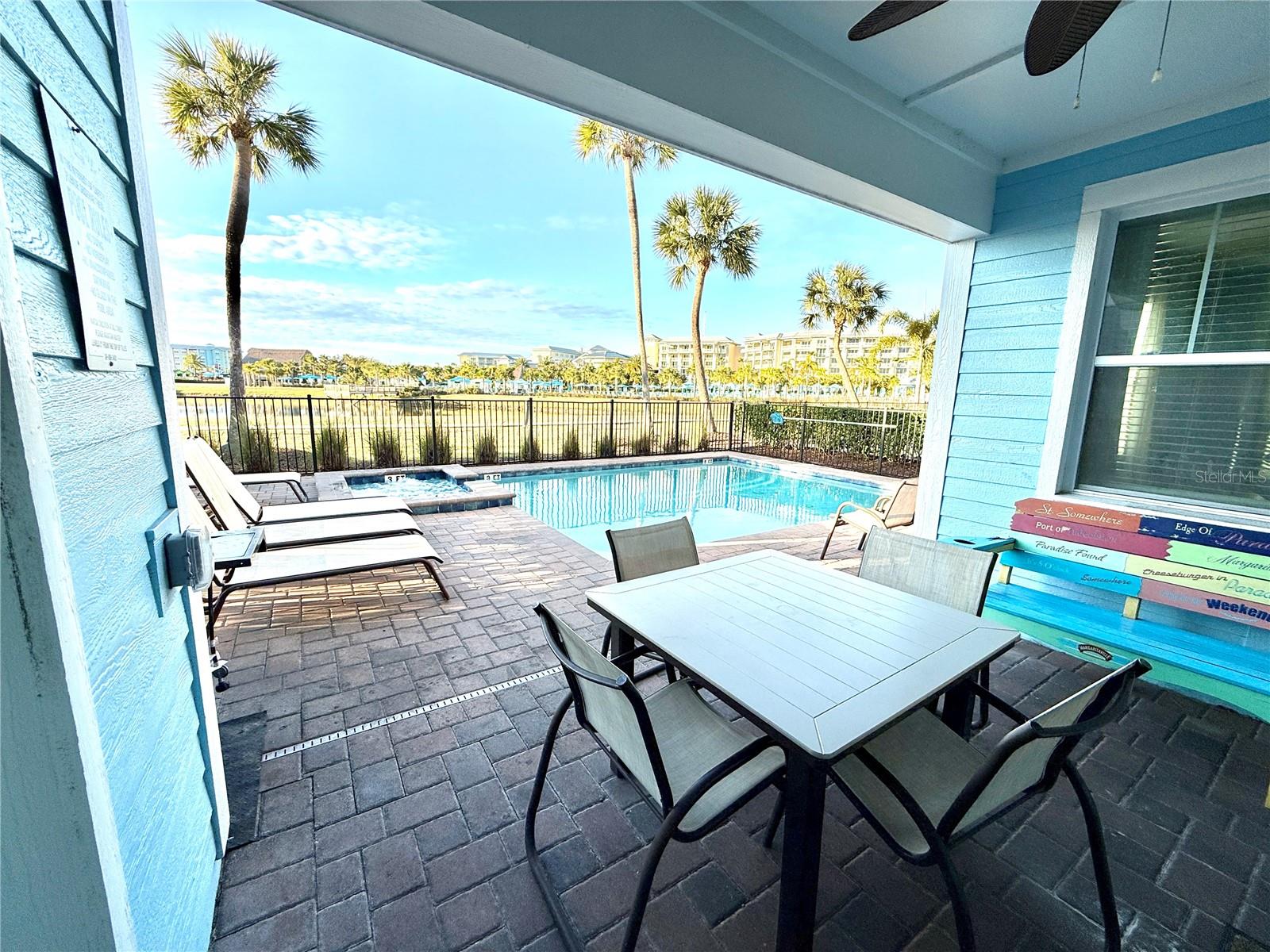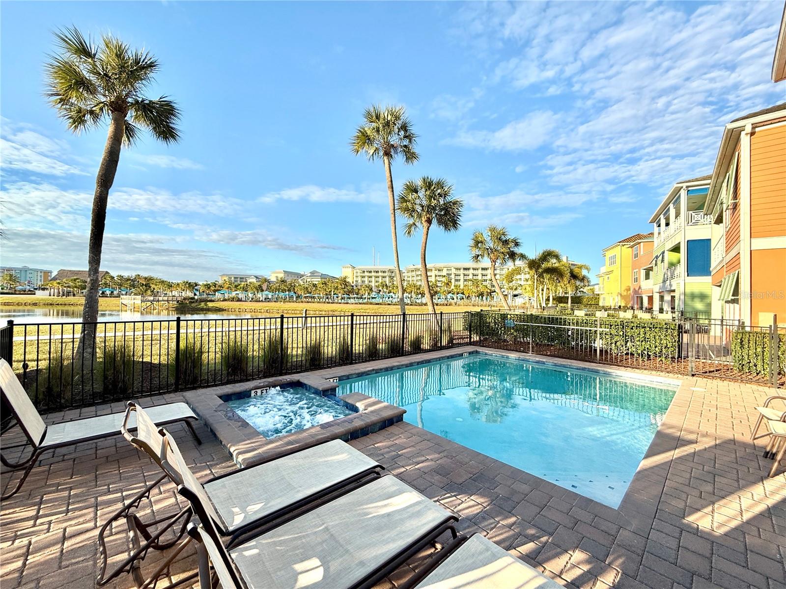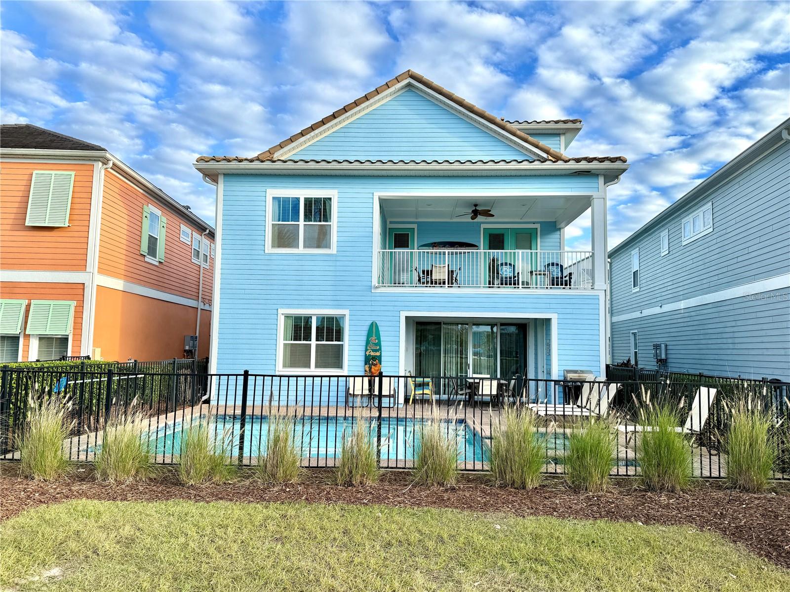 'THE BLUE PEARL' is an AMAZING WATERFRONT Cottage with POOL, SPA and GORGEOUS SUNSET VIEWS on Margaritaville Resort Orlando's 'TROPHY ROW'! MOST PREMIER RESORT LOCATION JUST STEPS FROM THE FINS UP BEACH CLUB and OTHER RESORT AMENITIES! FANTASTIC OPPORTUNITY TO OWN ONE of the LARGEST FLOOR PLANS in the Resort and the ONLY MODEL that has 4 BEDROOMS on the FIRST FLOOR! THIS EXTREMELY RARE 4090-C Three-Story Model Features 8 Bedrooms, 9 Full and 2 Half Bathrooms, "BEACH HOUSE" Upgrade Package and a LARGE Patio/Balcony on Second Floor! This BEAUTIFUL Home Features Four En Suite Bedrooms on First Floor, Kitchen with LARGE ISLAND and Windows Facing the Pool Bringing in Tons of Natural Light, Full Size W/D, Living Room with Sliders that Lead to Beautiful Paved Patio, Fenced In Backyard with Covered Area, In-Ground Pool and Spa and Cabana Bath. Second Floor has Four Bedrooms Including a Primary Suite with Large Walk-In Closet, Dual Sinks, Separate Tub and Shower and Balcony Access. The Third Floor Features a Spacious Loft with Two Separate Rooms. One Room in the Loft is Highlighted with a Foosball Game Table and Bubble Hockey Game. Home also has Covered Front Porch, Upgraded 'WOOD' Tile Flooring, QUARTZ Countertops, In-Ceiling Speakers in Living Room that Connects to TV or Phone Via App. Ethan Allen "BEACH HOUSE" Furniture/Housewares Package INCLUDED in List Price! Package Includes Blinds, Drapes, TVs, Artwork, Kitchen Necessities, Dishware, Linens, Frozen Concoction Maker and SO MUCH MORE! This is a Wonderful Community to Live in Full Time, Own a Second Home or Invest in a Vacation Rental Property! Unique First of its Kind Resort with Multiple Pools, Gym, On-Site Water Park, Sunset Walk Restaurants, Bars, Live Music, Retail and More! LOCATED MINUTES FROM DISNEY PARKS! The Time is Now to Start Living the Margaritaville Lifestyle!