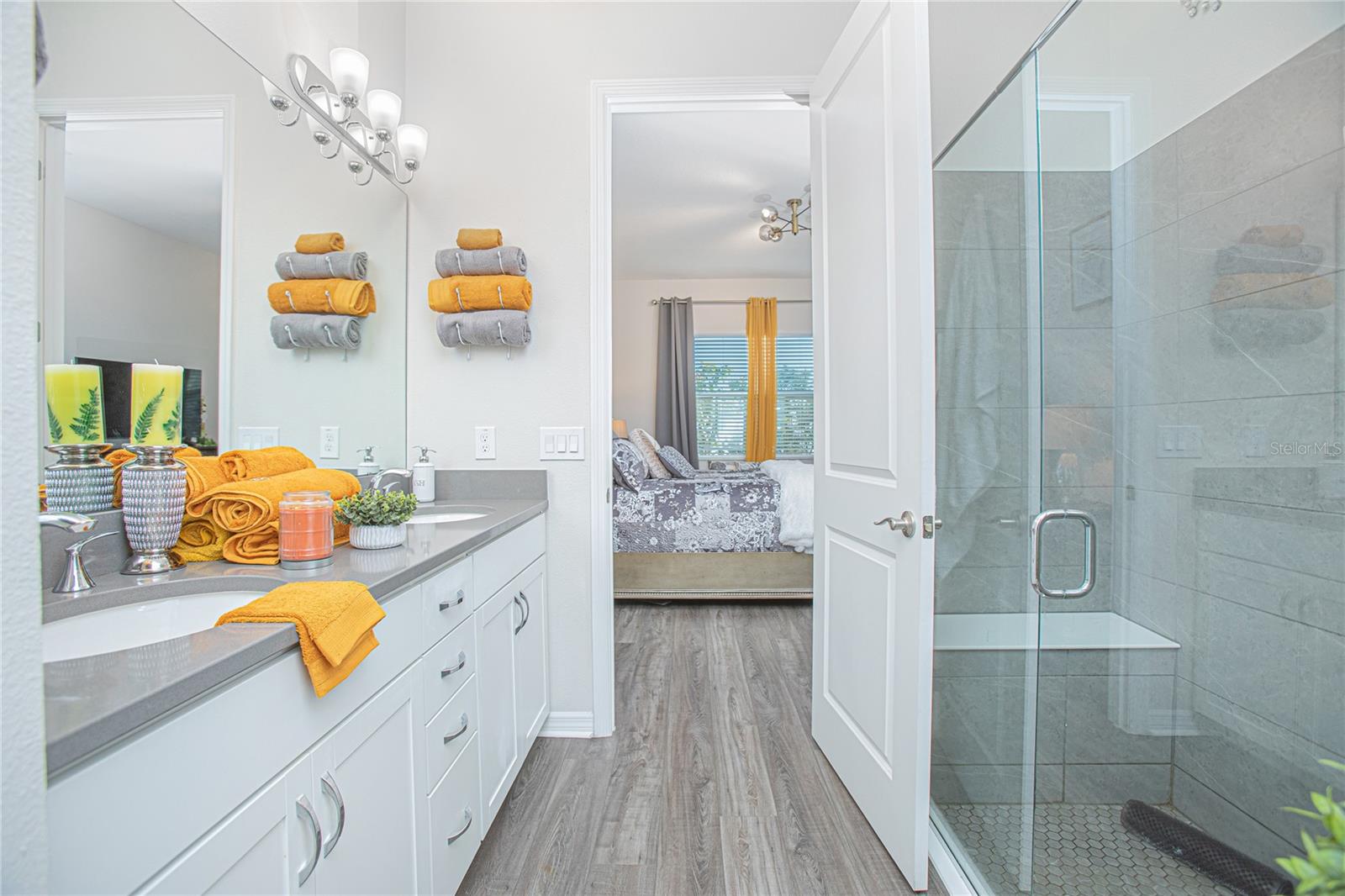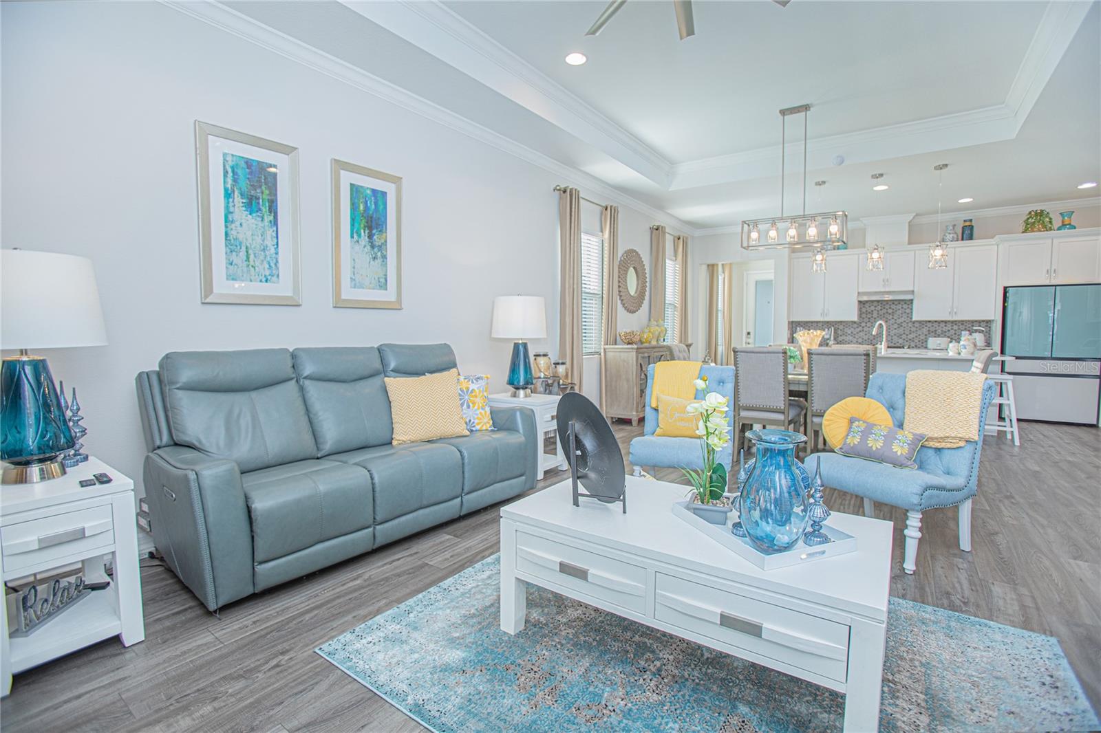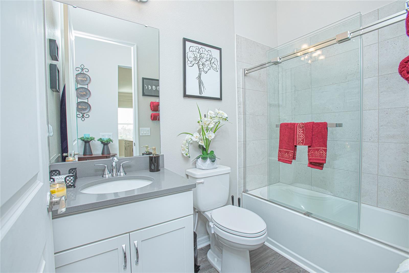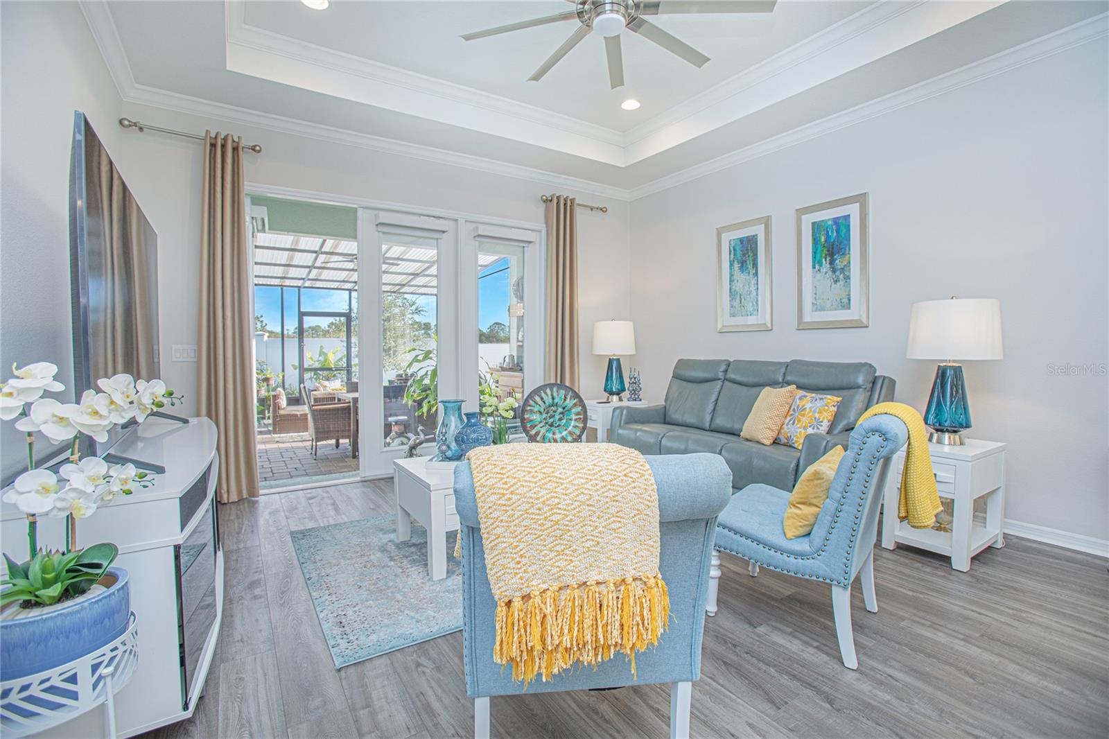 Experience resort-style living in the highly desirable 55+ community of Four Seasons at Orlando! This beautifully appointed 2-bedroom, 2-bath villa showcases 1,437 sqft of open, light-filled space with stylish upgrades throughout. The gourmet kitchen is equipped with quartz countertops, a gas cooktop, a spacious island, and abundant cabinetry, perfect for everyday living or entertaining. Step outside to your own private oasis: a screened lanai with a custom summer kitchen and extended pavers, ideal for relaxing or hosting guests. A privacy wall creates a secluded ambiance, while the screened front porch is the perfect spot to enjoy Florida’s breezes. Enjoy the elegant touches of laminate flooring, a tray ceiling in the living area, and thoughtfully designed finishes in every room. The primary suite features dual sinks and a walk-in shower with a built-in bench for added comfort. Situated in the heart of the Celebration area, you’ll be minutes from world-class dining, shopping, and all the excitement of the Disney attractions. Residents of Four Seasons enjoy exclusive access to a 12,000 sqft clubhouse, two pools, pickleball, tennis, bocce courts, and the Mystic Dunes Golf Course. This exceptional villa blends luxury, convenience, and a vibrant community lifestyle. Schedule your private showing today and discover why this is one of the best opportunities in Four Seasons at Orlando!