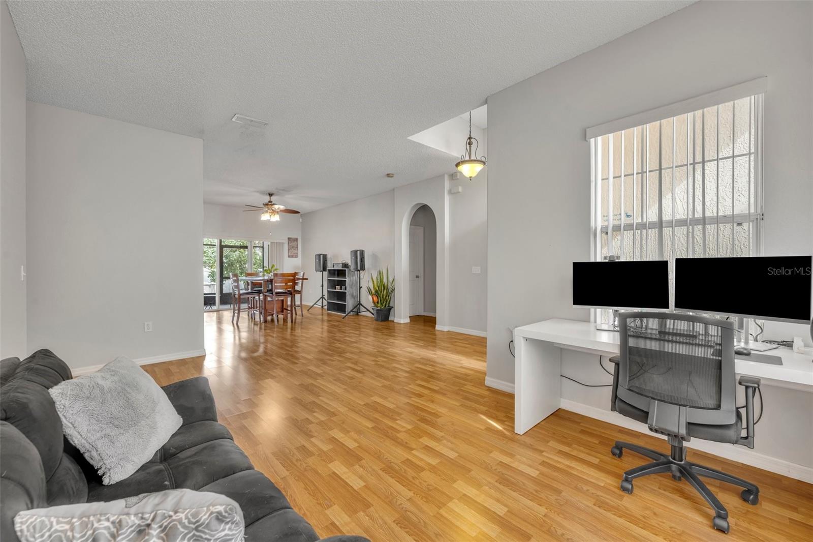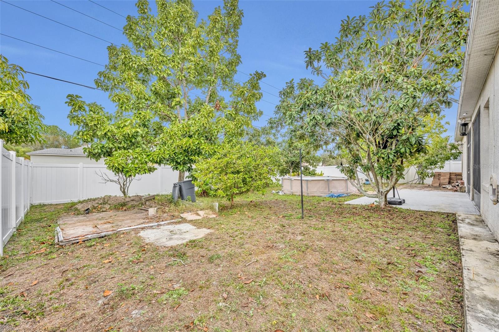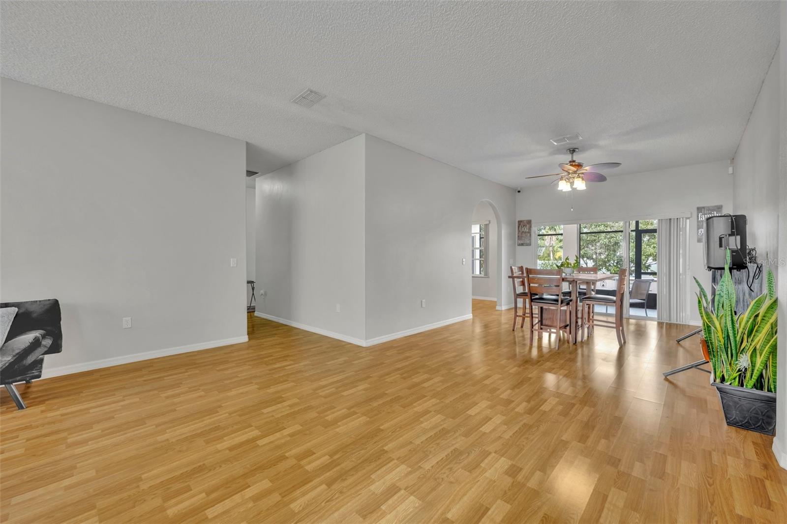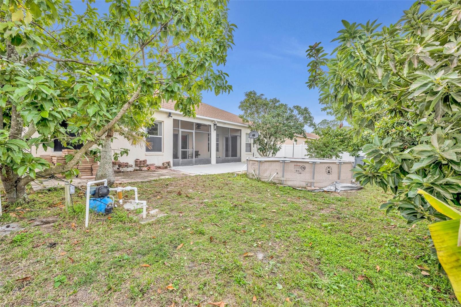 Welcome to this stunning 4-bedroom, 3-bath home with over 2,300 square feet of living space, offering a unique layout designed for privacy and comfort. As you approach, you'll be greeted by a paved driveway and lush palm trees, giving the property a vacation-like feel. Step inside and immediately notice the open design, complemented by light wood flooring that enhances the natural brightness of the space. To the right, a private hallway leads to two bedrooms with their own full bathroom, perfect for an in-law suite or a private retreat. On the opposite side, the spacious primary suite awaits, complete with its own luxurious bath. The formal dining area flows seamlessly into the kitchen, which features space for a dinette or casual seating at the counter. From the kitchen, you’ll enjoy a clear view of the expansive family room, ideal for hosting or relaxing. The fourth bedroom is thoughtfully located on the other side of the home, along with the third full bathroom, ensuring privacy and functionality. Step outside to the screened-in patio, accessible through three sliding doors, and discover the large backyard. Filled with mature, fruit-bearing trees, it’s a paradise for those who enjoy gardening or outdoor living. The open yard offers plenty of space to bring your creative visions to life. This home’s distinctive floor-plan is truly one-of-a-kind and provides a perfect blend of comfort, functionality, and charm. Schedule your showing today and experience it for yourself!
