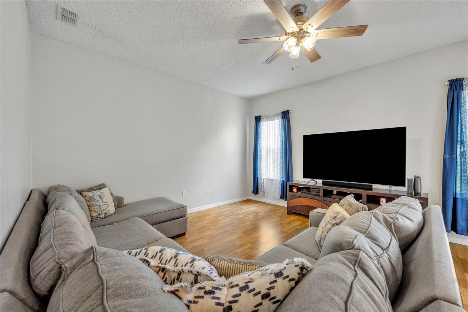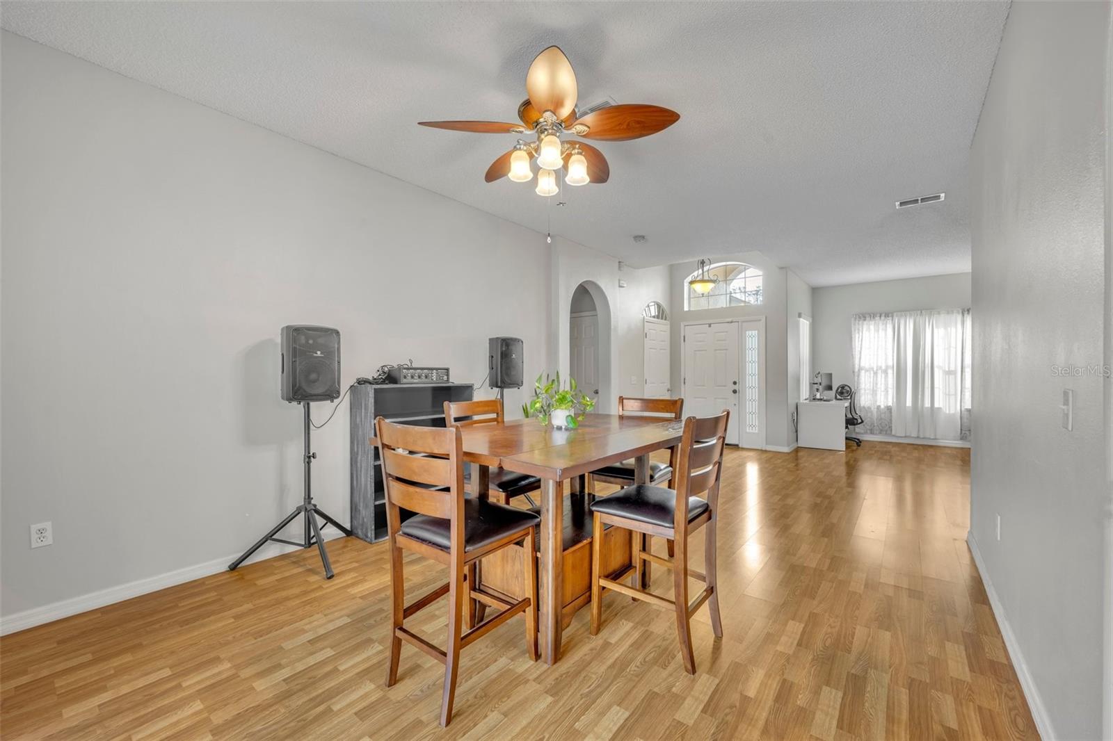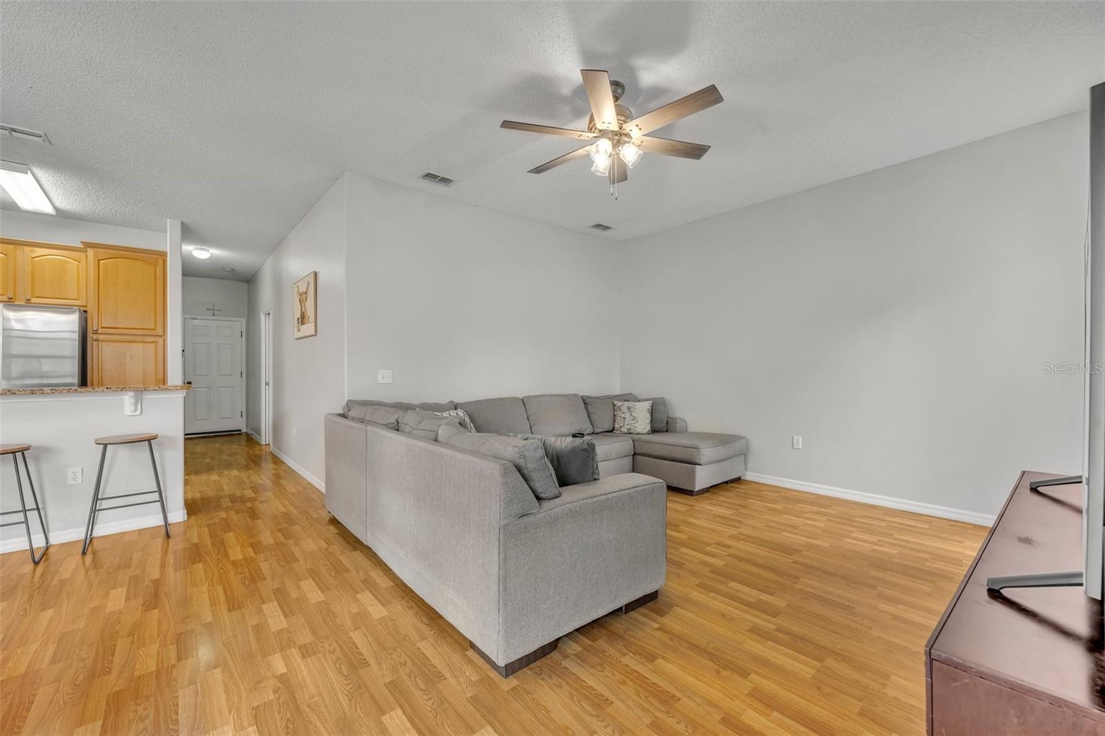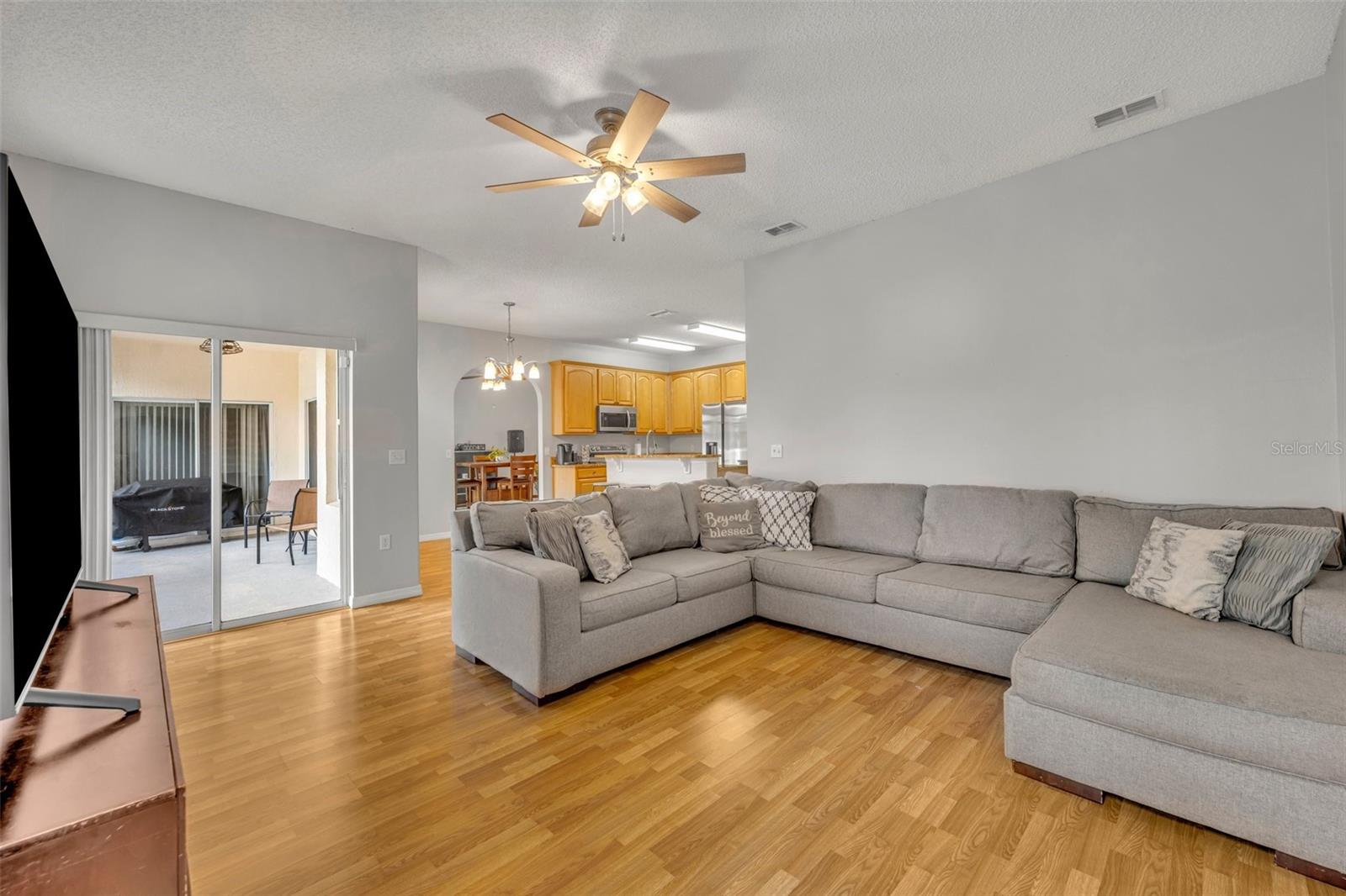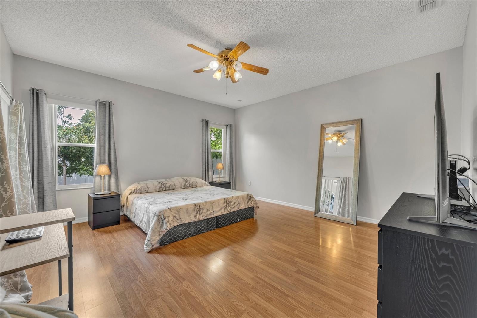 Welcome to this stunning 4-bedroom, 3-bath home with over 2,300 square feet of living space, offering a unique layout designed for privacy and comfort. As you approach, you'll be greeted by a paved driveway and lush palm trees, giving the property a vacation-like feel. Step inside and immediately notice the open design, complemented by light wood flooring that enhances the natural brightness of the space. To the right, a private hallway leads to two bedrooms with their own full bathroom, perfect for an in-law suite or a private retreat. On the opposite side, the spacious primary suite awaits, complete with its own luxurious bath. The formal dining area flows seamlessly into the kitchen, which features space for a dinette or casual seating at the counter. From the kitchen, you’ll enjoy a clear view of the expansive family room, ideal for hosting or relaxing. The fourth bedroom is thoughtfully located on the other side of the home, along with the third full bathroom, ensuring privacy and functionality. Step outside to the screened-in patio, accessible through three sliding doors, and discover the large backyard. Filled with mature, fruit-bearing trees, it’s a paradise for those who enjoy gardening or outdoor living. The open yard offers plenty of space to bring your creative visions to life. This home’s distinctive floor-plan is truly one-of-a-kind and provides a perfect blend of comfort, functionality, and charm. Schedule your showing today and experience it for yourself!