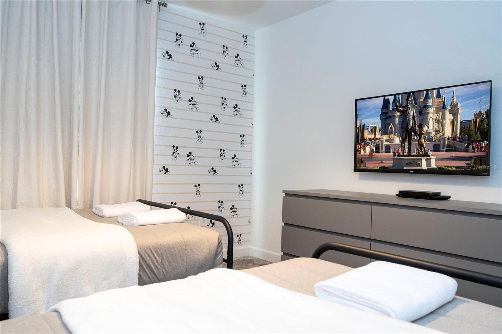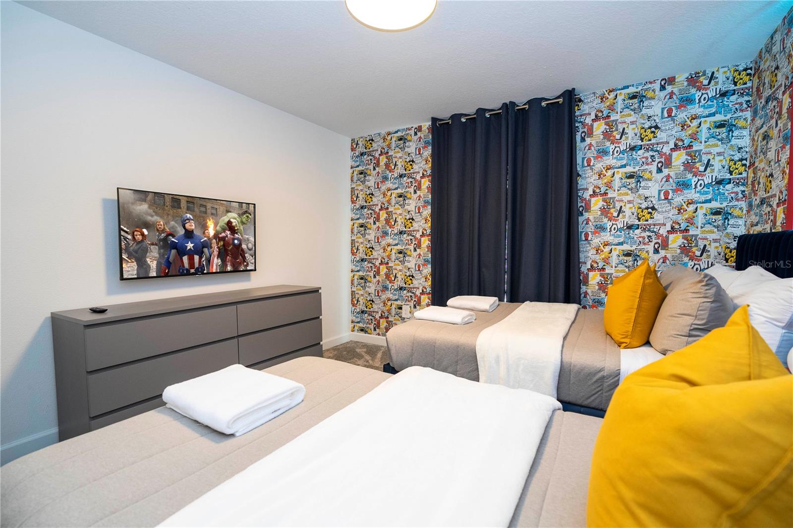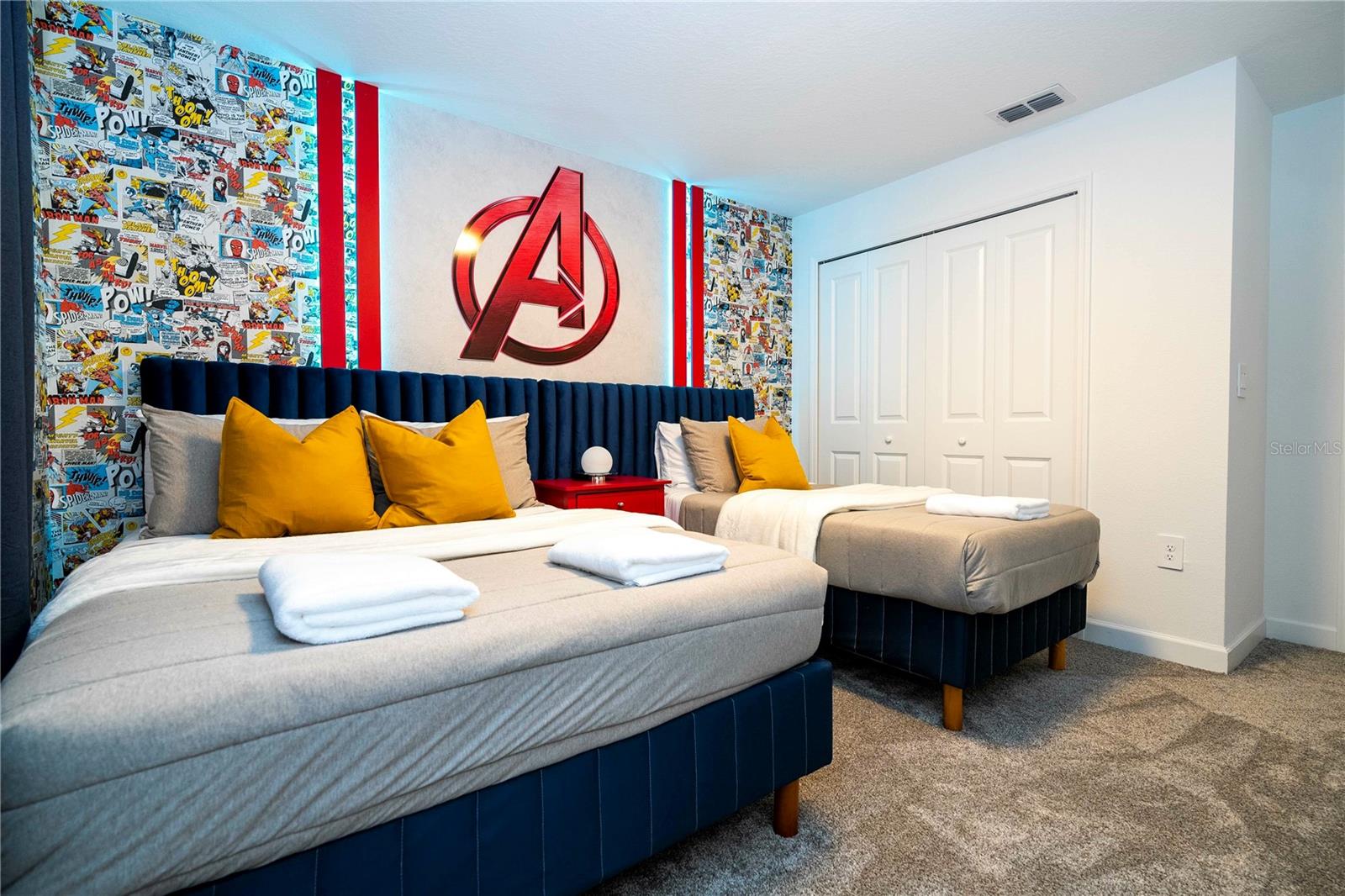 This charming townhouse, located in the desirable Storey Lake community, offers a fantastic vacation experience with a private pool and plenty of space for up to 10 guests. The home features 4 bedrooms and 3 bathrooms, with the first floor offering a cozy bedroom with a Queen bed, accommodating 2 guests with a bathroom just down the hallway. On the second floor, the master suite includes a King bed and a private bathroom, perfect for 2 guests. There are two themed rooms: one with a Mickey theme featuring a Full bed and a Twin bed (sleeps 3), and another with an Avengers theme offering a Full bed and a Twin bed (sleeps 3), both sharing a bathroom in the hallway. The home is fully equipped with everything you need for a comfortable stay, including a cozy living and dining area, a fully equipped kitchen with a dishwasher, a washer and dryer, and new linens for bed, bath, and table. Additional amenities include board games, a PS5 video game console, free high-speed Wi-Fi, cable TV, and free local calls. Guests can enjoy the private pool and access to the community’s recreational area. Please note that the use of the grill and pool heating are available for an additional fee, and certain activities in the recreational area may require on-site payment, such as arcade games, kayaking, and mini-golf. The home’s prime location makes it ideal for visiting Orlando's top attractions, with Walt Disney World just 20 minutes away (16 km) and Universal Studios around 25 minutes (22 km) from your doorstep. Whether you’re here for a family getaway or a group trip, this home offers everything you need for a relaxing and memorable stay.