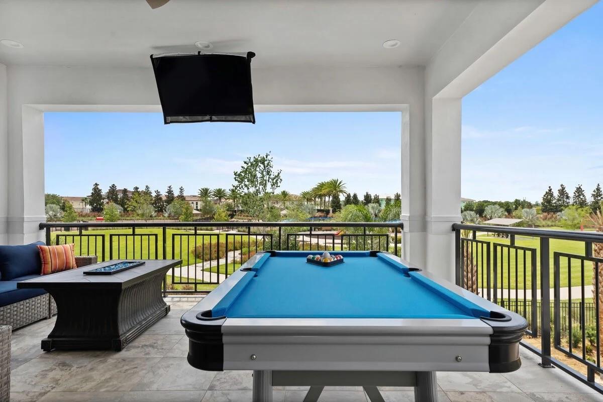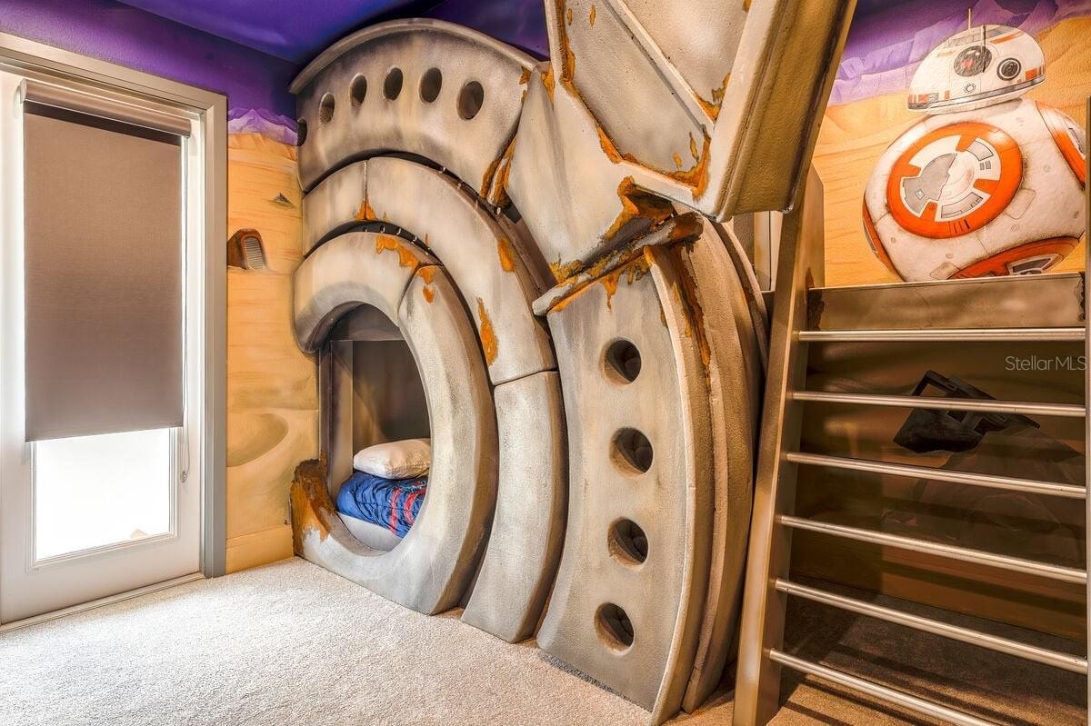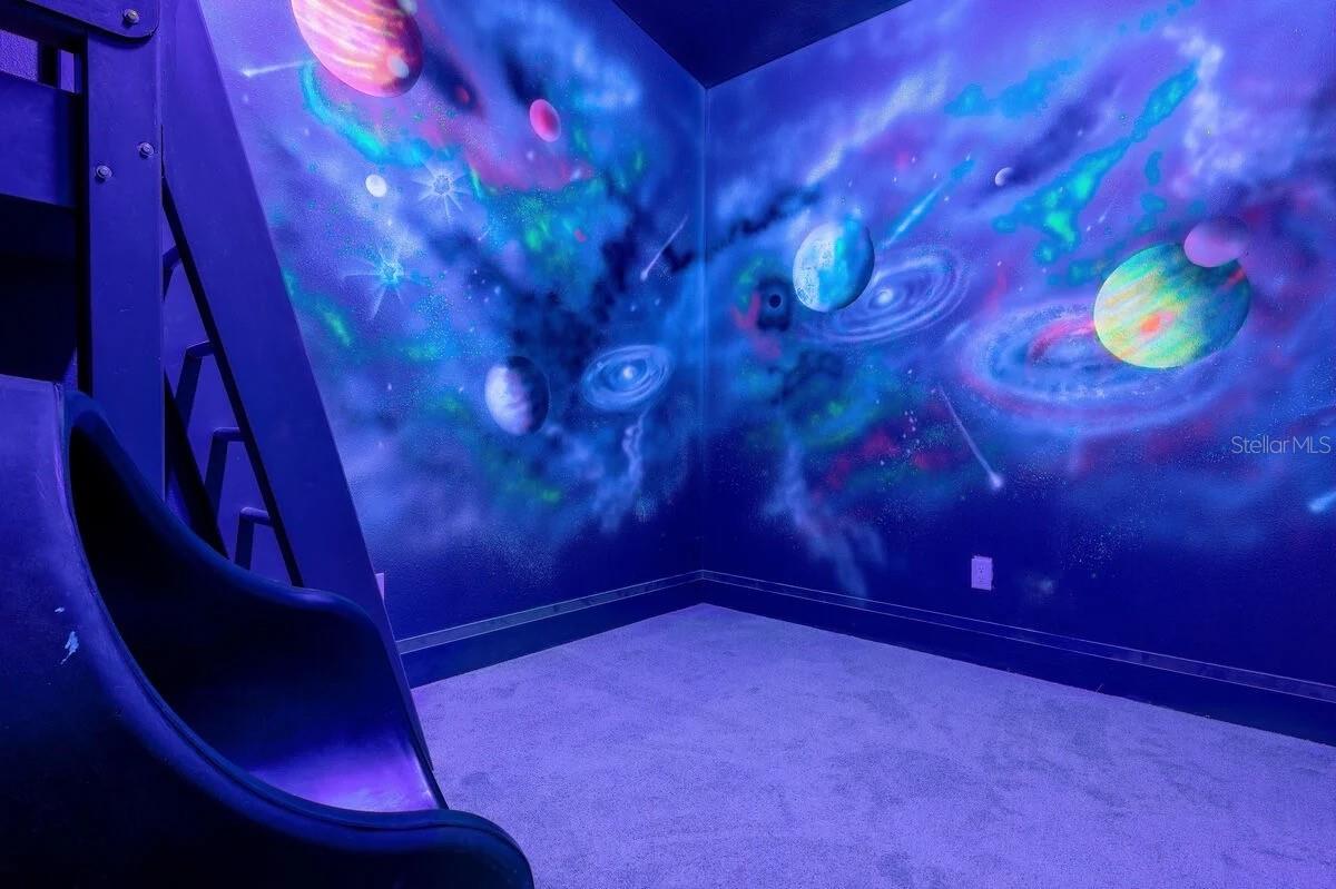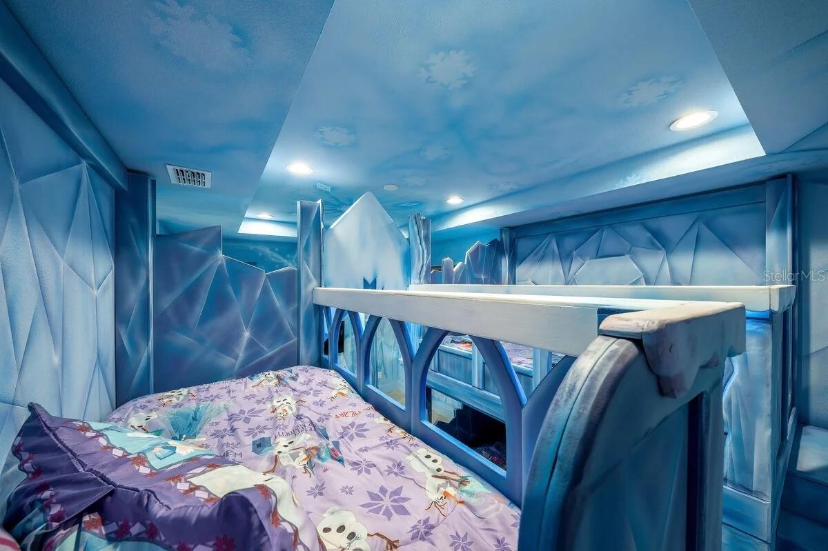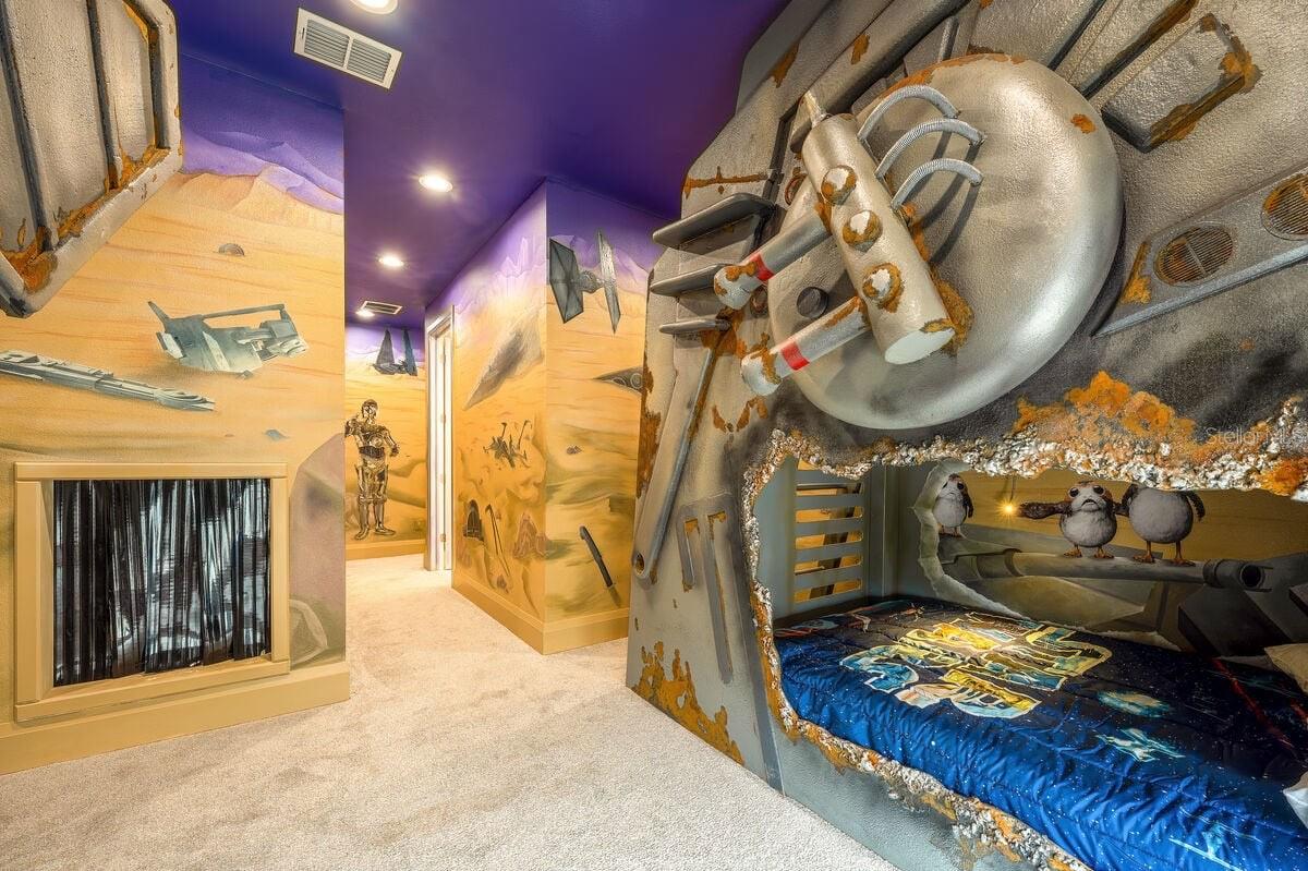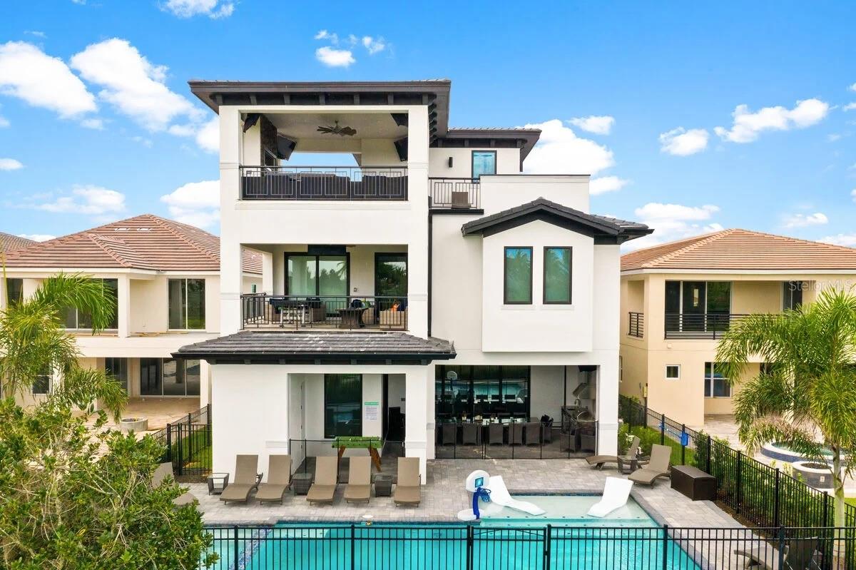 This Triple Deck delight is one of the very few true CUSTOM BUILT homes to grace one of Reunion's most sought after addresses- The Bear's Den. Enjoy one of the best outlooks in Reunion from the third-floor deck which can even provide a view to the DISNEY FIREWORKS! Each level of this home was built to ENTERTAIN. Its lofty privacy includes a hot tub, TV screens, and plenty of seating. Another highlight of this home is its game room on the 3rd-floor landing with Playstation 4, Xbox, Fast and Furious Superbikes Race, San Francisco Rush 2049 cat racing machines, and shuffleboard. The home theater has plenty of cushioned seating before a large projector screen. The first two floors contain 8 BEDROOMS that sleep up to 24 people! With an open planned floor plan, the living area is bright and spacious with a large wrap-around sofa before a large wall-mounted TV. The stunning kitchen with stainless steel appliances and granite countertops includes an over-sized double-sink kitchen island. The island counter wraps around a built-in seating area with cushioned benches around a kitchen table. Around the corner you'll find a fine dining table that seats 18 - you're entire party! This home includes two amazing THEMED BEDROOMS kids will love. Each room has two bunk beds (sleep 4) custom made to fit each theme. Whether kids love to zoom through faraway galaxies or live the life of a princess, they will be fully immersed. One upper bunk bed has a secret passage through a slide that takes kids to a secret playroom filled with soft foam blocks. Adults need not worry - alternative access is available! For playtime outdoors, there's a playground only a stonecast away, just behind the home. All of the other bedrooms are King-size with one exception: a room for two with separate Queen-sized beds. All of the rooms have their own TVs and there is an additional gathering room with a large comfy wrap-around sofa before a wall-mounted big-screen TV. The private pool has a spillover spa and the pool deck has plenty of sun loungers. A kids' safety fence is available. The lanai includes a summer kitchen with a BBQ grill. The patio dining table seat 16, and there are a few additional chairs scattered about. This home offers everyone in your family or group the comfort and entertainment that makes a stay in the Orlando area something to boast about. Reserve this beautiful property by booking it as early as possible and it can be part of your next vacation!