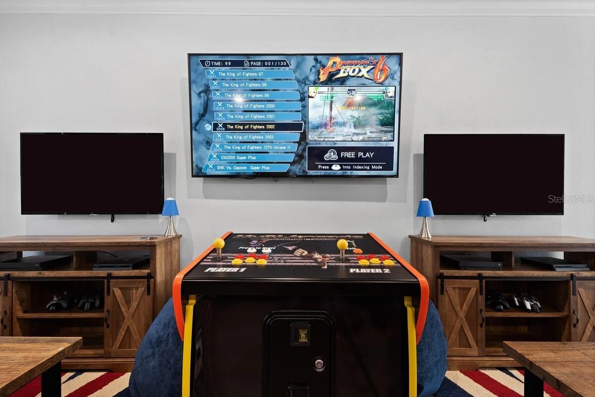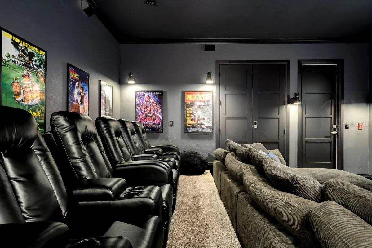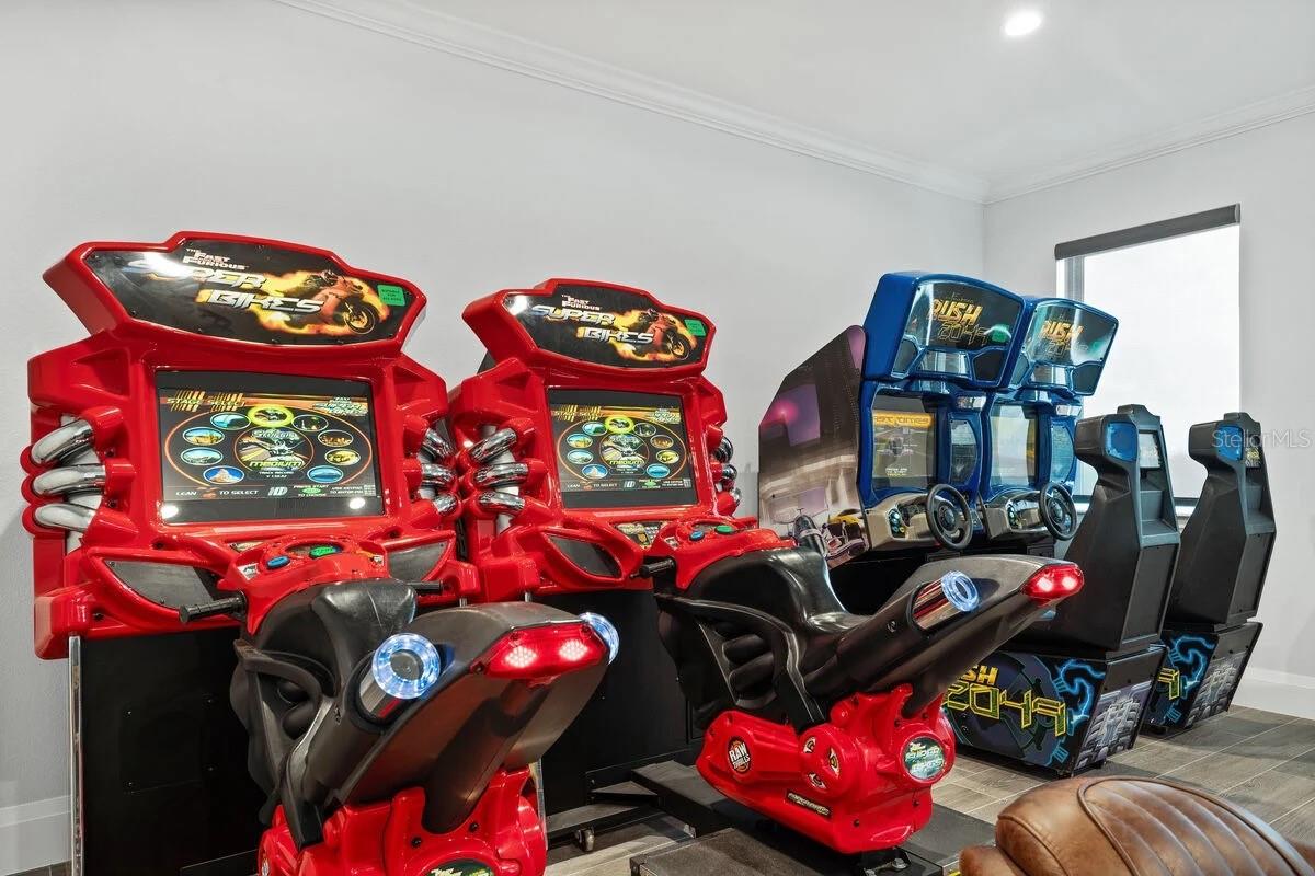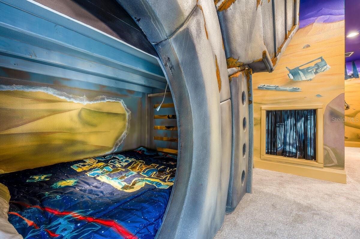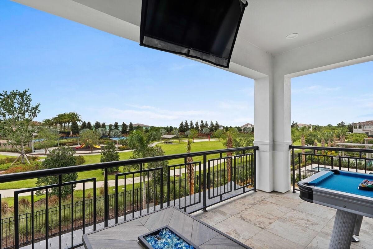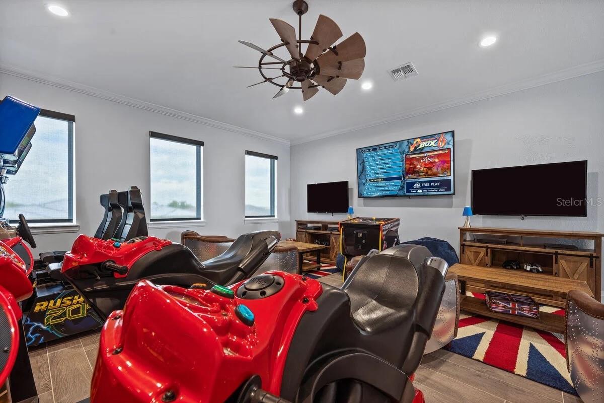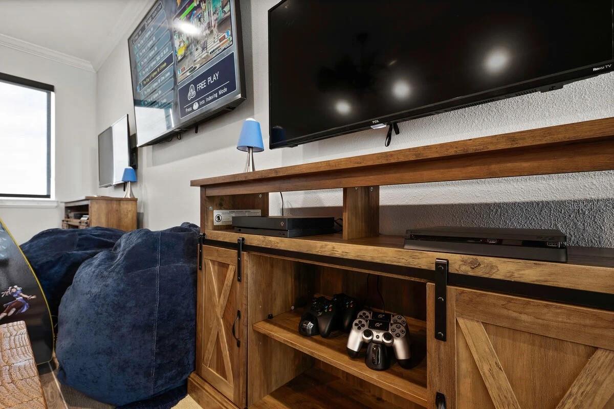 This Triple Deck delight is one of the very few true CUSTOM BUILT homes to grace one of Reunion's most sought after addresses- The Bear's Den. Enjoy one of the best outlooks in Reunion from the third-floor deck which can even provide a view to the DISNEY FIREWORKS! Each level of this home was built to ENTERTAIN. Its lofty privacy includes a hot tub, TV screens, and plenty of seating. Another highlight of this home is its game room on the 3rd-floor landing with Playstation 4, Xbox, Fast and Furious Superbikes Race, San Francisco Rush 2049 cat racing machines, and shuffleboard. The home theater has plenty of cushioned seating before a large projector screen. The first two floors contain 8 BEDROOMS that sleep up to 24 people! With an open planned floor plan, the living area is bright and spacious with a large wrap-around sofa before a large wall-mounted TV. The stunning kitchen with stainless steel appliances and granite countertops includes an over-sized double-sink kitchen island. The island counter wraps around a built-in seating area with cushioned benches around a kitchen table. Around the corner you'll find a fine dining table that seats 18 - you're entire party! This home includes two amazing THEMED BEDROOMS kids will love. Each room has two bunk beds (sleep 4) custom made to fit each theme. Whether kids love to zoom through faraway galaxies or live the life of a princess, they will be fully immersed. One upper bunk bed has a secret passage through a slide that takes kids to a secret playroom filled with soft foam blocks. Adults need not worry - alternative access is available! For playtime outdoors, there's a playground only a stonecast away, just behind the home. All of the other bedrooms are King-size with one exception: a room for two with separate Queen-sized beds. All of the rooms have their own TVs and there is an additional gathering room with a large comfy wrap-around sofa before a wall-mounted big-screen TV. The private pool has a spillover spa and the pool deck has plenty of sun loungers. A kids' safety fence is available. The lanai includes a summer kitchen with a BBQ grill. The patio dining table seat 16, and there are a few additional chairs scattered about. This home offers everyone in your family or group the comfort and entertainment that makes a stay in the Orlando area something to boast about. Reserve this beautiful property by booking it as early as possible and it can be part of your next vacation!