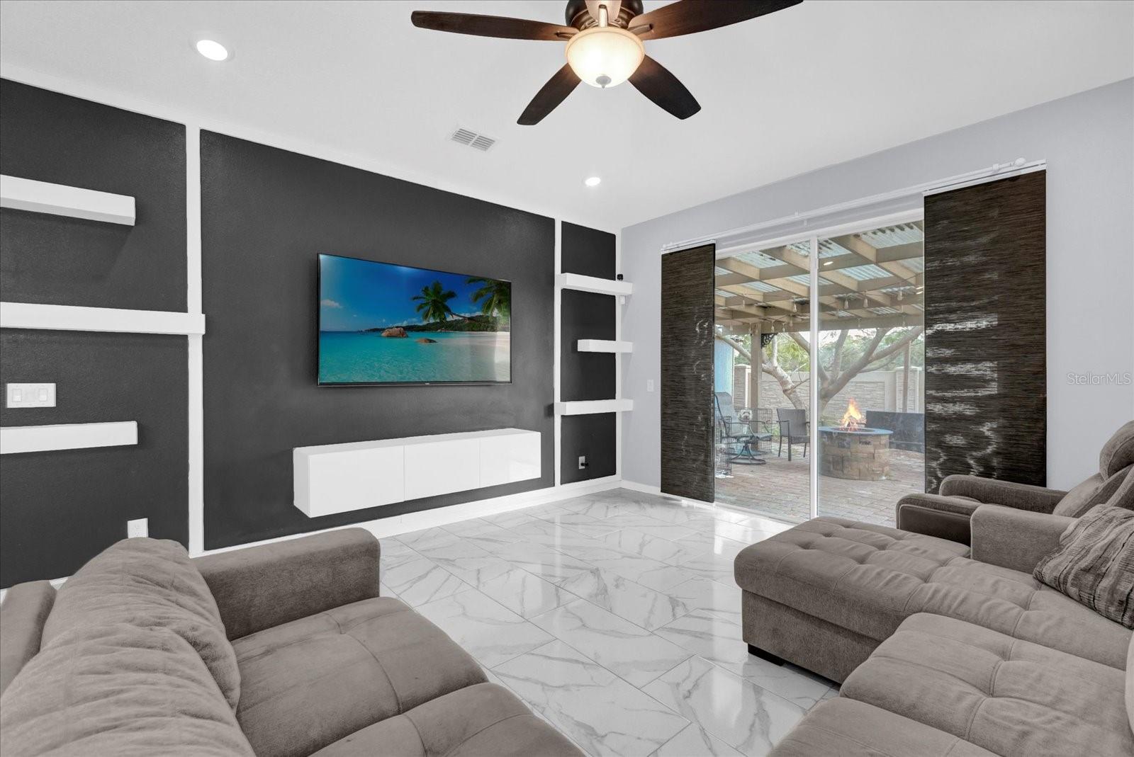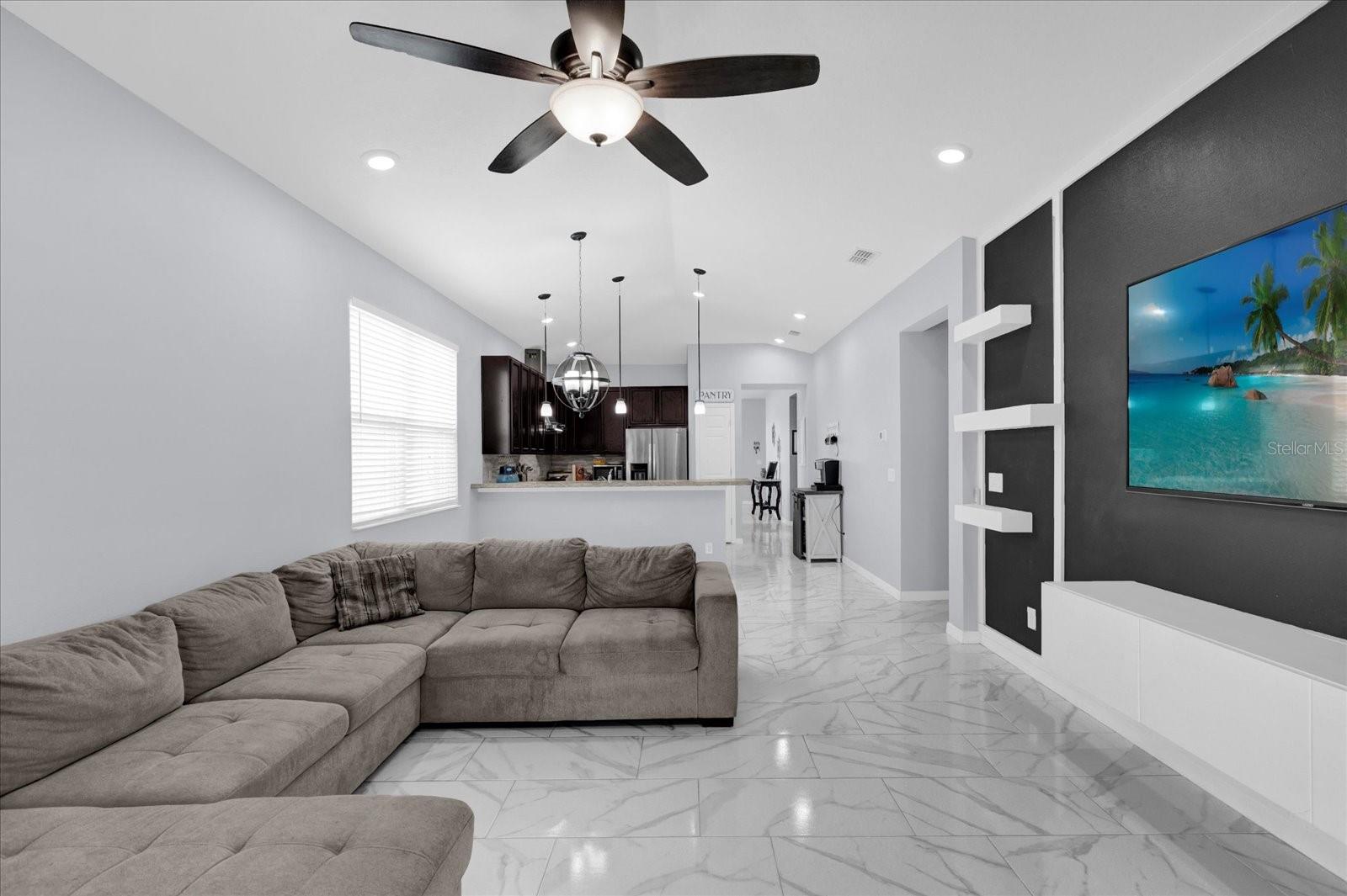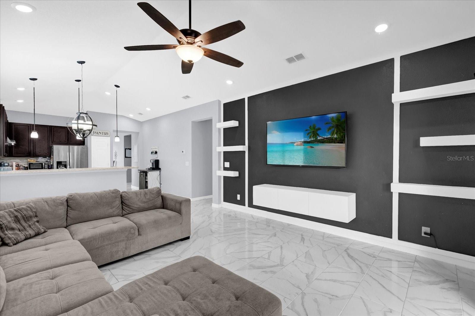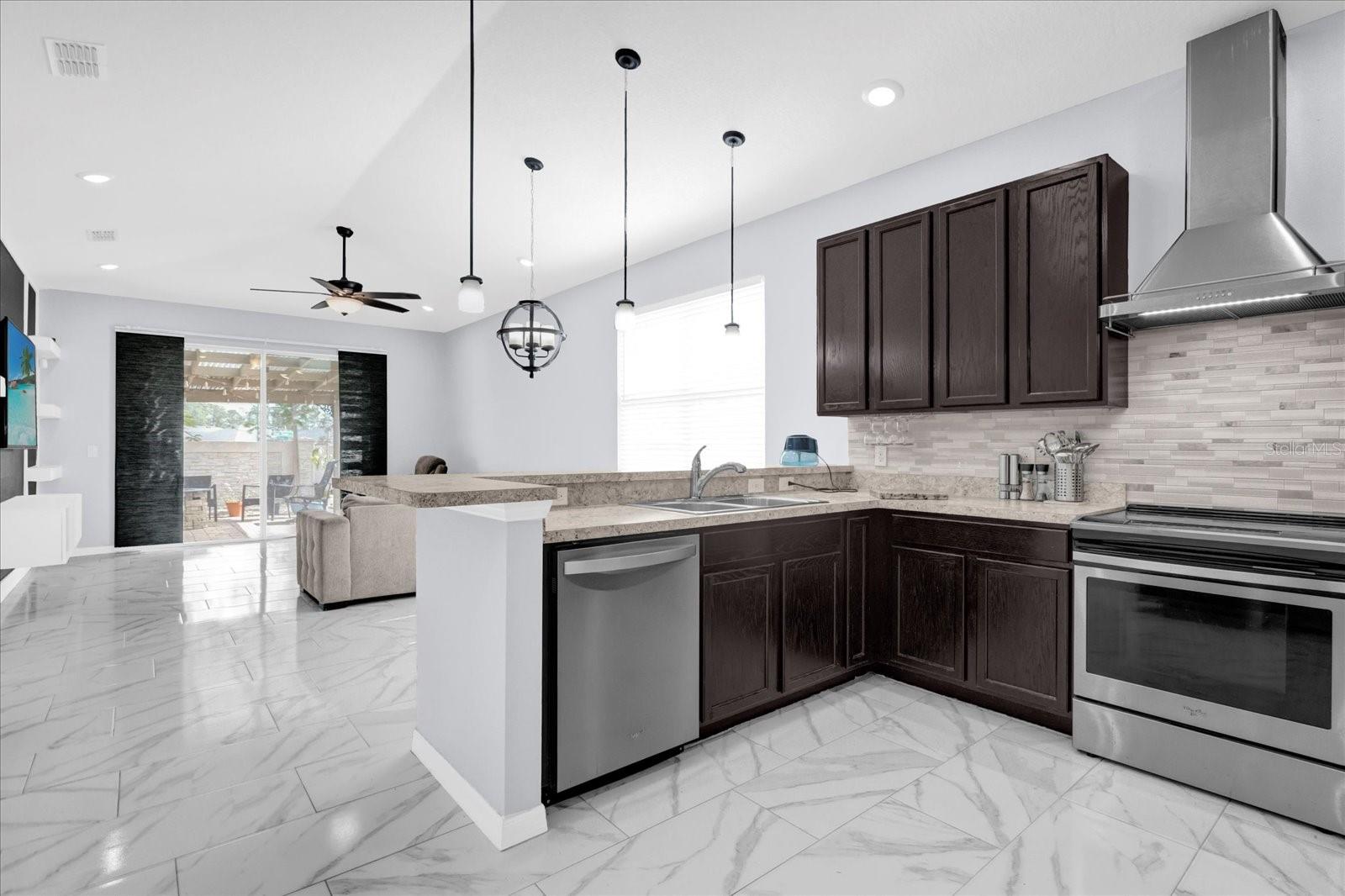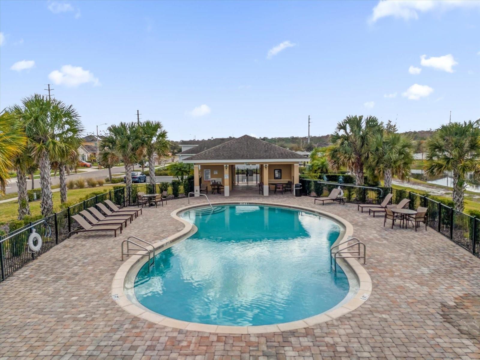 Enjoy this updated and move-in-ready 4-bedroom, 2-bathroom home spanning nearly 2,000 sq. ft. built in 2018 on a premium oversized lot with no rear neighbors. The exterior features a brick paver driveway, stone façade, and solar panels. Inside, the open living and dining area is finished with accent trim molding and marble-look tile throughout. The kitchen includes ample storage, stainless steel appliances, and an eat-in counter space. Custom builder upgrades include 9+ ft. ceilings, soundproof insulation, and LED recessed dimmable lighting. The great room features vaulted ceilings reaching nearly 11 ft. The primary suite offers an ensuite bath with dual sink vanities, a soaking tub, a stand-up shower, and a large walk-in closet. Three additional bedrooms share a full bath with a Bluetooth speaker vent and tub. The backyard is fully fenced for privacy and entertainment, featuring extended pavers, a covered pergola, and custom built-ins with a summer cooler. Enjoy it's prime location, Conveniently located minutes from Valencia College, AdventHealth, Publix, and nearby shopping. Schedule your showing today.
