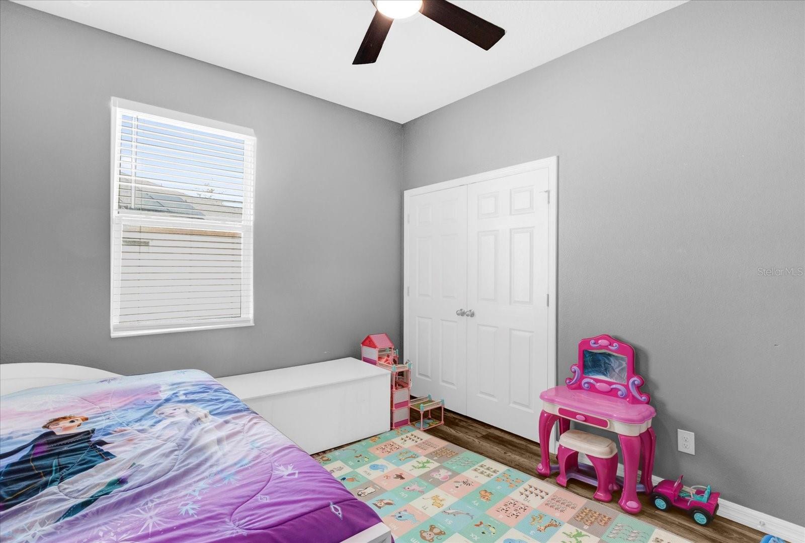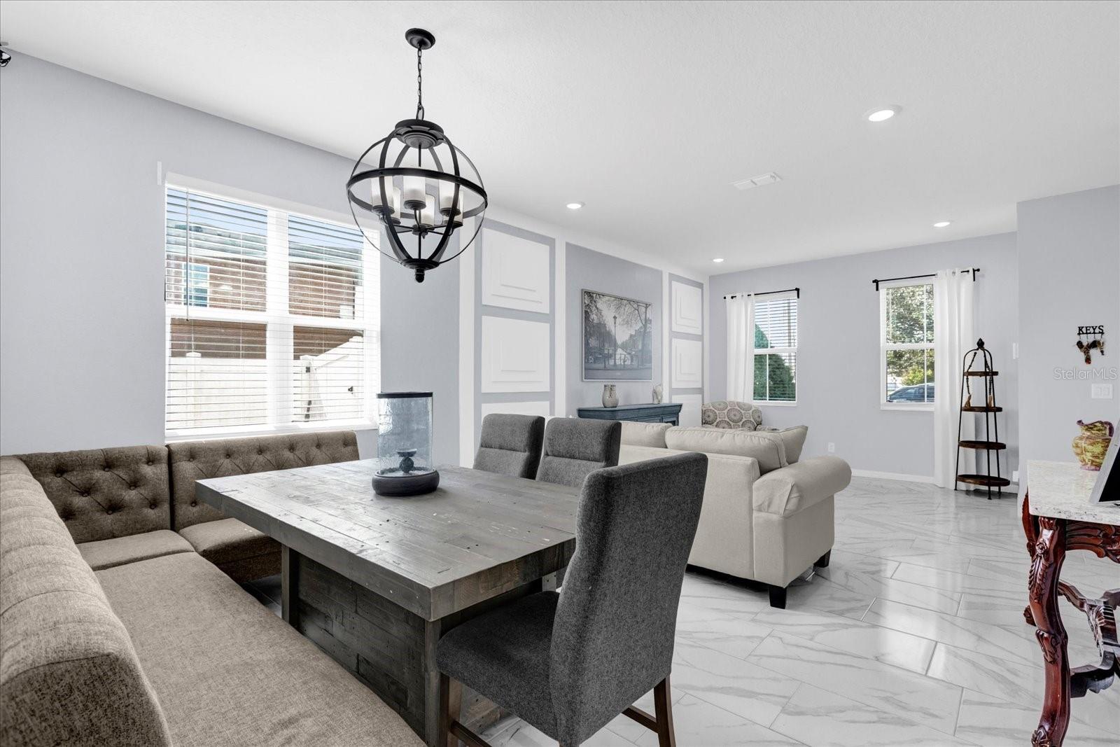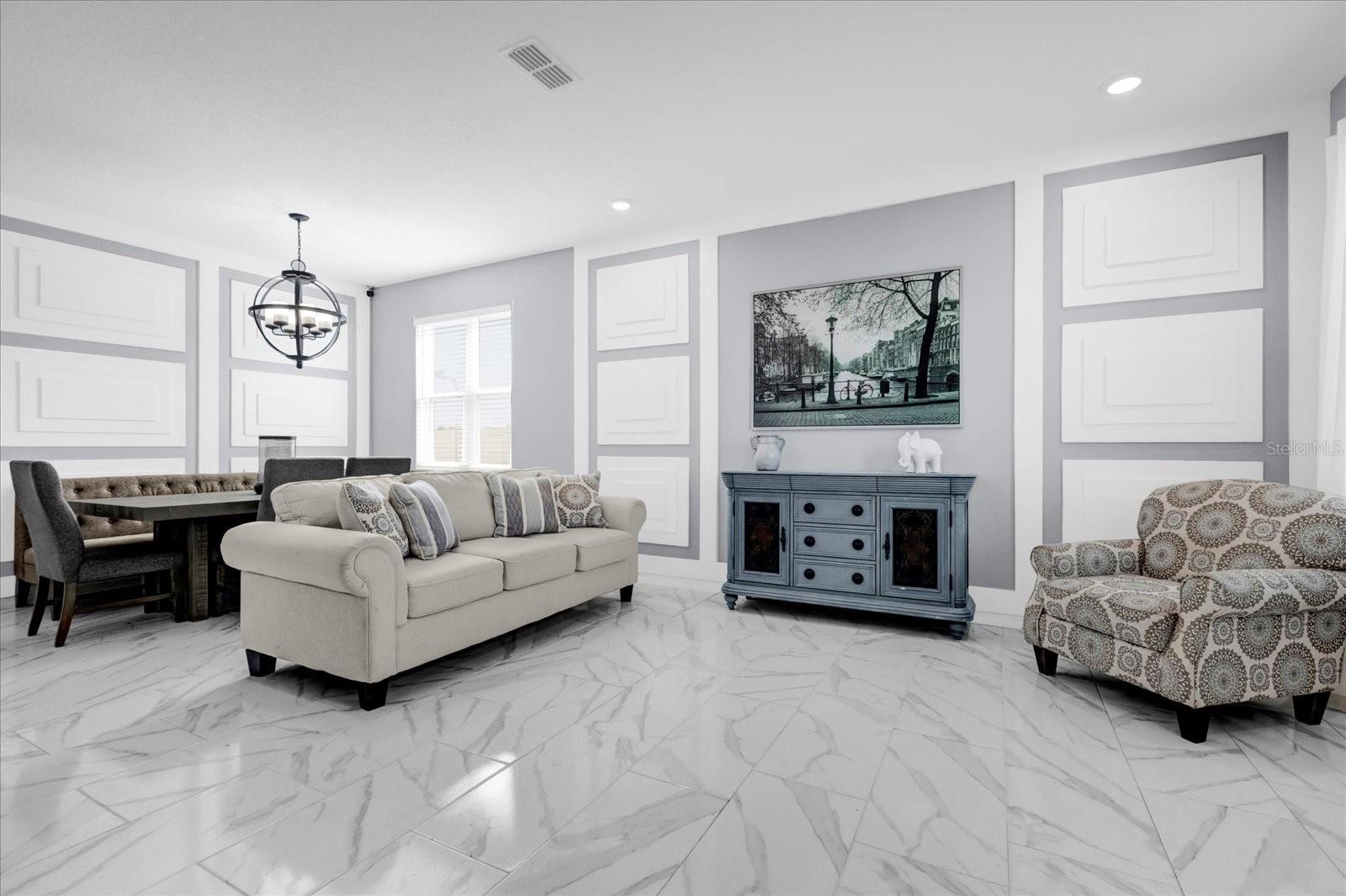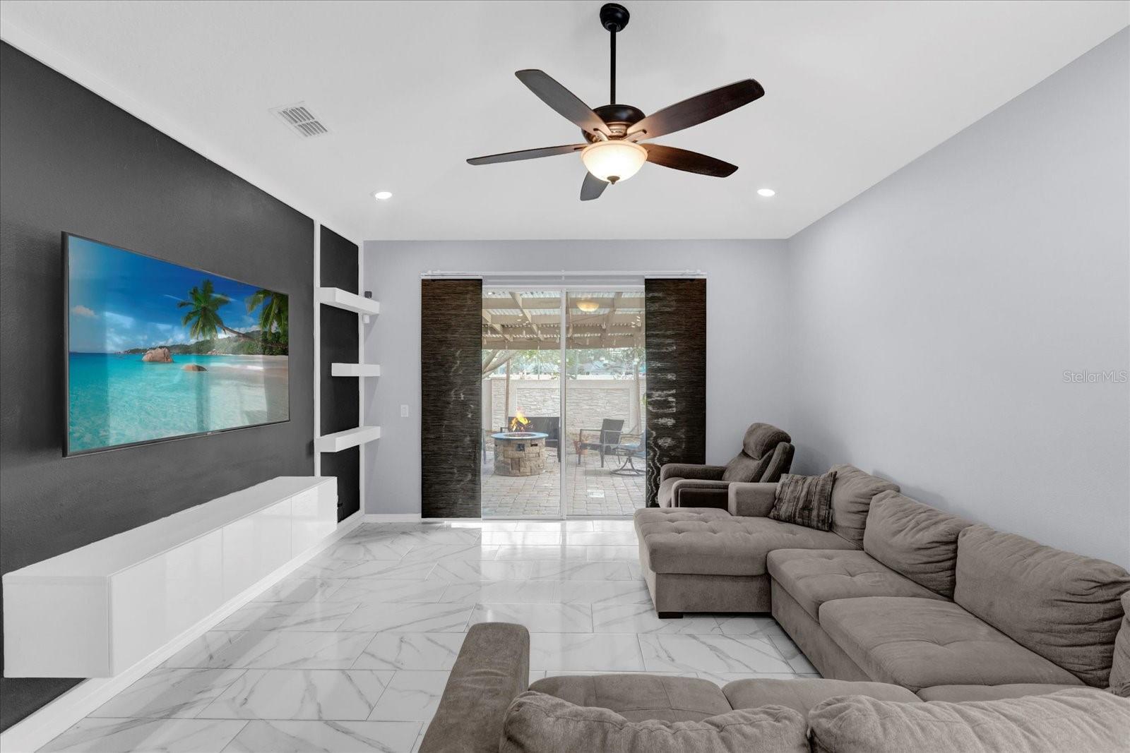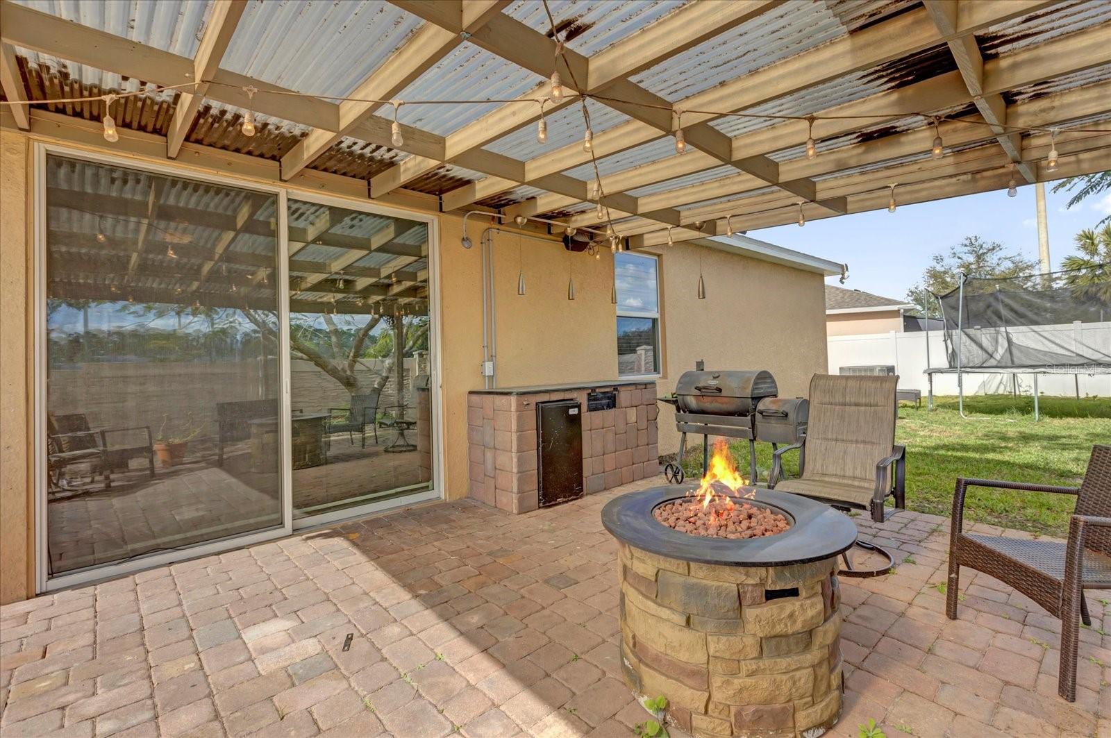 Enjoy this updated and move-in-ready 4-bedroom, 2-bathroom home spanning nearly 2,000 sq. ft. built in 2018 on a premium oversized lot with no rear neighbors. The exterior features a brick paver driveway, stone façade, and solar panels. Inside, the open living and dining area is finished with accent trim molding and marble-look tile throughout. The kitchen includes ample storage, stainless steel appliances, and an eat-in counter space. Custom builder upgrades include 9+ ft. ceilings, soundproof insulation, and LED recessed dimmable lighting. The great room features vaulted ceilings reaching nearly 11 ft. The primary suite offers an ensuite bath with dual sink vanities, a soaking tub, a stand-up shower, and a large walk-in closet. Three additional bedrooms share a full bath with a Bluetooth speaker vent and tub. The backyard is fully fenced for privacy and entertainment, featuring extended pavers, a covered pergola, and custom built-ins with a summer cooler. Enjoy it's prime location, Conveniently located minutes from Valencia College, AdventHealth, Publix, and nearby shopping. Schedule your showing today.