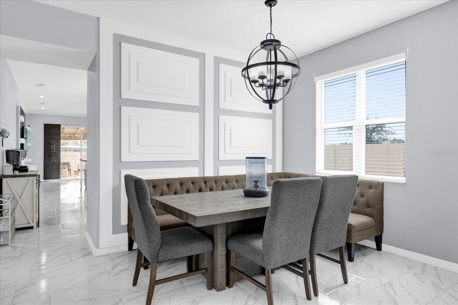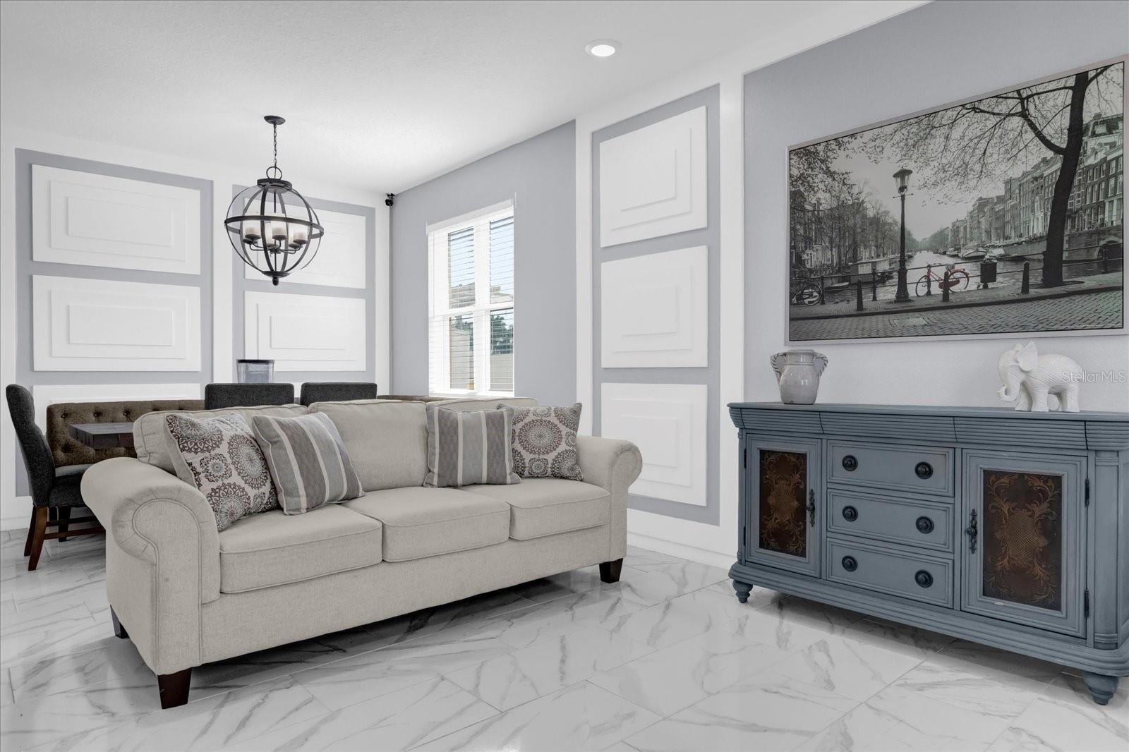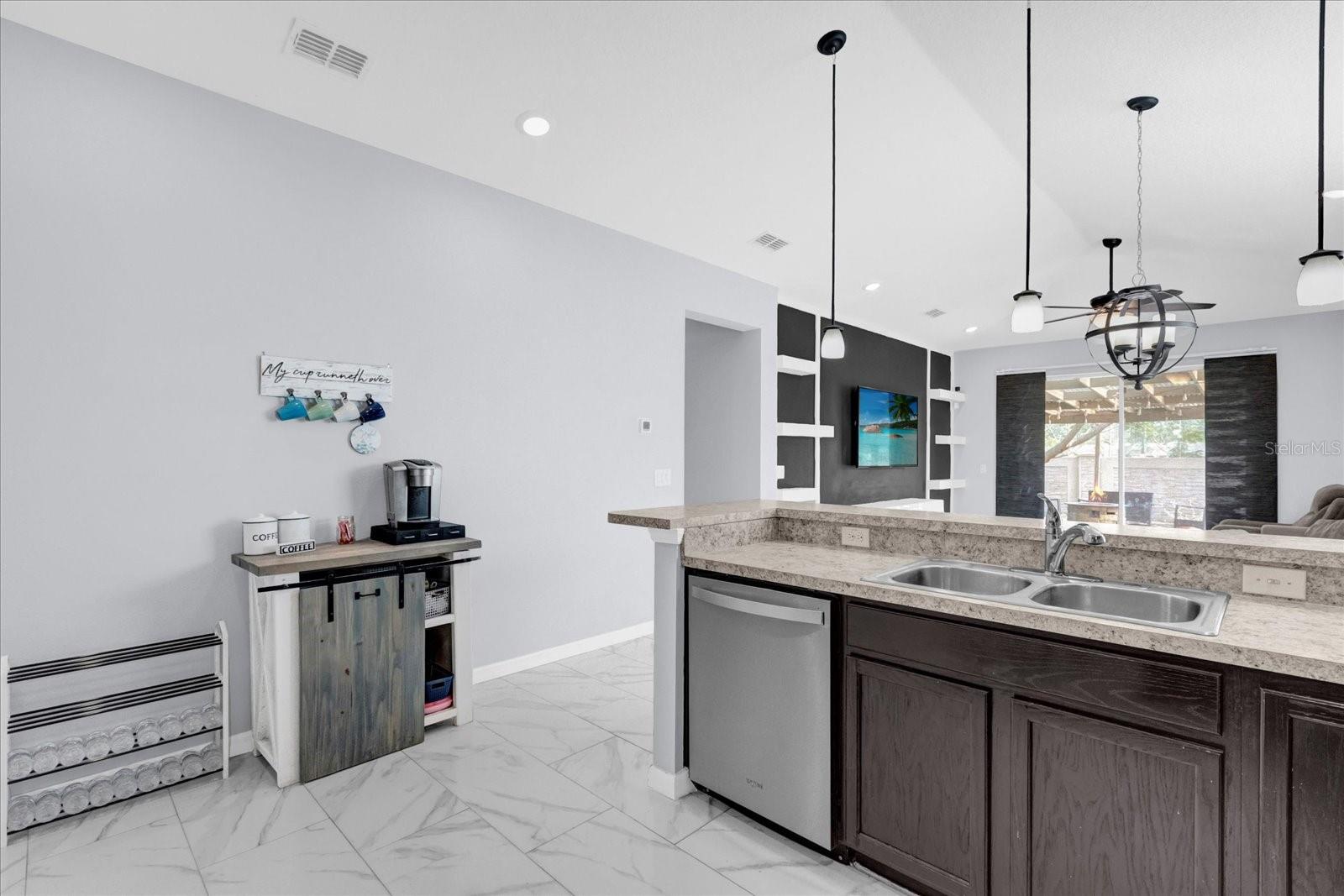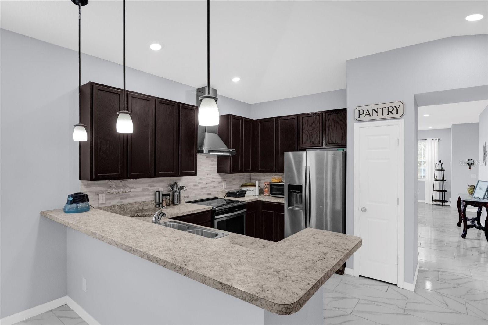 Enjoy this updated and move-in-ready 4-bedroom, 2-bathroom home spanning nearly 2,000 sq. ft. built in 2018 on a premium oversized lot with no rear neighbors. The exterior features a brick paver driveway, stone façade, and solar panels. Inside, the open living and dining area is finished with accent trim molding and marble-look tile throughout. The kitchen includes ample storage, stainless steel appliances, and an eat-in counter space. Custom builder upgrades include 9+ ft. ceilings, soundproof insulation, and LED recessed dimmable lighting. The great room features vaulted ceilings reaching nearly 11 ft. The primary suite offers an ensuite bath with dual sink vanities, a soaking tub, a stand-up shower, and a large walk-in closet. Three additional bedrooms share a full bath with a Bluetooth speaker vent and tub. The backyard is fully fenced for privacy and entertainment, featuring extended pavers, a covered pergola, and custom built-ins with a summer cooler. Enjoy it's prime location, Conveniently located minutes from Valencia College, AdventHealth, Publix, and nearby shopping. Schedule your showing today.