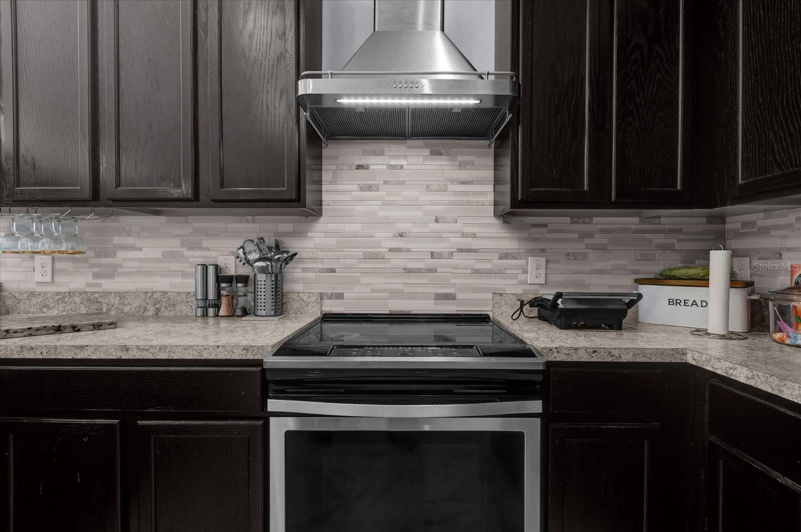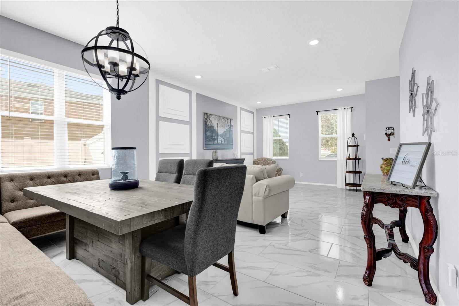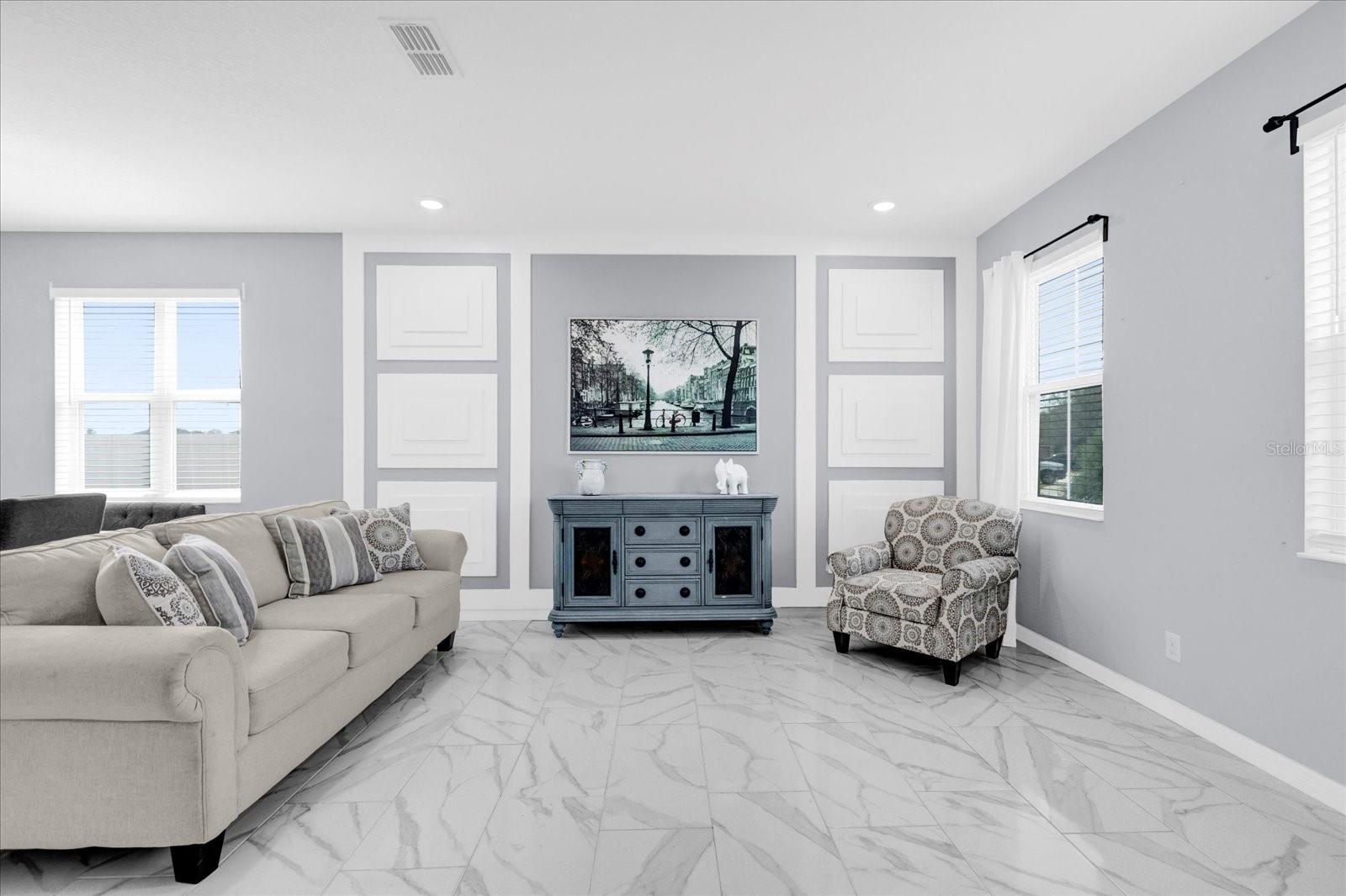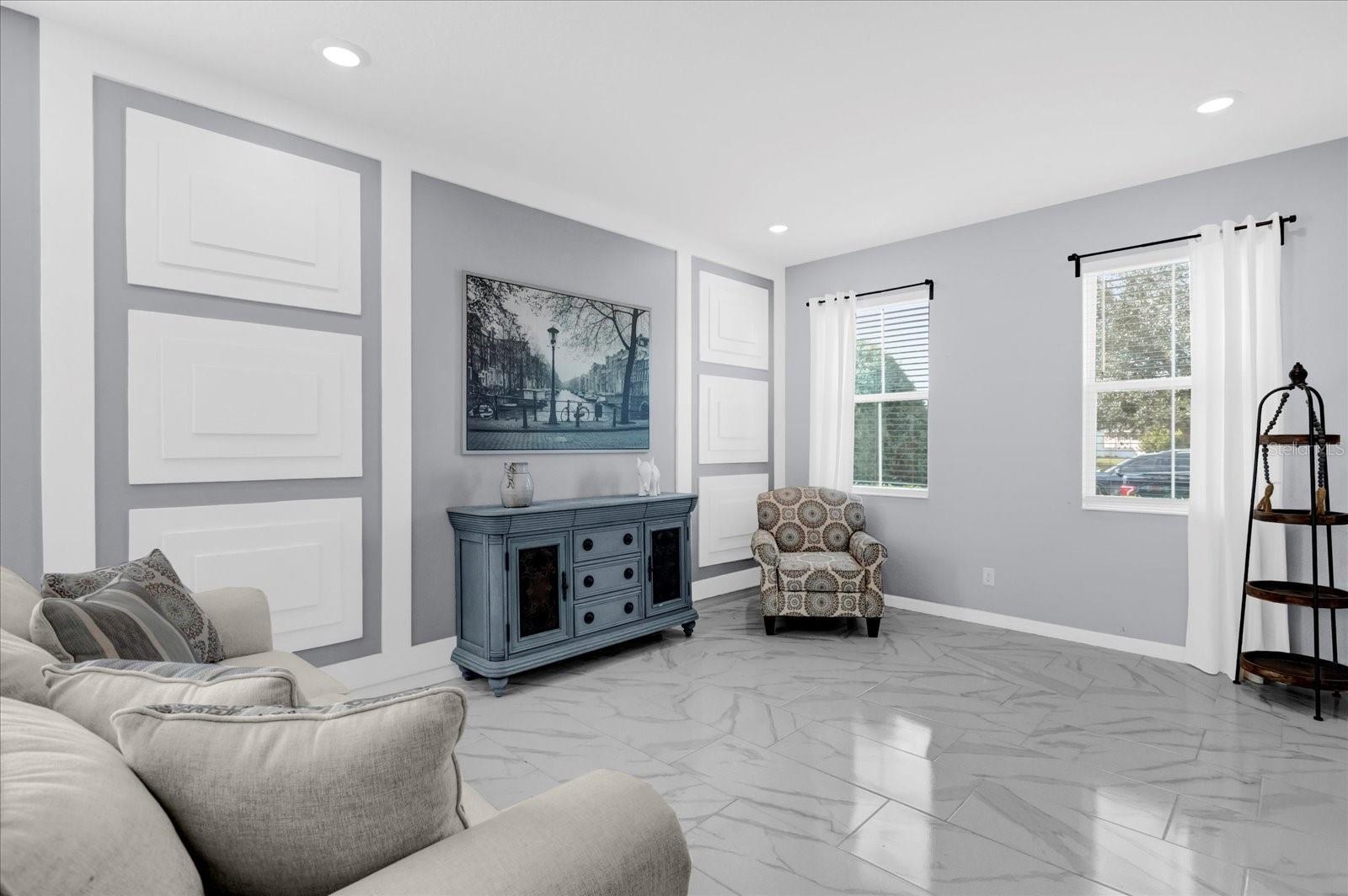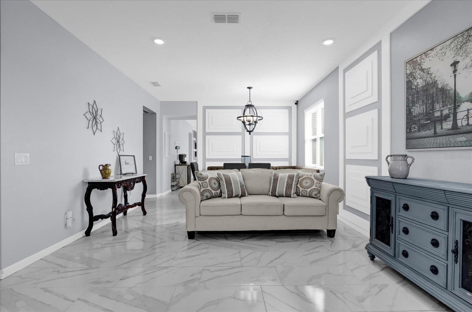Enjoy this updated and move-in-ready 4-bedroom, 2-bathroom home spanning nearly 2,000 sq. ft. built in 2018 on a premium oversized lot with no rear neighbors. The exterior features a brick paver driveway, stone façade, and solar panels. Inside, the open living and dining area is finished with accent trim molding and marble-look tile throughout. The kitchen includes ample storage, stainless steel appliances, and an eat-in counter space. Custom builder upgrades include 9+ ft. ceilings, soundproof insulation, and LED recessed dimmable lighting. The great room features vaulted ceilings reaching nearly 11 ft. The primary suite offers an ensuite bath with dual sink vanities, a soaking tub, a stand-up shower, and a large walk-in closet. Three additional bedrooms share a full bath with a Bluetooth speaker vent and tub. The backyard is fully fenced for privacy and entertainment, featuring extended pavers, a covered pergola, and custom built-ins with a summer cooler. Enjoy it's prime location, Conveniently located minutes from Valencia College, AdventHealth, Publix, and nearby shopping. Schedule your showing today.