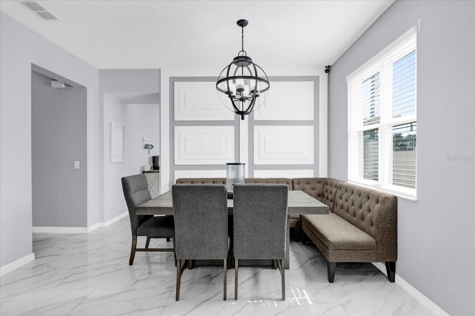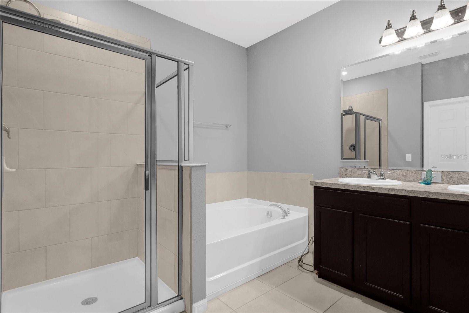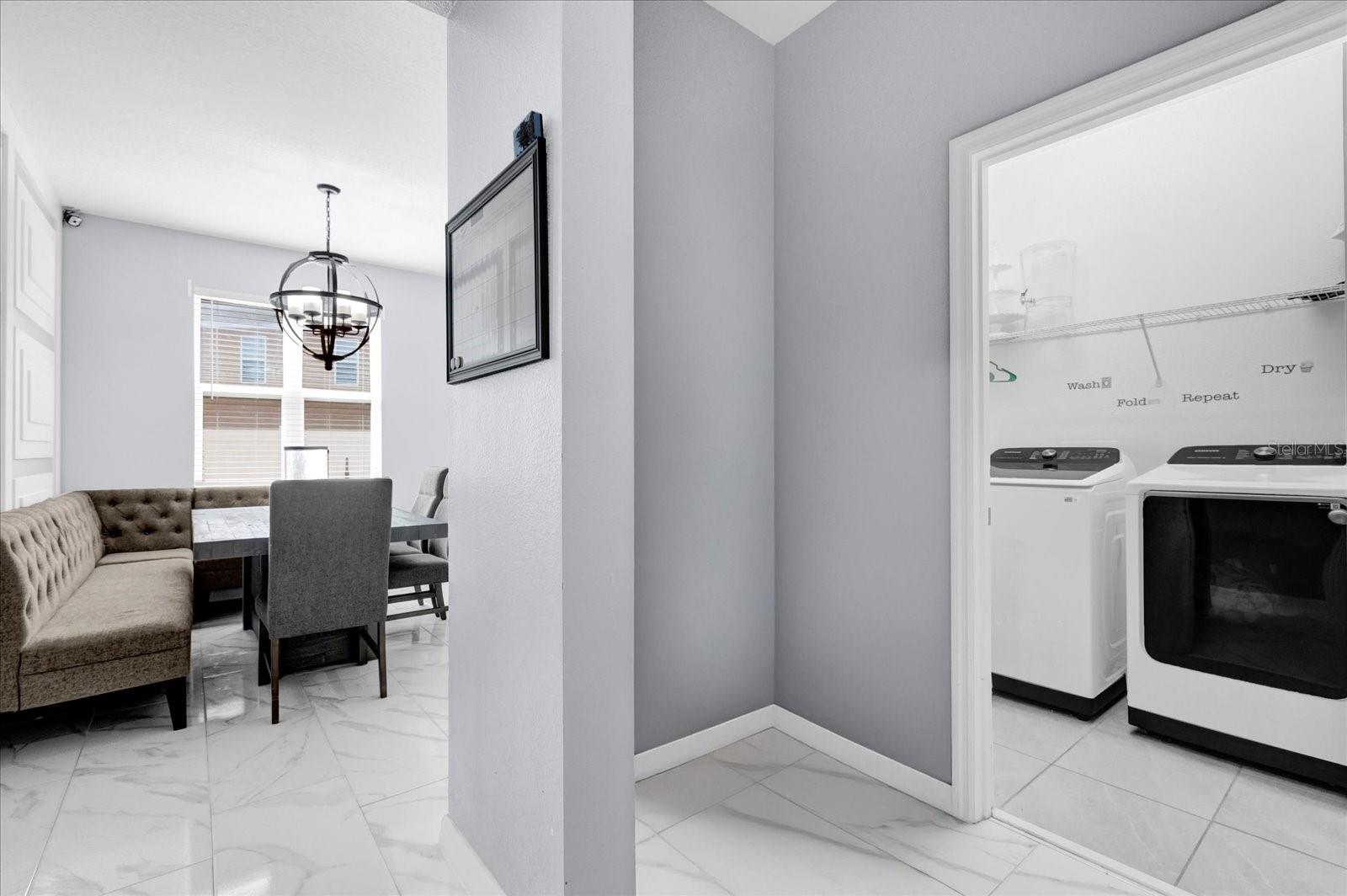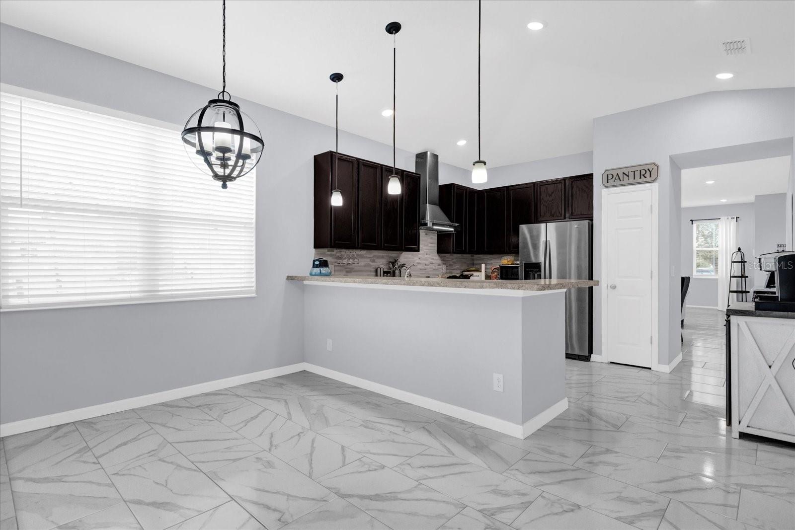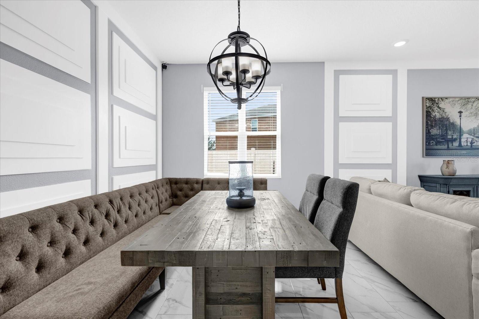 Enjoy this updated and move-in-ready 4-bedroom, 2-bathroom home spanning nearly 2,000 sq. ft. built in 2018 on a premium oversized lot with no rear neighbors. The exterior features a brick paver driveway, stone façade, and solar panels. Inside, the open living and dining area is finished with accent trim molding and marble-look tile throughout. The kitchen includes ample storage, stainless steel appliances, and an eat-in counter space. Custom builder upgrades include 9+ ft. ceilings, soundproof insulation, and LED recessed dimmable lighting. The great room features vaulted ceilings reaching nearly 11 ft. The primary suite offers an ensuite bath with dual sink vanities, a soaking tub, a stand-up shower, and a large walk-in closet. Three additional bedrooms share a full bath with a Bluetooth speaker vent and tub. The backyard is fully fenced for privacy and entertainment, featuring extended pavers, a covered pergola, and custom built-ins with a summer cooler. Enjoy it's prime location, Conveniently located minutes from Valencia College, AdventHealth, Publix, and nearby shopping. Schedule your showing today.