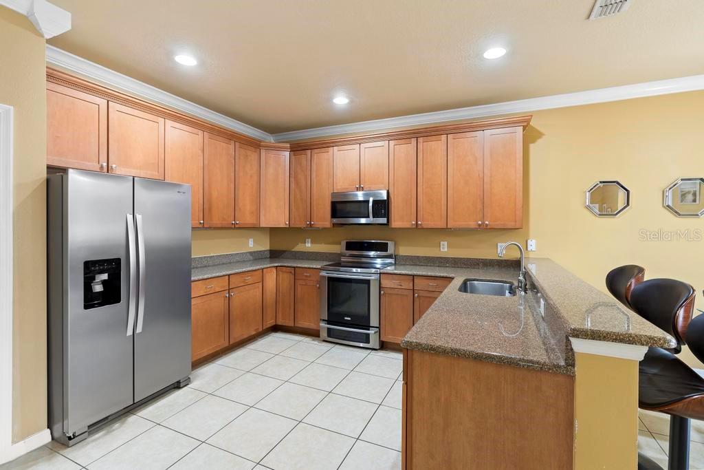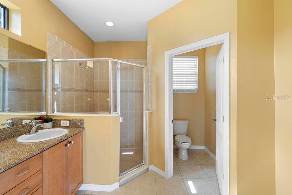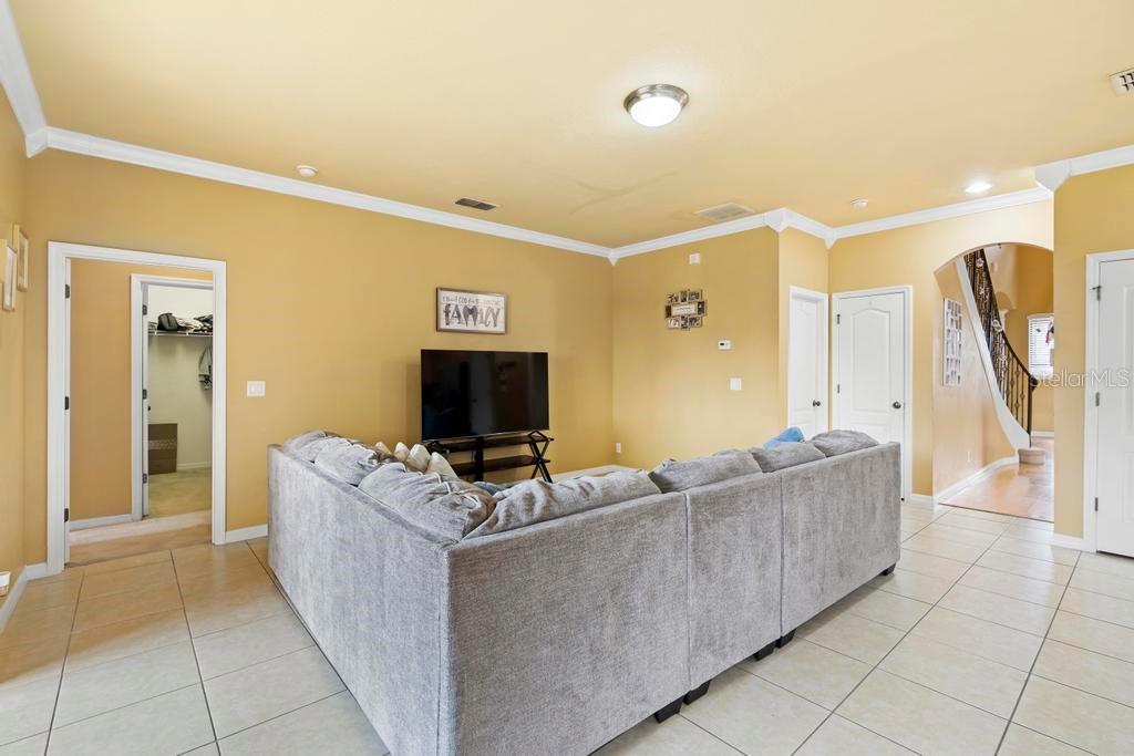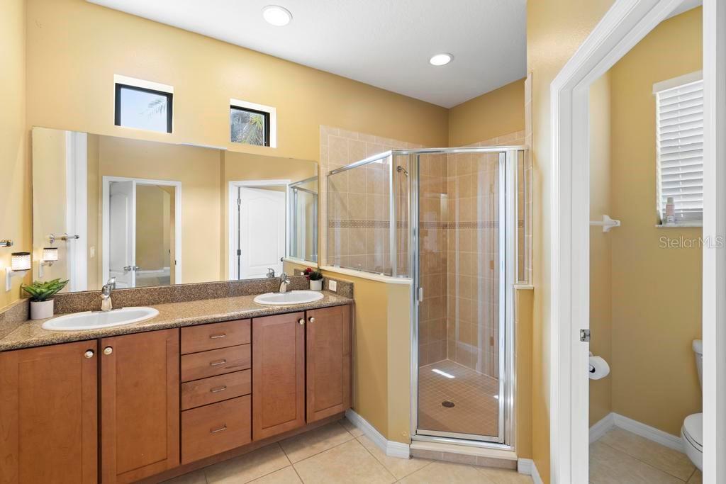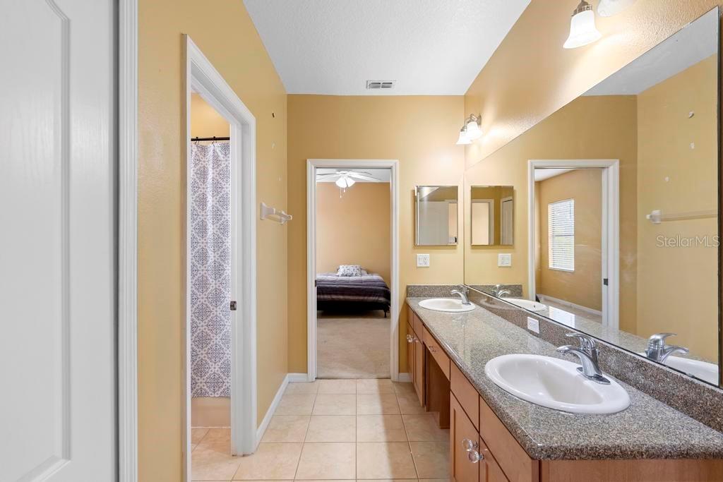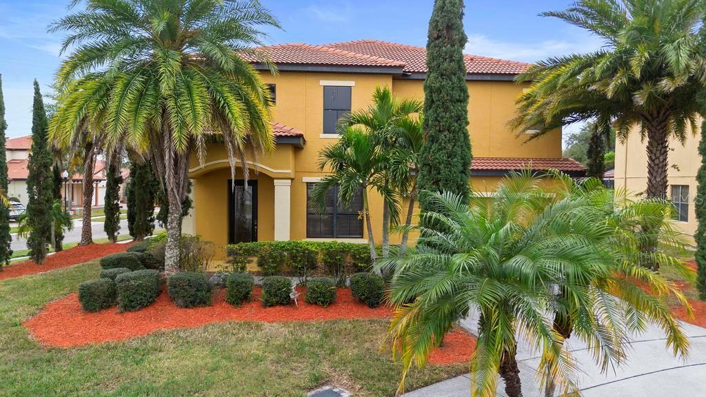 One or more photo(s) has been virtually staged. Welcome to this stunning & spacious 5 Bed, 3 Bath home with unique & highly sought-after double primary bedroom suites! The immaculate landscaping greets you as you make your way to the covered front entry with a decorative glass front door. Step inside the grand entry of this over 3,000 square foot home & you'll be greeted with high ceilings, a grand staircase, chandelier, gorgeous columns and plenty of natural light. The foyer opens up to the formal living room area and formal dining room combo with crown moulding. At the heart of the home is the welcoming family room flooded with natural light through large picturesque windows & seamlessly connected to the open kitchen. The chef-inspired kitchen is designed to impress with granite countertops, sleek stainless steel appliances, ample cabinetry with crown moulding, and a long breakfast bar overlooking the dinette area. The first-floor primary suite is a luxurious retreat with a walk-in closet and an en-suite bath through an arched doorway featuring a garden tub, a step-in glass shower, and dual sinks. Completing the downstairs is a laundry room with full washer & dryer hookup & built-in shelving connected to the spacious 2-car attached garage equipped with additional storage. At the top of the grand wrought iron staircase, you'll have an overlooking view of below from the upstairs living area making a perfect flexible space for relaxing or entertaining. The upstairs primary bedroom suite offers plenty of space as well along with an en-suite bathroom with a large, step-in glass shower, water closet & dual sinks. Two additional bedrooms are versatile and spacious and share a Jack-n-Jill full bathroom with dual sinks & full shower bath duo ideal for use as rooms for the family, guest rooms, or home offices. Downstairs, the large sliding glass doors in the main living area open up to the large covered and screen-enclosed lanai, perfect for outdoor dining or simply relaxing. Nestled on a corner lot in a peaceful, family-friendly neighborhood this home is unique & Highly Desirable! The Villa Sol community offers amenities such as private tennis courts, a glamorous, sparkling community pool, as well as a fitness center, park, and playground. Located just minutes away from top-rated schools, major shopping centers, local dining, and major roads such as US-192 and Florida's Turnpike, this property offers the best of both worlds: a serene suburban setting while still being close to all of the desired destinations in Kissimmee and Orlando. Don’t wait - Schedule a showing today! This property currently leases until 7/31/2025 at $2,800/mo.