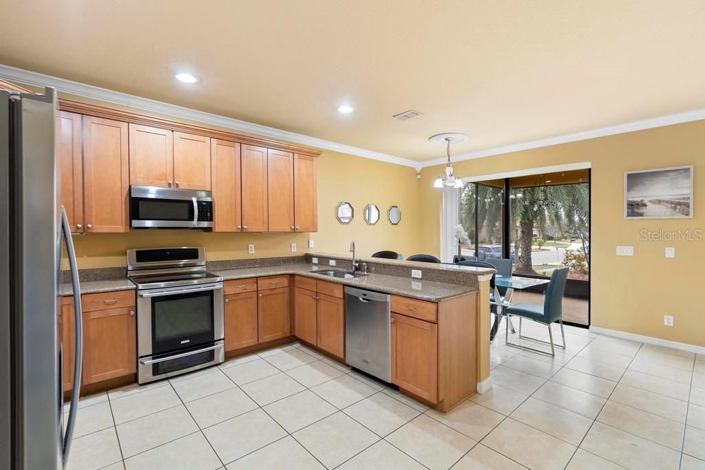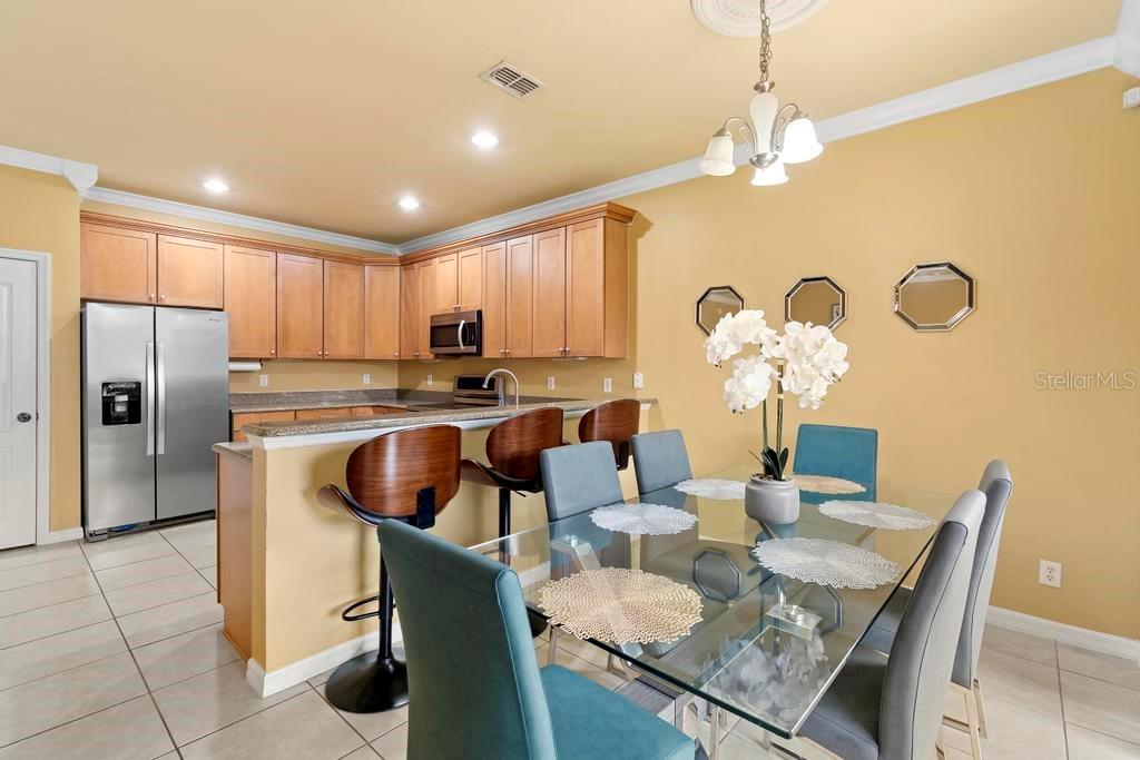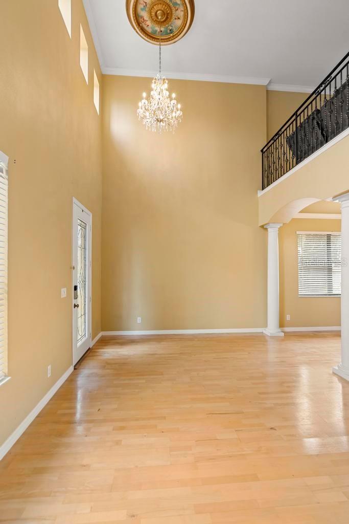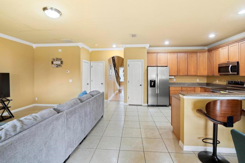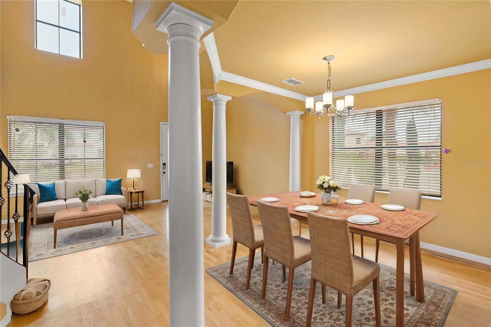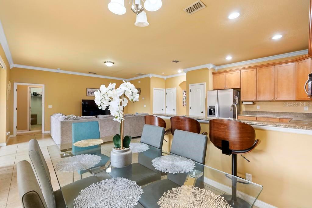 One or more photo(s) has been virtually staged. Welcome to this stunning & spacious 5 Bed, 3 Bath home with unique & highly sought-after double primary bedroom suites! The immaculate landscaping greets you as you make your way to the covered front entry with a decorative glass front door. Step inside the grand entry of this over 3,000 square foot home & you'll be greeted with high ceilings, a grand staircase, chandelier, gorgeous columns and plenty of natural light. The foyer opens up to the formal living room area and formal dining room combo with crown moulding. At the heart of the home is the welcoming family room flooded with natural light through large picturesque windows & seamlessly connected to the open kitchen. The chef-inspired kitchen is designed to impress with granite countertops, sleek stainless steel appliances, ample cabinetry with crown moulding, and a long breakfast bar overlooking the dinette area. The first-floor primary suite is a luxurious retreat with a walk-in closet and an en-suite bath through an arched doorway featuring a garden tub, a step-in glass shower, and dual sinks. Completing the downstairs is a laundry room with full washer & dryer hookup & built-in shelving connected to the spacious 2-car attached garage equipped with additional storage. At the top of the grand wrought iron staircase, you'll have an overlooking view of below from the upstairs living area making a perfect flexible space for relaxing or entertaining. The upstairs primary bedroom suite offers plenty of space as well along with an en-suite bathroom with a large, step-in glass shower, water closet & dual sinks. Two additional bedrooms are versatile and spacious and share a Jack-n-Jill full bathroom with dual sinks & full shower bath duo ideal for use as rooms for the family, guest rooms, or home offices. Downstairs, the large sliding glass doors in the main living area open up to the large covered and screen-enclosed lanai, perfect for outdoor dining or simply relaxing. Nestled on a corner lot in a peaceful, family-friendly neighborhood this home is unique & Highly Desirable! The Villa Sol community offers amenities such as private tennis courts, a glamorous, sparkling community pool, as well as a fitness center, park, and playground. Located just minutes away from top-rated schools, major shopping centers, local dining, and major roads such as US-192 and Florida's Turnpike, this property offers the best of both worlds: a serene suburban setting while still being close to all of the desired destinations in Kissimmee and Orlando. Don’t wait - Schedule a showing today! This property currently leases until 7/31/2025 at $2,800/mo.