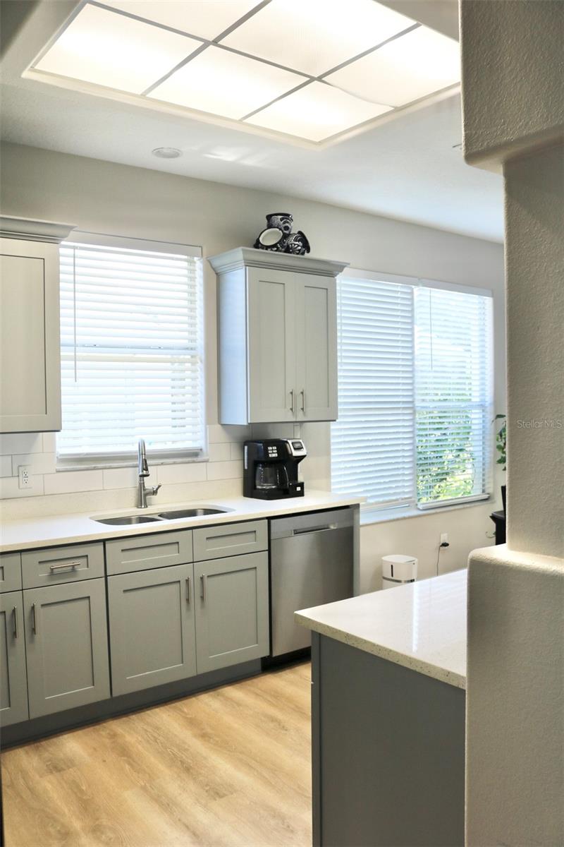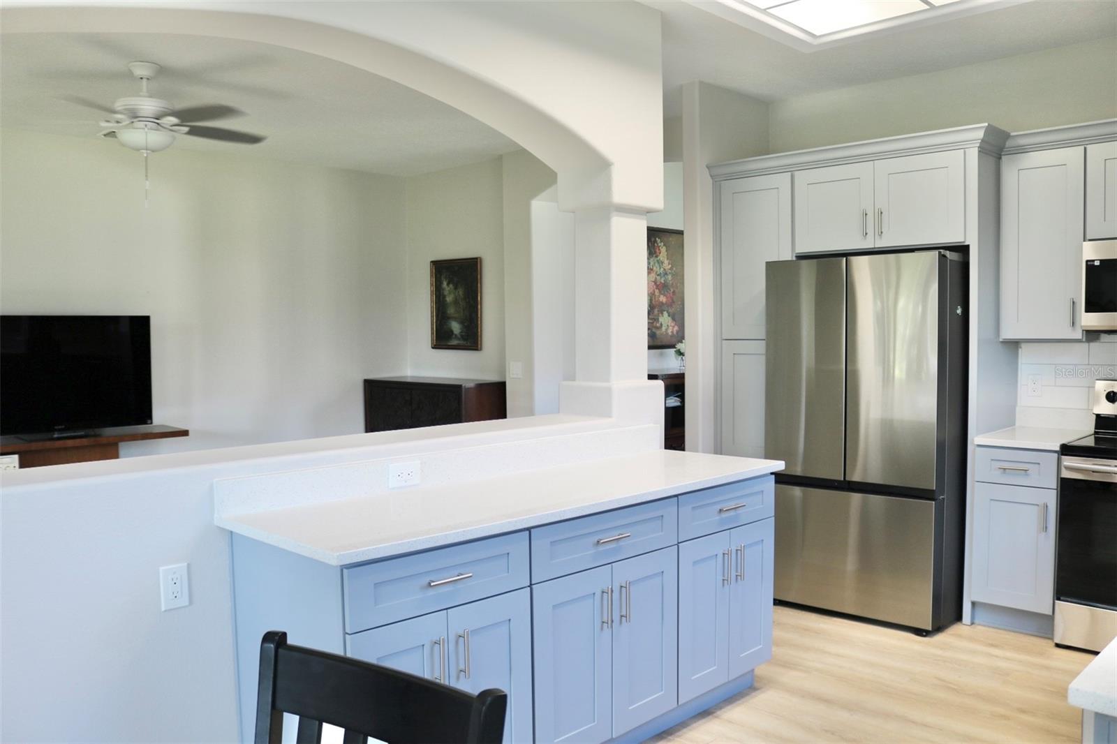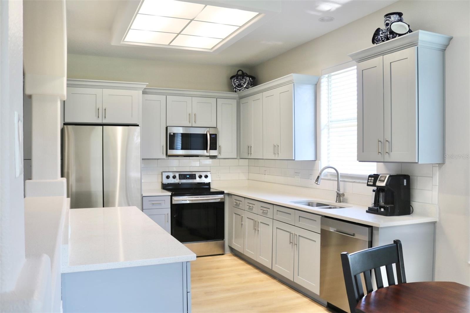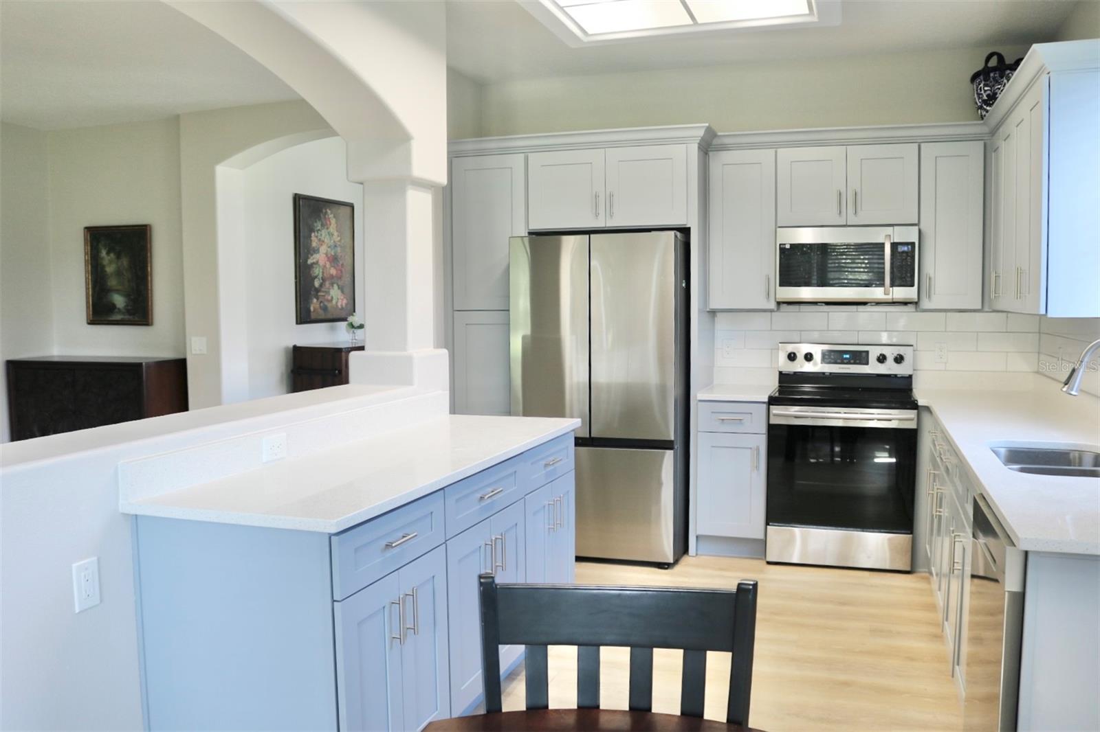 PRICE REDUCED, MOTIVATED SELLERS! HOME WARRANTY INCLUDED Nestled in the desirable and established community of The Oaks in Kissimmee, this beautifully maintained 4-bedroom, 3-bathroom single-family home offers both style and functionality. With 2-car garage and a freshly painted interior, this one-story home is move-in ready. A standout feature of the property is its paid-in-full photovoltaic solar panels, which means no monthly fees and very low (if any) electric bills. The tastefully remodeled kitchen boasts brand new pale gray cabinetry with self-closing doors and drawers, stunning quartz countertops, sleek tile, and stainless steel appliances, including a French door refrigerator. Throughout the home, you’ll find fresh vinyl plank flooring in all 4 bedrooms, the kitchen, laundry room, and family room, as well as new blinds. Enjoy spacious living areas, including a combined living/dining room and a cozy family room that opens to a breakfast bar and nook. Step outside to your screened-in patio, where you can relax while overlooking the 13th green. Whether you’re sipping your morning coffee or hosting family barbecues in the evening, this is the perfect spot to unwind. The primary suite, with views of the golf course, features a large walk-in closet, a secondary wall closet, double vanities, a garden tub, and a renovated shower. Designed with a split floor plan, this home offers three additional bedrooms and two more bathrooms, one of which includes backlit mirrors for a modern touch. A separate laundry room with a new washer and dryer rounds out the home's many conveniences. With a roof installed in June 2021, this home is truly a gem—don’t miss out on the chance to make it yours!