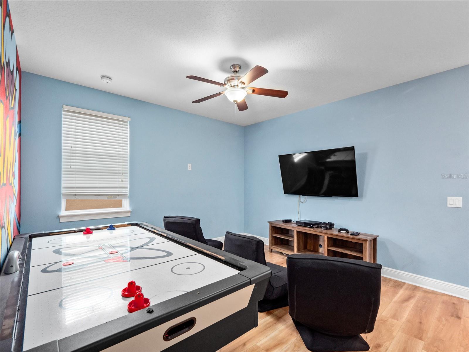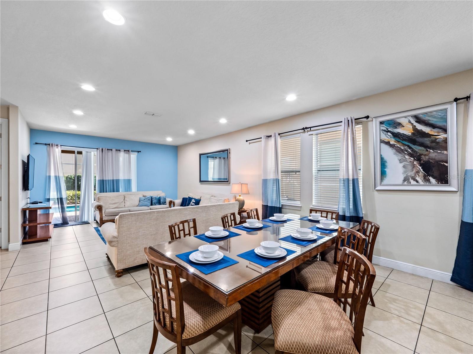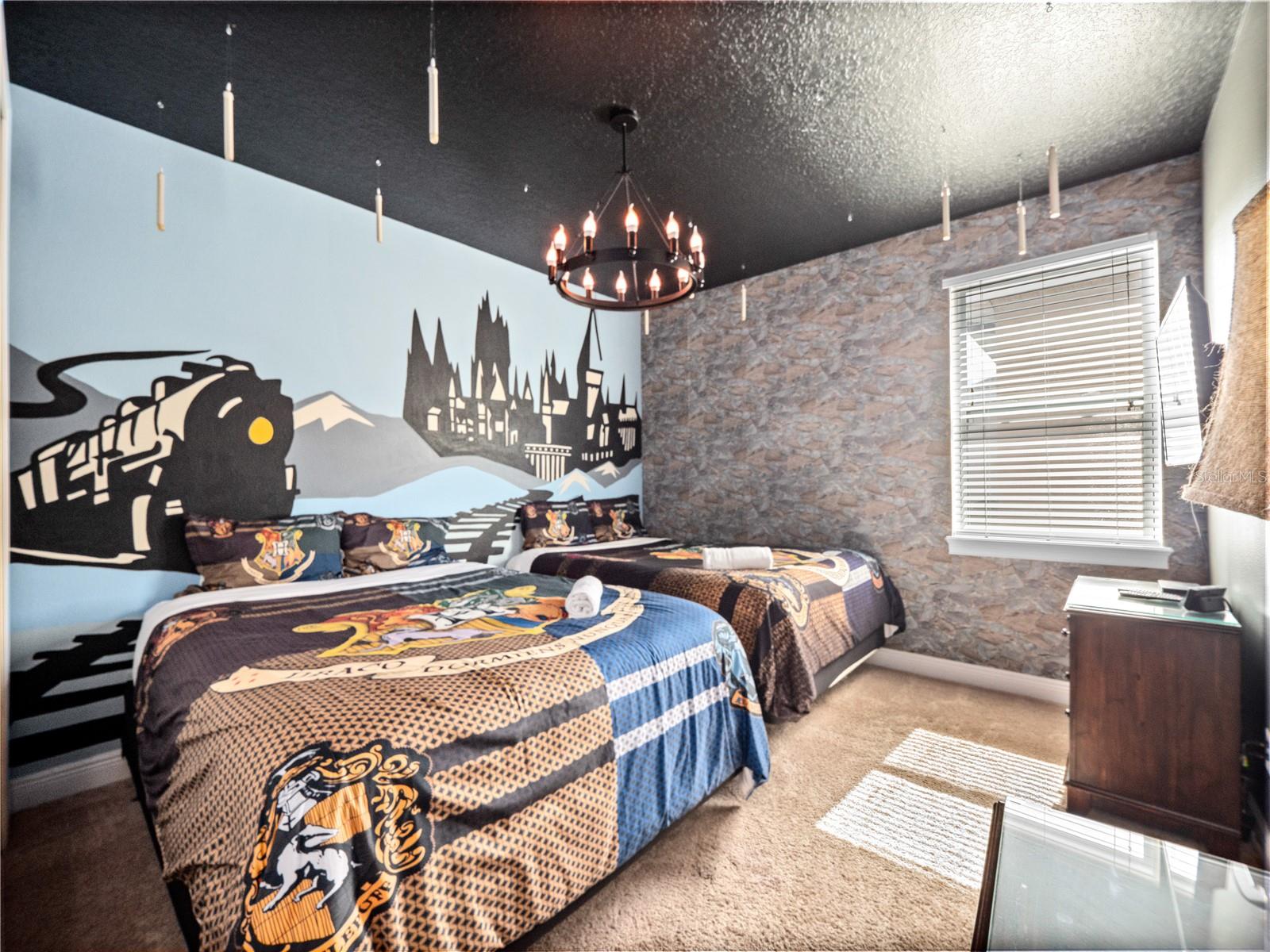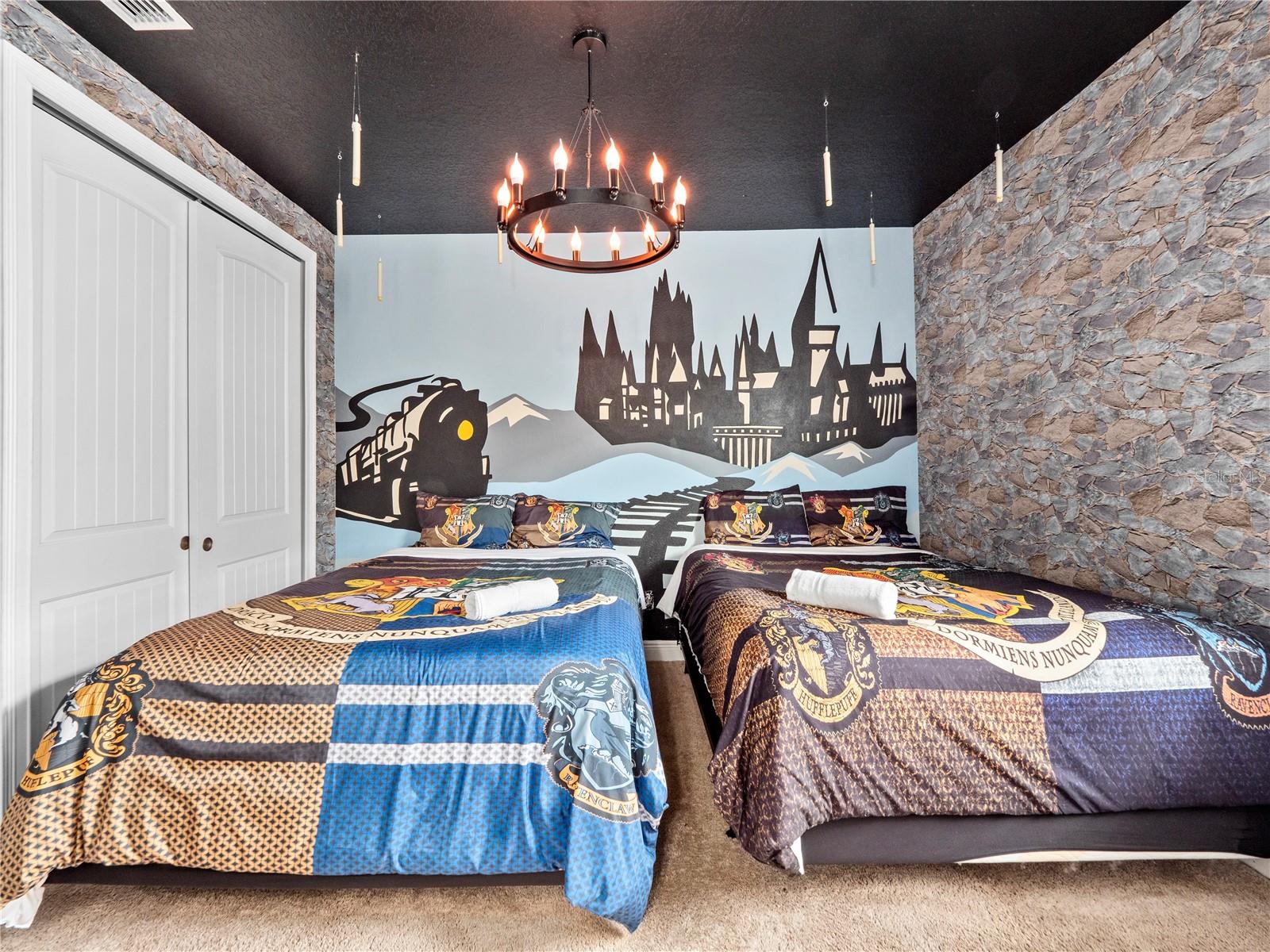 Welcome to an exquisite 8-bedroom, 7-bath luxury vacation home nestled in the highly sought-after Encore Resort community. This stunning property is just minutes from Disney and all the magical attractions, promising an unforgettable stay. It's perfectly positioned for convenience, just a short walk to the resorts fabulous amenities, which include a clubhouse and a thrilling aqua park. Enjoy the benefits of being on the quieter side of the neighborhood, without having to cross Old Lake Wilson Road. You won't have to deal with the disturbances from major roads or the community pool, ensuring peace and tranquility during your stay. Plus, this home offers something rare--a screen-enclosed backyard, one of only about five in the neighborhood, perfect for private relaxation. Unique touches make this home truly special: Explore the enchanting Harry Potter, Mickey Mouse, Lego/ Minion themed rooms, complete with a mural, chandelier, and themed linens for the ultimate immersive experience. Creative minds love the room adorned with a captivating Lego mural. For the art lovers, the loft is a stunner, showcasing a striking Lichtenstein mural and offering entertainment with an air hockey table, music, and flashing lights, a sure hit for any gathering. An open floor plan with inviting natural lighting, tile floorings throughout all common living areas. Kitchen features granite counters, cherry wood 42" cabinets, energy efficient stainless steel appliances. This home has TWO primary bedrooms - one downstairs and one upstairs. There are five bedrooms ensuite - perfect for family vacations, two bedrooms on the MAIN LEVEL* for extra privacy and accessibility. The home is elegantly furnished with Tommy Bahama Ocean Club design, ensuring comfort with a touch of island elegance. Relax in this luxury vacation private pool home paired with a rejuvenating spa, providing a serene retreat after your adventures around Orlando. Choose this unmatched vacation rental to create magical memories for your family and friends, blending luxury with convenience and unique charm, all awaiting you in Encore Resort. ENCORE is one of Orlando's Premiere Vacation home communities featuring an Aqua Park, Fitness Center, Tennis, Basketball, Volleyball, Soccer Field, Event Spaces, Bike Rentals, Dining, and SO MUCH MORE! HOA dues include: Digital Cable Television, Trash Pick Up, Mail Service, Pest Control (includes Termite Bond & Monthly Spraying), Lawn, Annual Exterior Cleaning of Home, 24-hour Roaming Security, High Speed Internet. Currently active short term rental program, which makes this home a great investment!