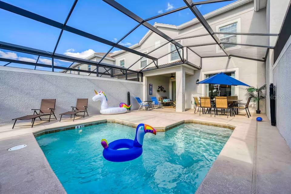 Welcome to your dream vacation home in the sought after Storey Lake Resort! This beautifully furnished 4 bedroom, 3 bathroom townhome offers the perfect blend of luxury, comfort, and convenience. Featuring hard flooring throughout, an open concept living space, and a modern kitchen with stainless steel appliances, this home is rental ready. Step outside to your private screened-in pool, perfect for relaxing after a day at the theme parks. Storey Lake Resort offers resort style amenities, including a water park, lazy river, fitness center, mini golf, and more. Just minutes from Disney, shopping, and dining. Whether you're looking for a vacation home or an investment property, this townhome is a must-see!