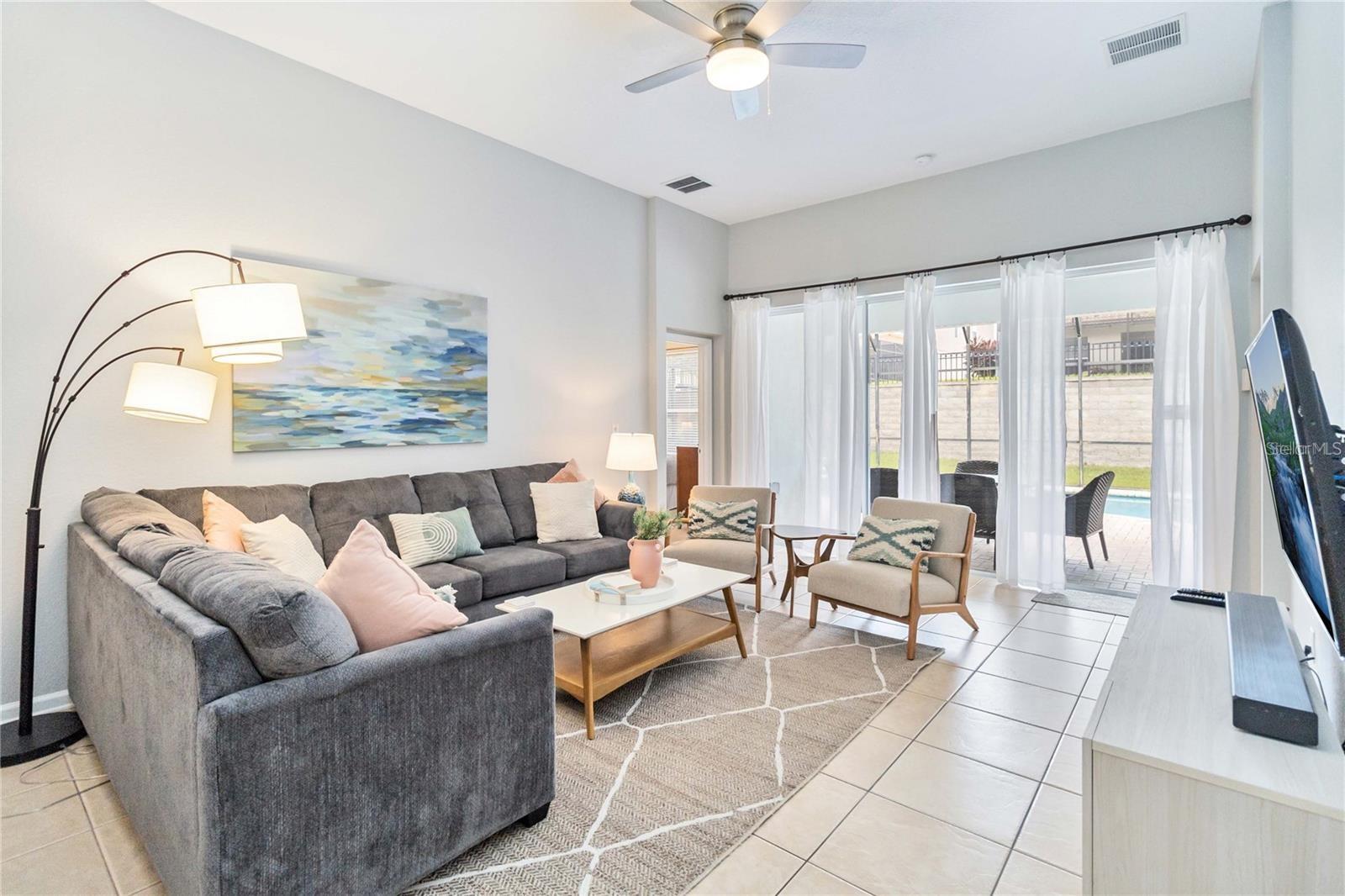 PRICE REDUCTION!! Great INCOME PRODUCING property!! Previous rental history and upcoming reservation details can be shared. Welcome to this beautiful pool home in the sought after Windsor Hills Community. One of the Larger 5 Bed's In The Reserve, Located on one of the most private streets in the Community. Featuring 5 bedrooms and 5 bathrooms overlooking a beautiful, landscaped Park and Playground area.... you can't get a better location! As you enter the property you will be greeted with the seamless flow complimenting the open concept layout and welcoming spacious interior. The property boasts double master suites on the ground floor with 3 other bedrooms, all with private baths. The kitchen is bright and modern with newer Stainless appliances and dinette. The garage has been converted into a Games Room to keep the family entertained after a long day at the Parks. The main Living area overlooks the newly resurfaced, private heated pool & spa backing onto a stone wall. Many recent upgrades including: newer pool heater, Both AC Units were replaced less than 4 years ago, Water heaters: Downstairs unit replaced in Oct, 2019. Upstairs unit replaced in Oct, 2022, Full Exterior paint in 2022. Enjoy all the amazing amenities that Windsor Hills offers including waterslides, splash pad, resort pool and hot tub, sundry shop, movie theater, games room, playground, tennis, volleyball and basketball courts. All this and only 1 mile to HWY 192 for easy access to shopping, restaurants and I-4, and only just a few miles to all the theme parks. The property is currently in the short term rental program and has generated great income for the owners over the past years. Future bookings can convey to new owner if desired.